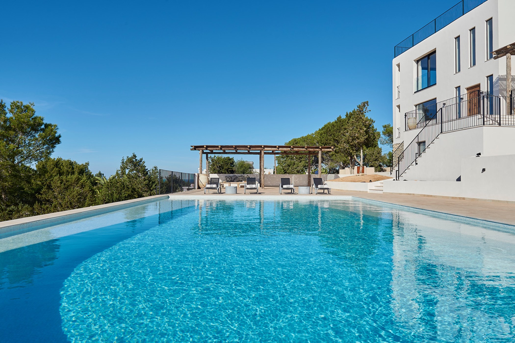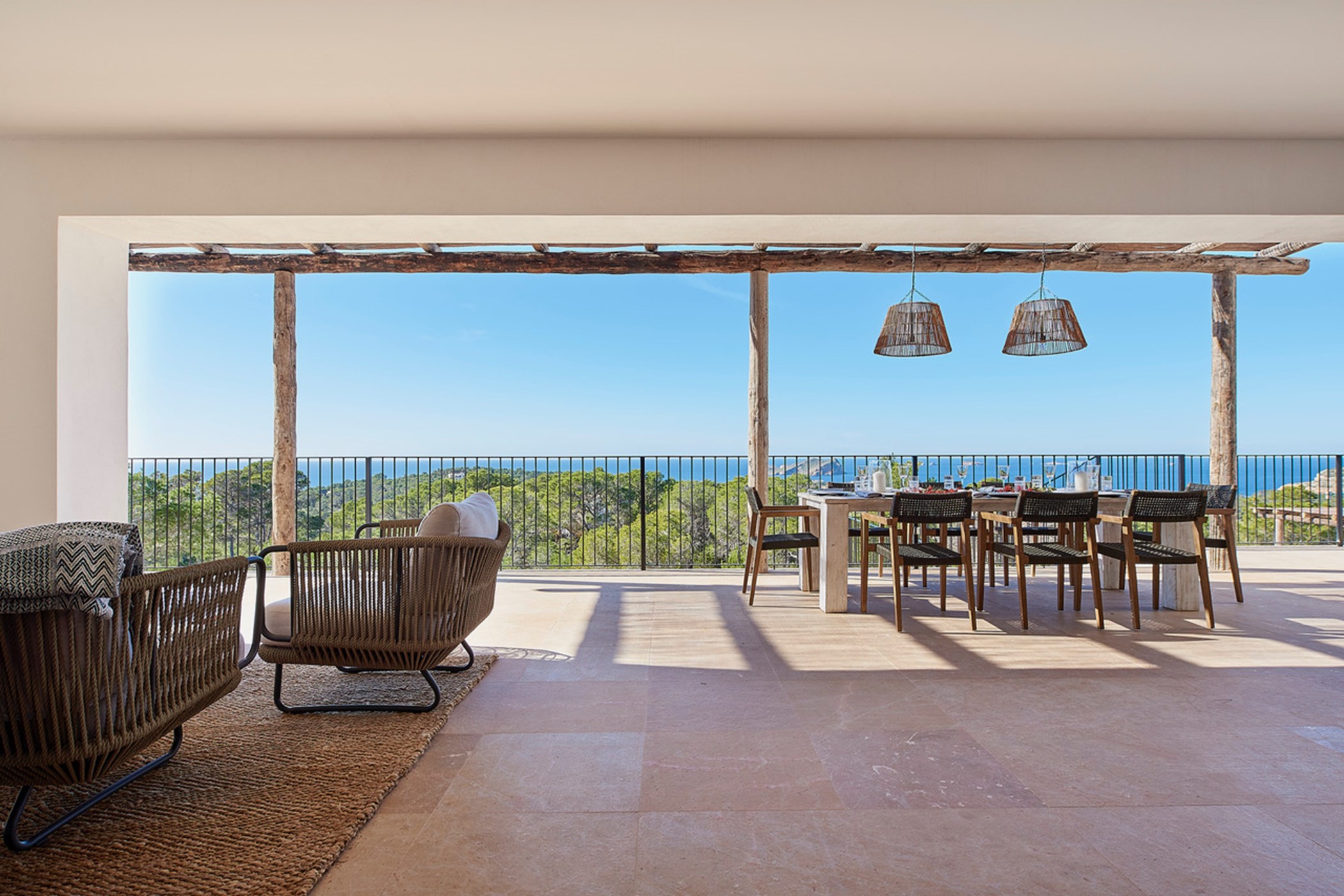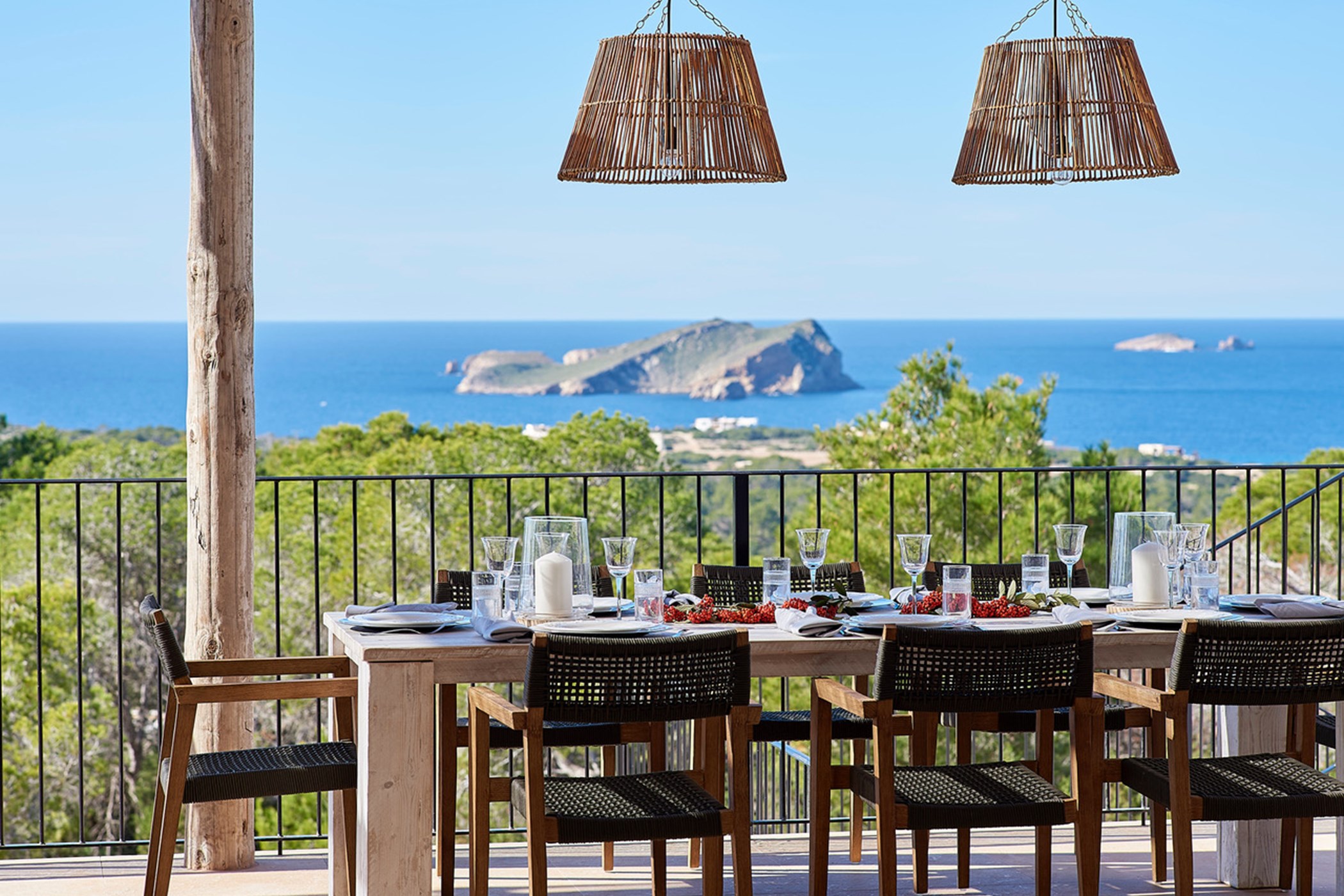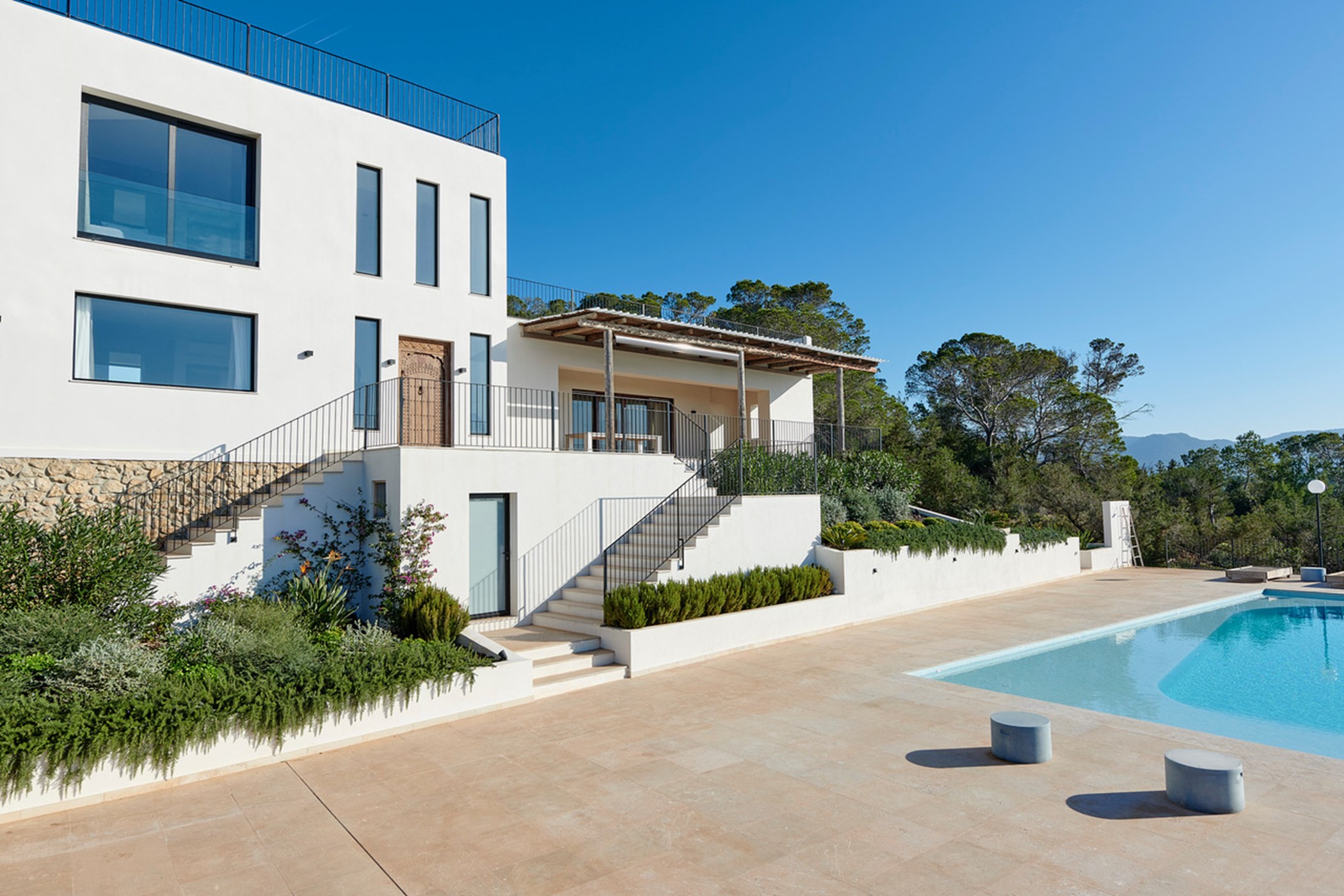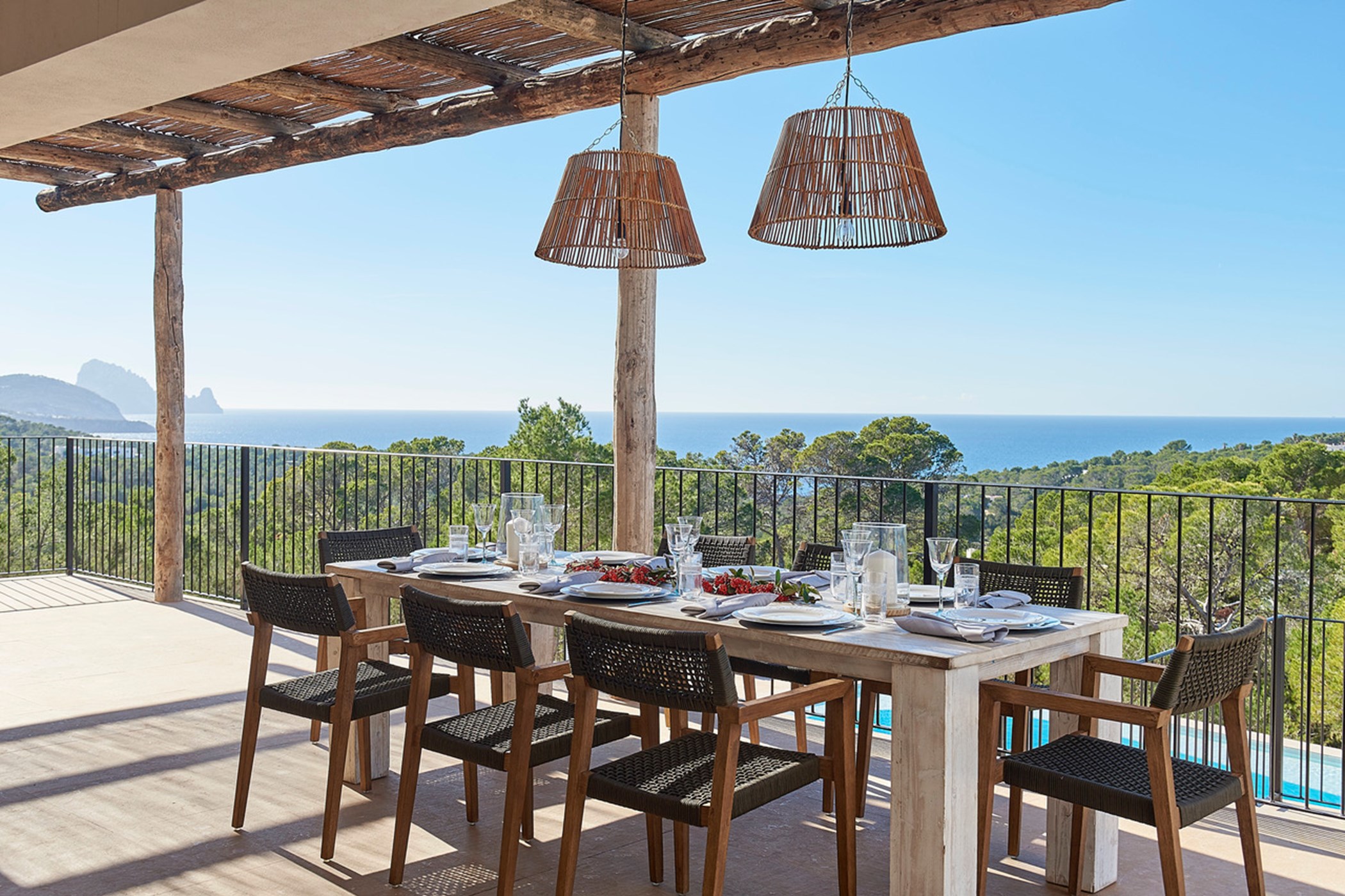 This hillside luxury villa in Ibiza is surrounded by pine forests and offers superb sea views across the southwest coastline, with a short drive to the beautiful beaches of Cala Conta.
