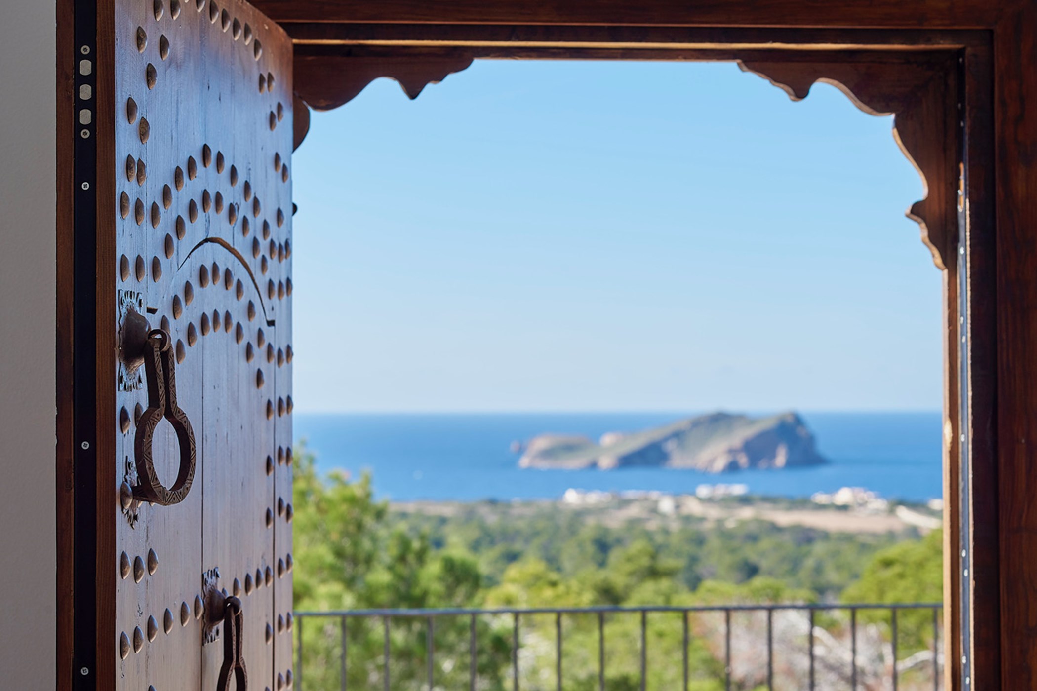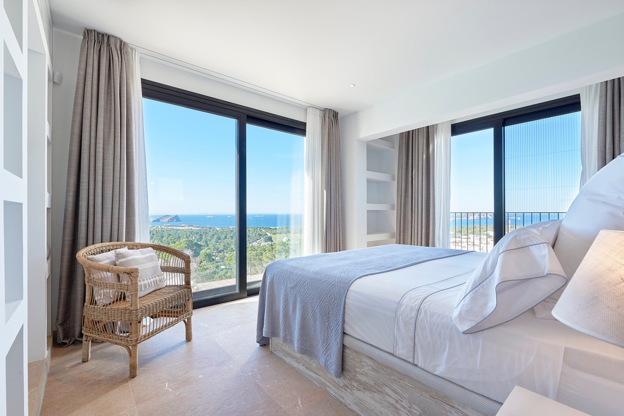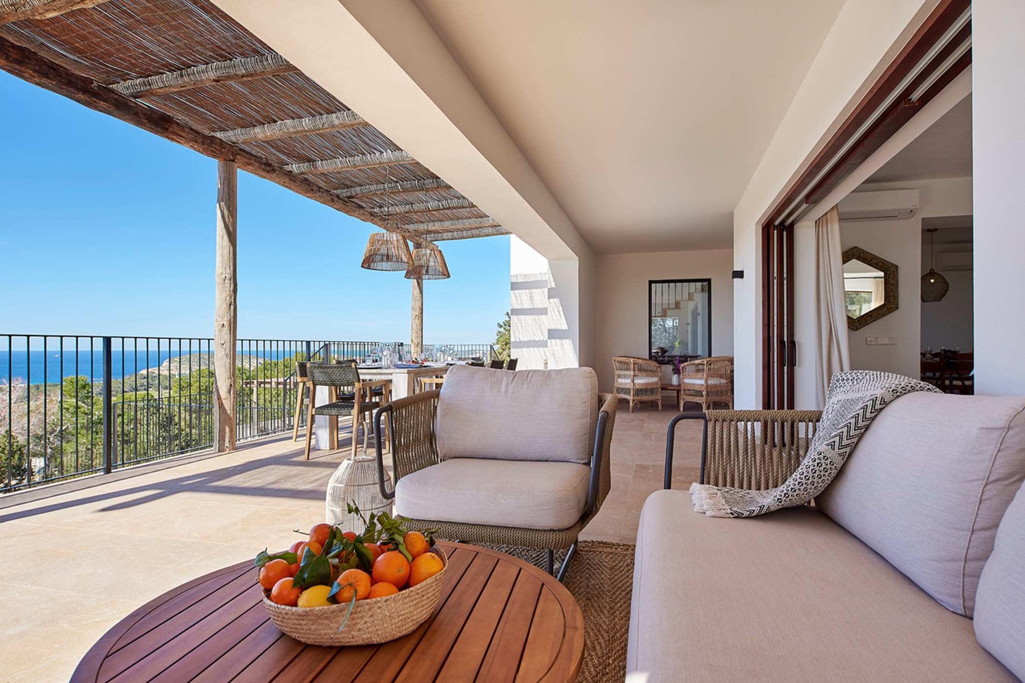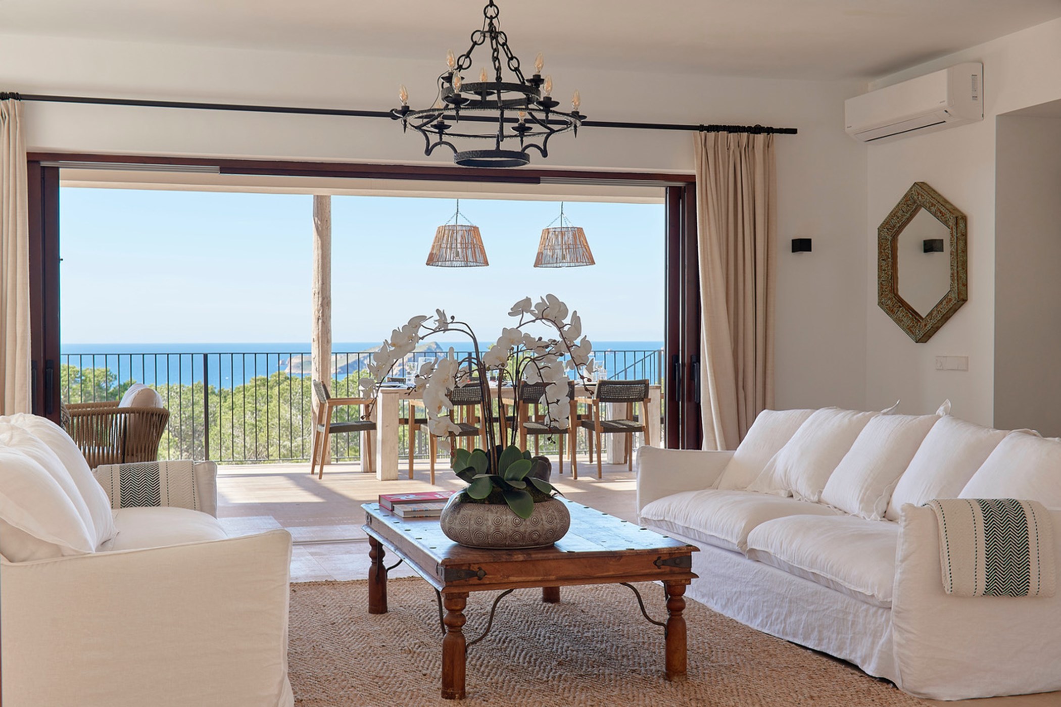 This hillside luxury villa in Ibiza is surrounded by pine forests and offers superb sea views across the southwest coastline, with a short drive to the beautiful beaches of Cala Conta.