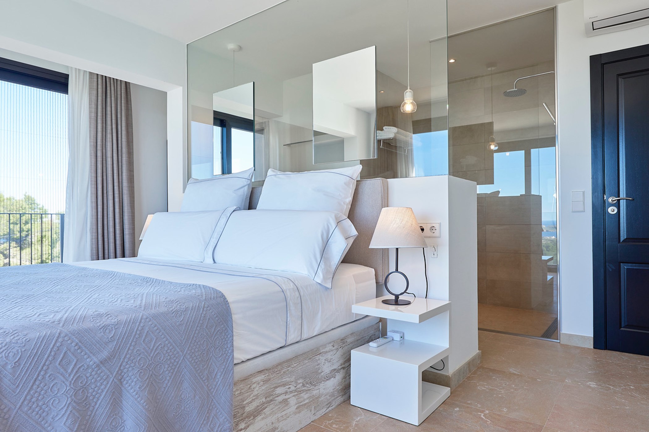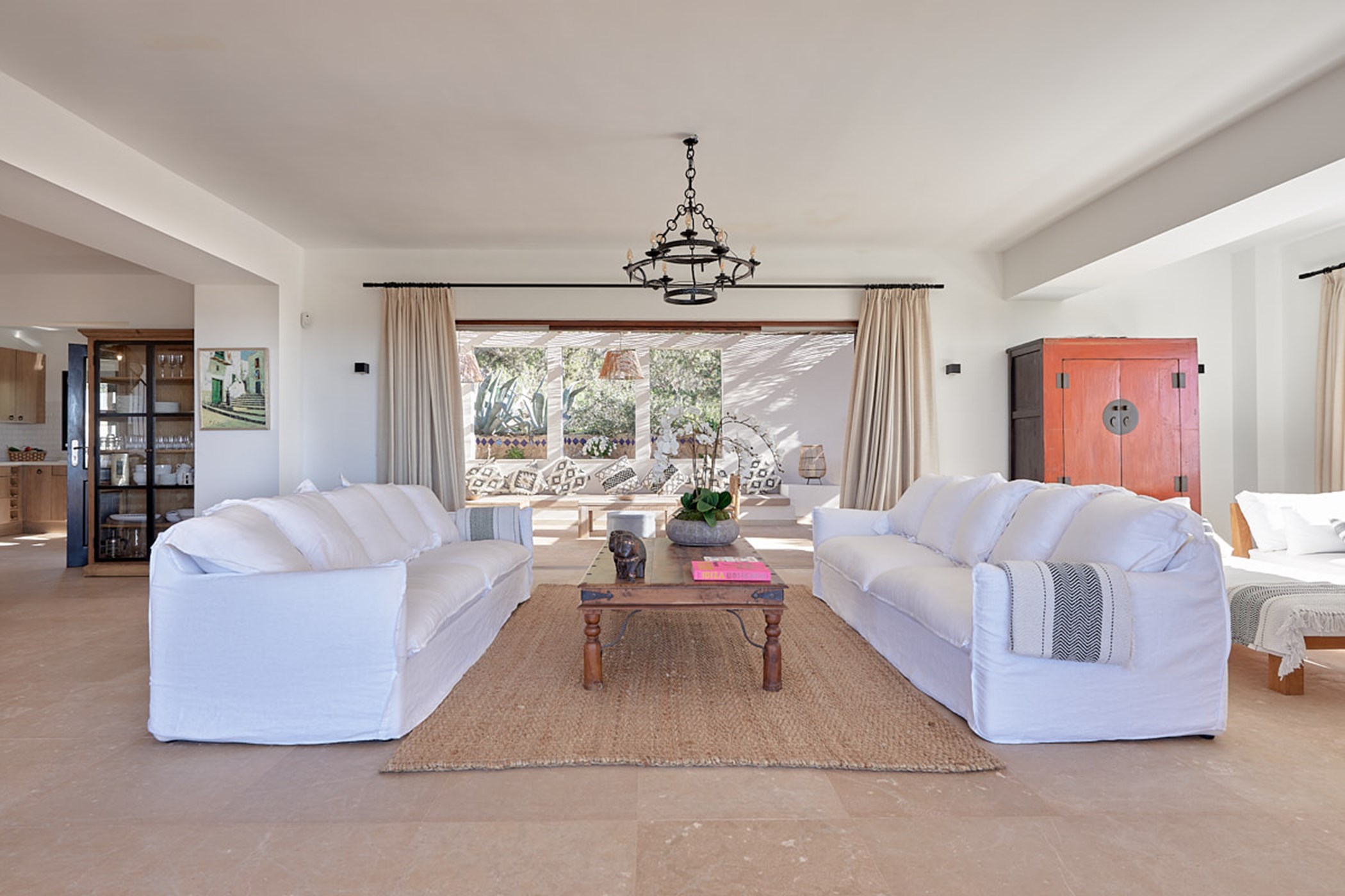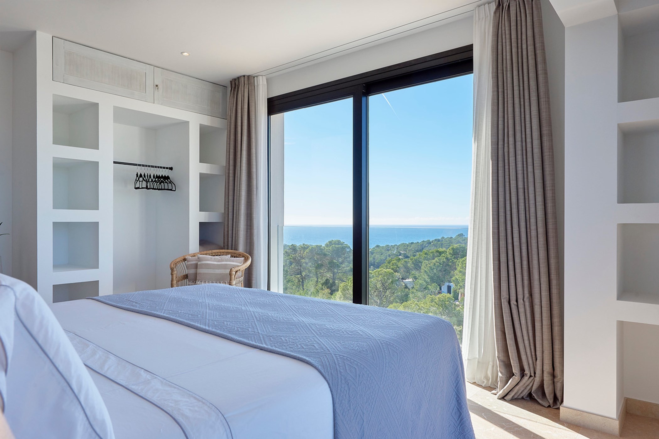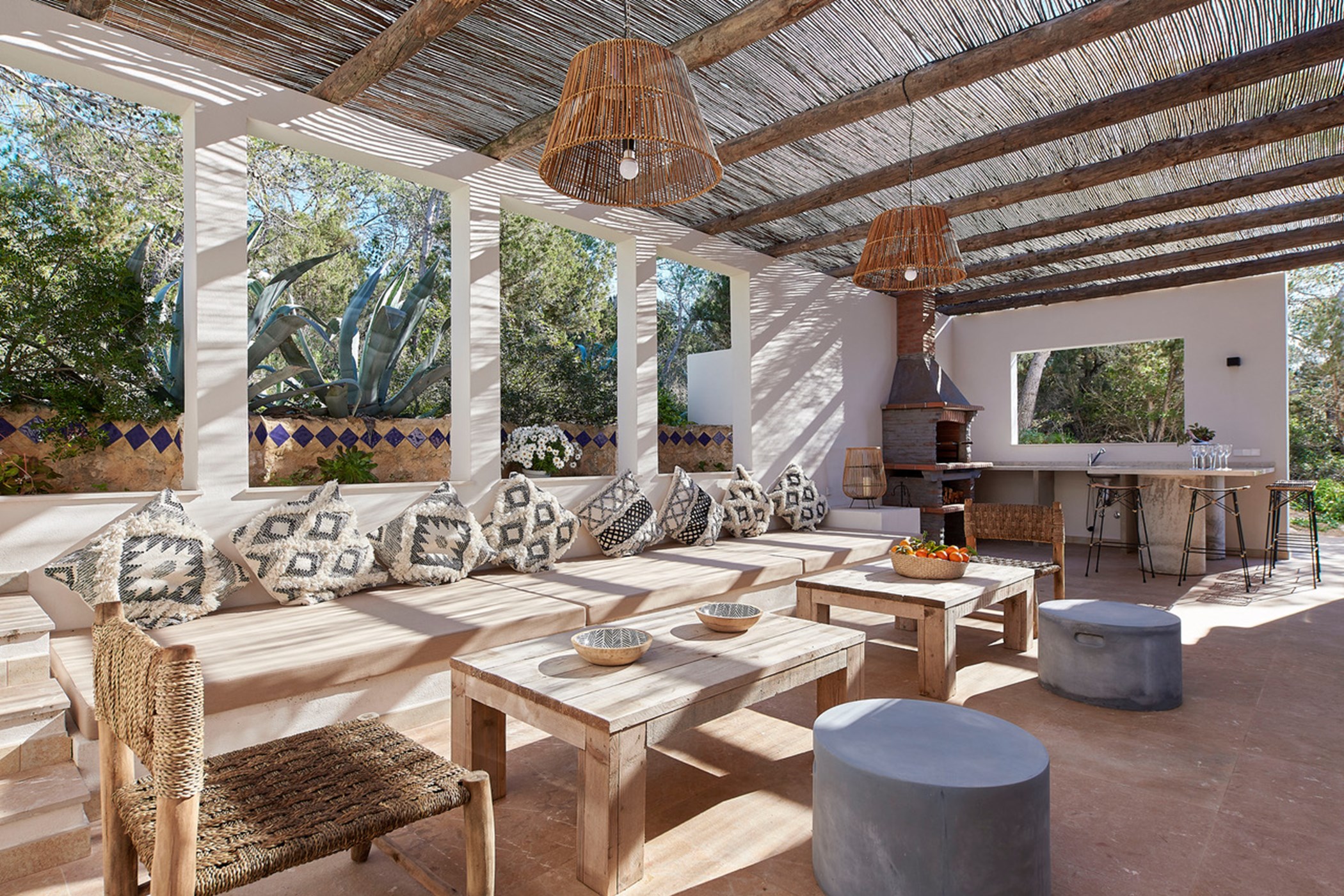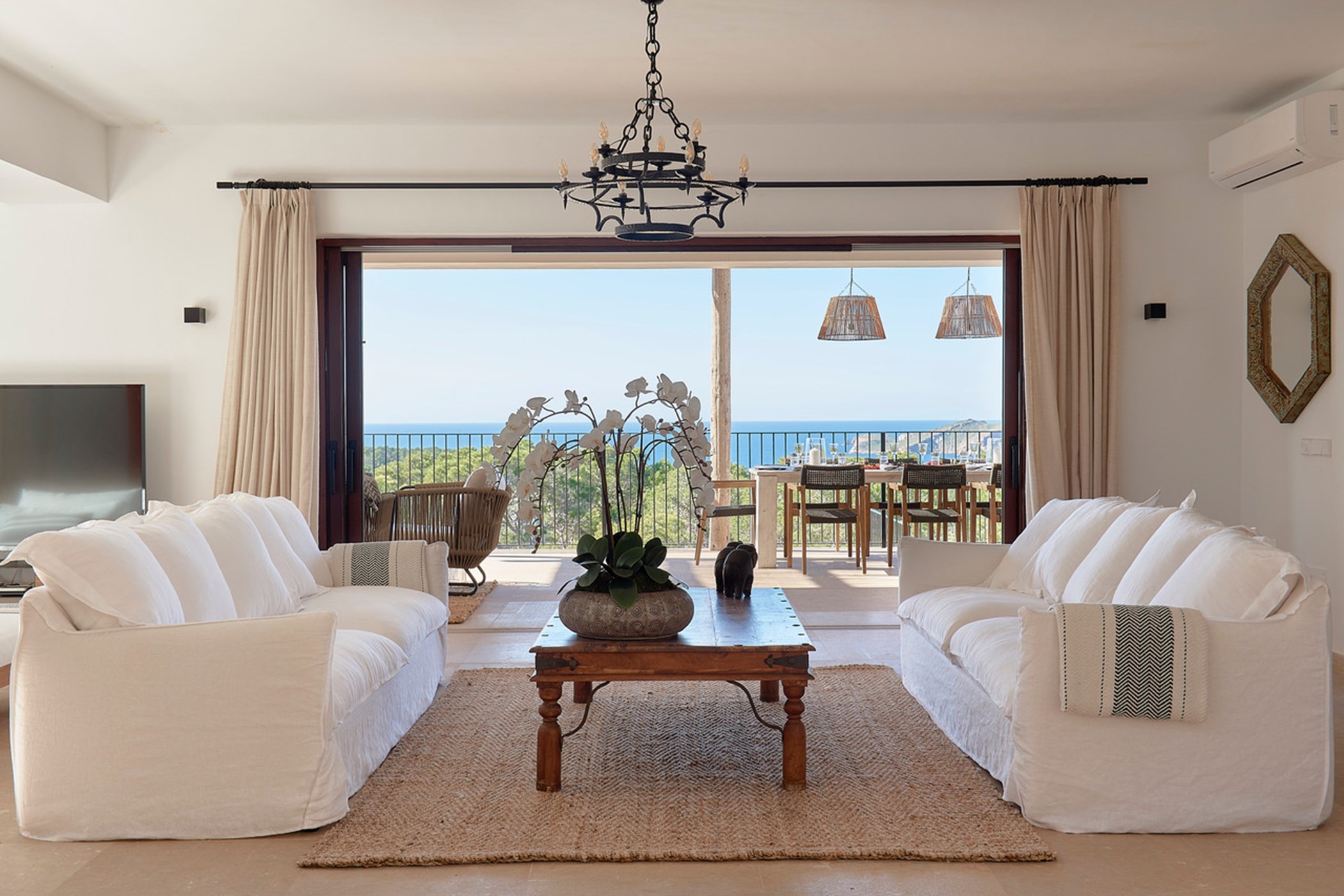 This hillside luxury villa in Ibiza is surrounded by pine forests and offers superb sea views across the southwest coastline, with a short drive to the beautiful beaches of Cala Conta.
