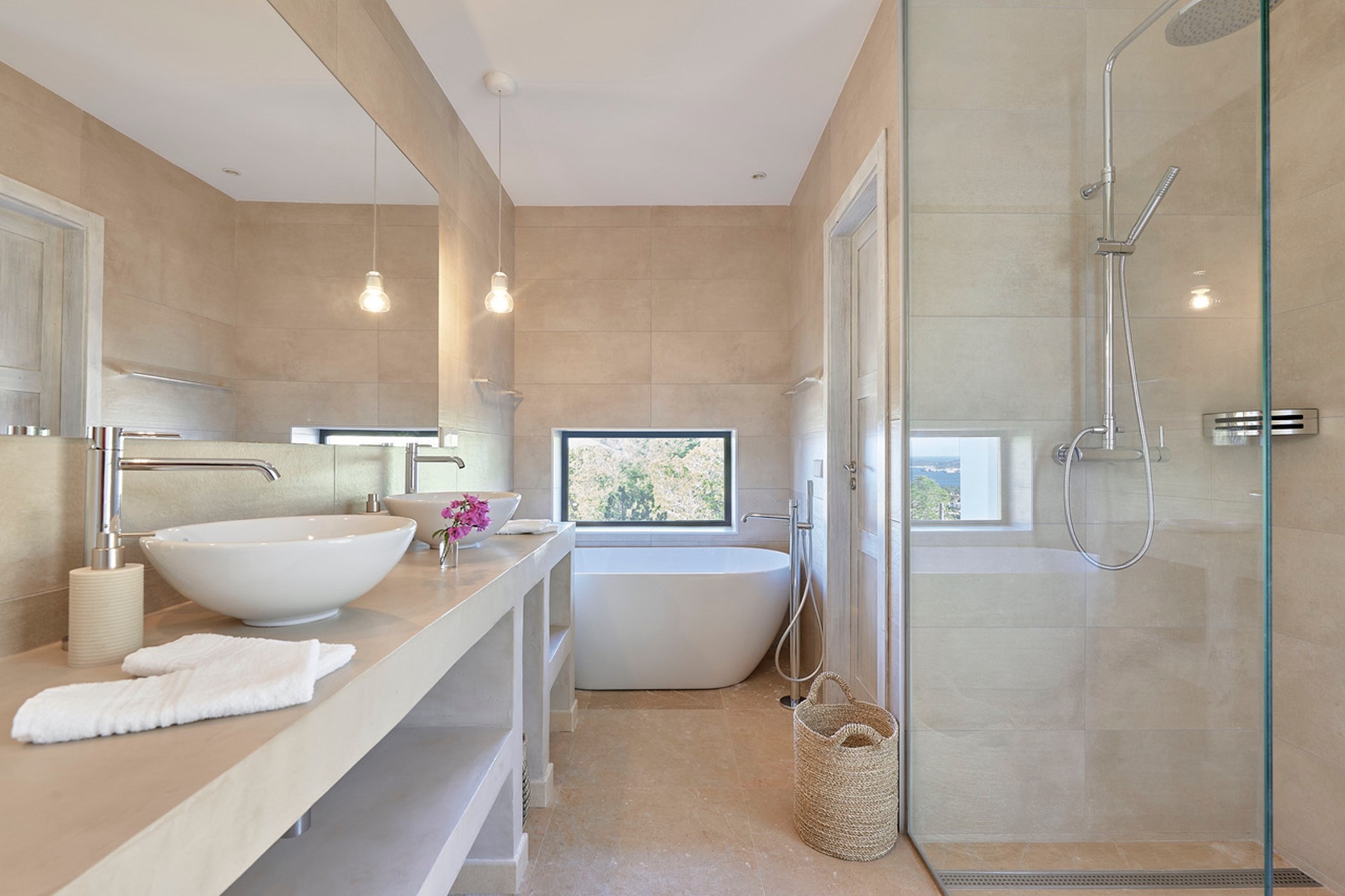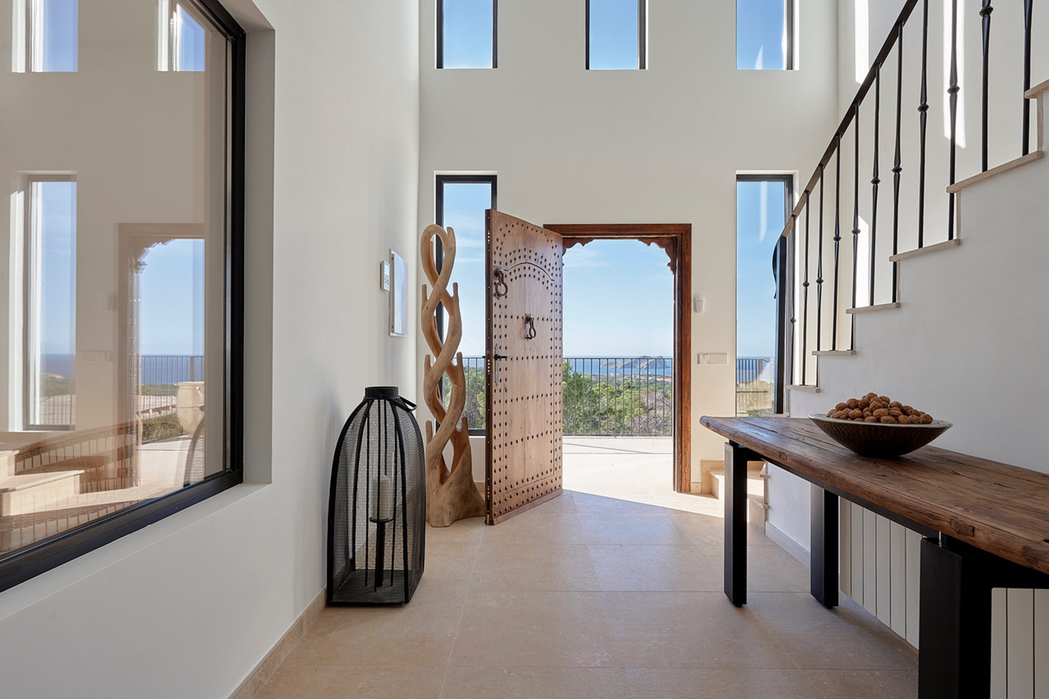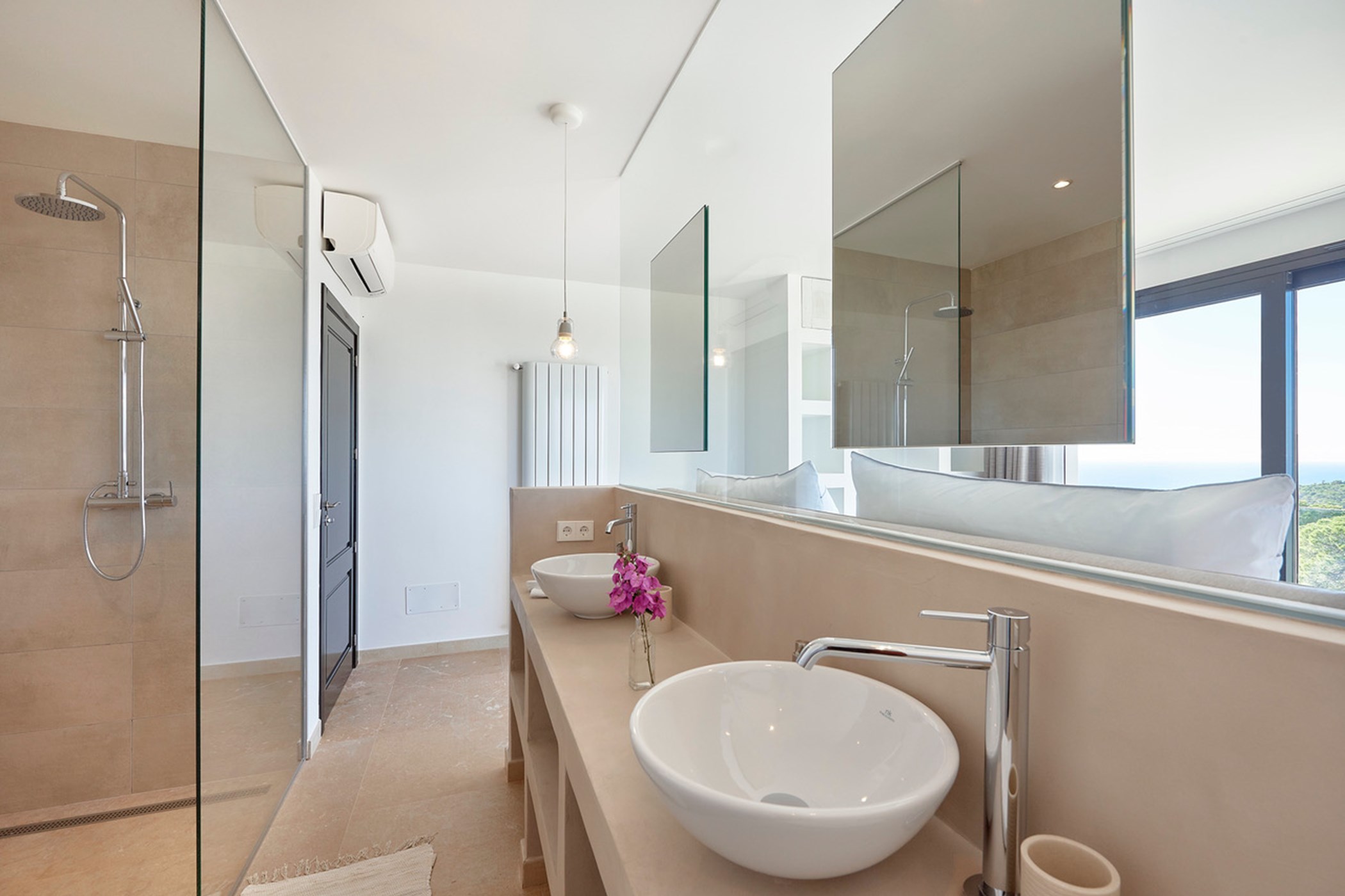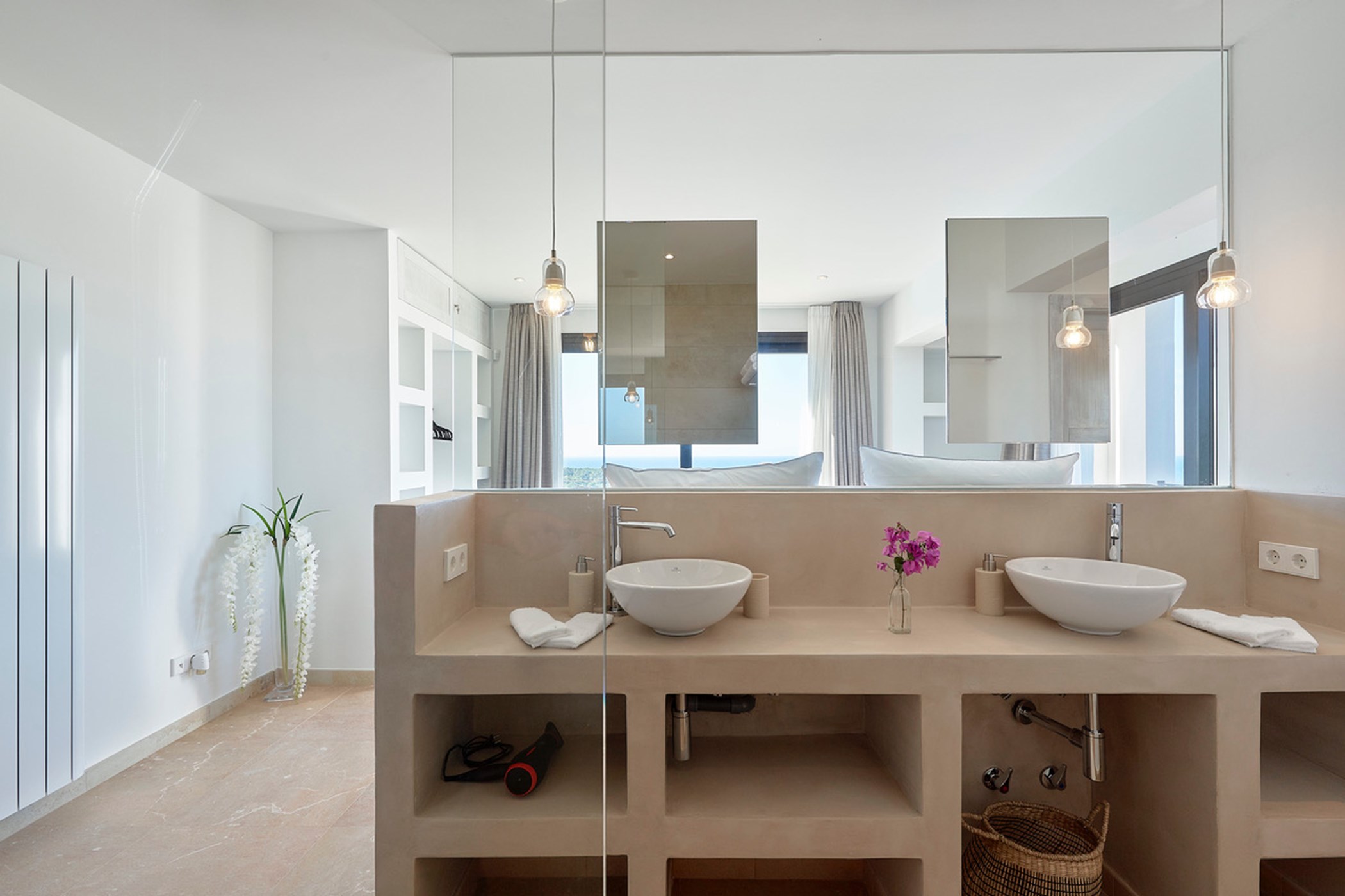 This hillside luxury villa in Ibiza is surrounded by pine forests and offers superb sea views across the southwest coastline, with a short drive to the beautiful beaches of Cala Conta.