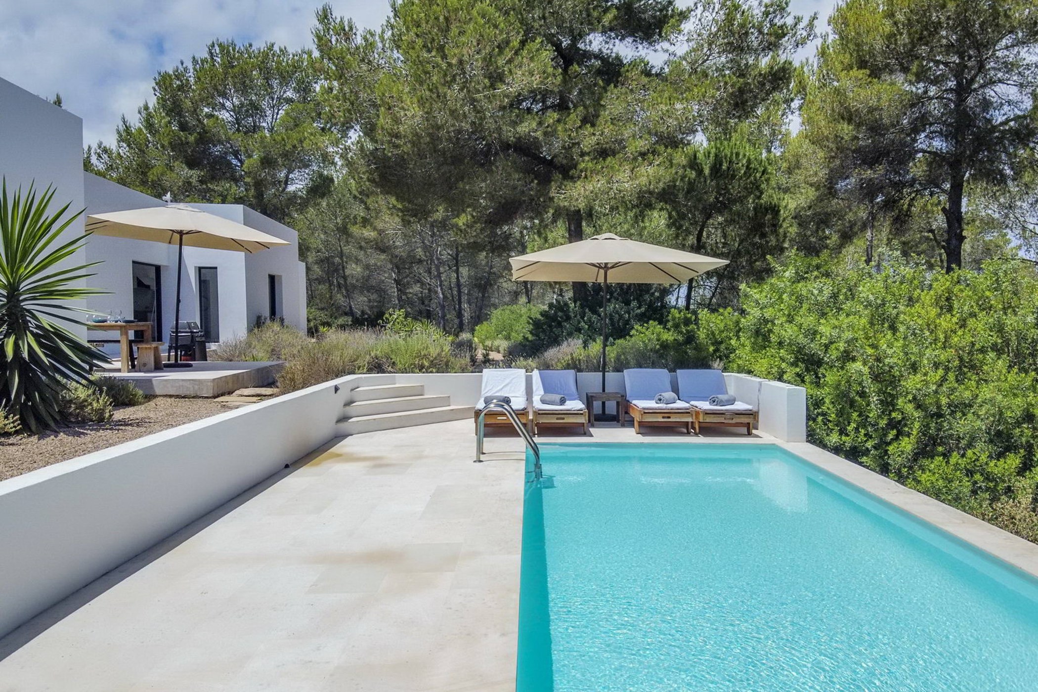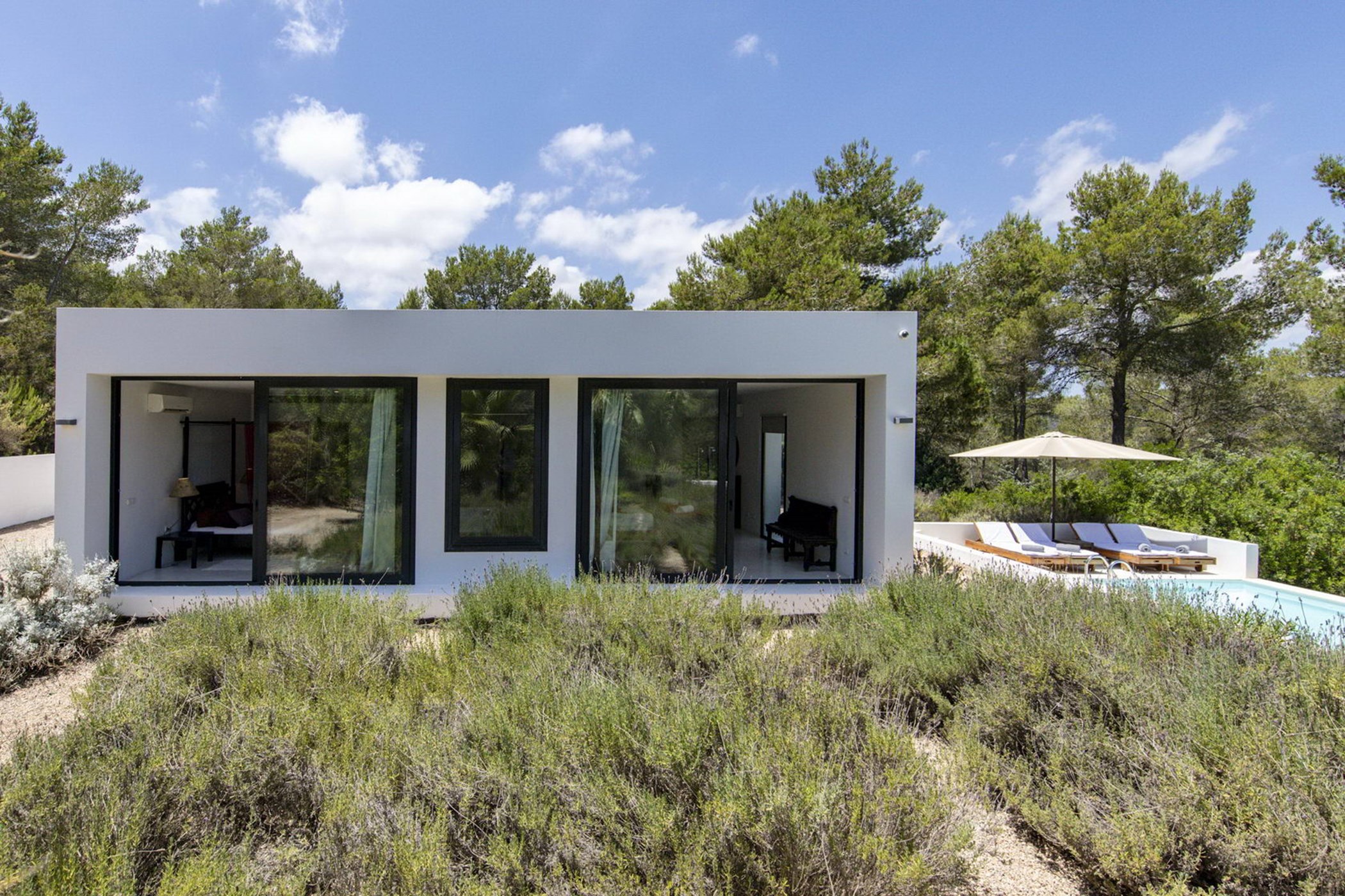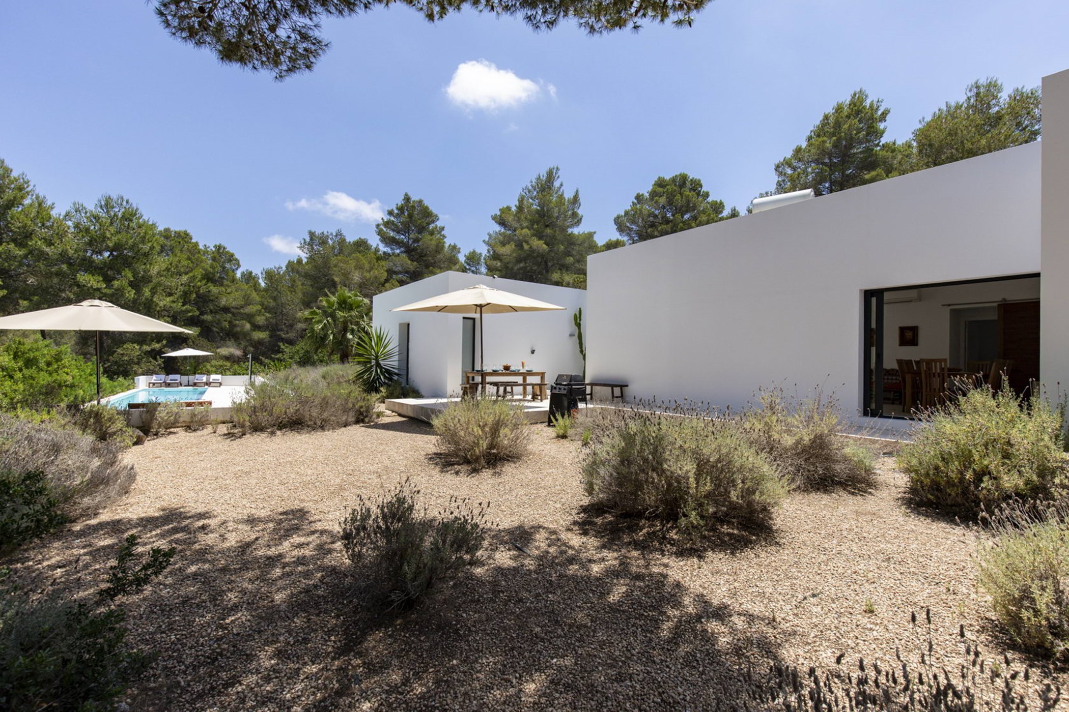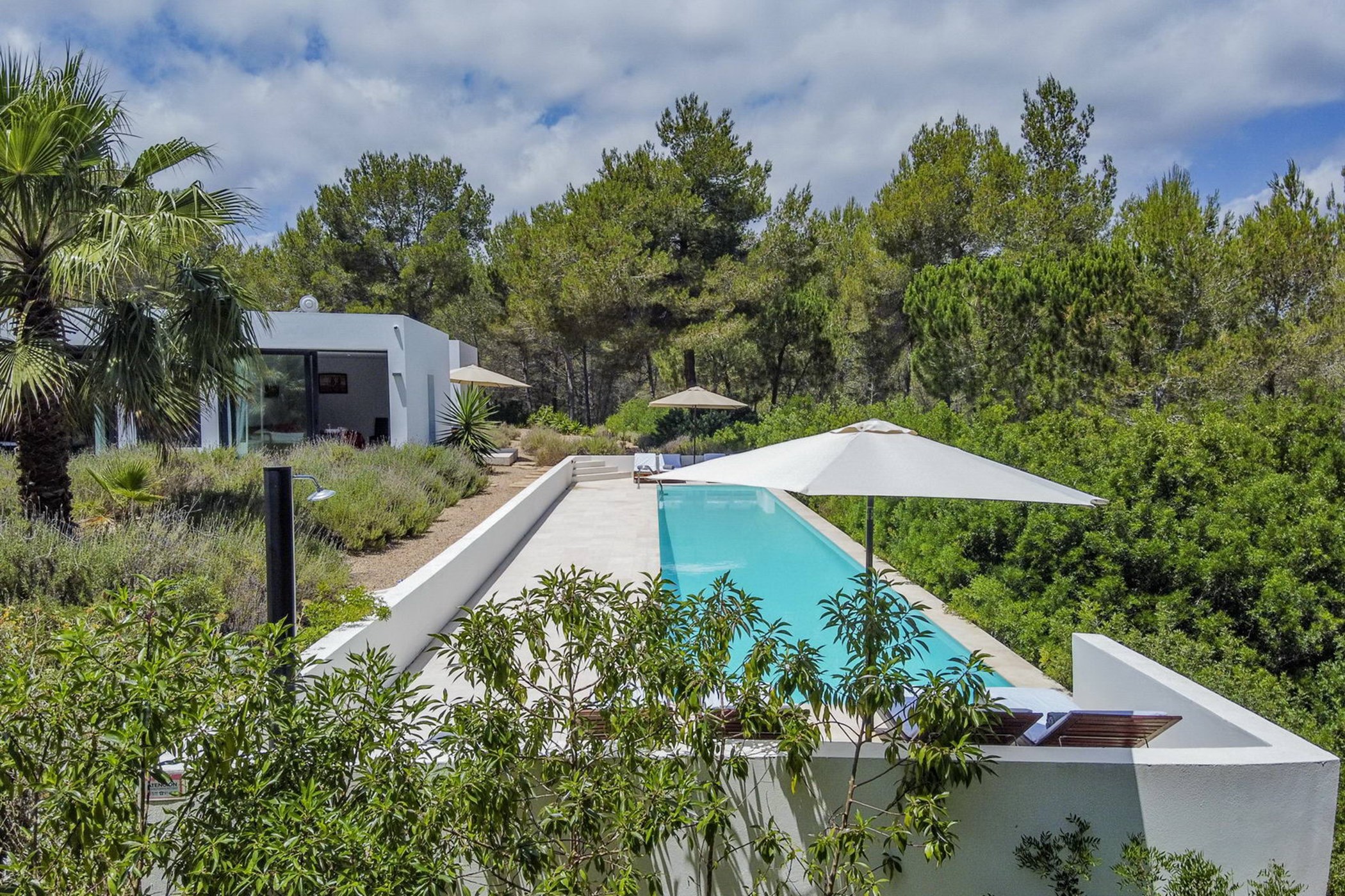 The sunlit living room connects a modern kitchen with a traditional-style lounge area. The spacious double bedrooms and thoughtfully designed bathrooms ensure comfort and privacy. The 20-meter private lap pool, surrounded by an authentic Ibizan garden, is perfect for relaxation under the sun during the day and beautifully illuminated at night.