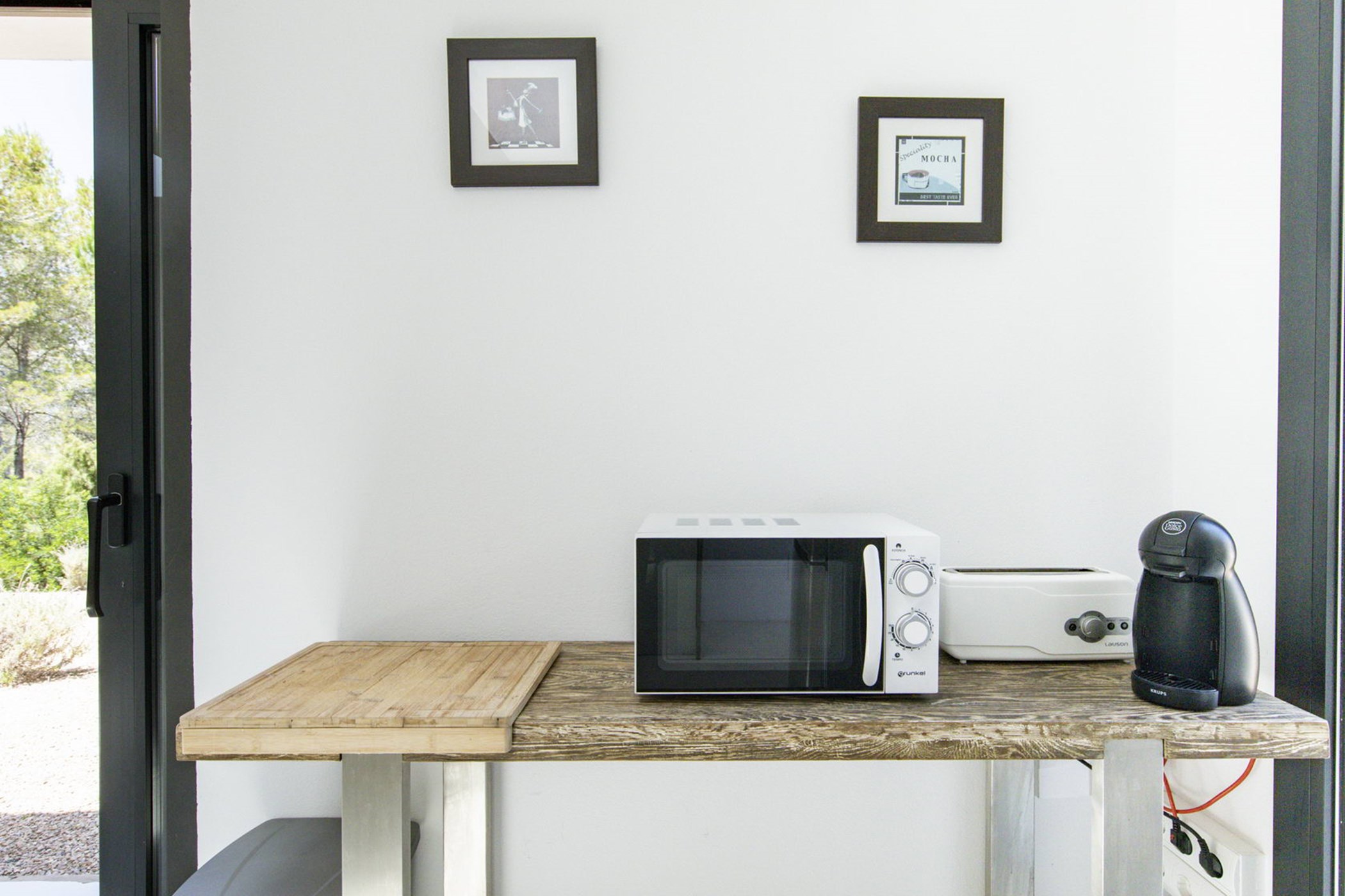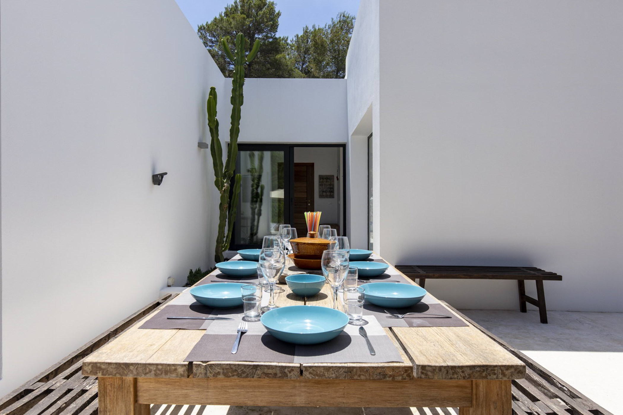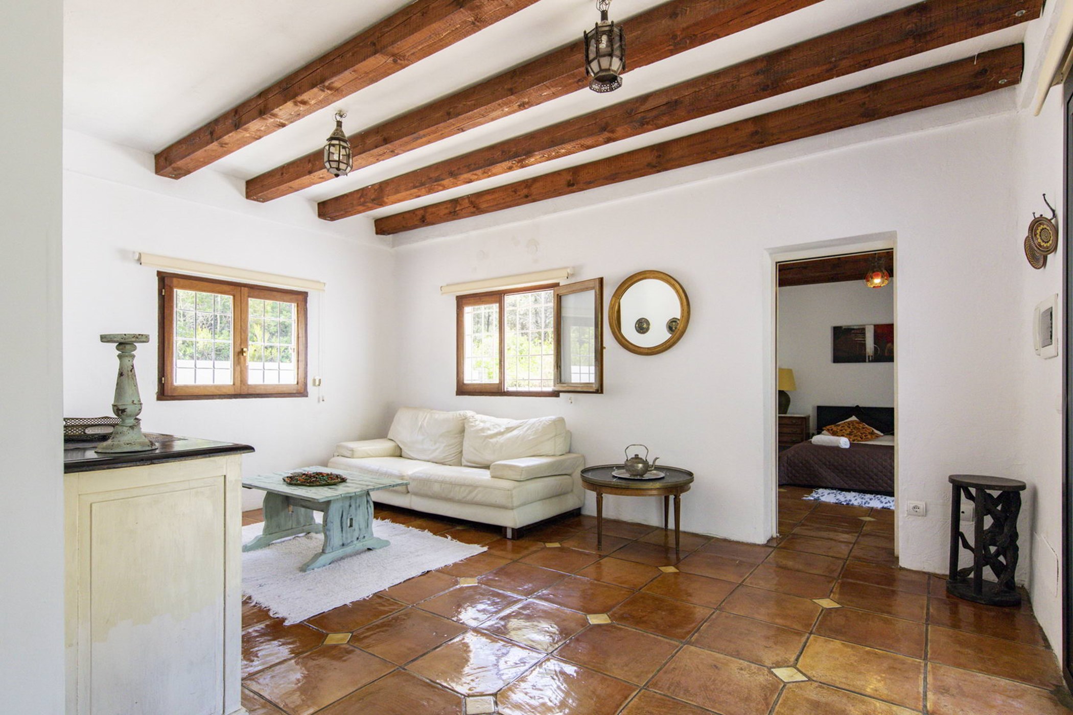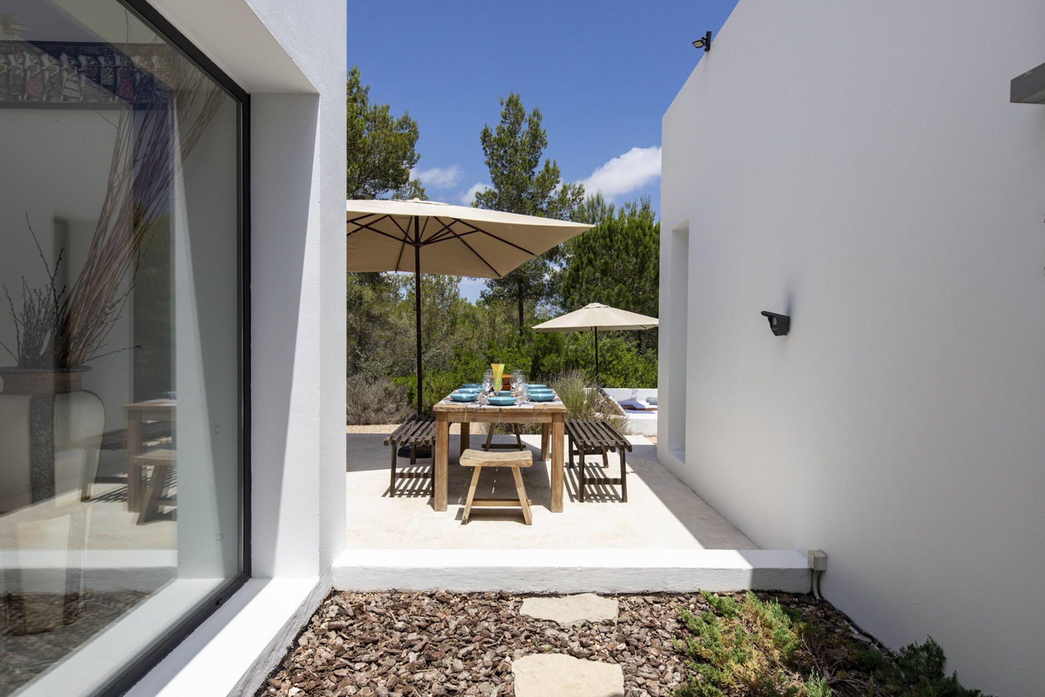 The sunlit living room connects a modern kitchen with a traditional-style lounge area. The spacious double bedrooms and thoughtfully designed bathrooms ensure comfort and privacy. The 20-meter private lap pool, surrounded by an authentic Ibizan garden, is perfect for relaxation under the sun during the day and beautifully illuminated at night.