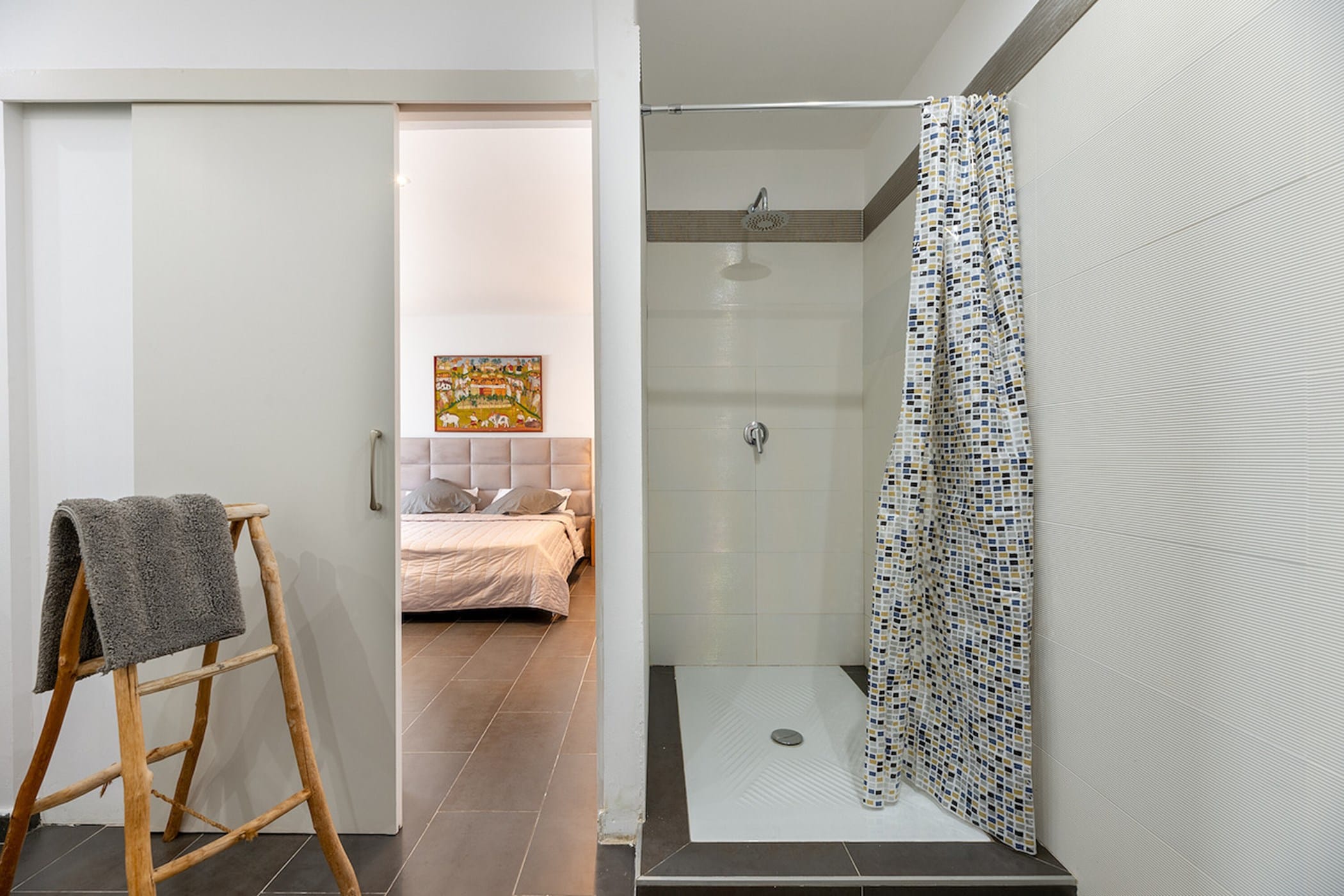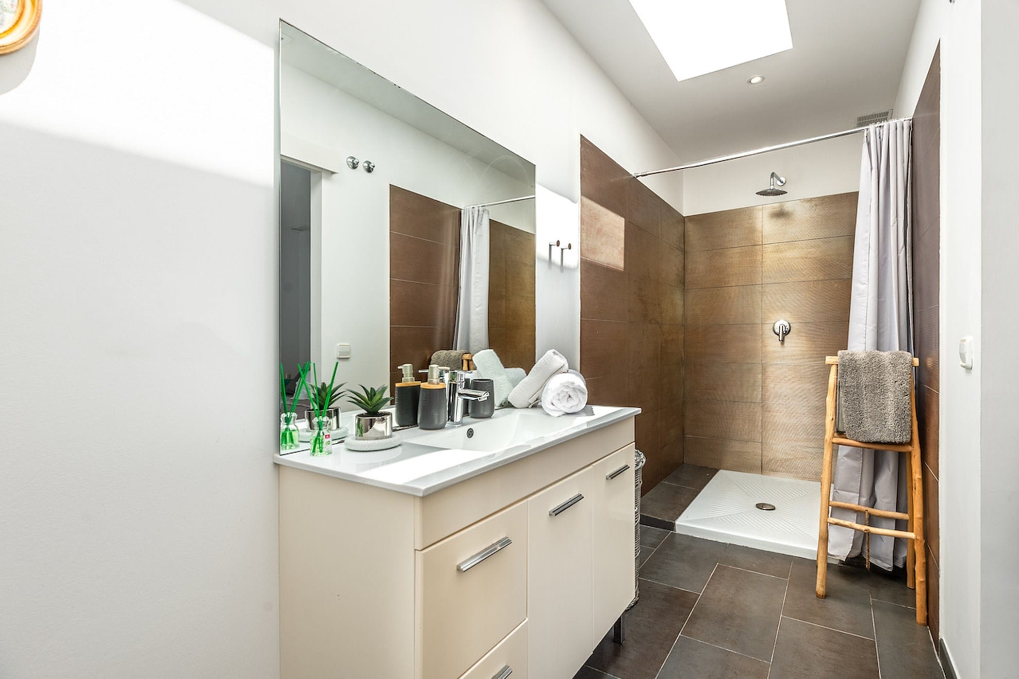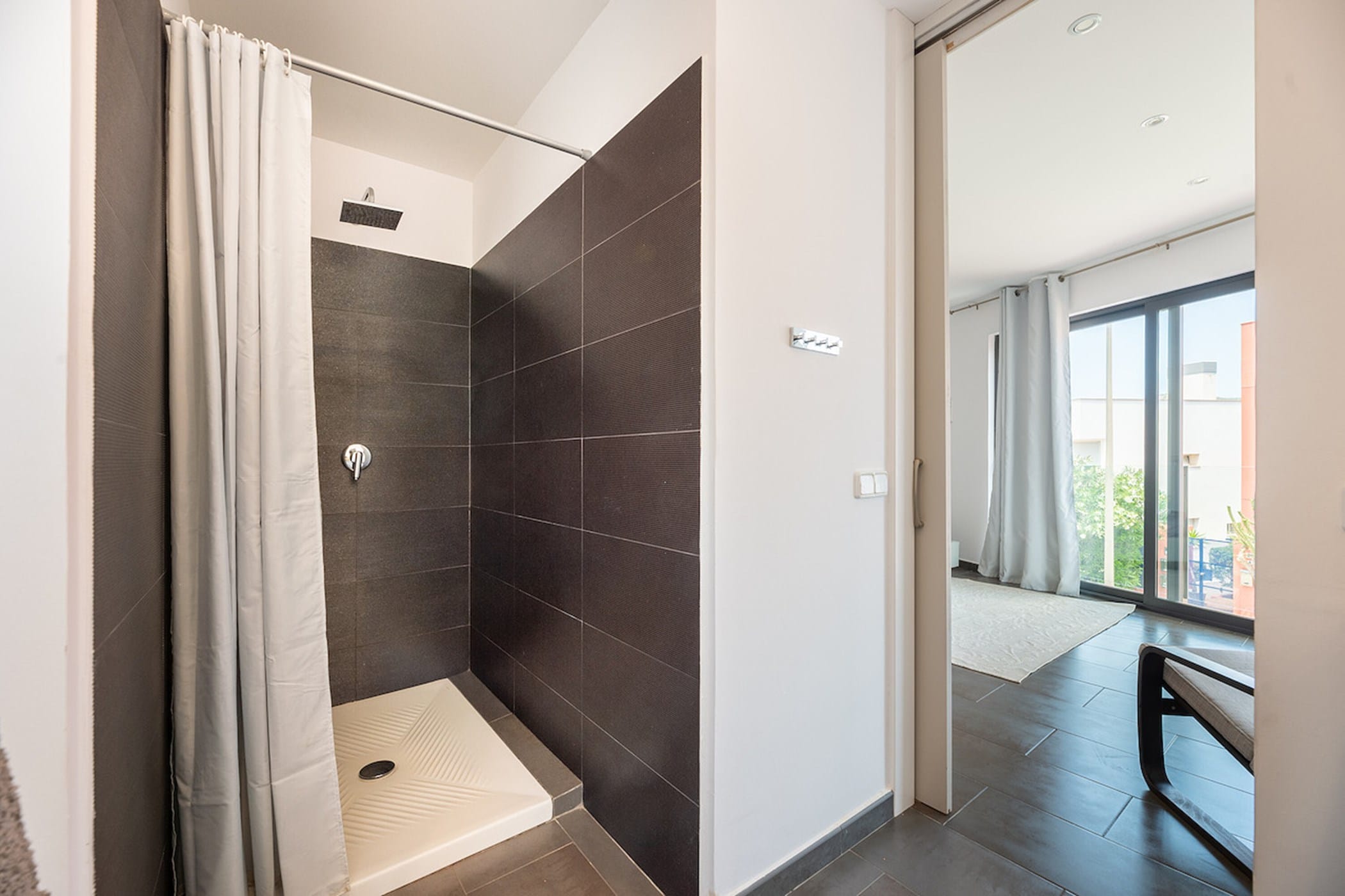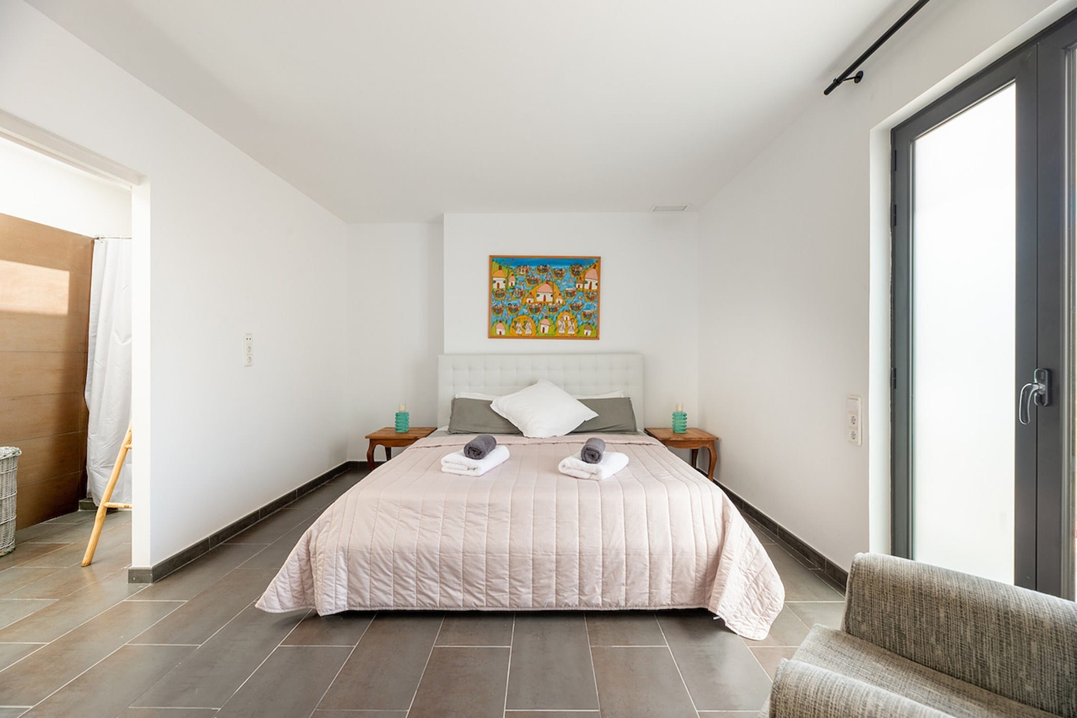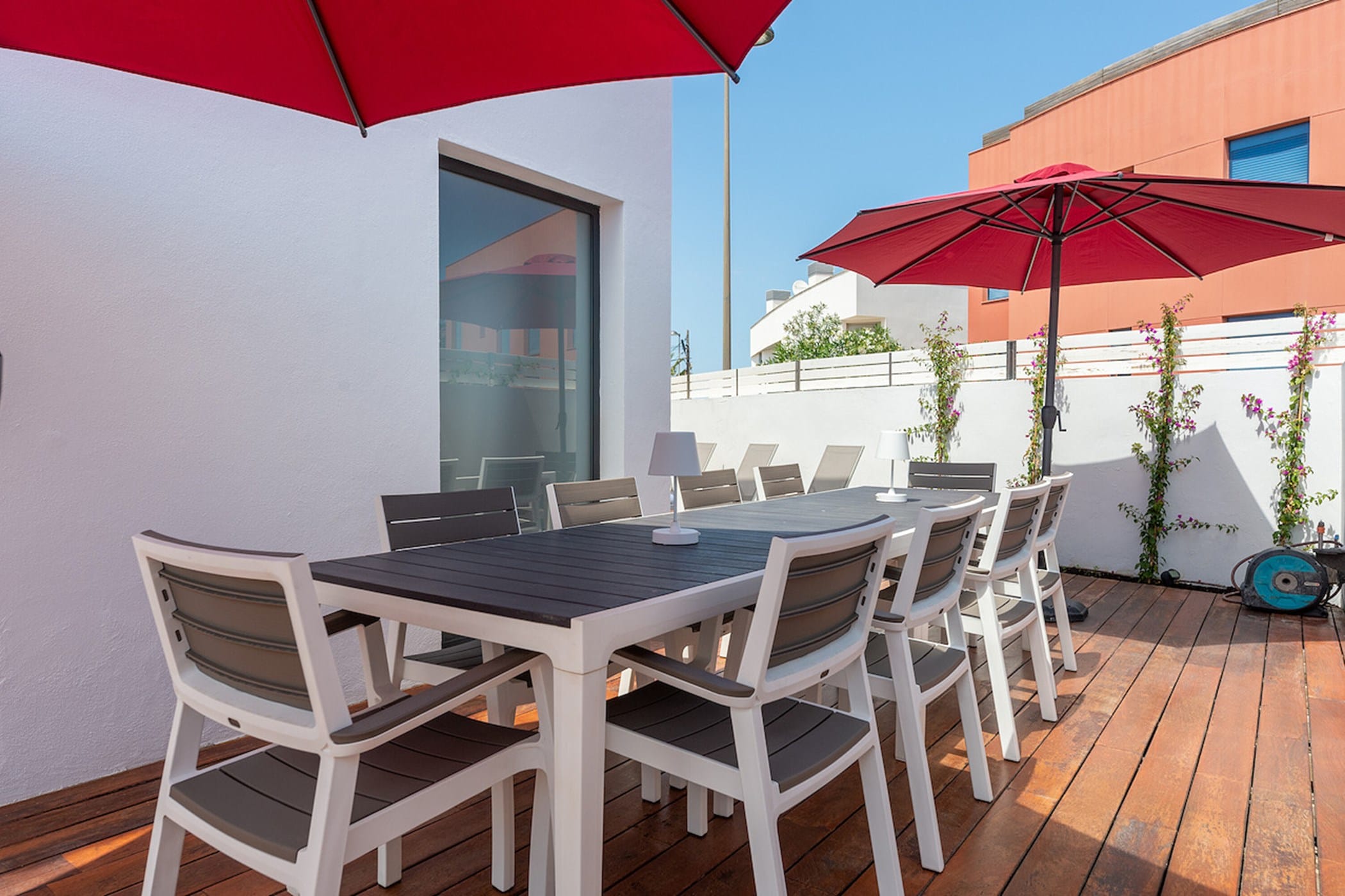 The private outdoor area includes a pristine swimming pool, manicured gardens, a covered terrace, two balconies, a deluxe barbecue area, and an outdoor shower. Guests also have access to a shared uncovered terrace with beautiful views.