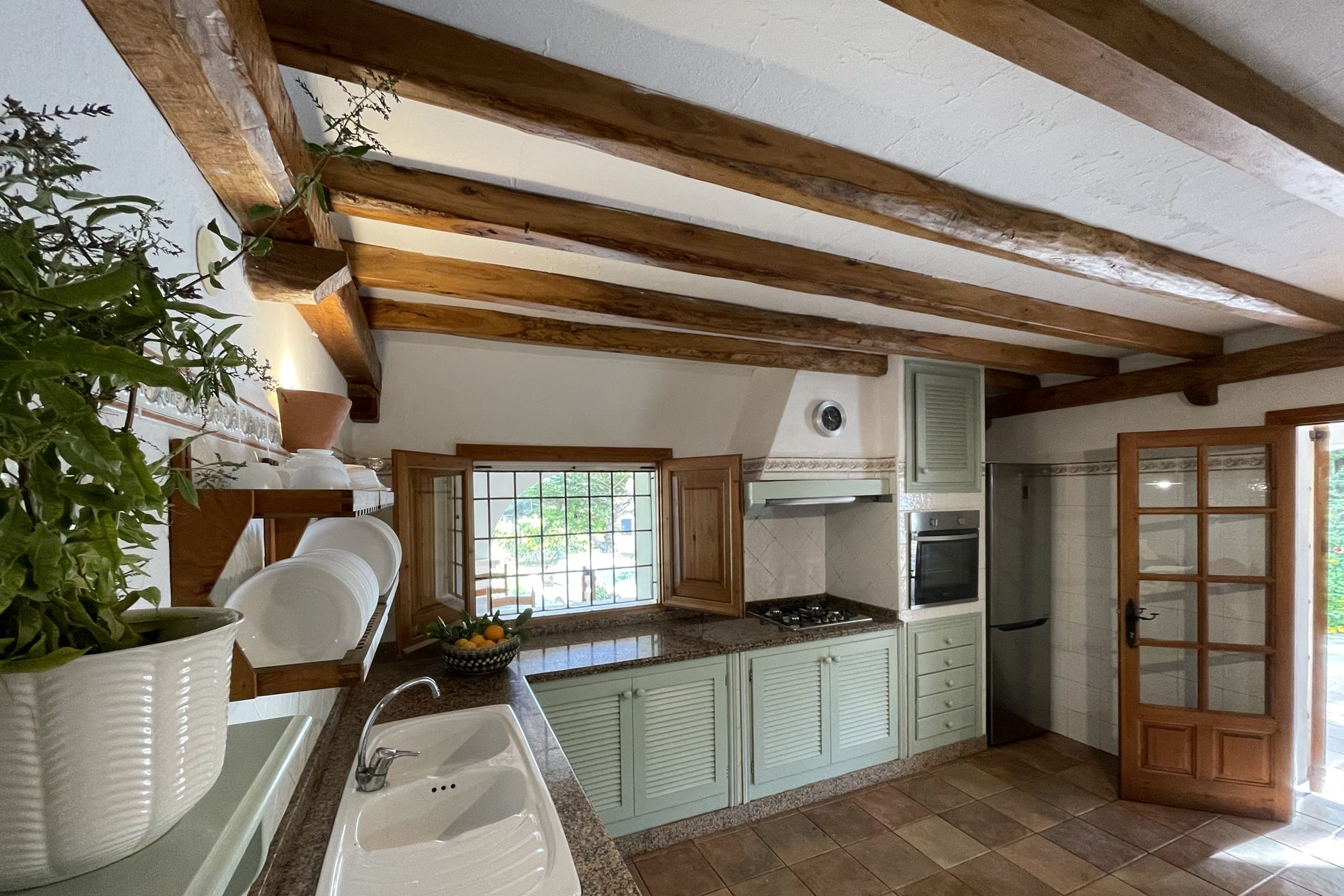The villa features a well-equipped kitchen, a cozy living room with fireplace and traditional juniper-beamed ceilings, and 5 comfortable bedrooms (1 king, 2 queen, and 4 single beds). There are 2 full bathrooms with showers, sinks, toilets, and bidets.