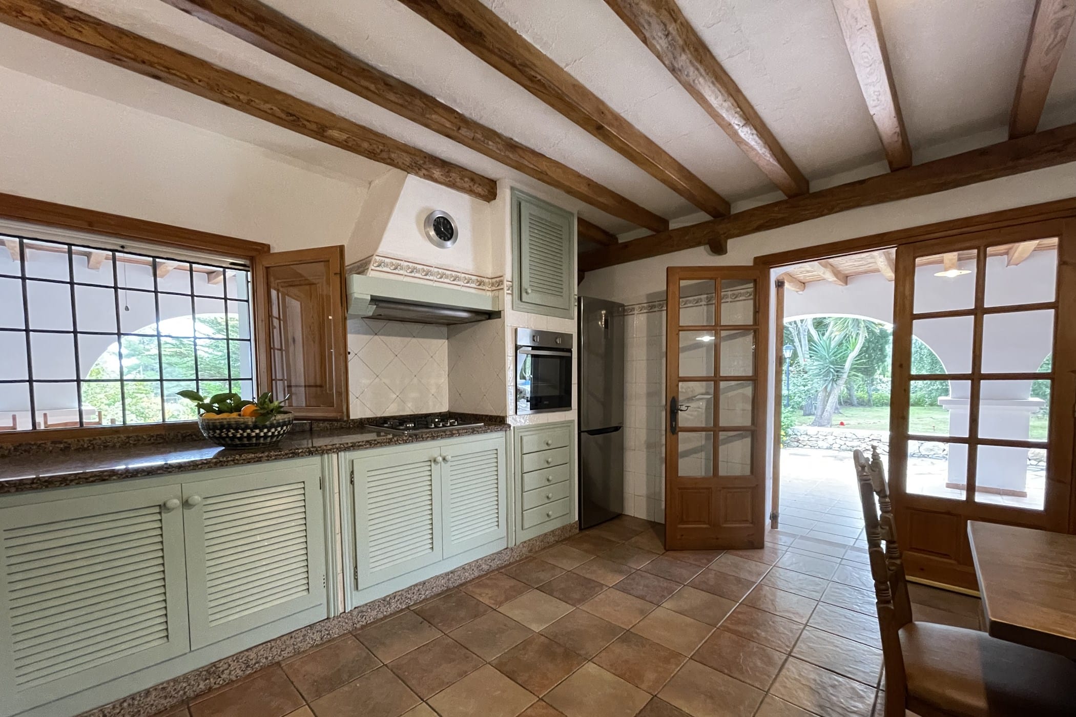 Outdoor highlights include a large swimming pool with sun loungers, a spacious terrace with outdoor seating and dining for alfresco meals, a barbecue area with wood oven, and lush gardens filled with fruit trees, palms, and flowers.
