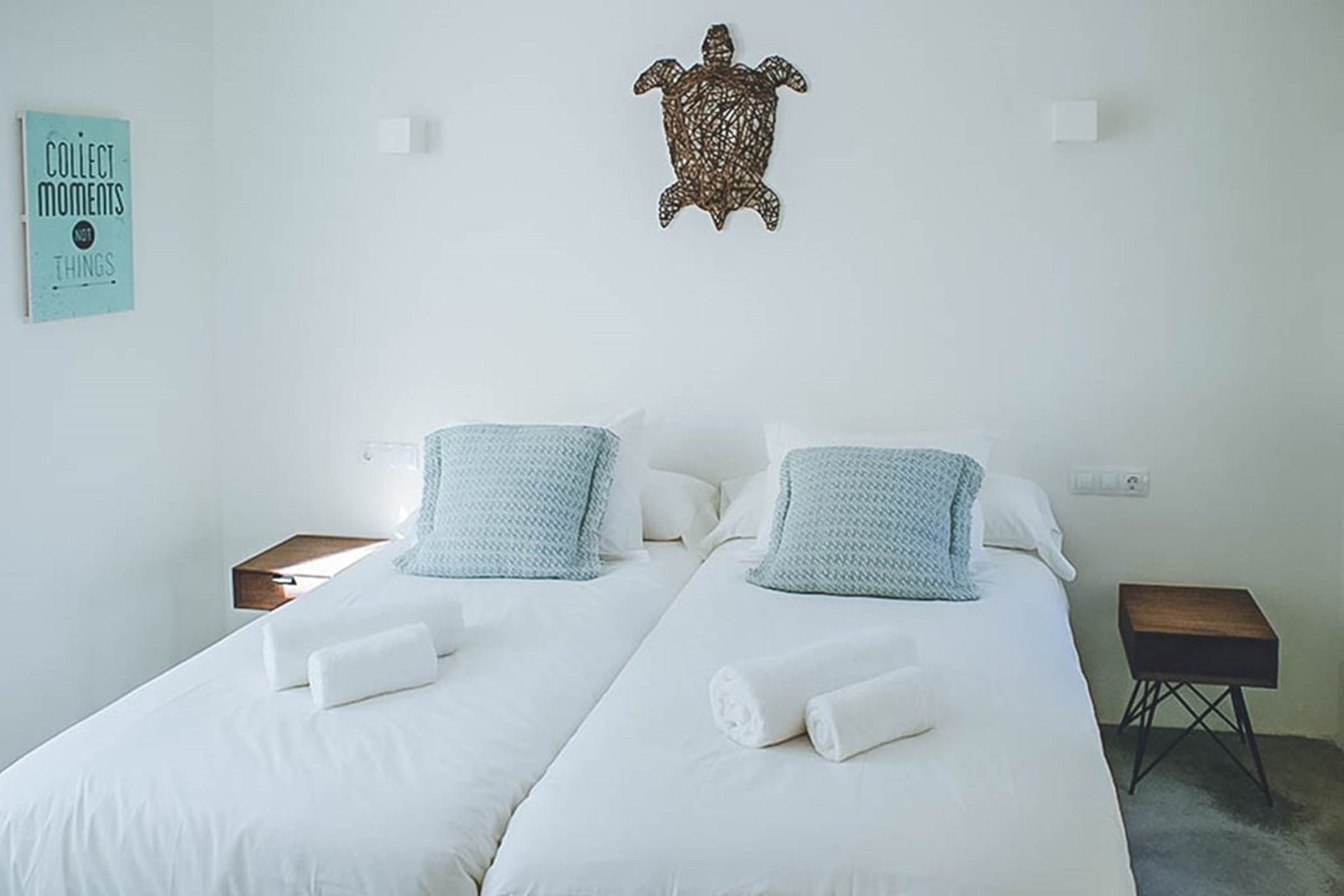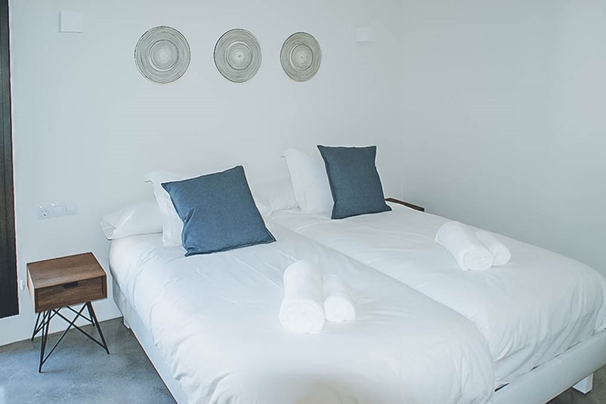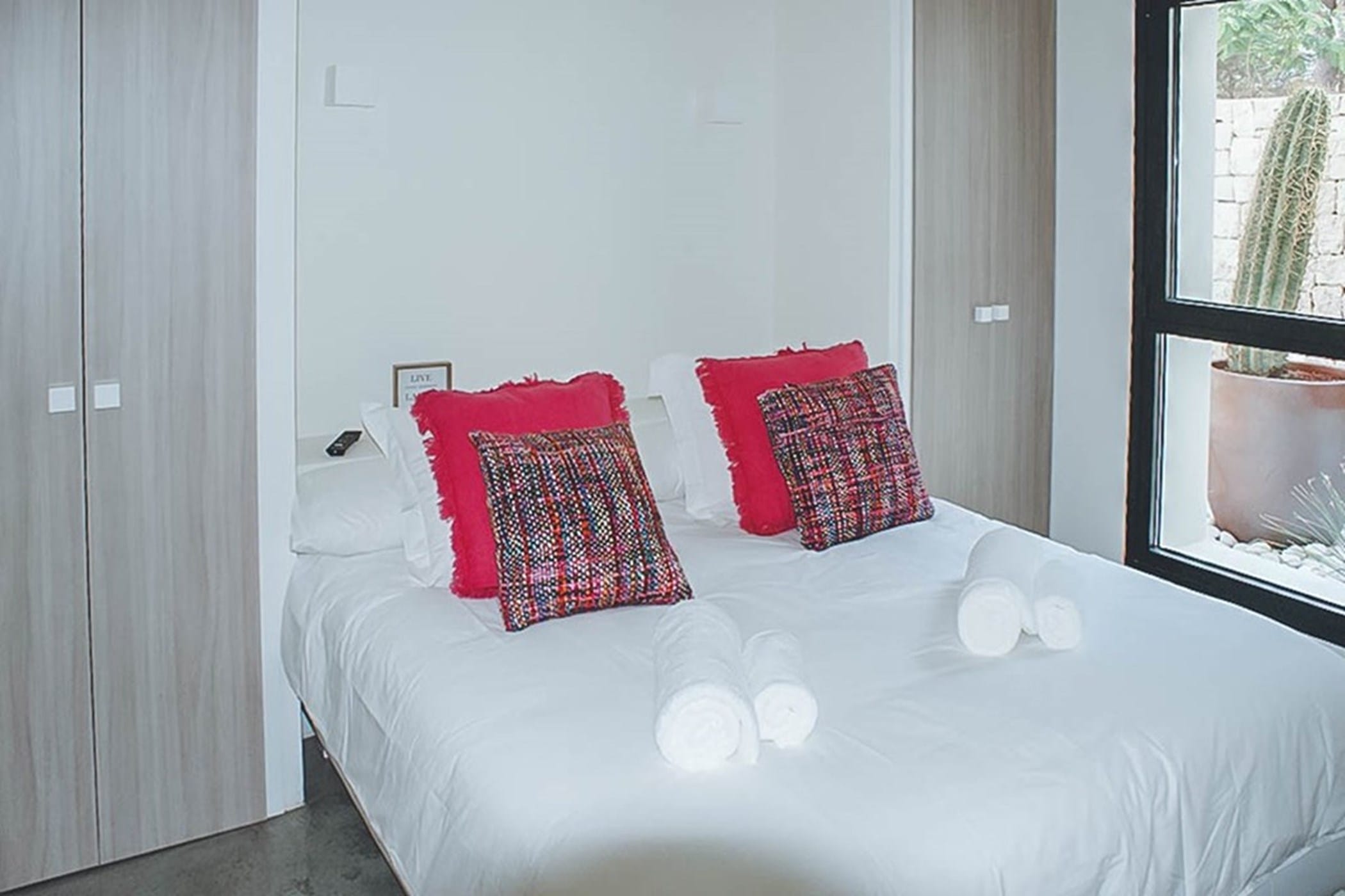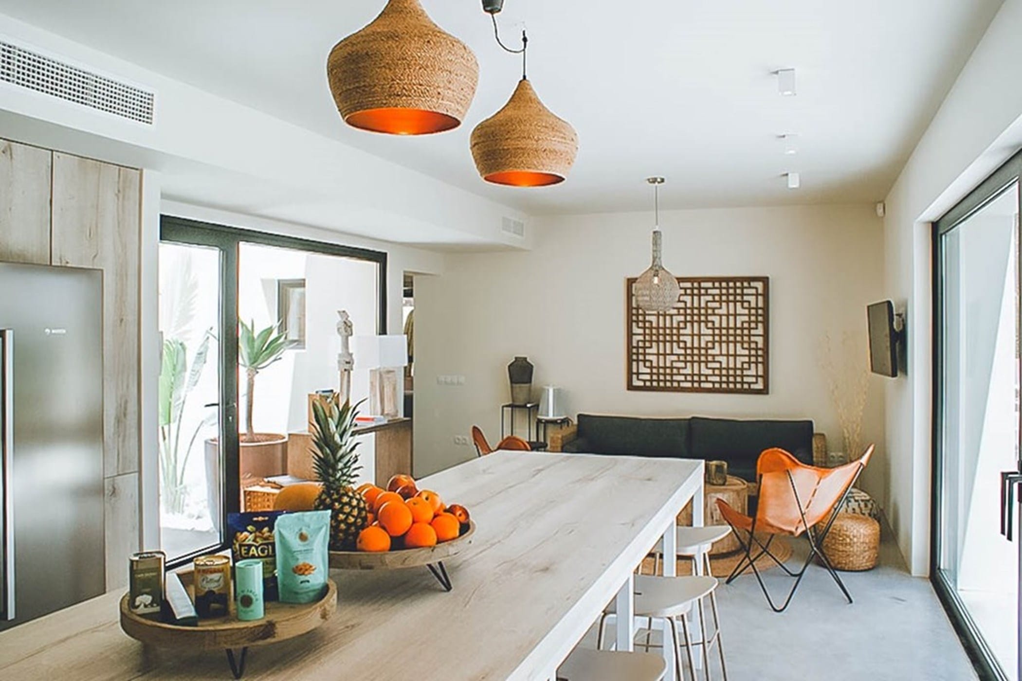 The interior features a contemporary minimalist style blended with authentic Mediterranean touches. The bright open-plan lounge and fully equipped modern kitchen flow seamlessly outdoors. All five double bedrooms are beautifully furnished with en-suite bathrooms, ample wardrobe space, air conditioning, and individual charm highlighted by colourful artwork against neutral tones.