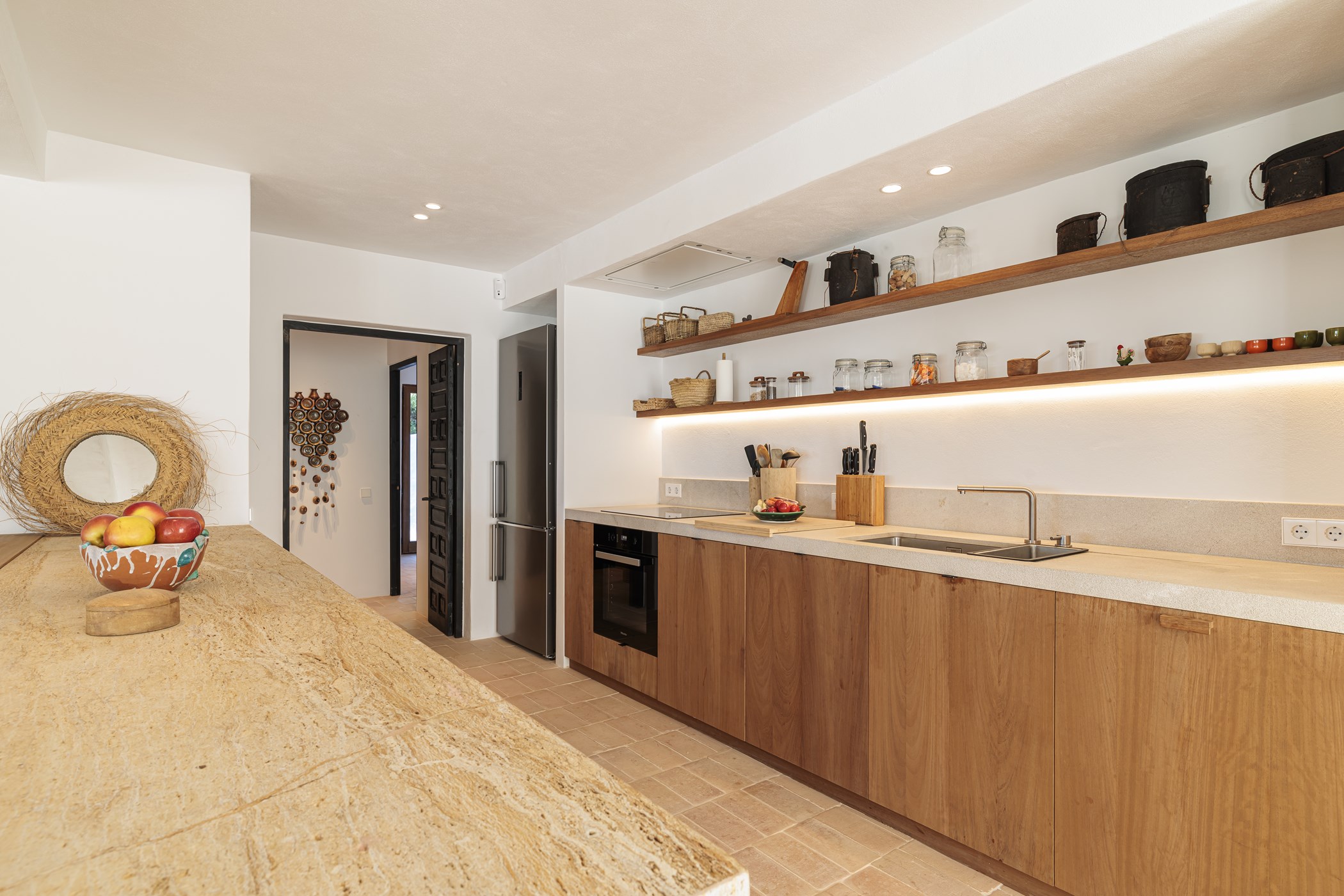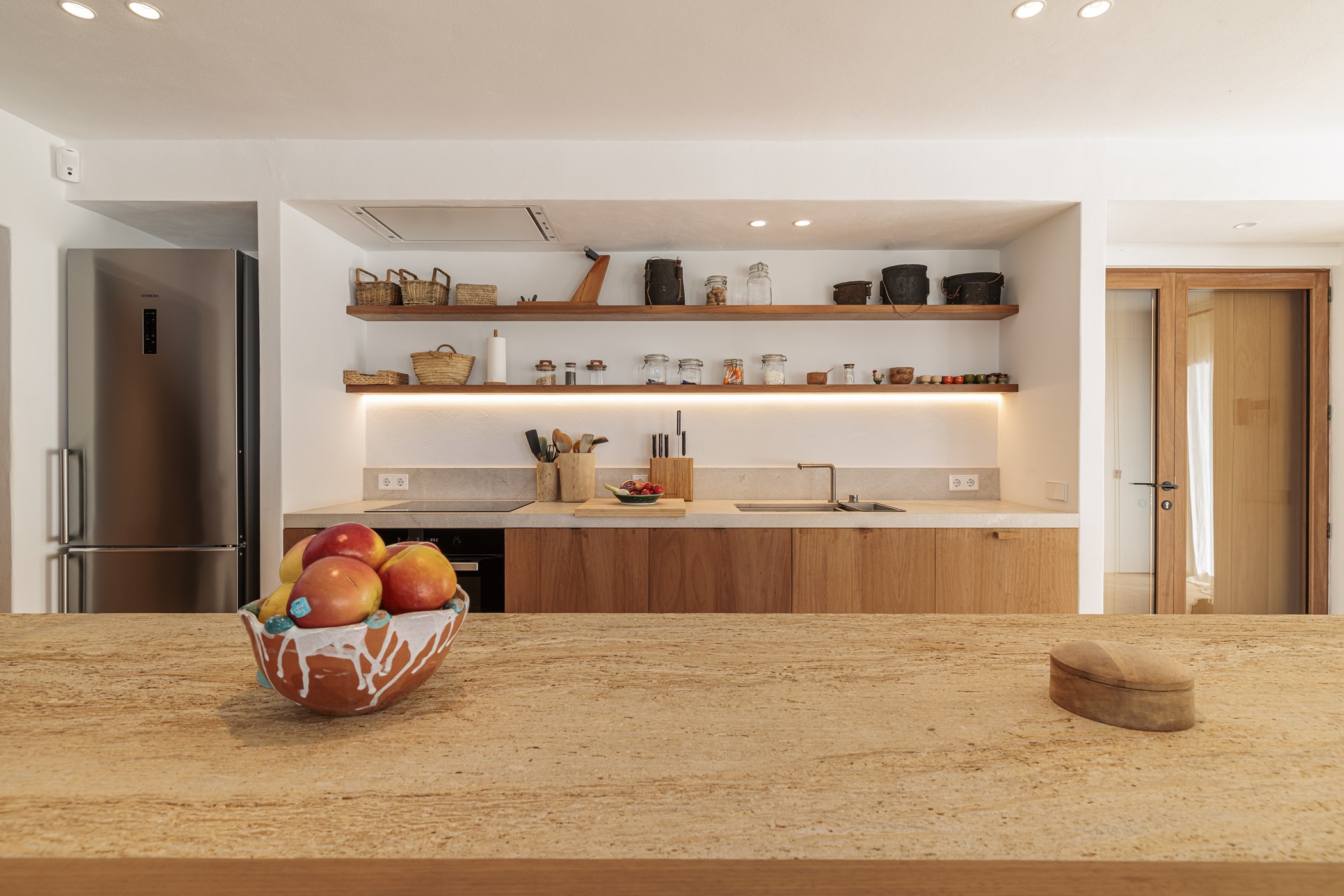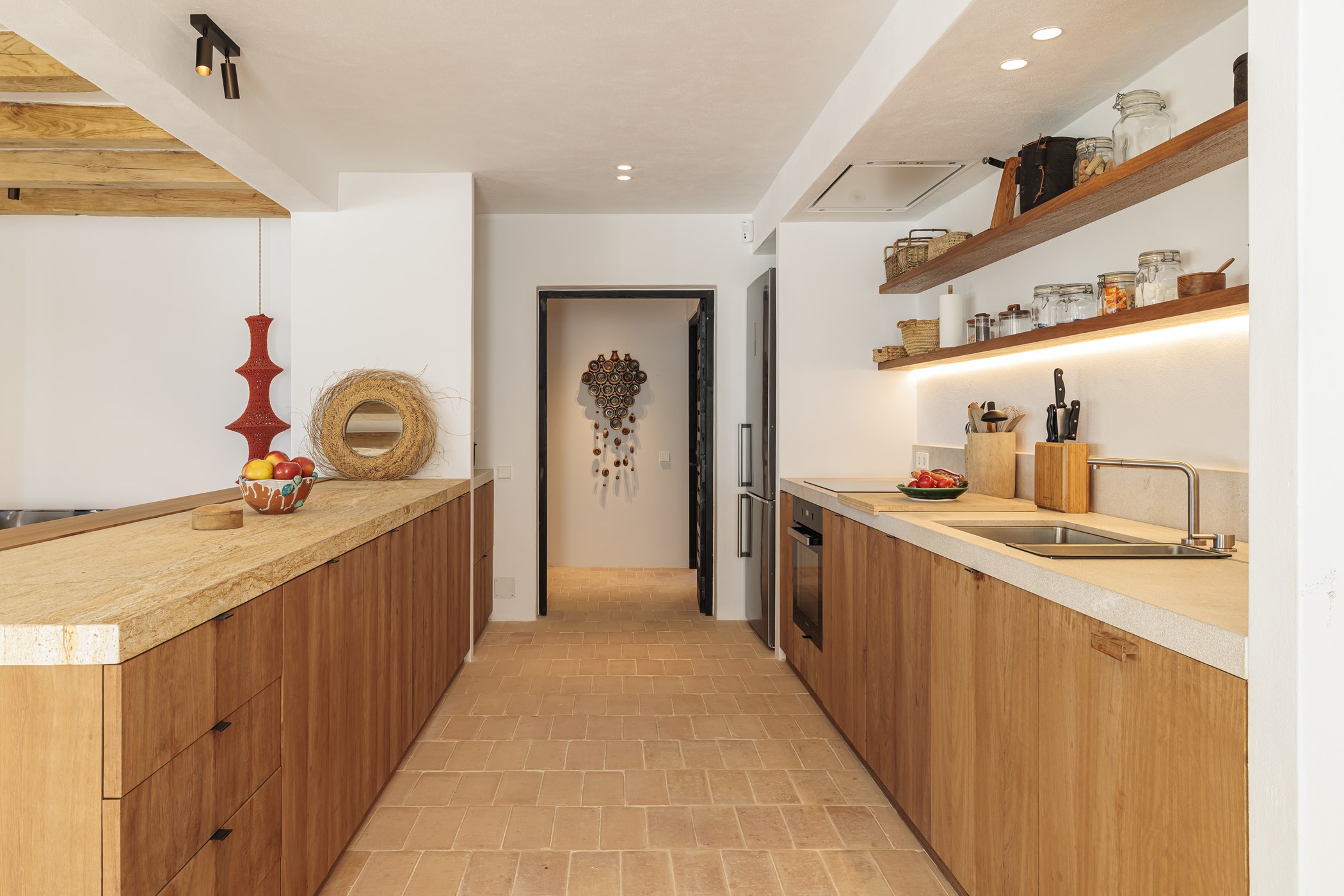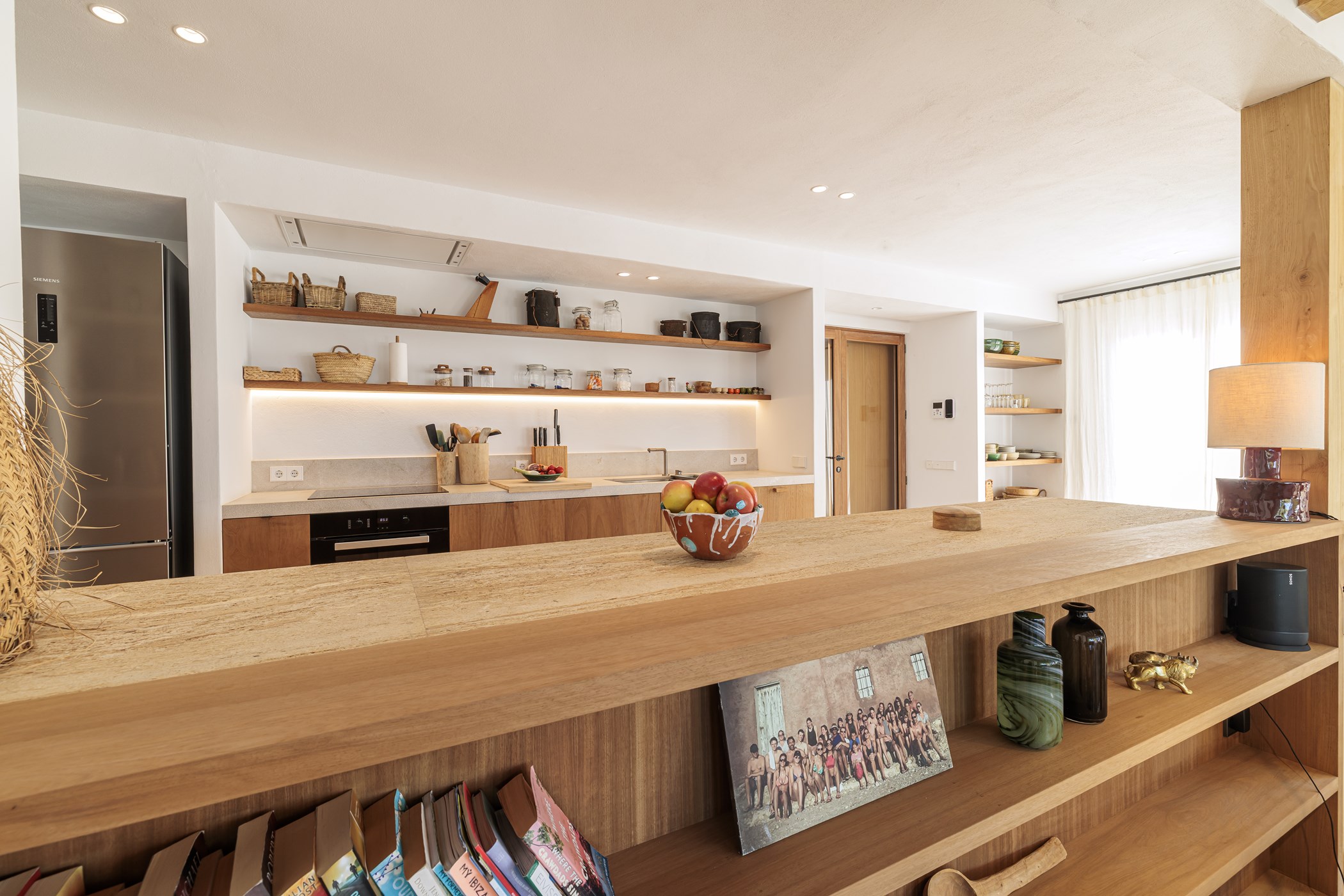 It blends contemporary elegance with Ibiza’s natural beauty. Inside: three beautifully appointed double bedrooms, each with en-suite bathroom. Open-plan living area with panoramic window flooding the space with light and Mediterranean views, plus sleek integrated kitchen.