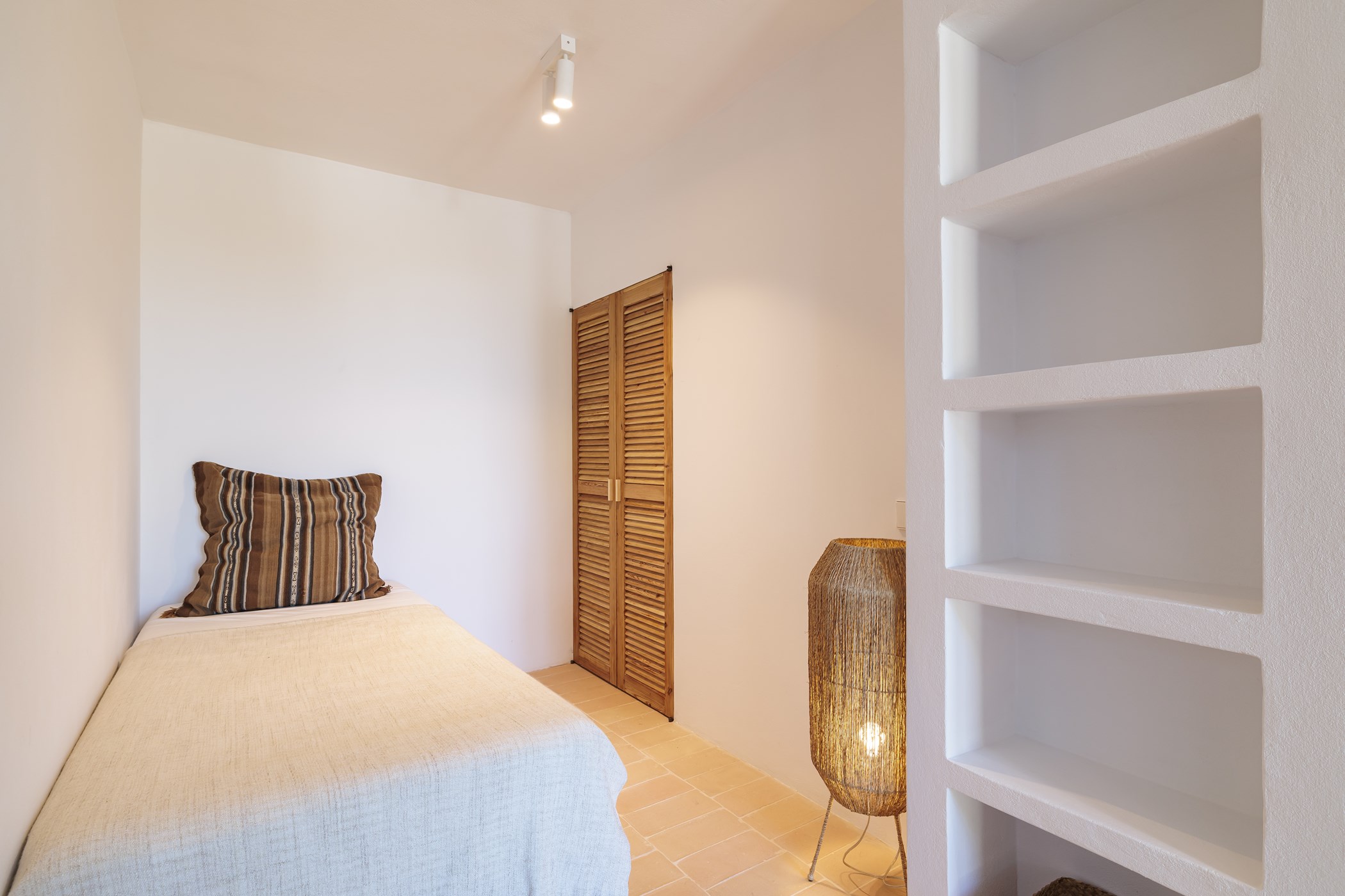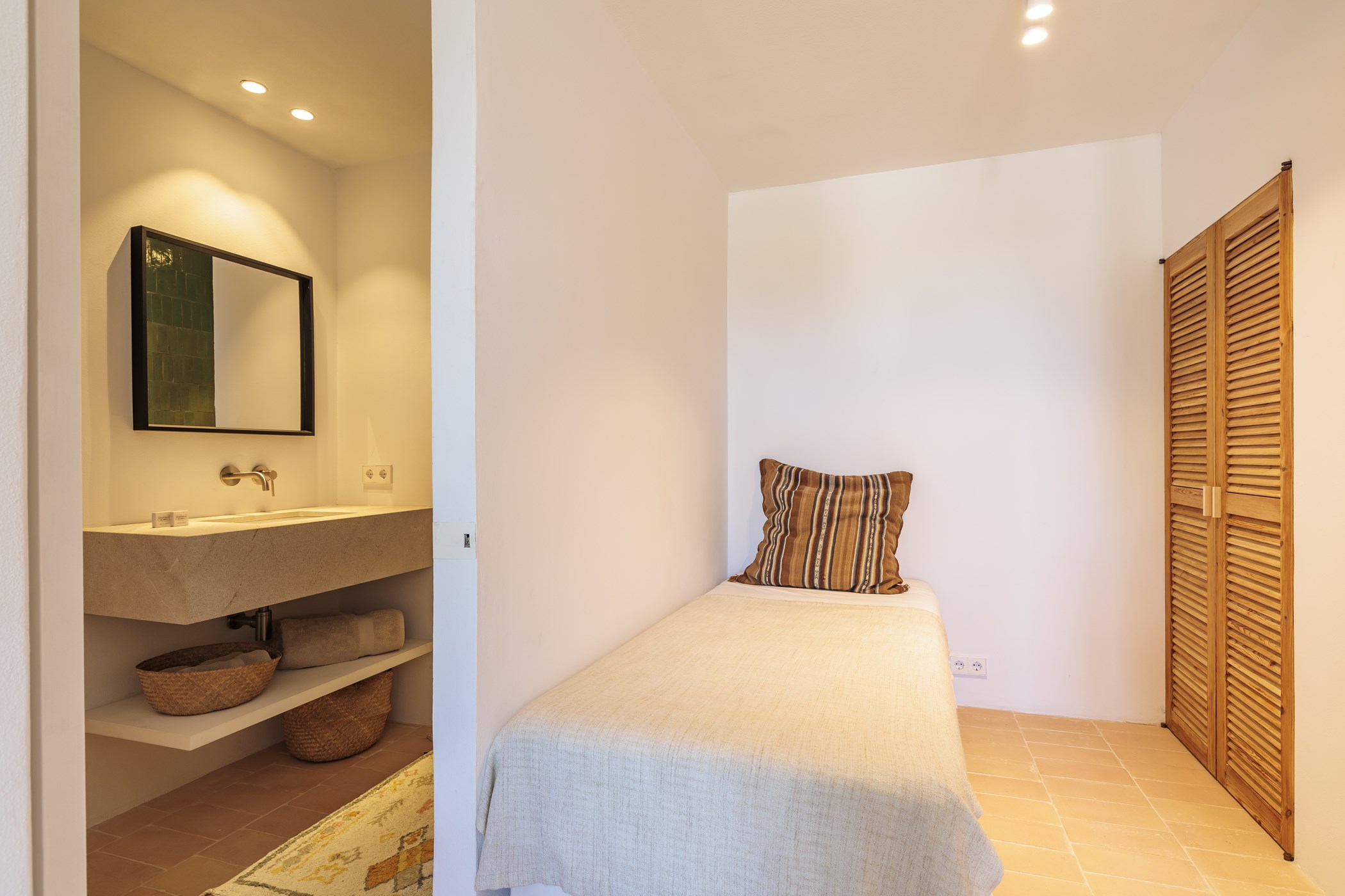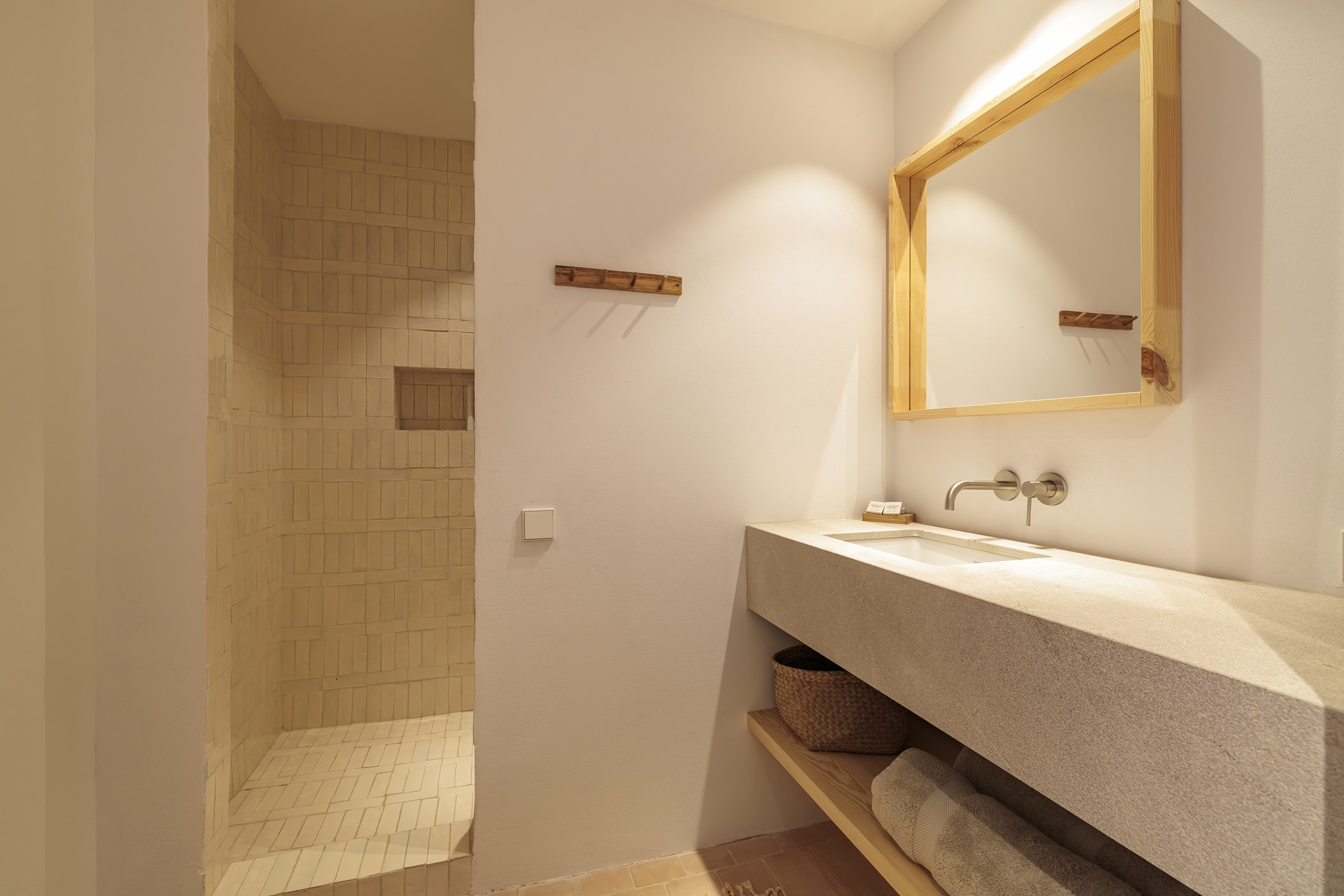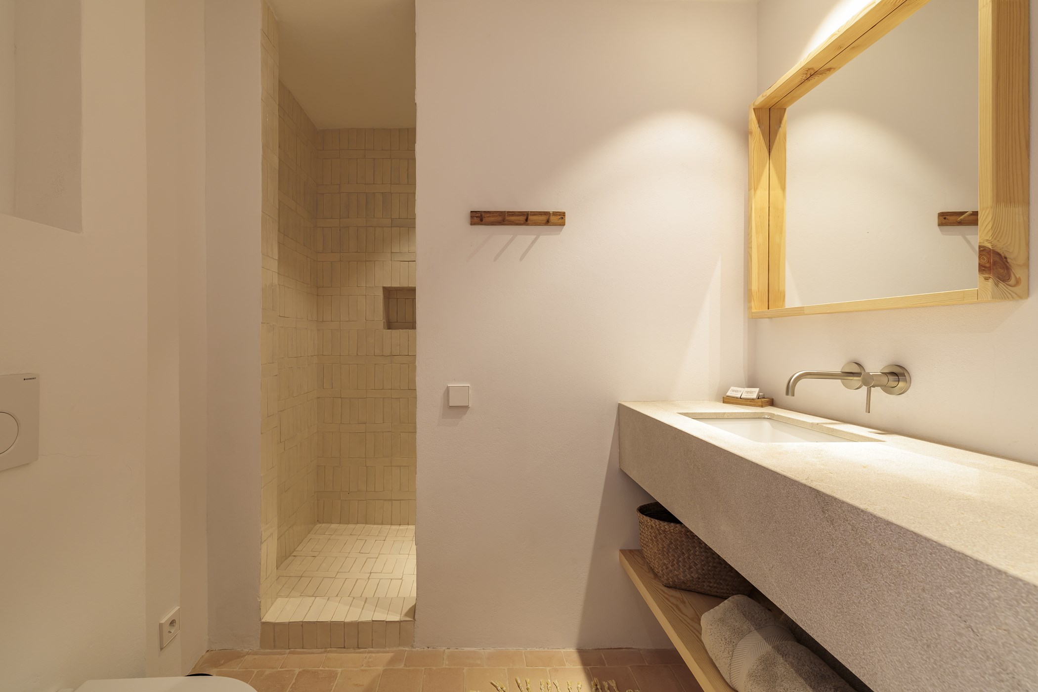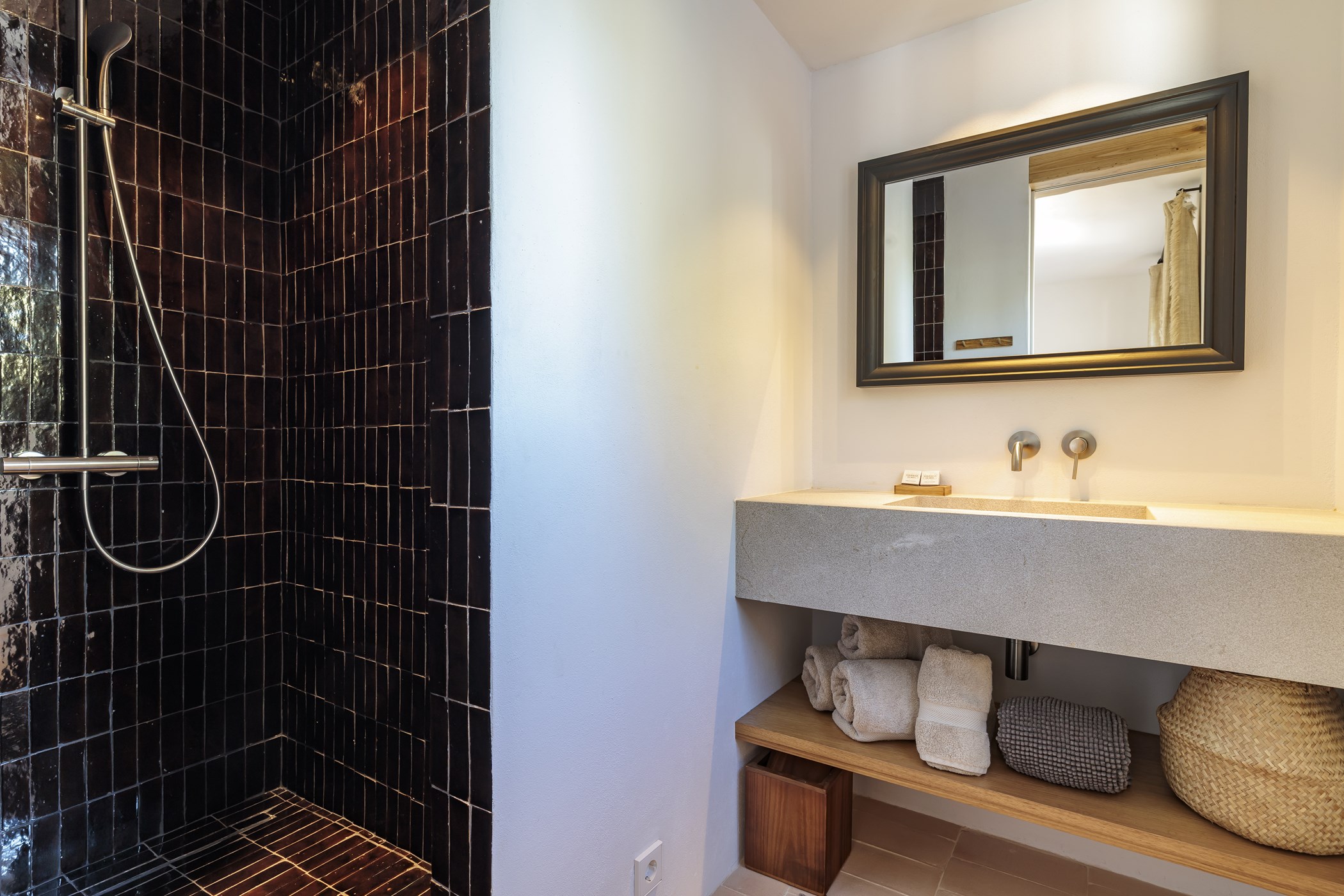 It blends contemporary elegance with Ibiza’s natural beauty. Inside: three beautifully appointed double bedrooms, each with en-suite bathroom. Open-plan living area with panoramic window flooding the space with light and Mediterranean views, plus sleek integrated kitchen.