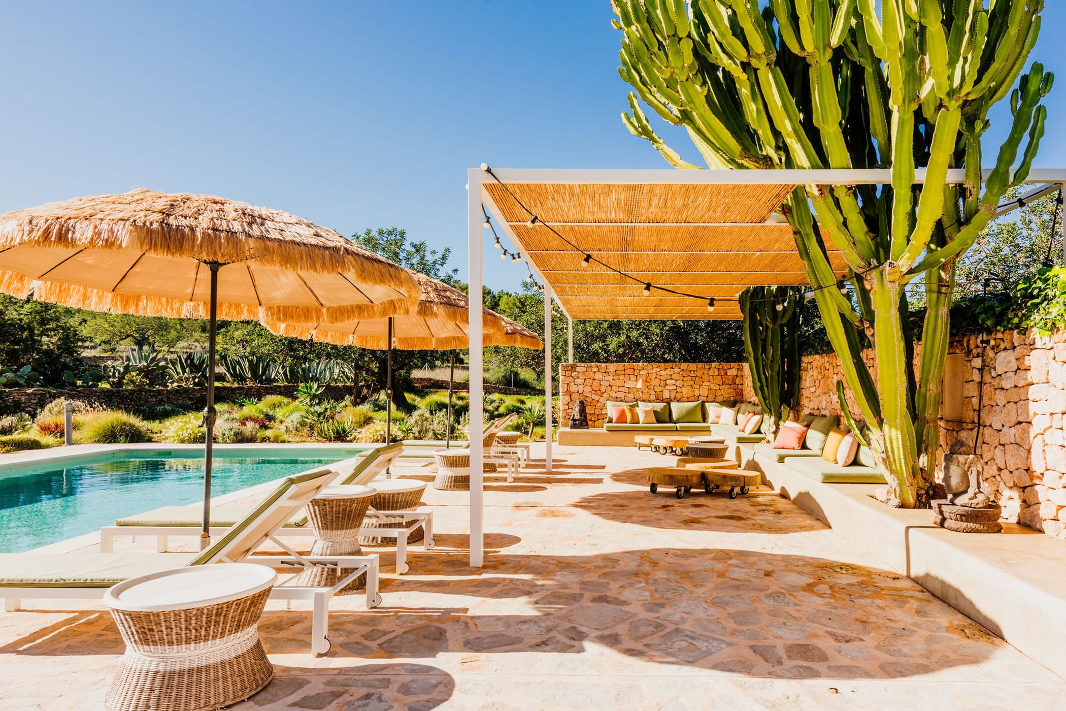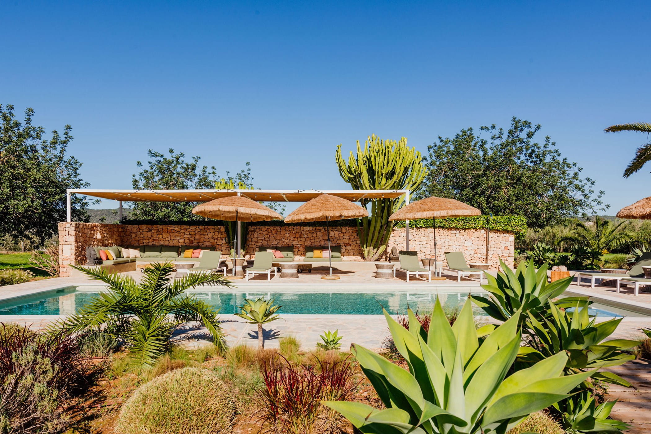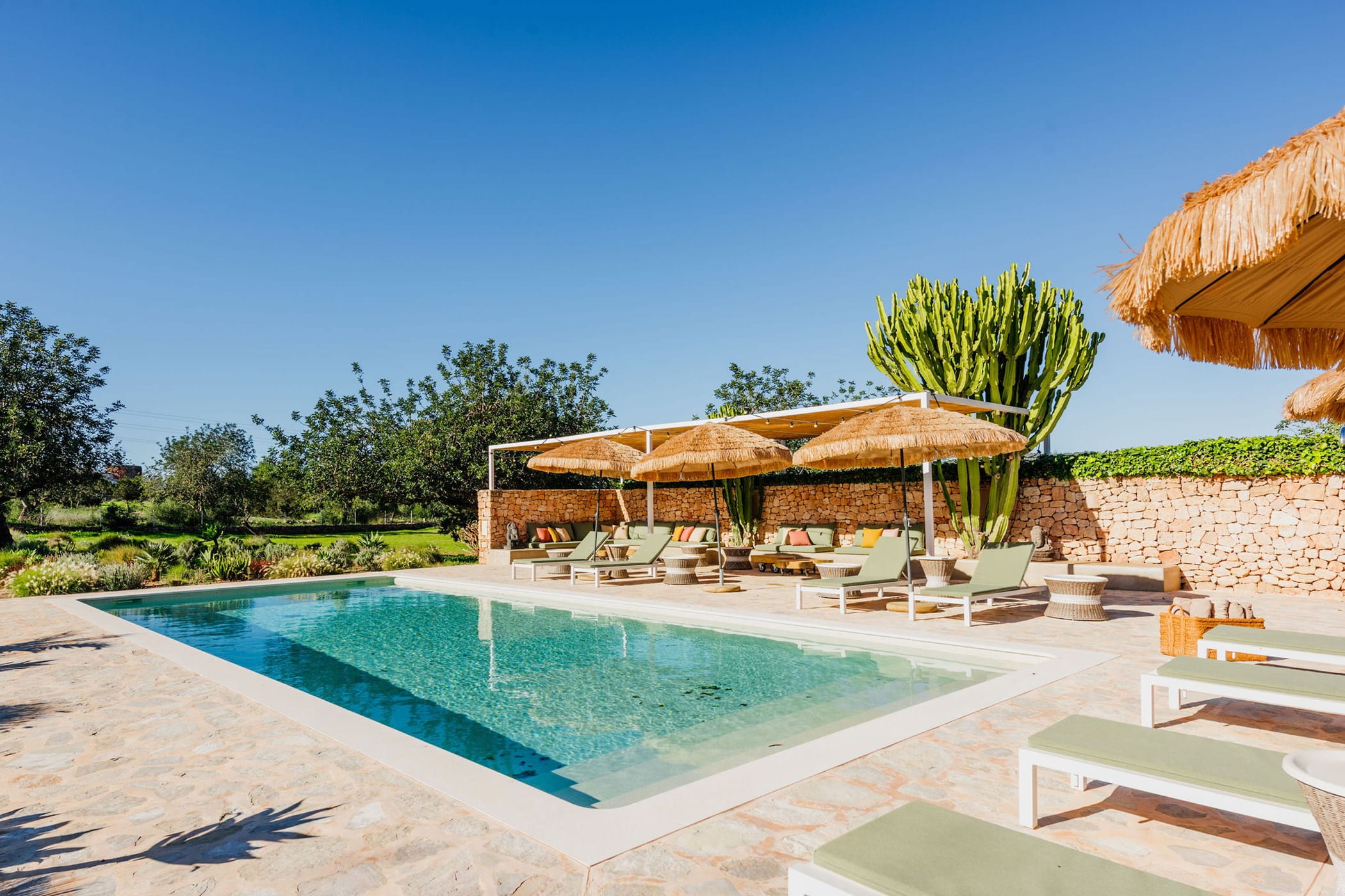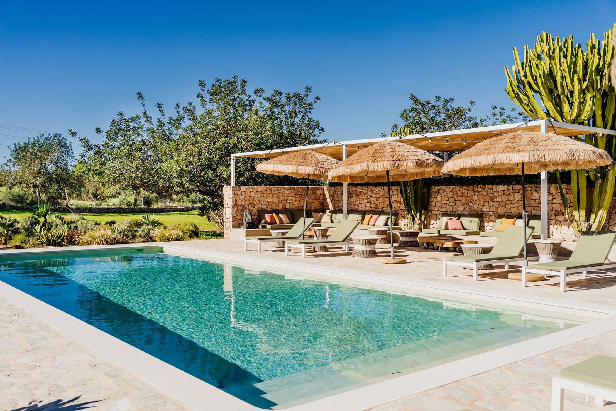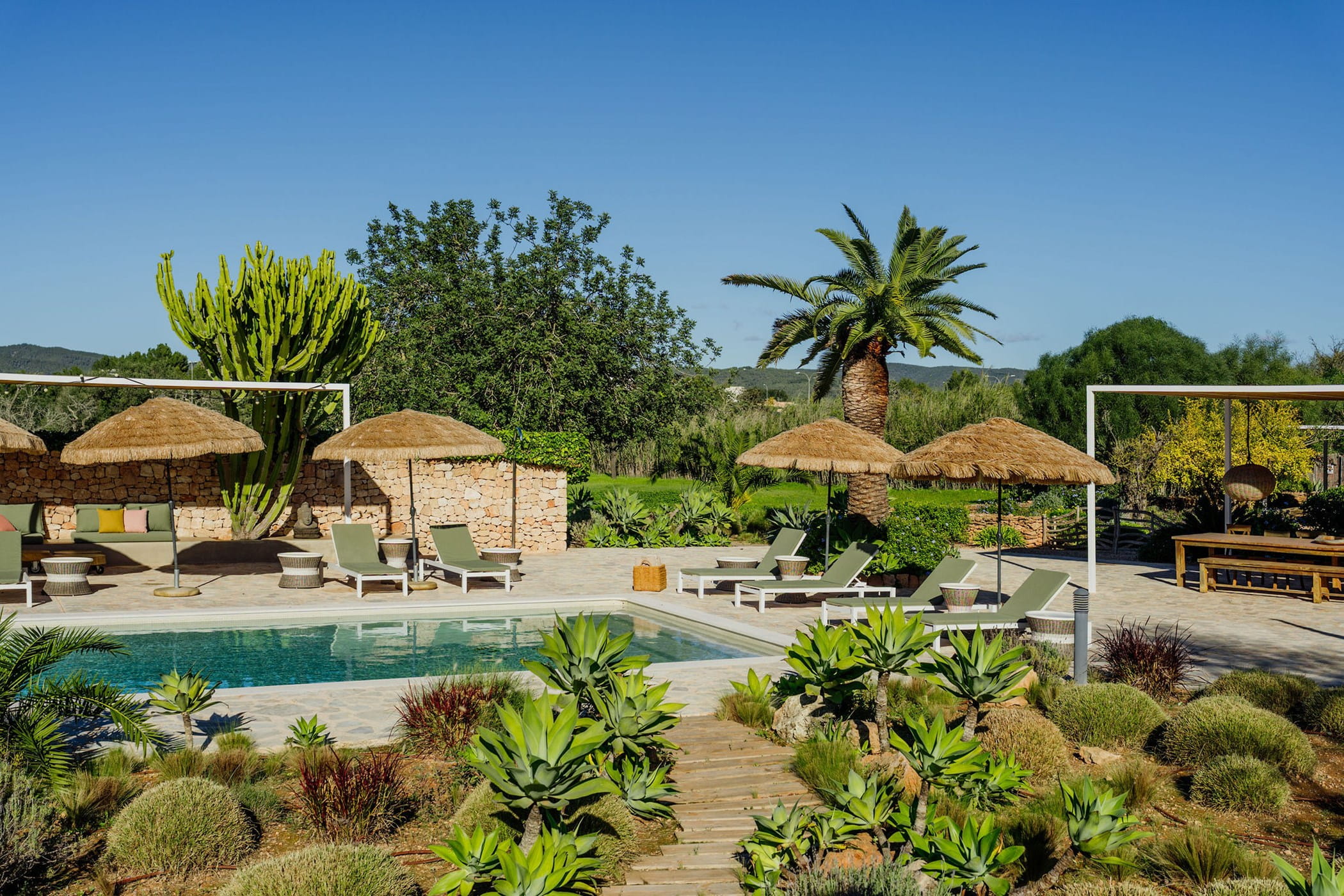 Outdoors: 13x5m saltwater pool surrounded by terraces, shaded seating, chill-out spots, and an outdoor dining area for 12. Informal garden seating throughout. Low-water Mediterranean landscaping integrates naturally with the countryside.