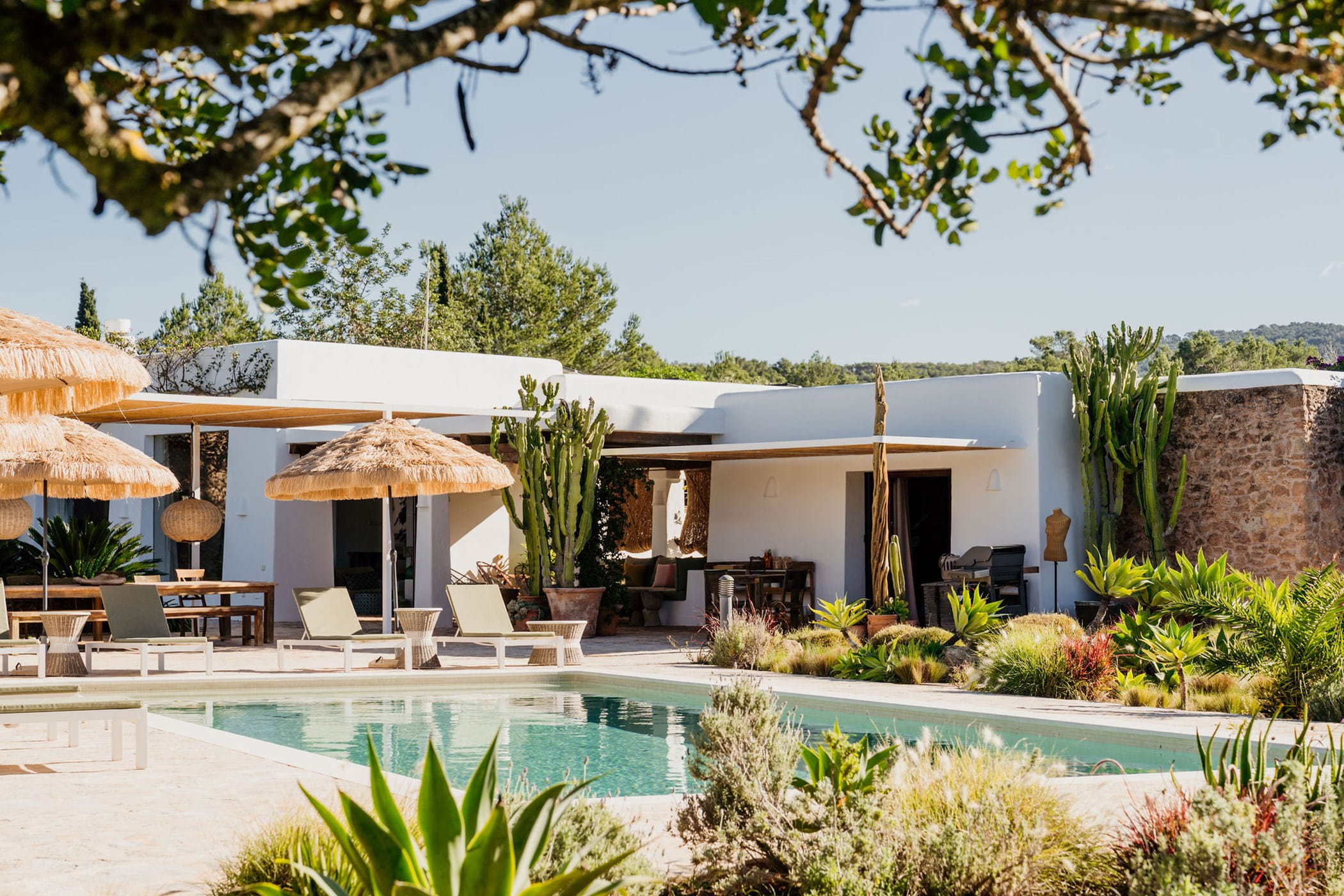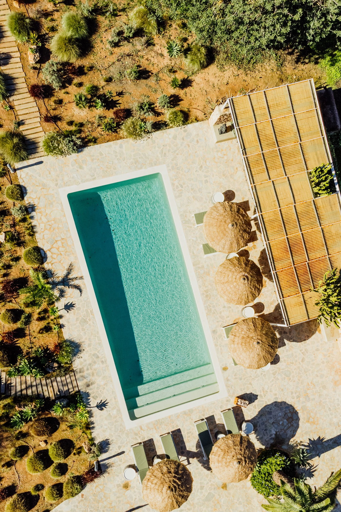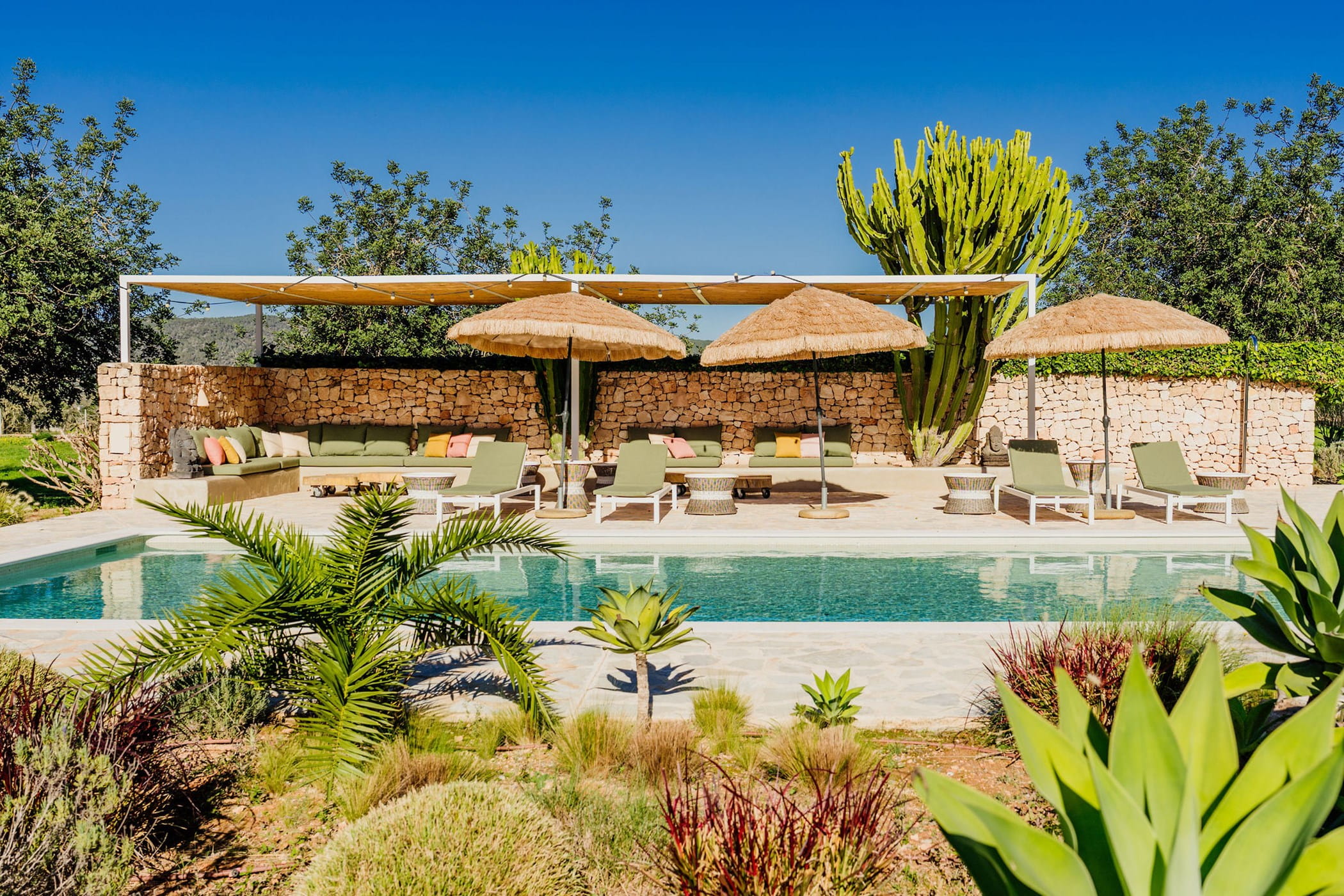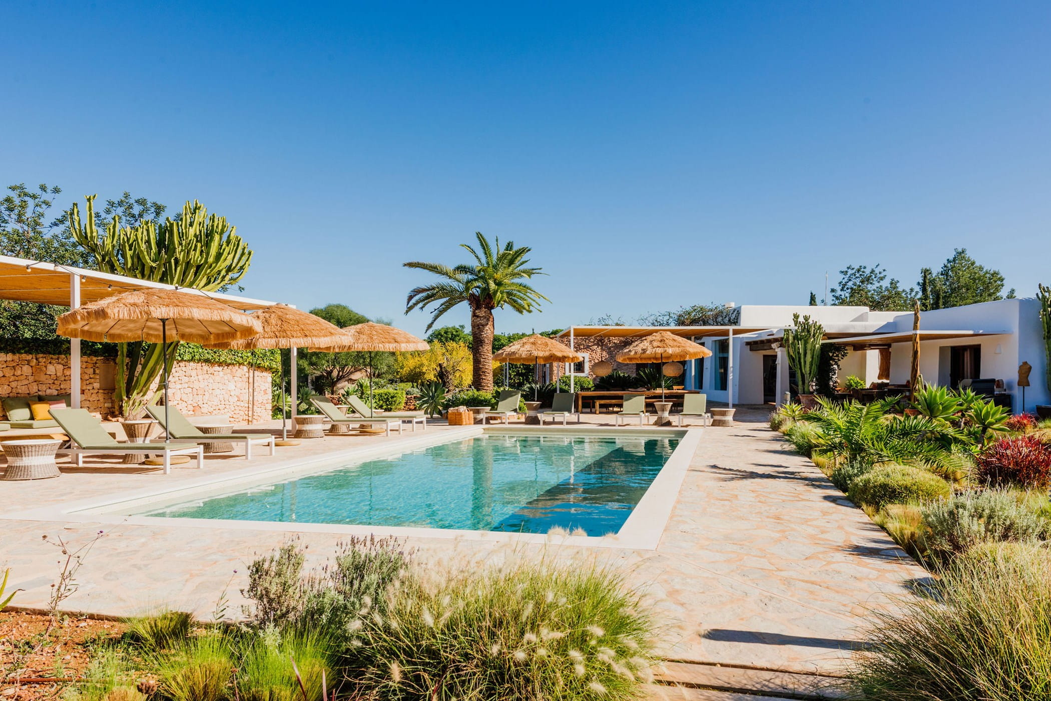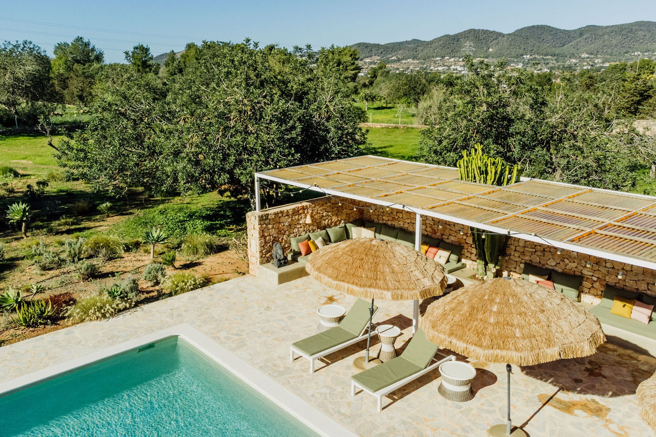 Outdoors: 13x5m saltwater pool surrounded by terraces, shaded seating, chill-out spots, and an outdoor dining area for 12. Informal garden seating throughout. Low-water Mediterranean landscaping integrates naturally with the countryside.