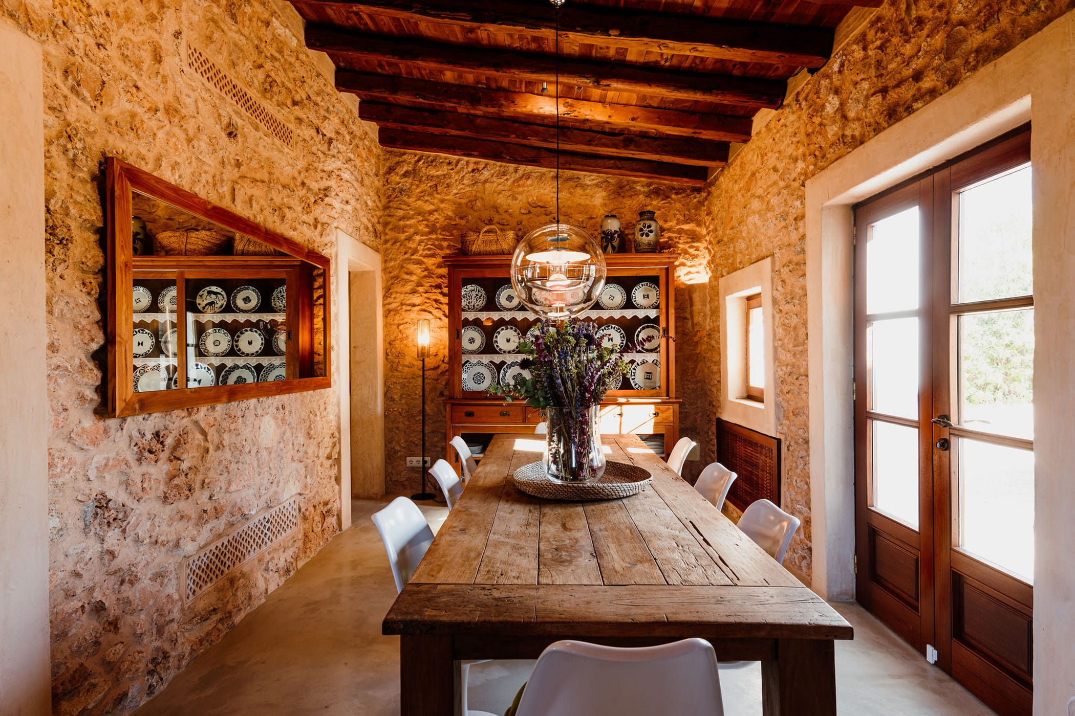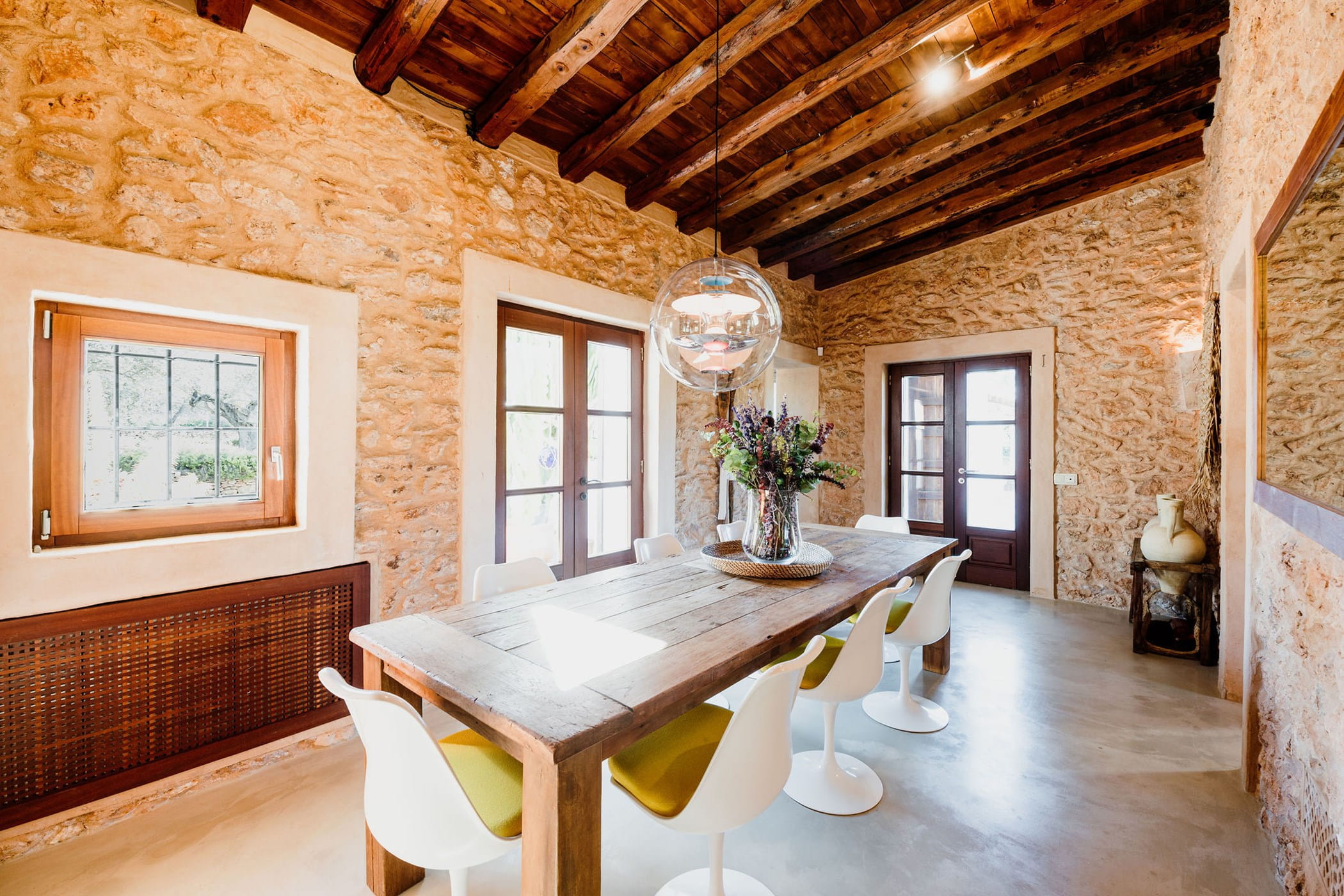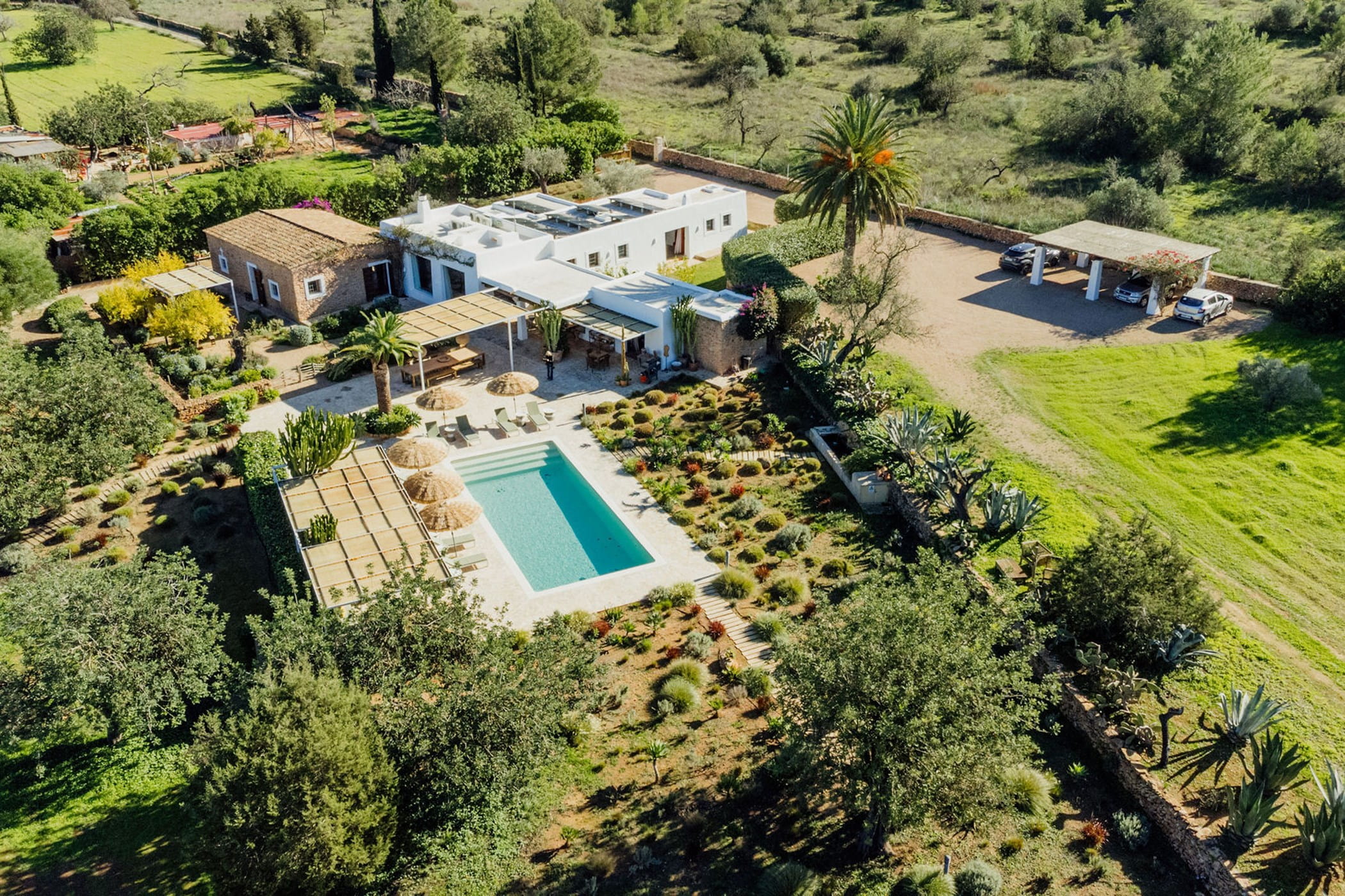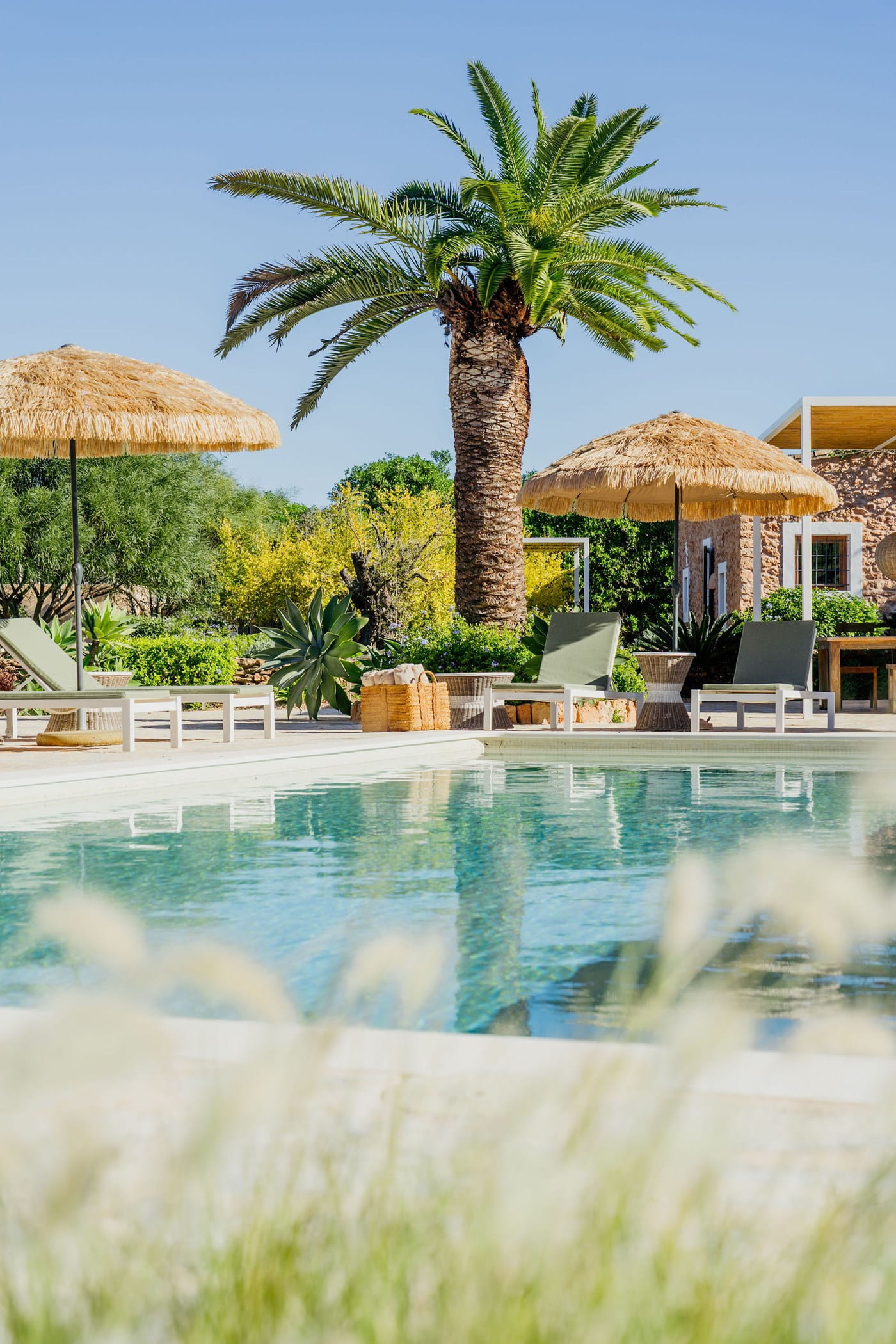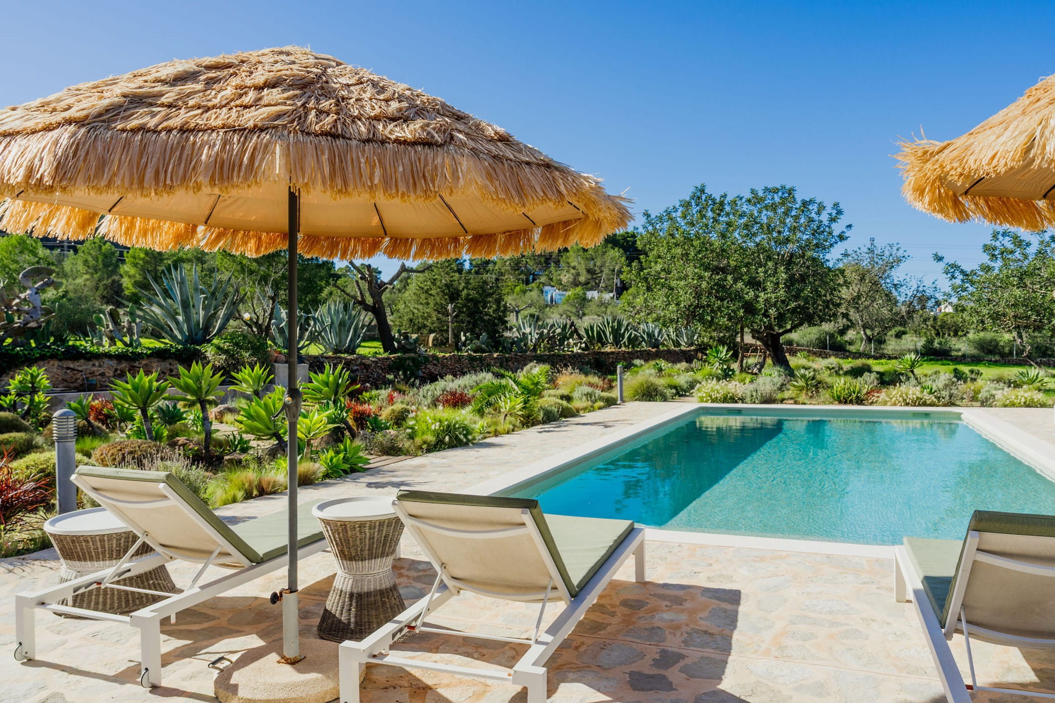 Outdoors: 13x5m saltwater pool surrounded by terraces, shaded seating, chill-out spots, and an outdoor dining area for 12. Informal garden seating throughout. Low-water Mediterranean landscaping integrates naturally with the countryside.