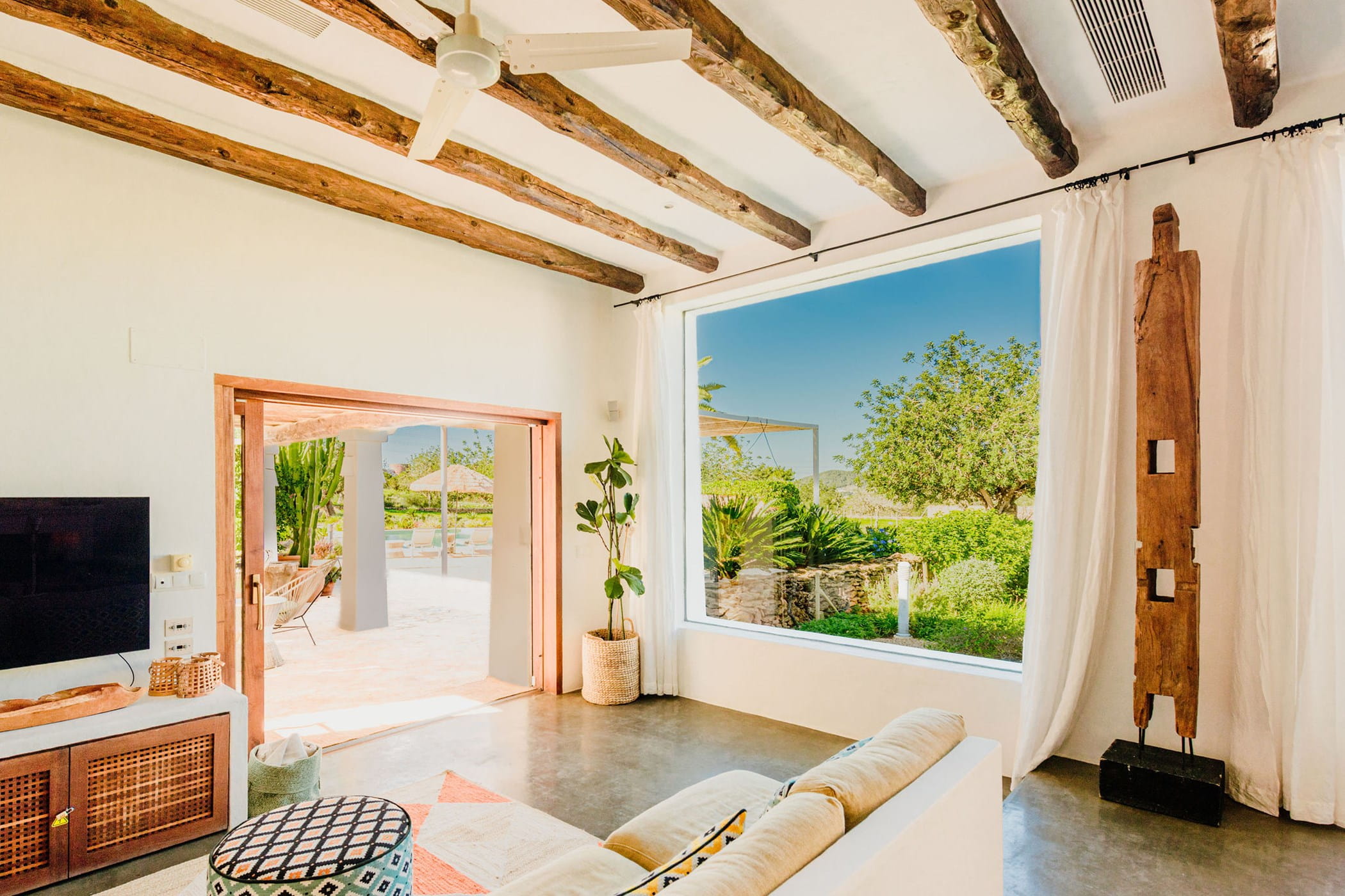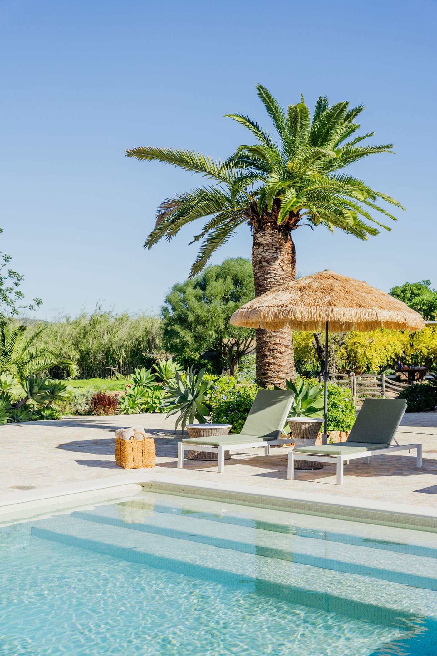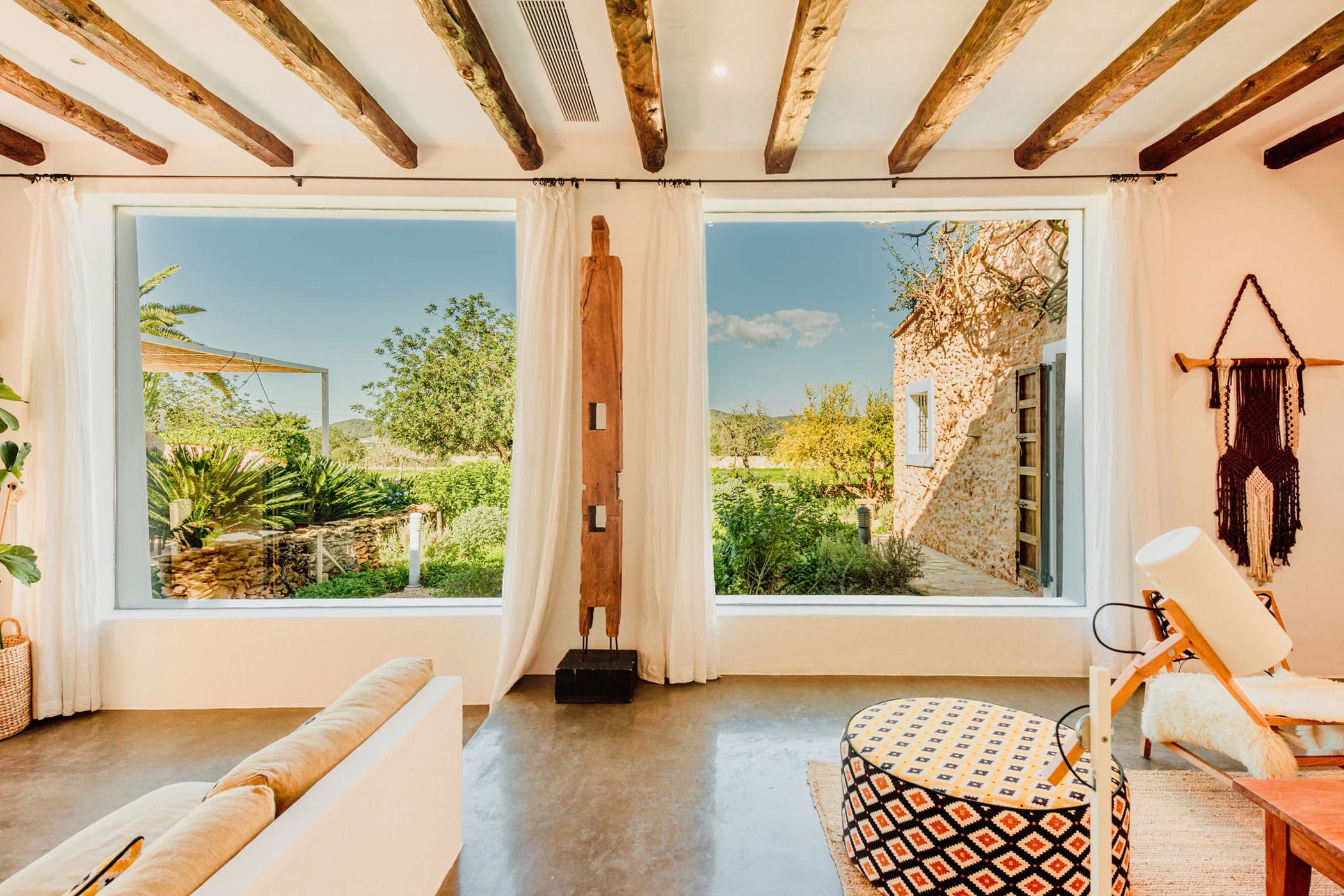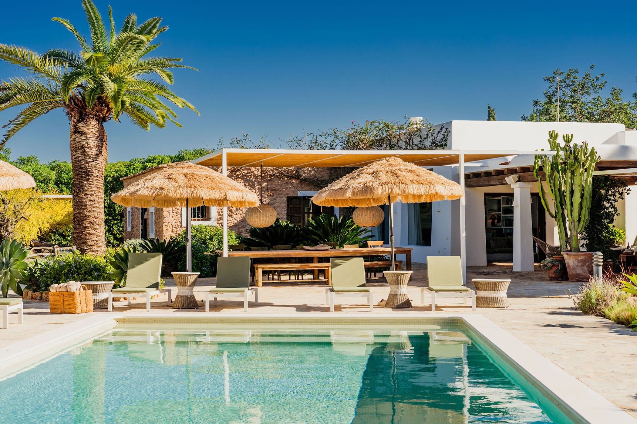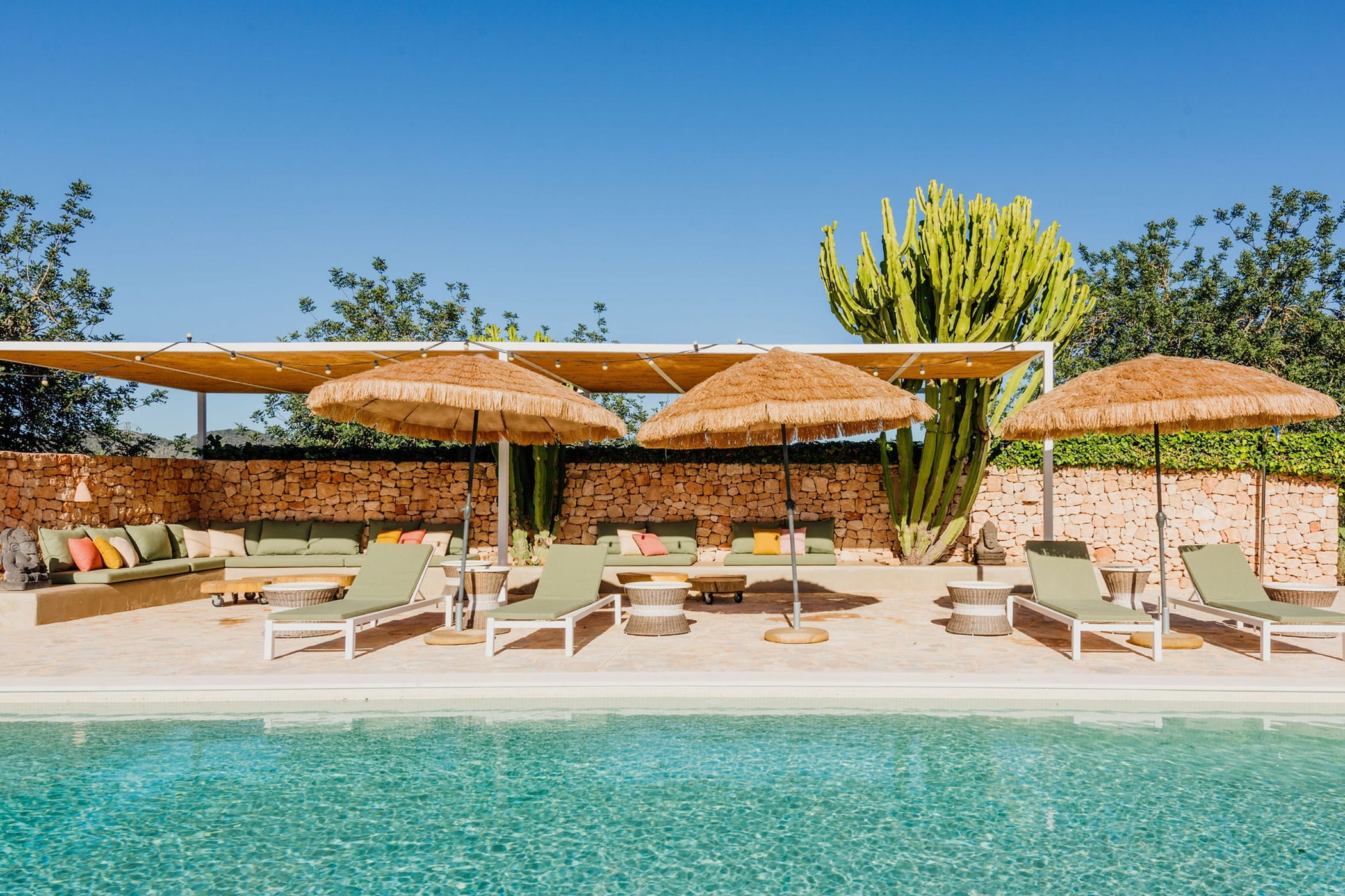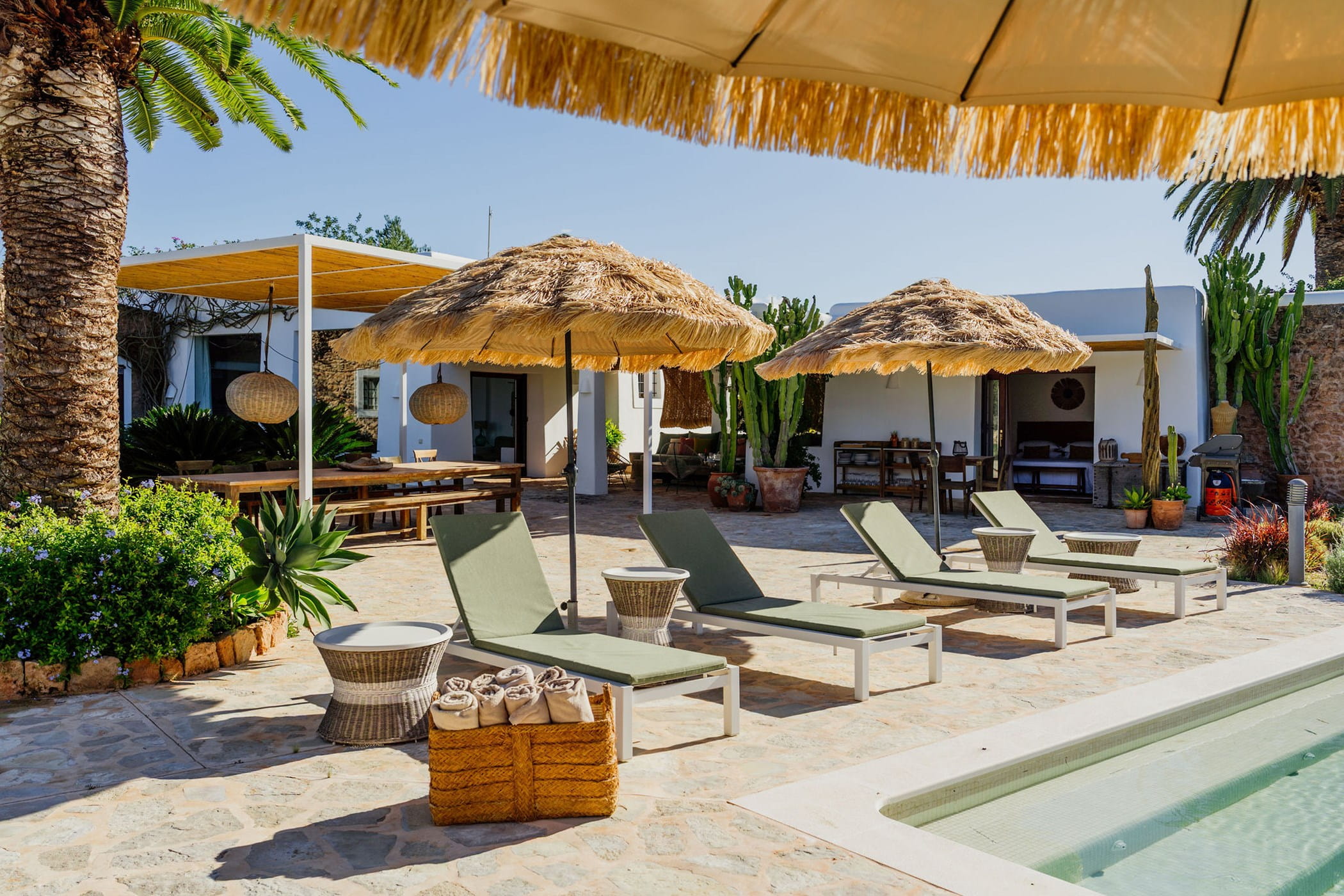 Outdoors: 13x5m saltwater pool surrounded by terraces, shaded seating, chill-out spots, and an outdoor dining area for 12. Informal garden seating throughout. Low-water Mediterranean landscaping integrates naturally with the countryside.