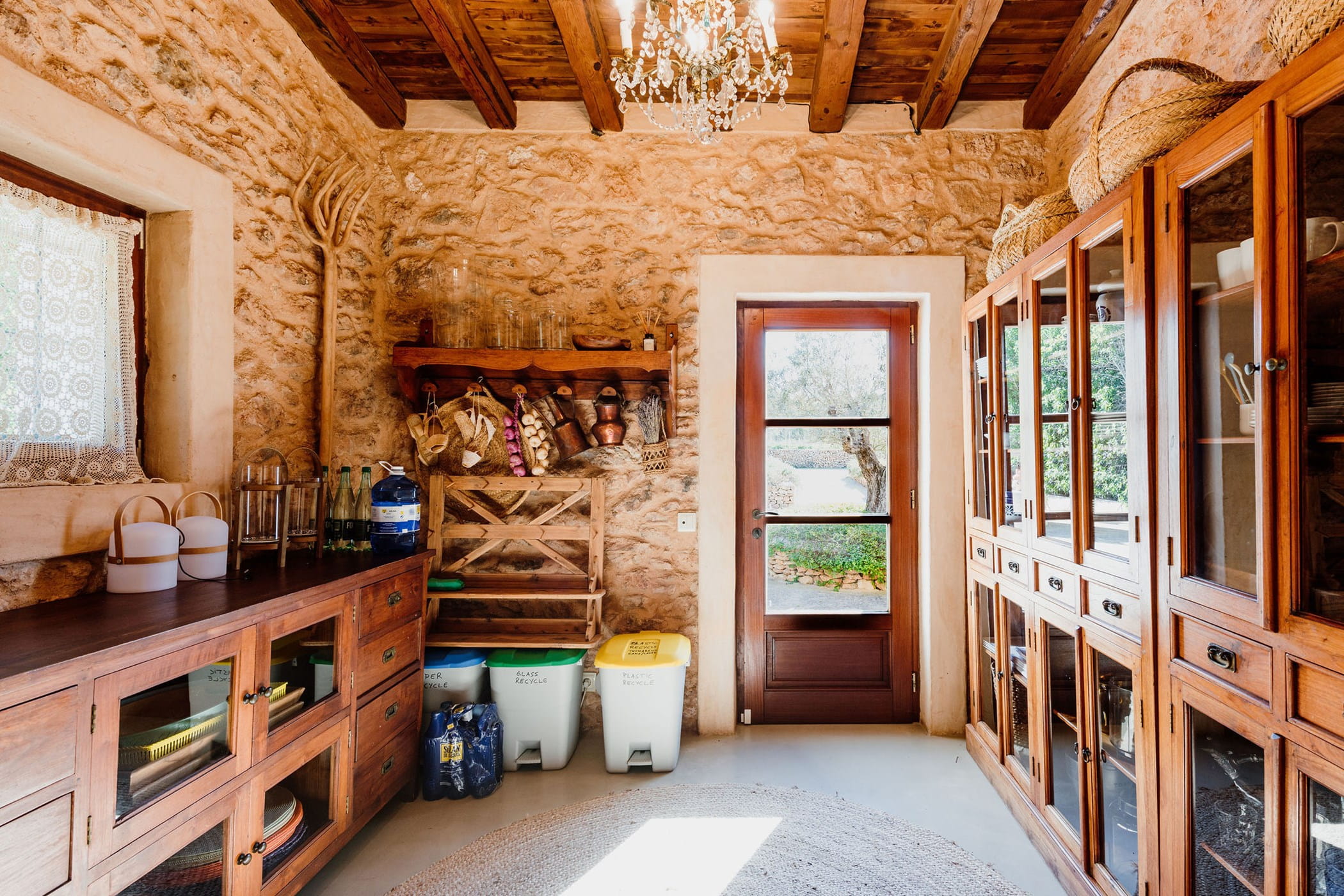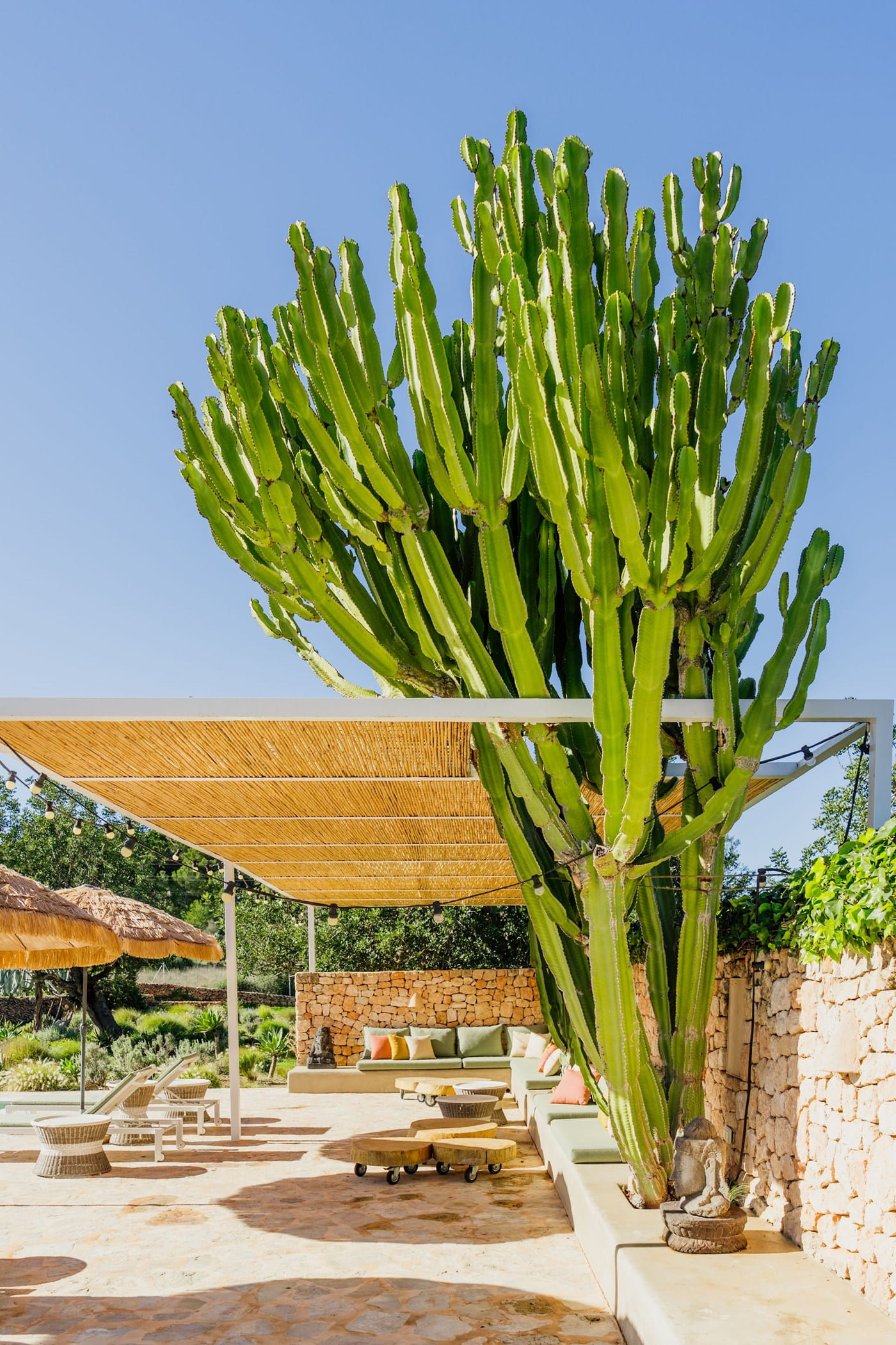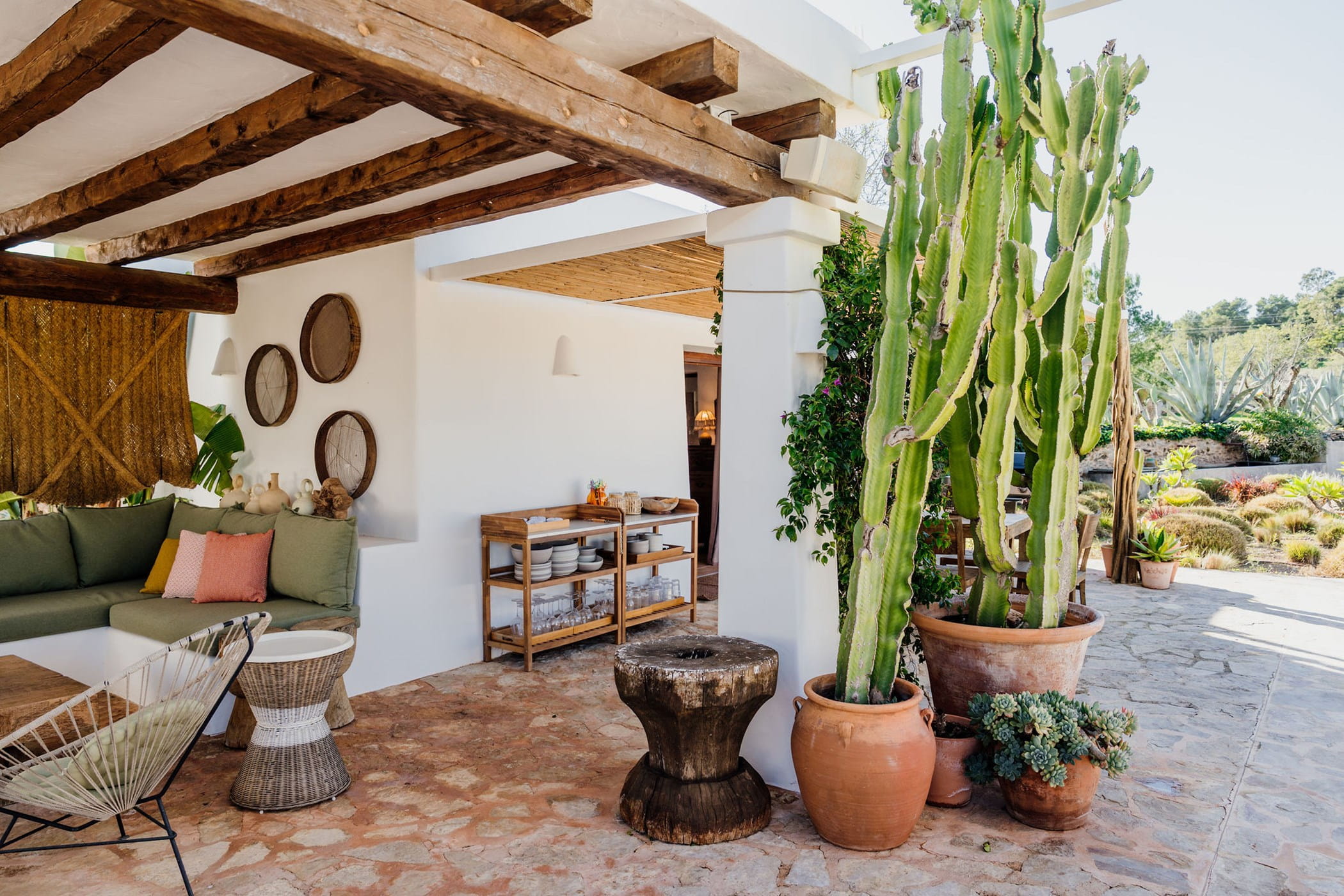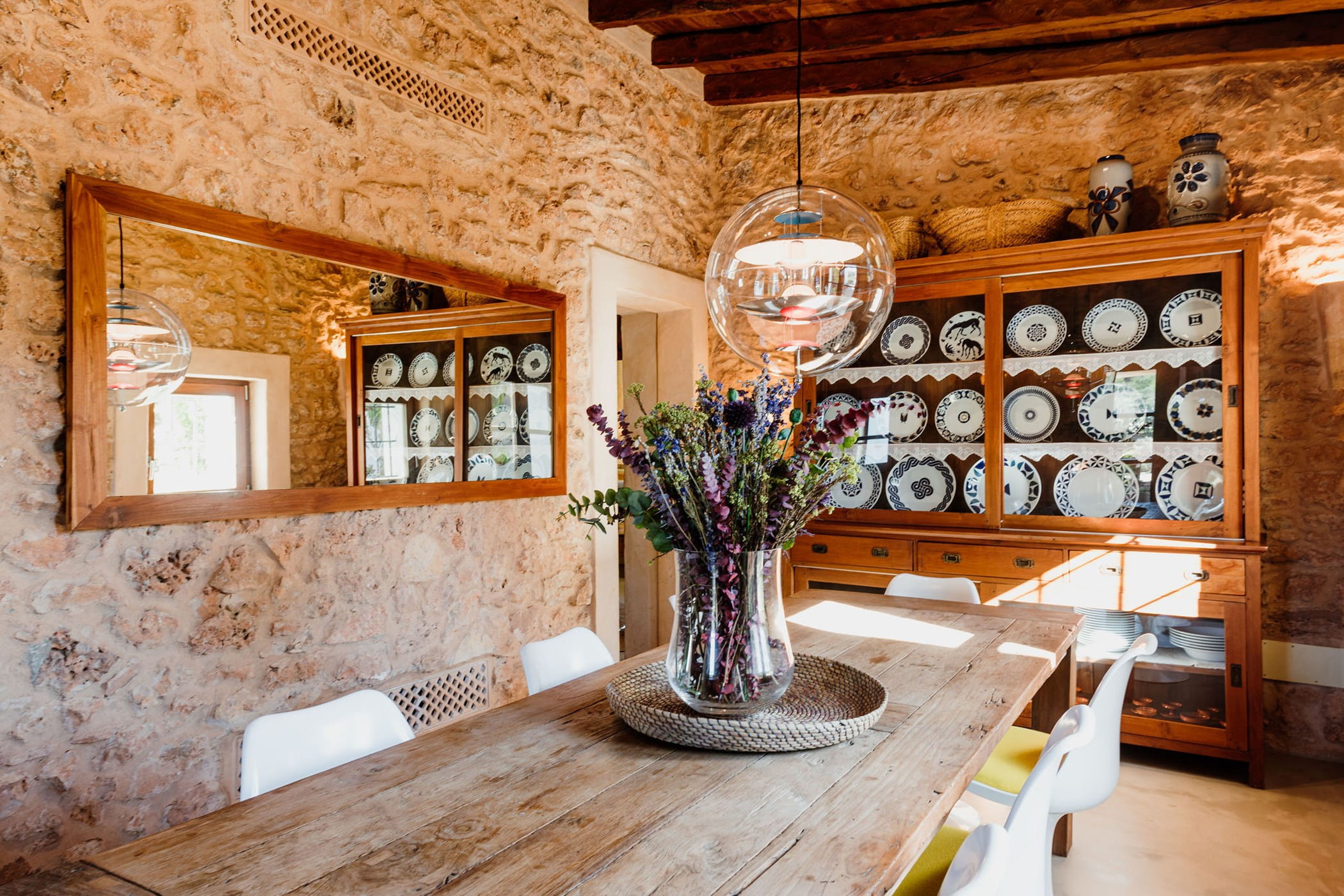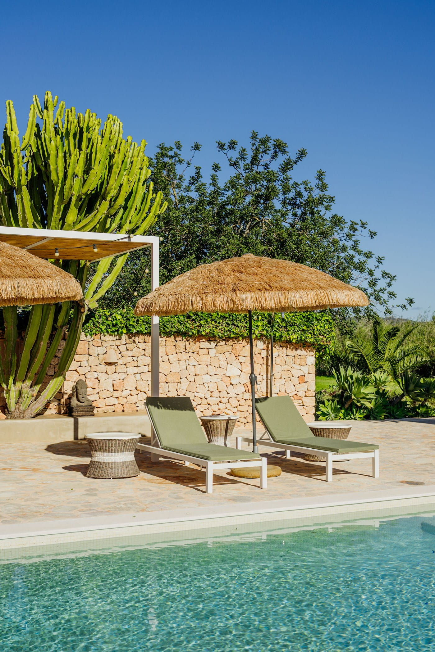 Outdoors: 13x5m saltwater pool surrounded by terraces, shaded seating, chill-out spots, and an outdoor dining area for 12. Informal garden seating throughout. Low-water Mediterranean landscaping integrates naturally with the countryside.