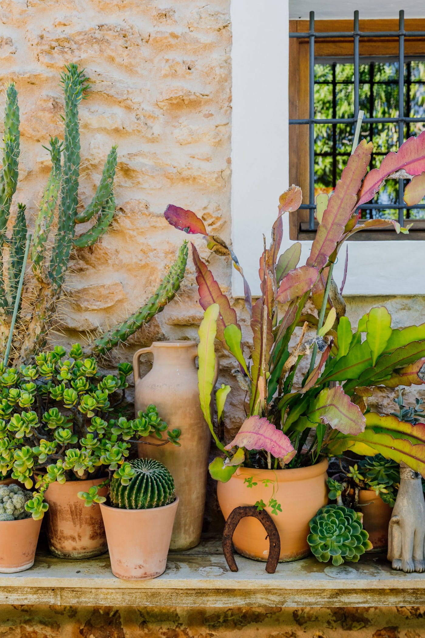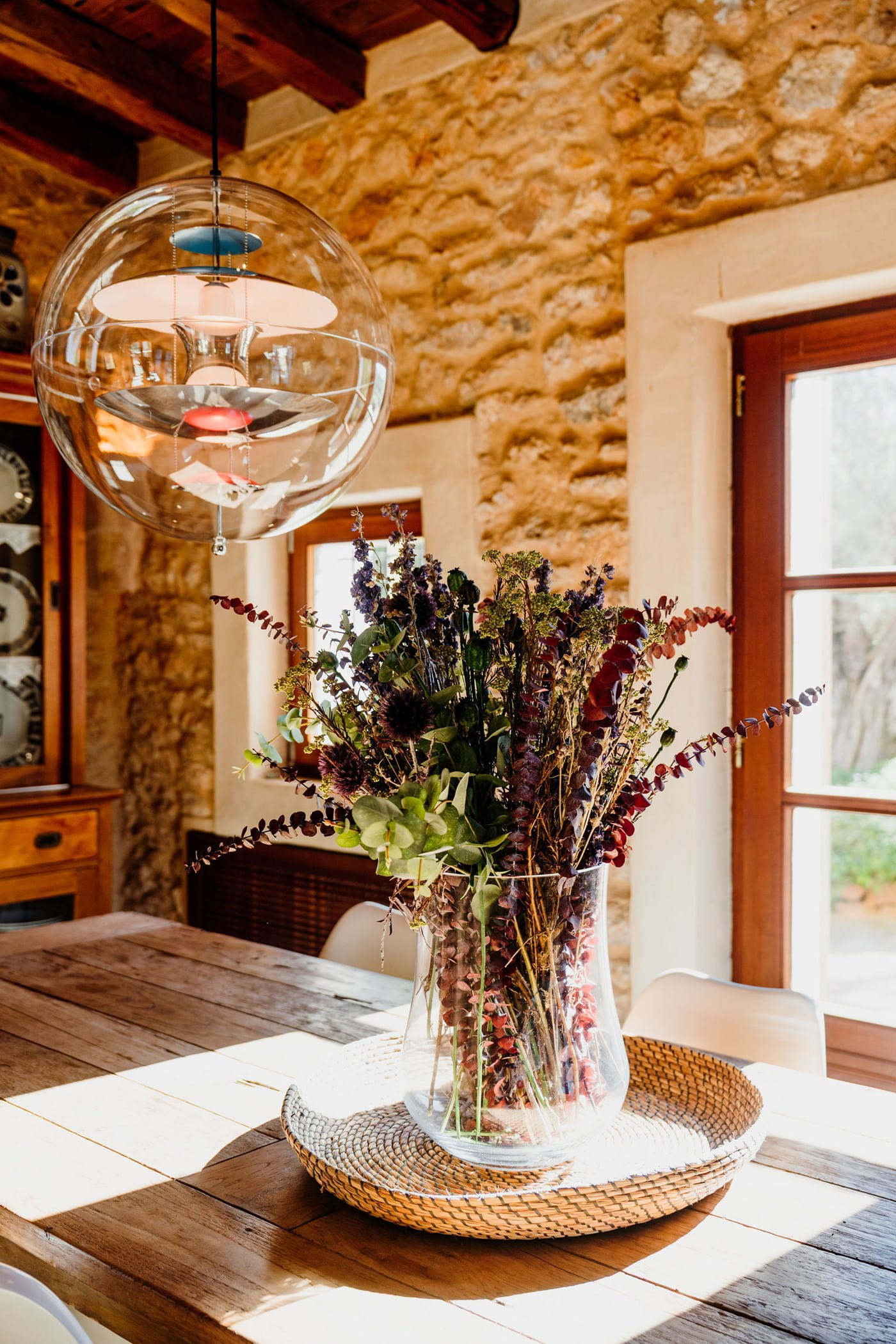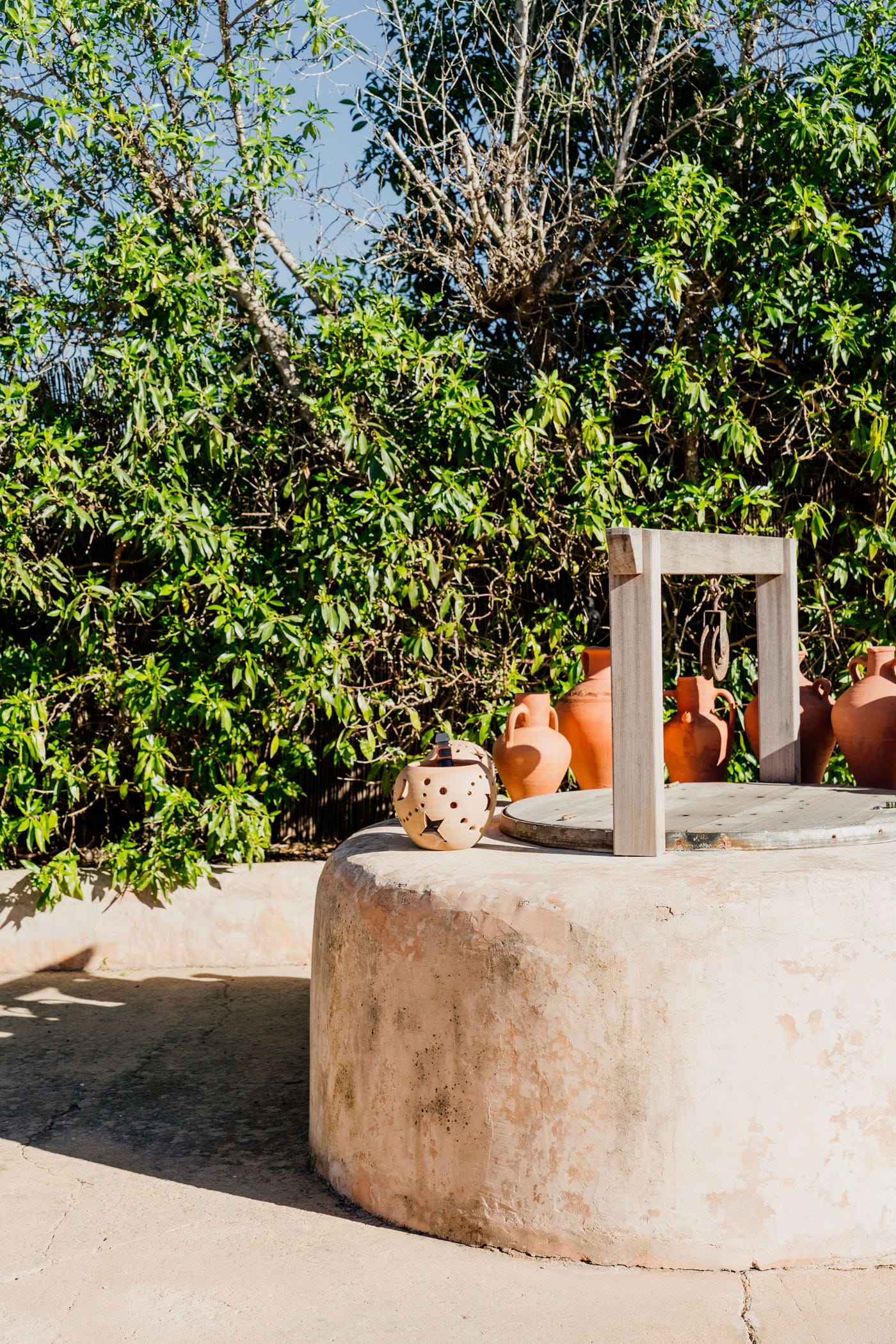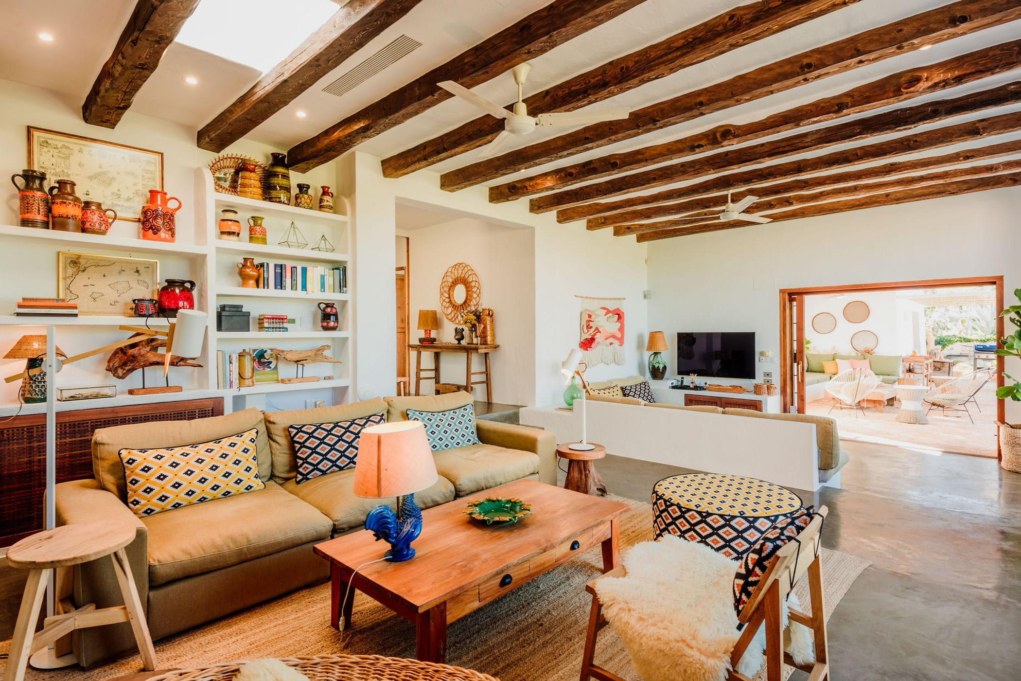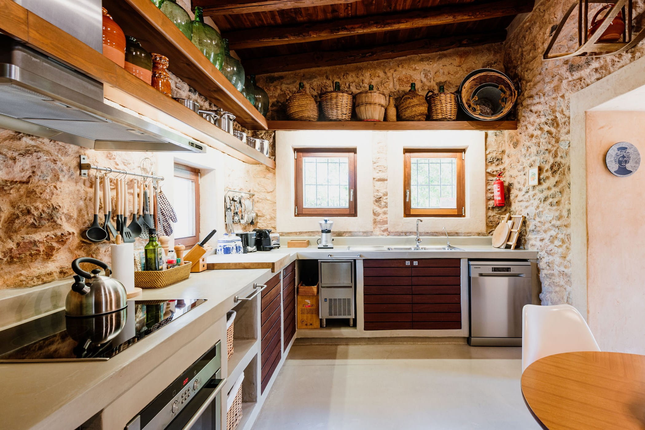 Outdoors: 13x5m saltwater pool surrounded by terraces, shaded seating, chill-out spots, and an outdoor dining area for 12. Informal garden seating throughout. Low-water Mediterranean landscaping integrates naturally with the countryside.