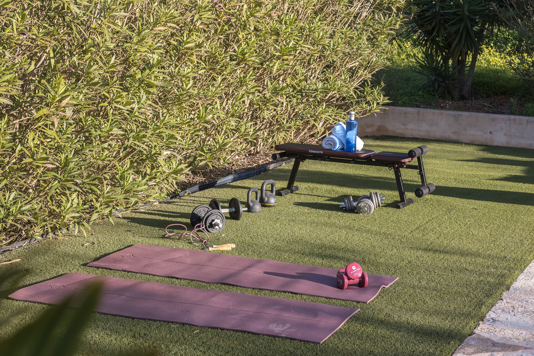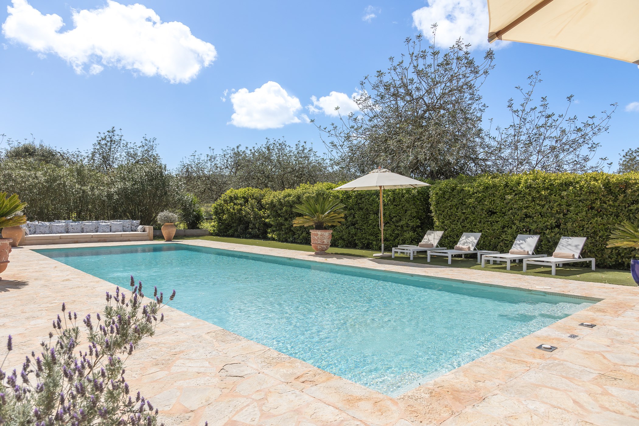 Outside: large swimming pool, shaded alfresco dining areas, multiple lounge spots, and a sprawling natural meadow – ideal for children to play and explore.