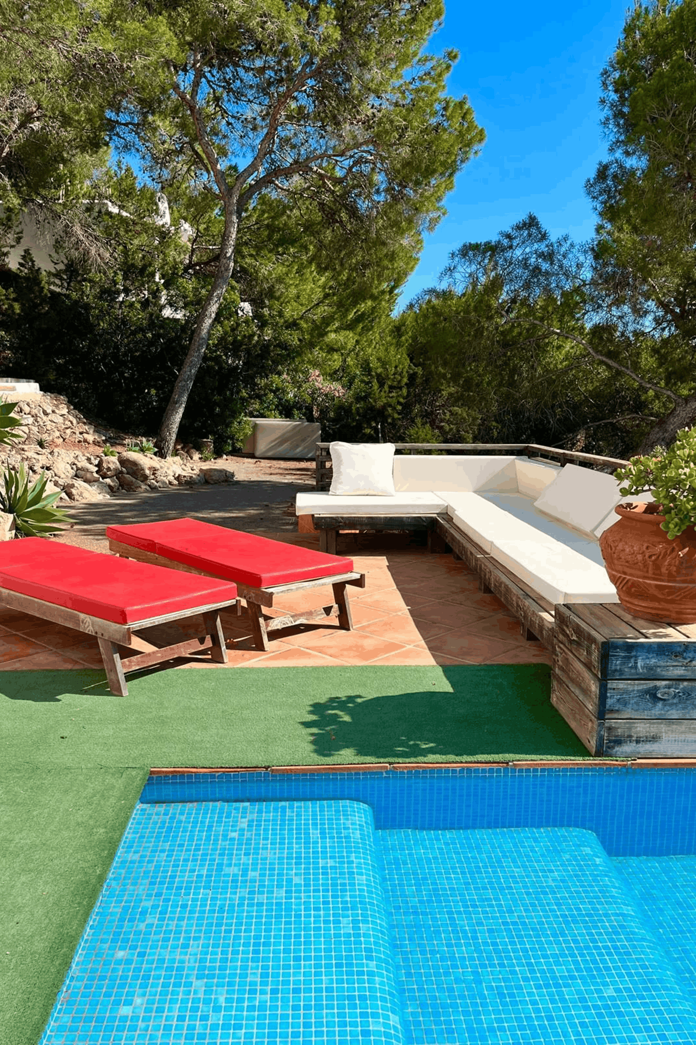 Just a short walk from stunning Cala Salada beaches, it offers a peaceful, secluded setting while remaining 5 minutes from restaurants, shops, and supermarkets, and 20 minutes from Ibiza Town and the airport.