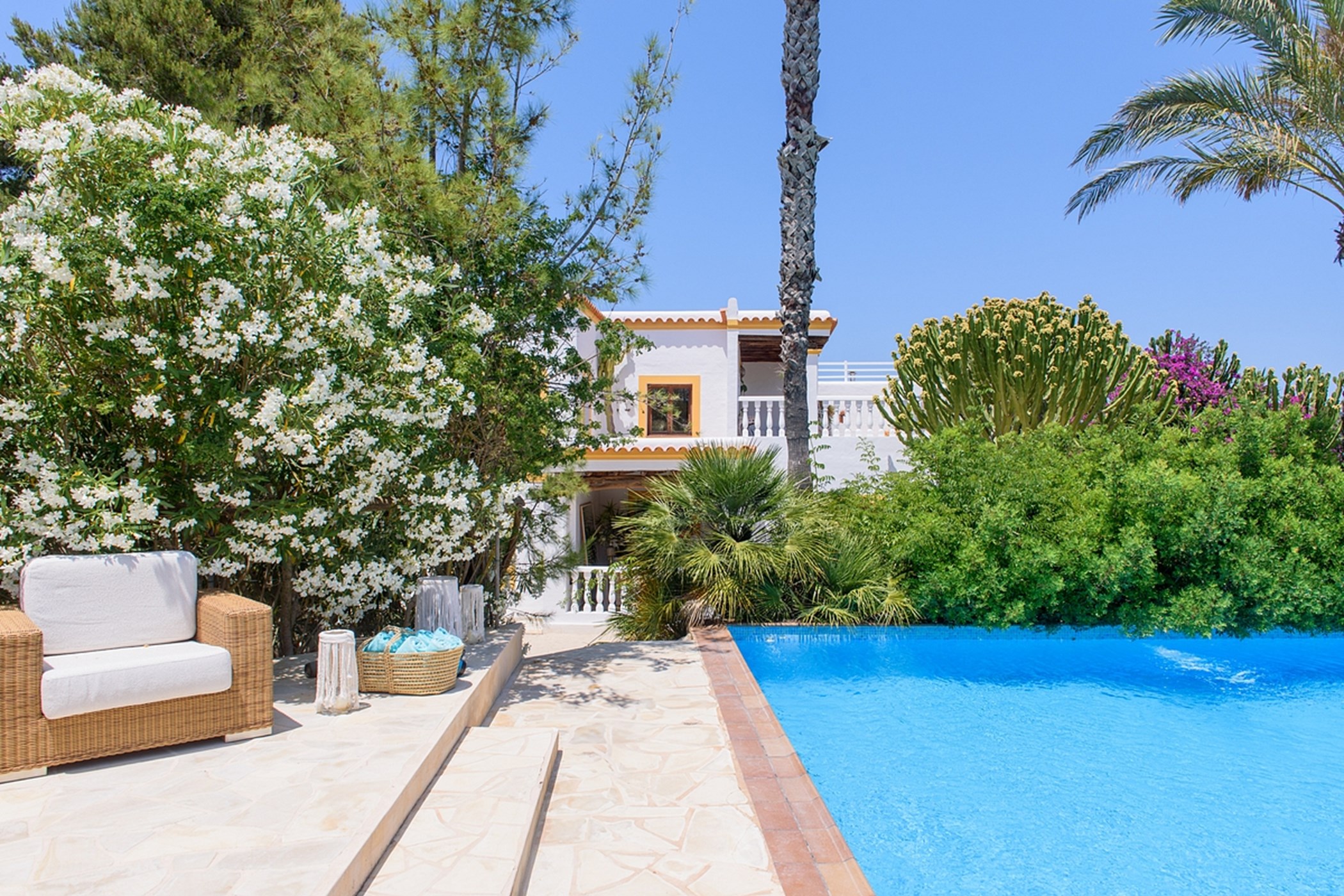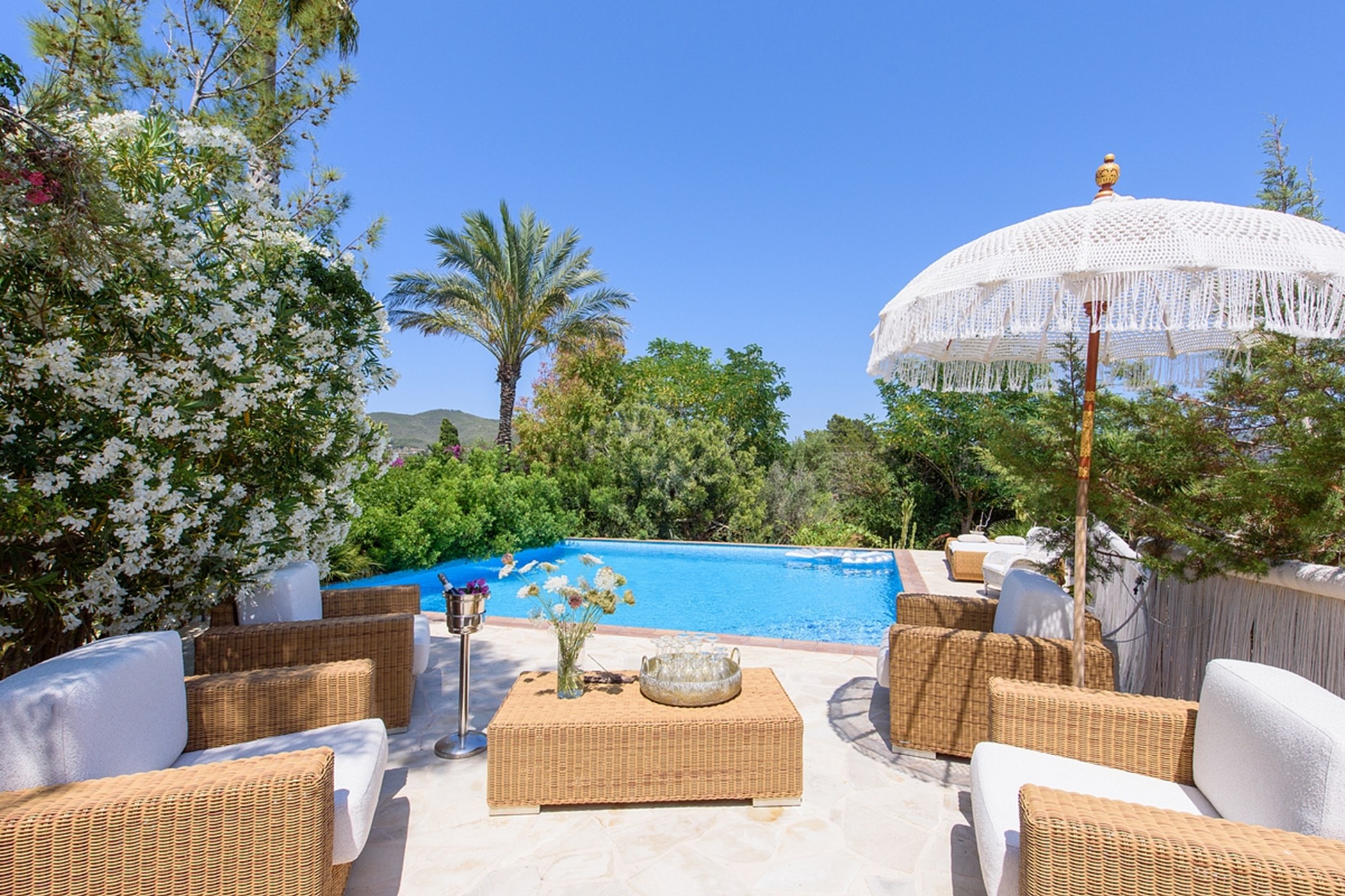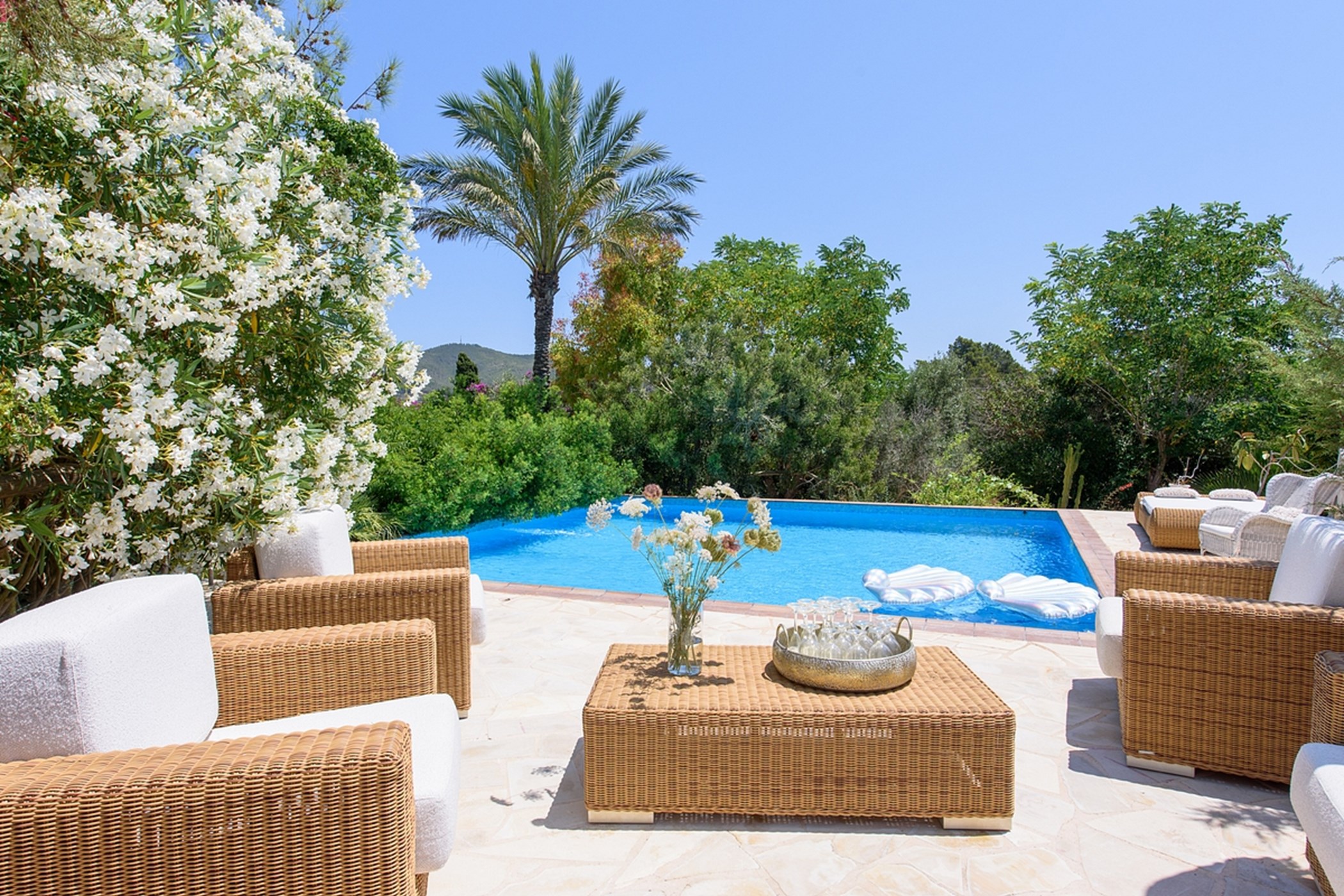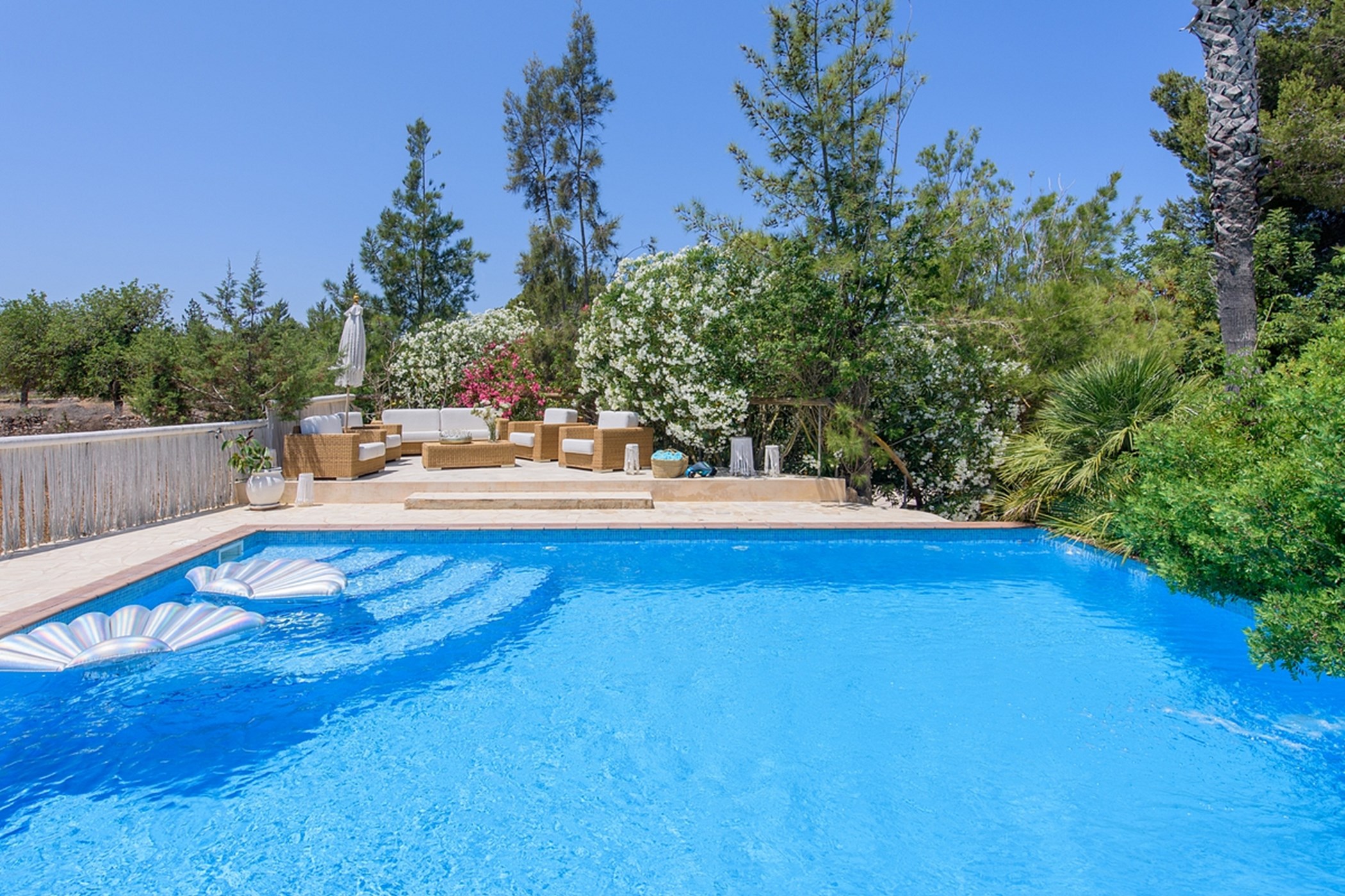 The private pool, surrounded by greenery, is perfect for swimming or lounging. Whether enjoying outdoor breakfast, relaxing poolside, or watching sunsets, the villa delivers a calm, authentic, and comfortable Ibiza experience.