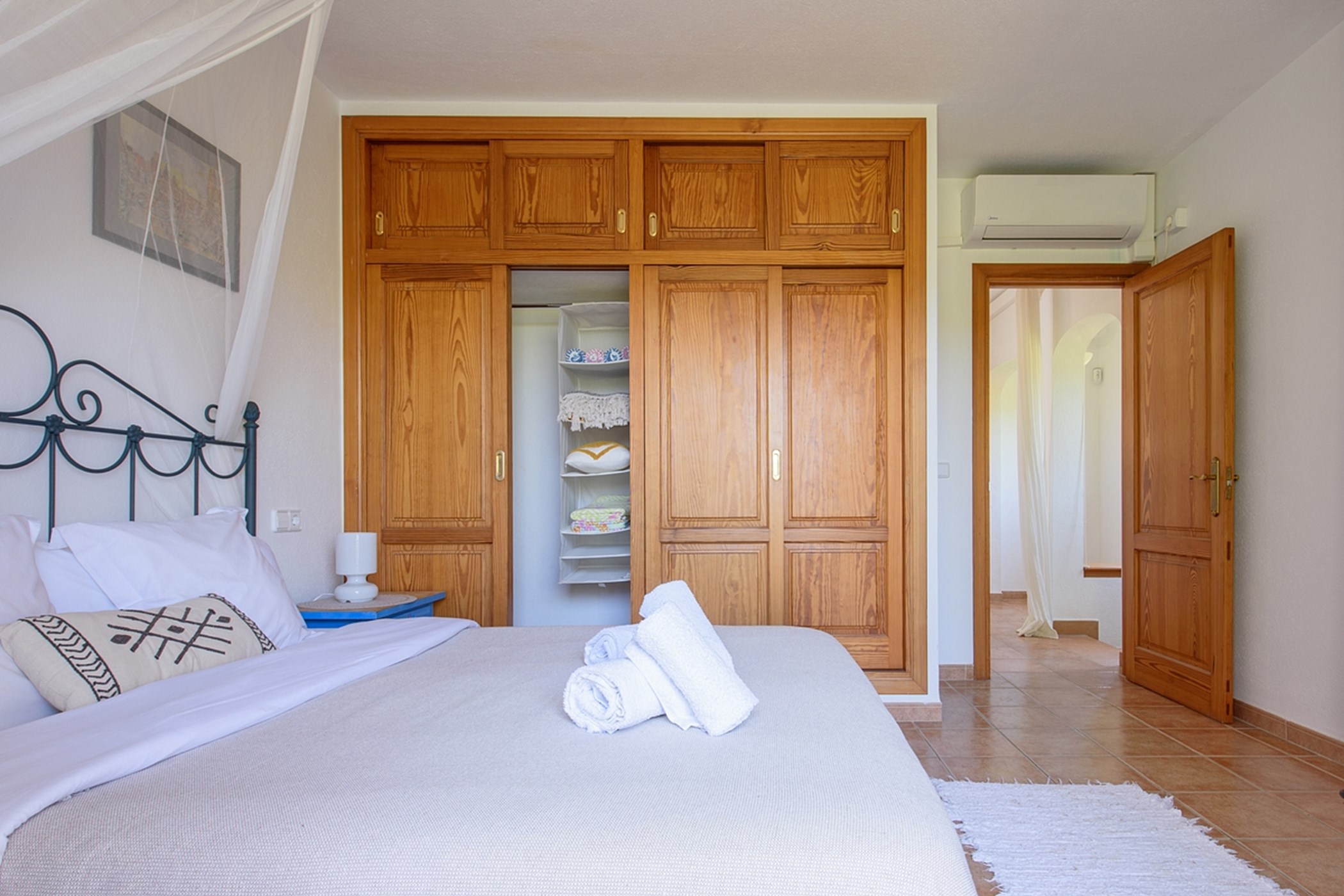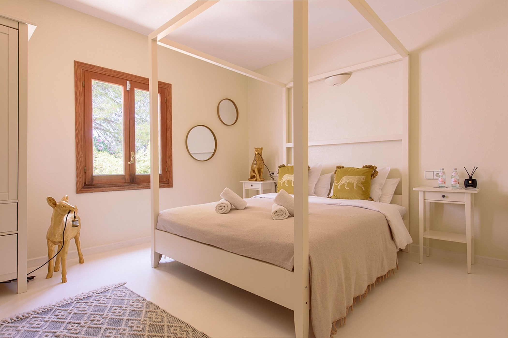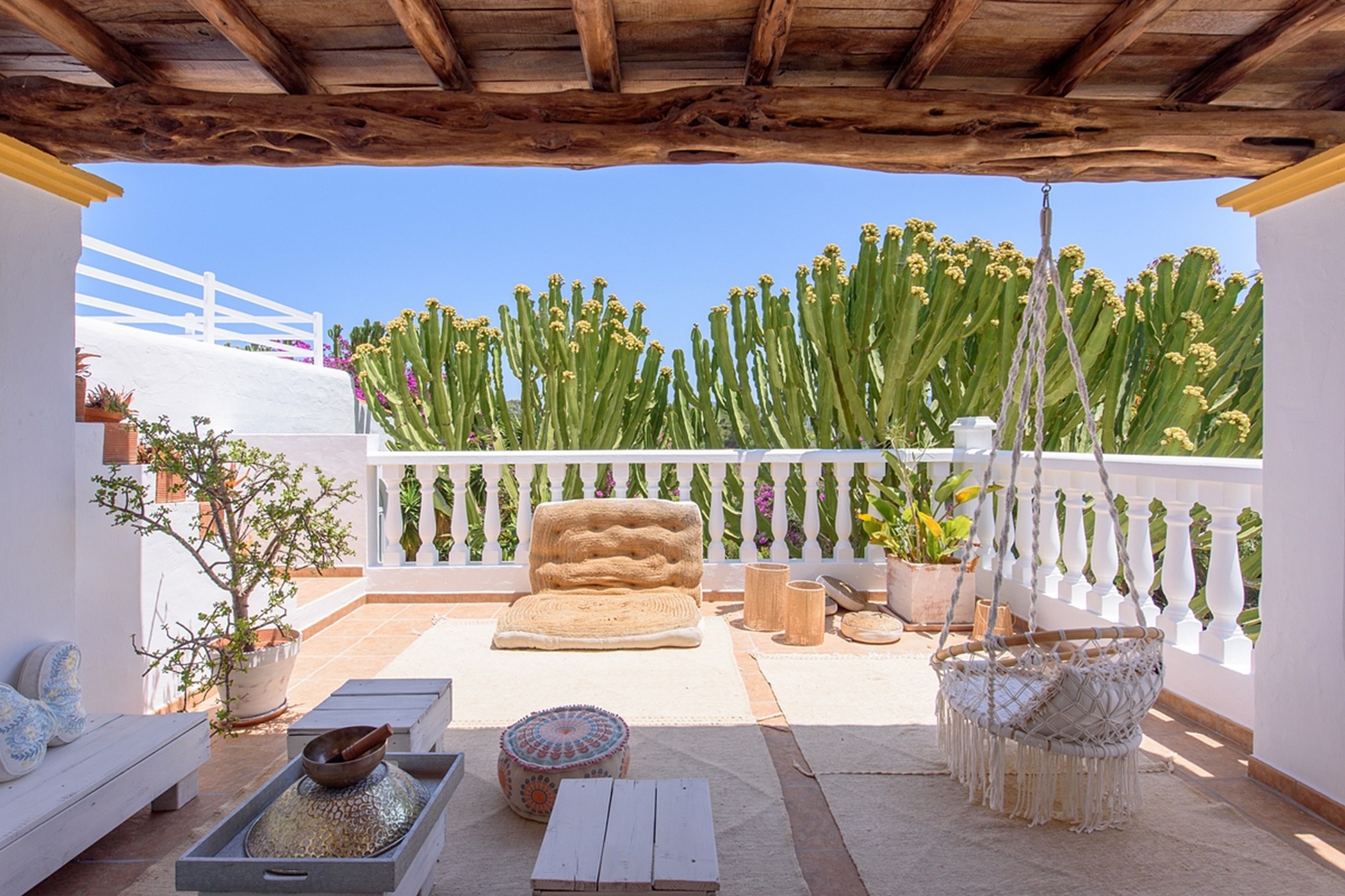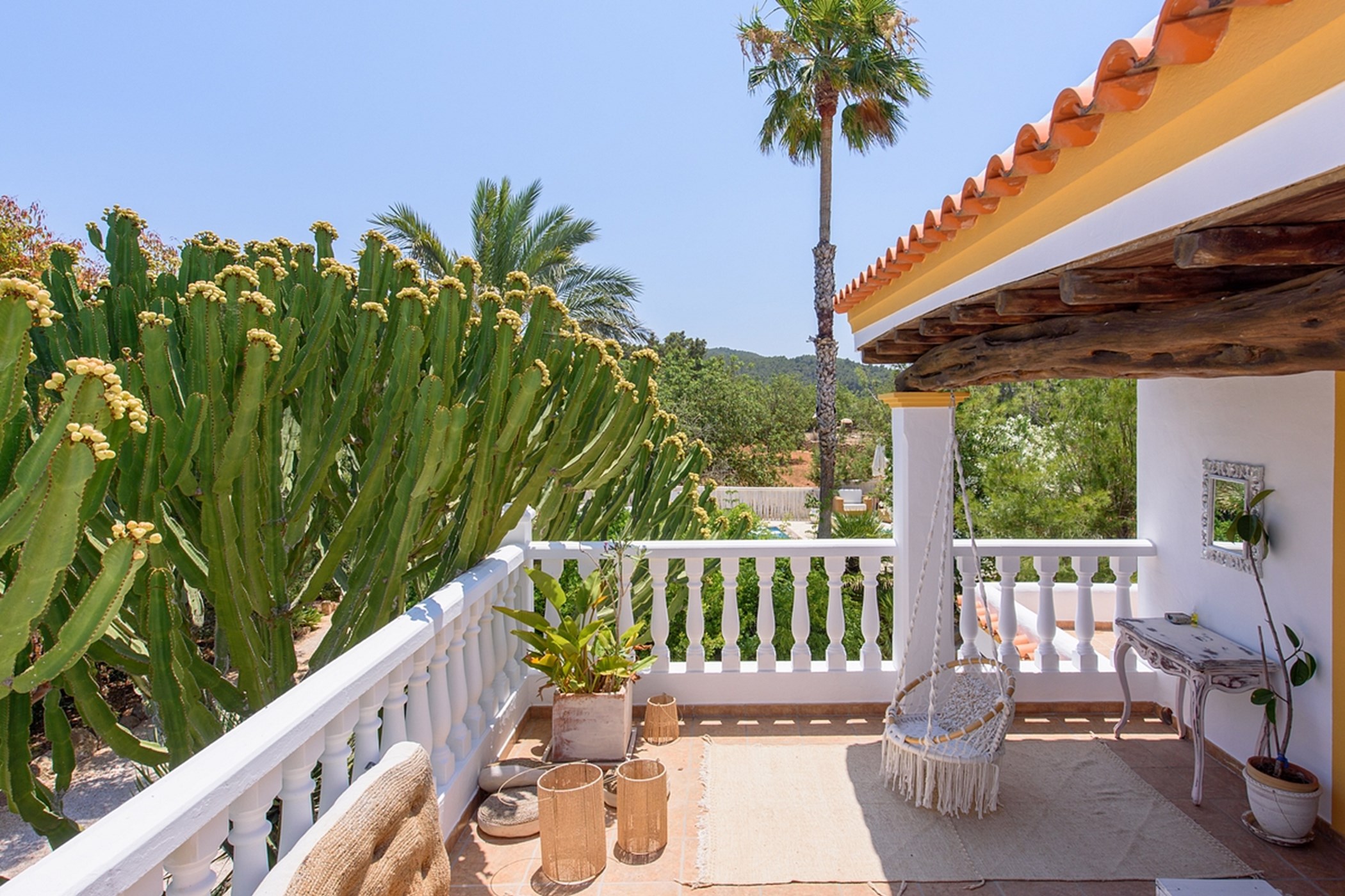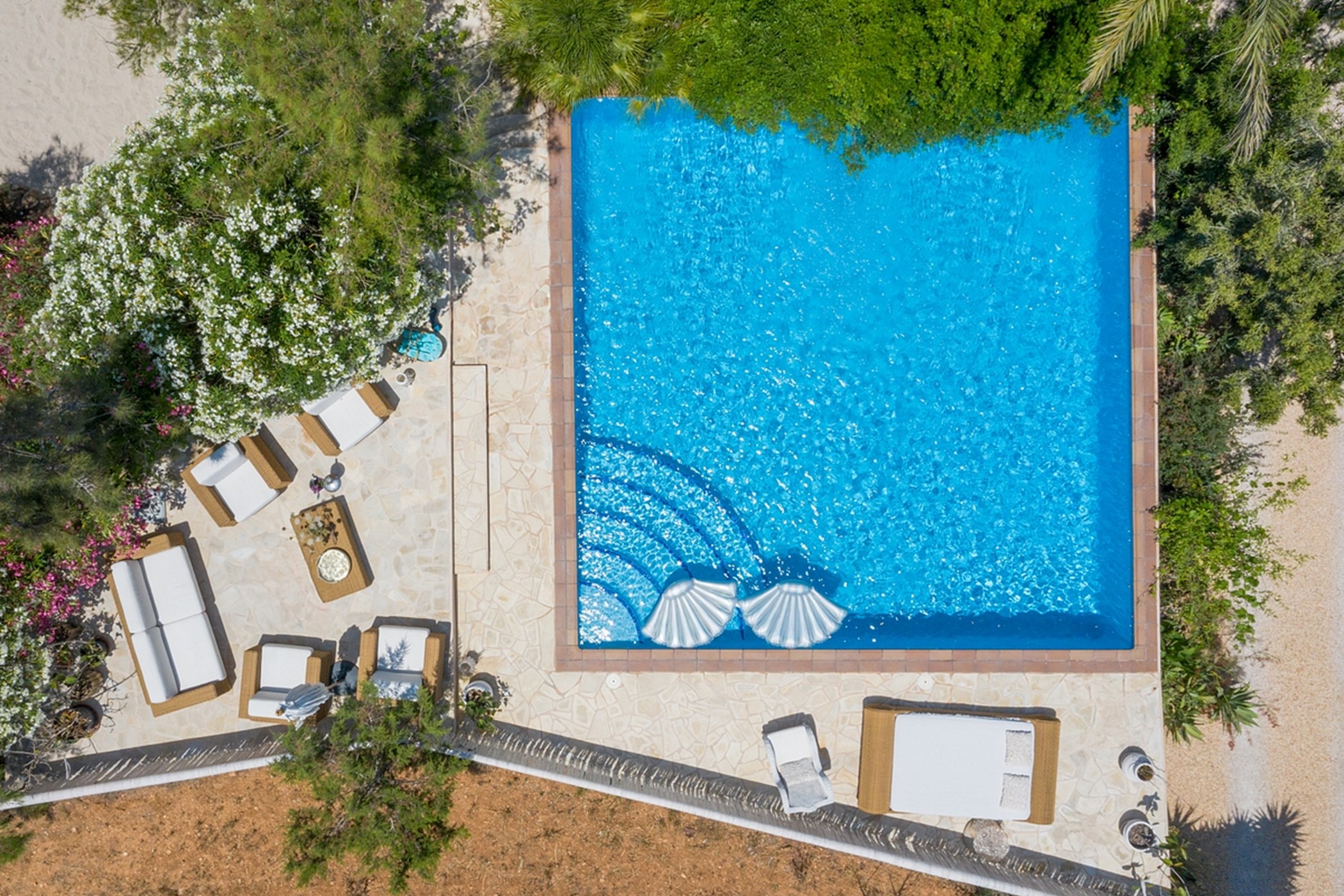 The private pool, surrounded by greenery, is perfect for swimming or lounging. Whether enjoying outdoor breakfast, relaxing poolside, or watching sunsets, the villa delivers a calm, authentic, and comfortable Ibiza experience.