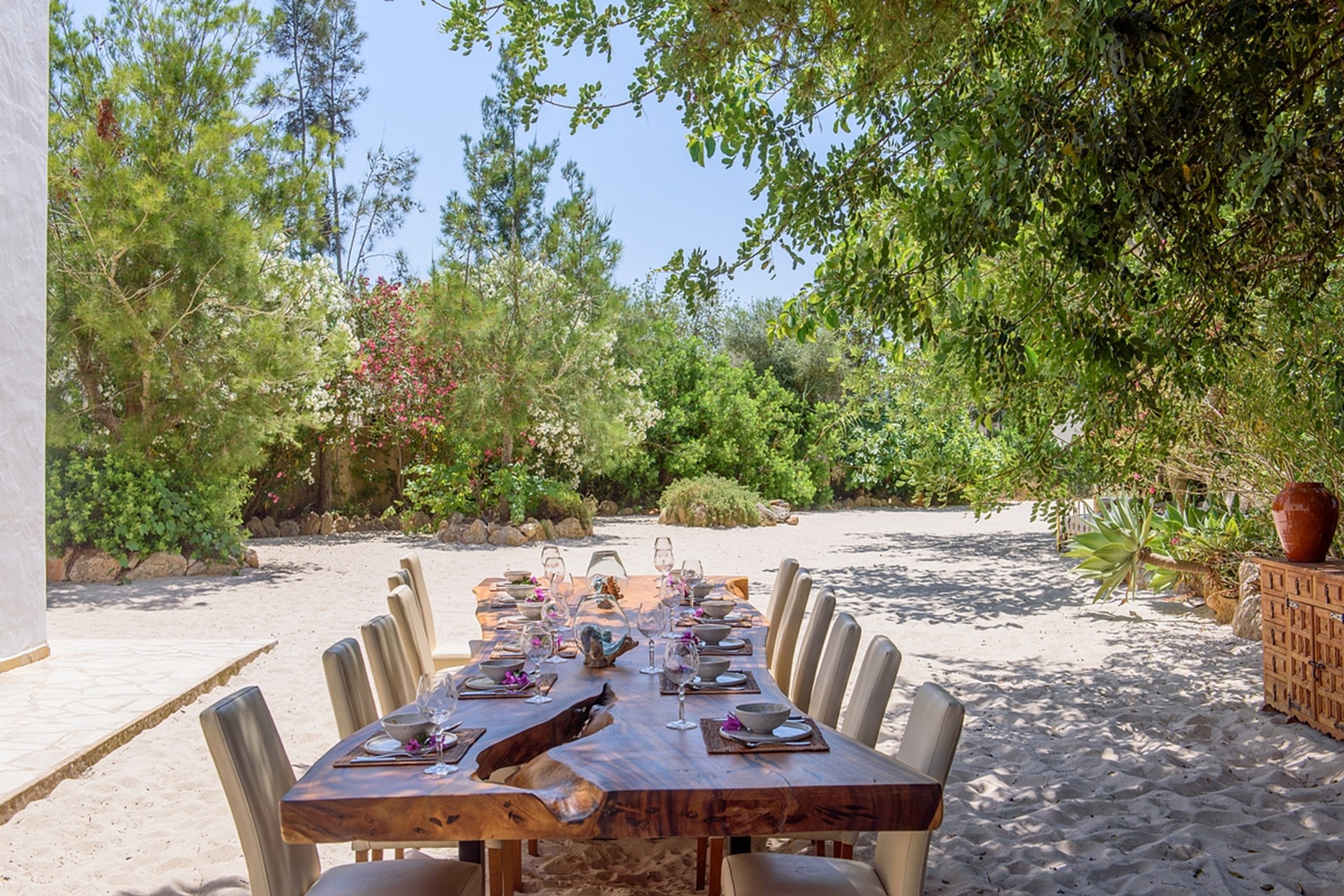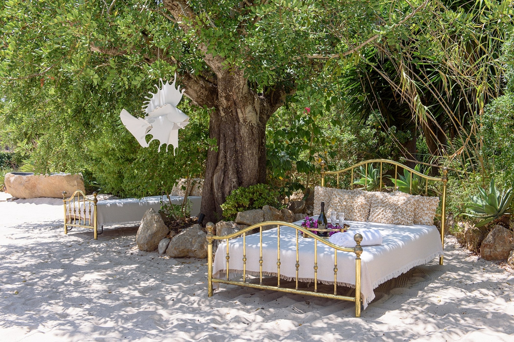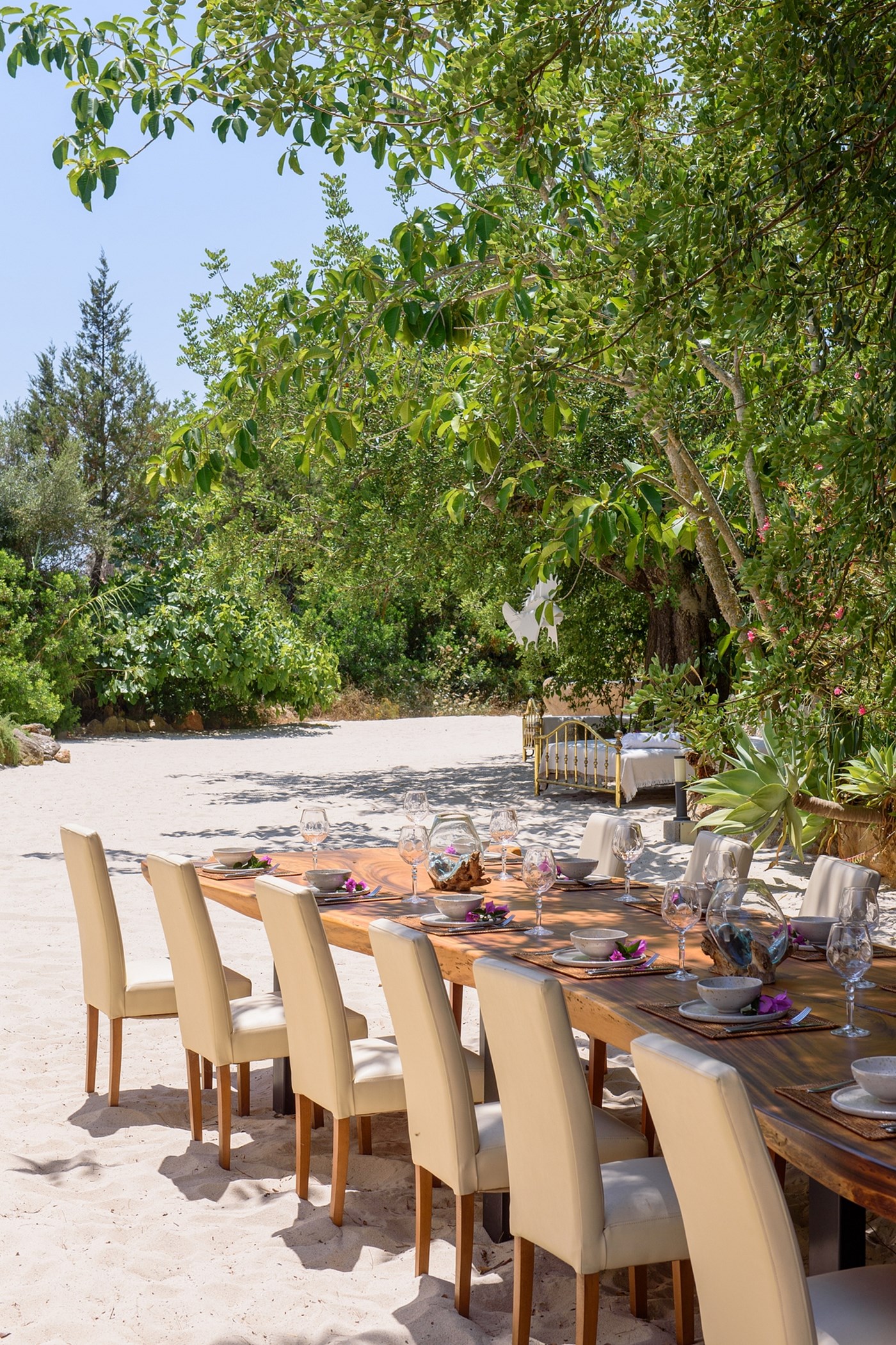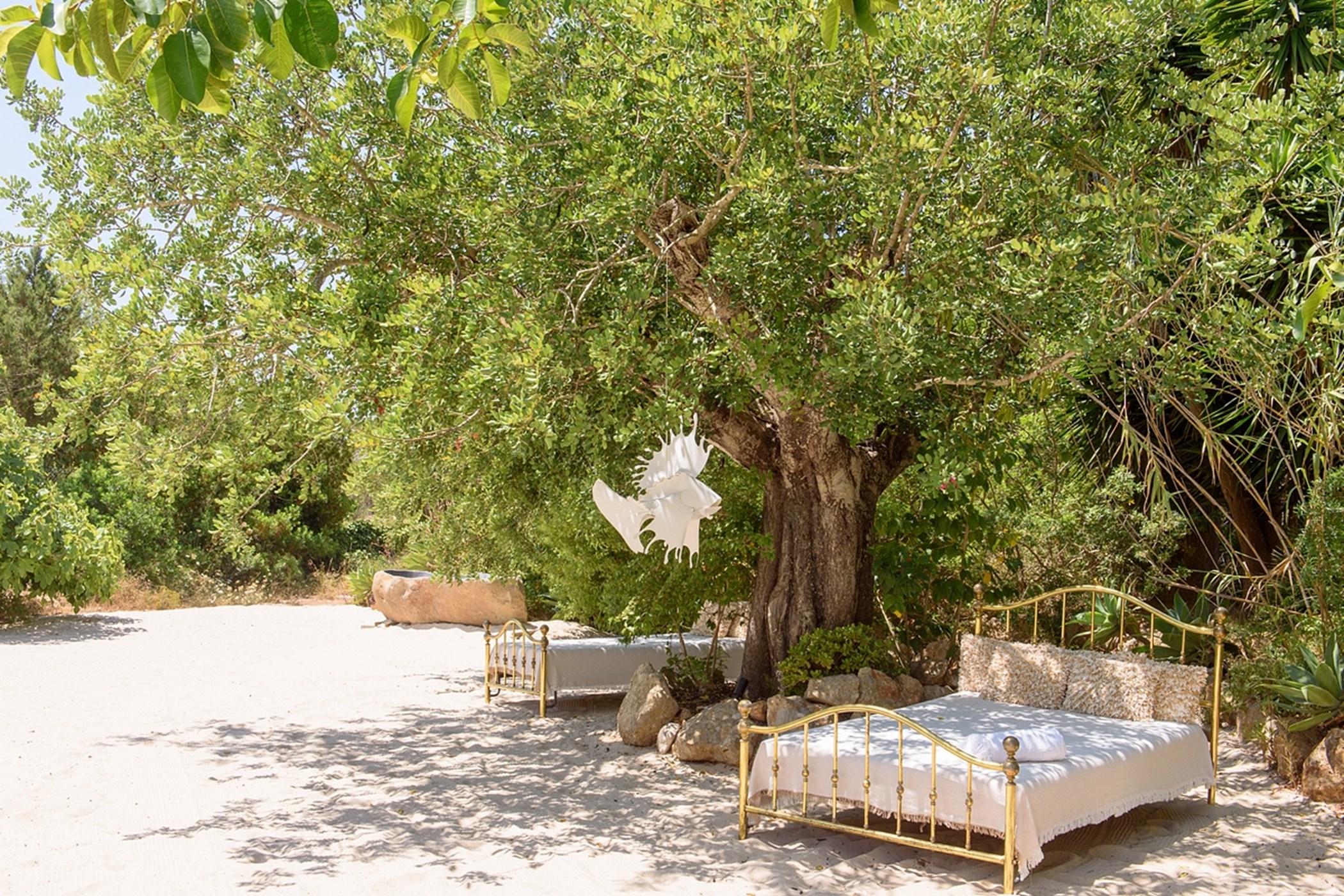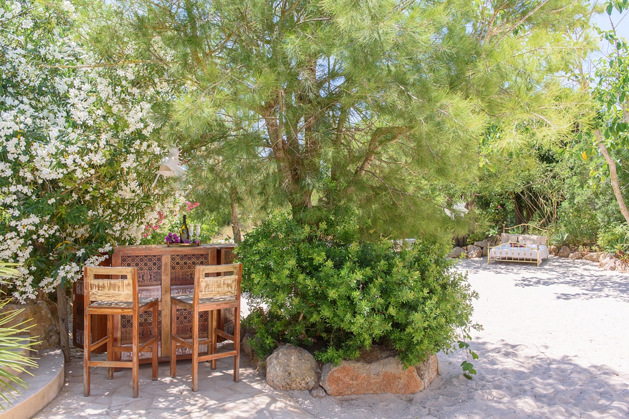 The outdoor space is a highlight: a sandy area resembling a small private beach, lush green gardens, and sunny spots to enjoy the island weather from morning to evening.