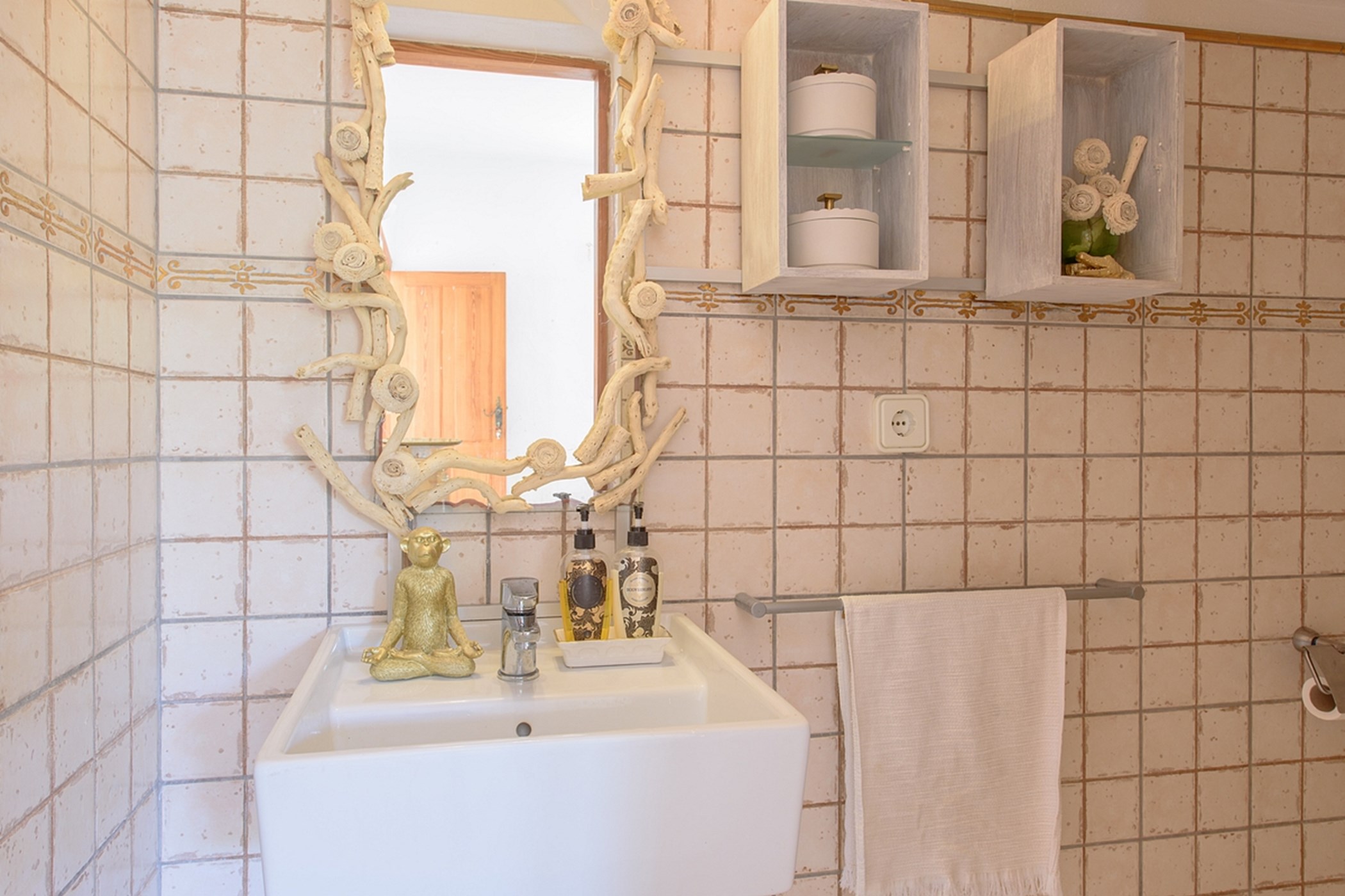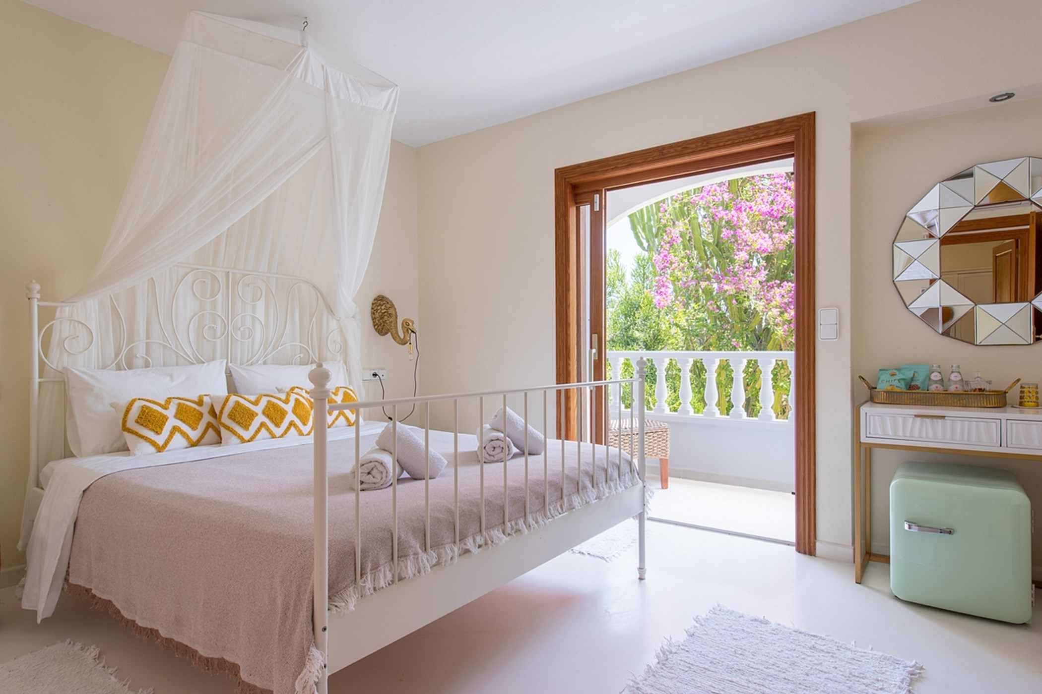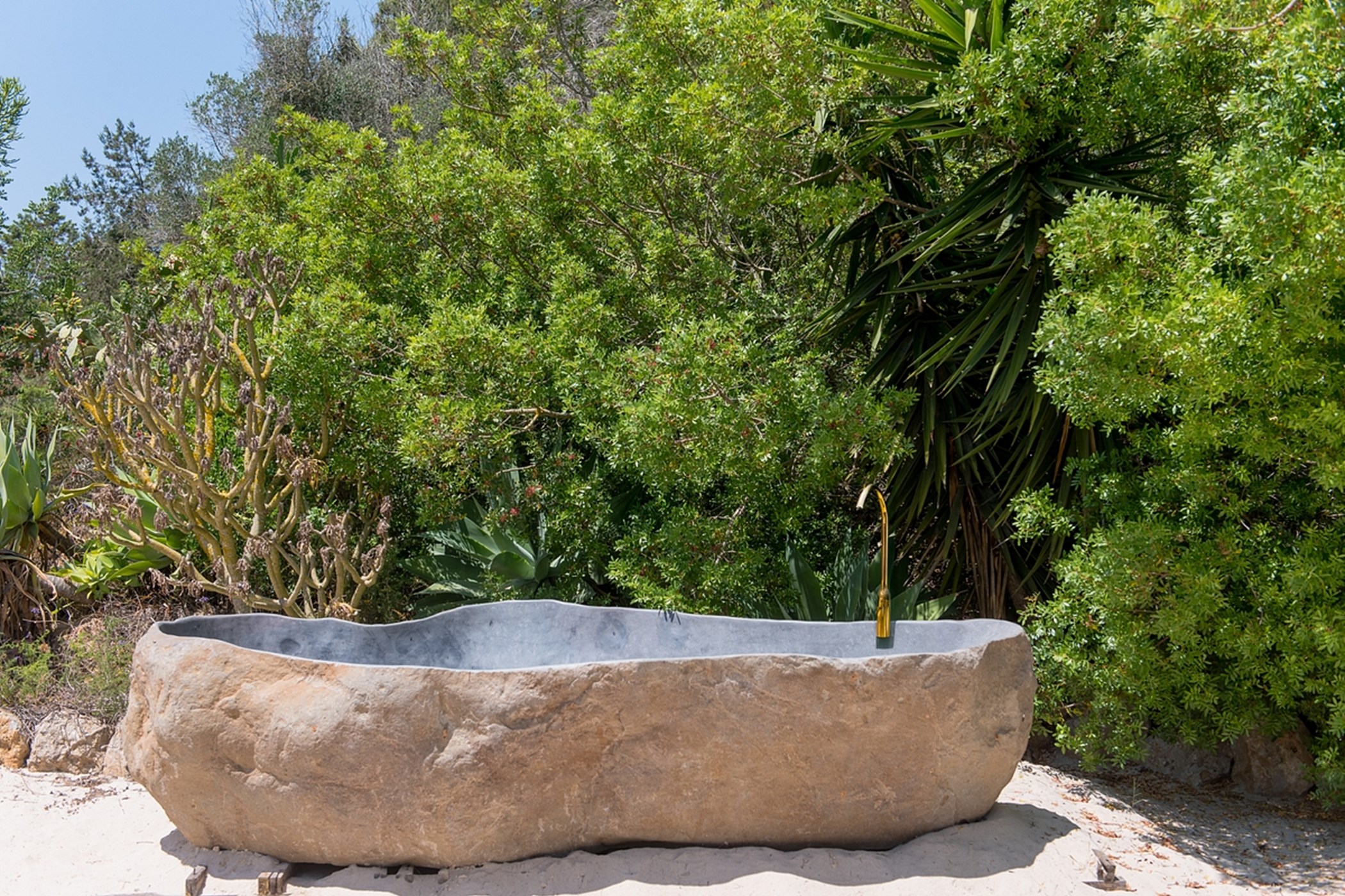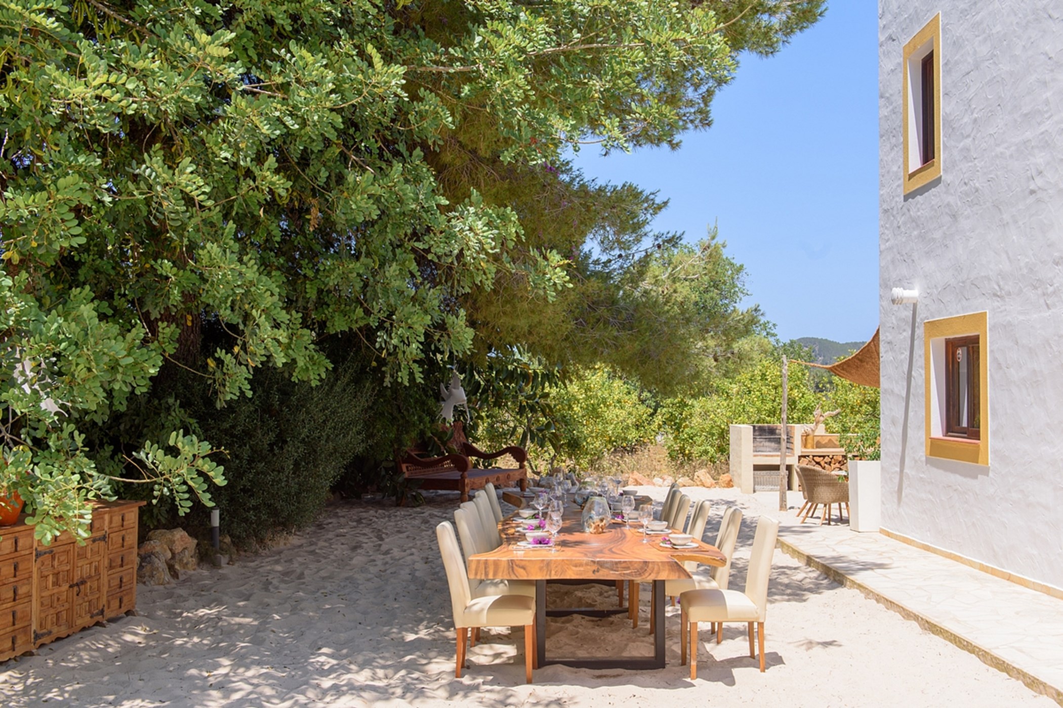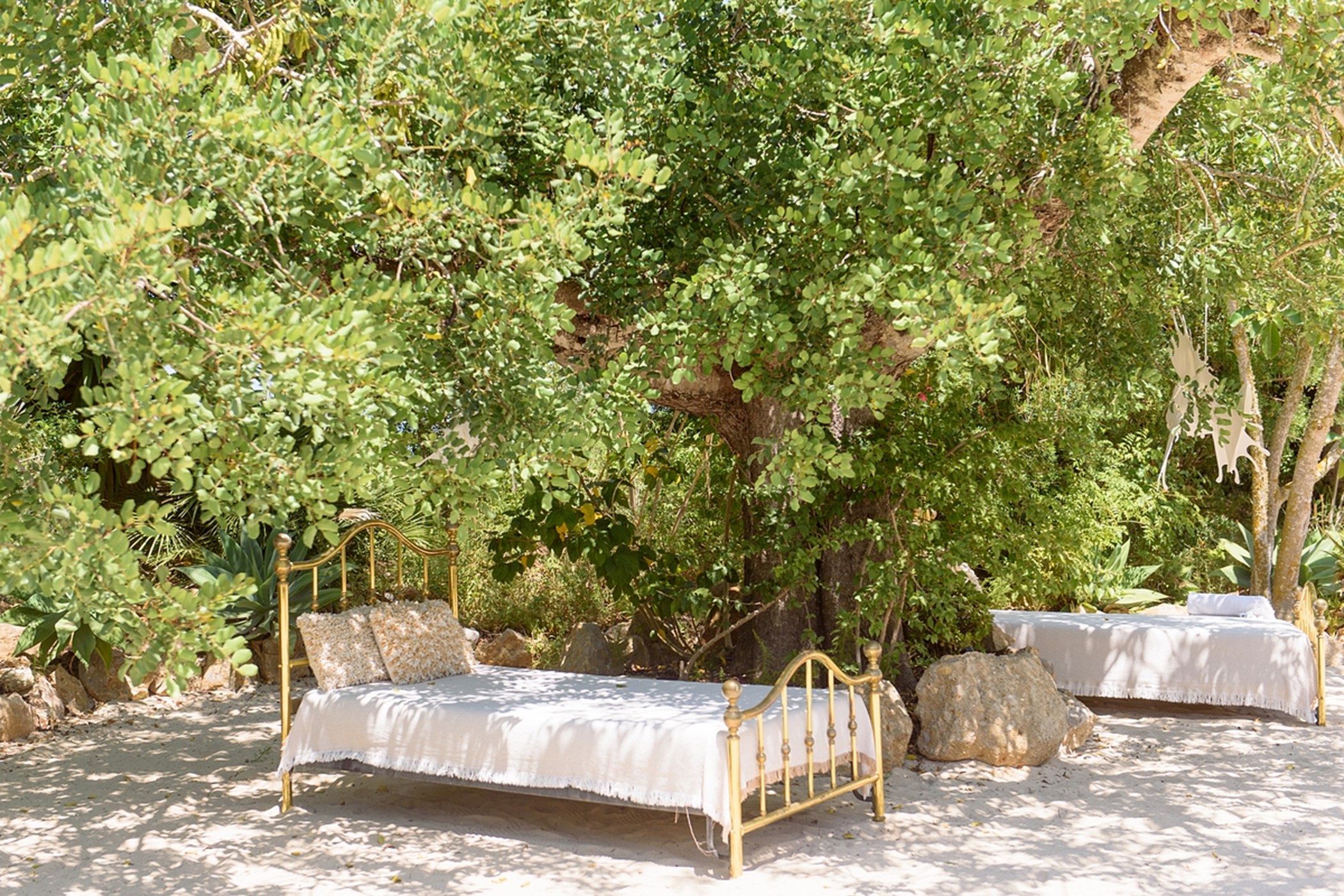 The outdoor space is a highlight: a sandy area resembling a small private beach, lush green gardens, and sunny spots to enjoy the island weather from morning to evening.
