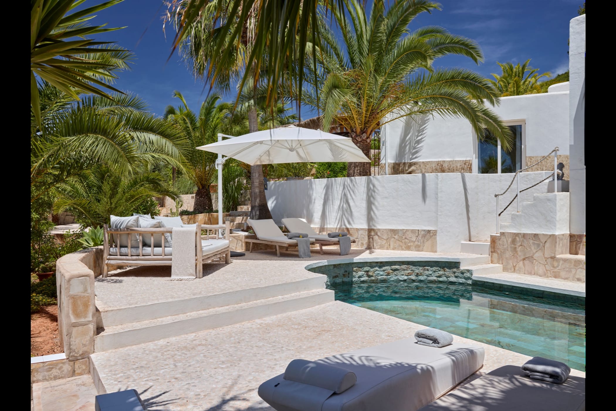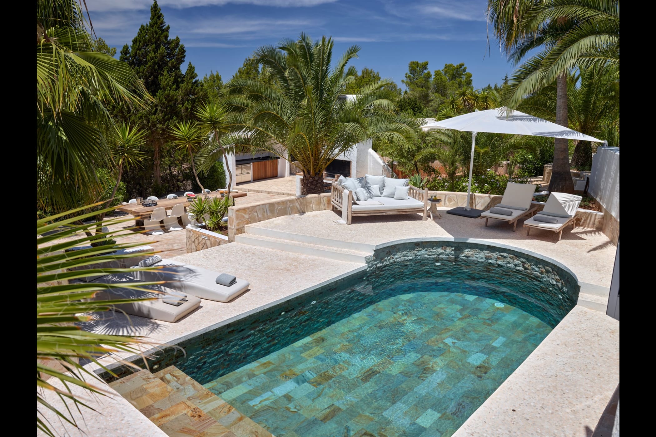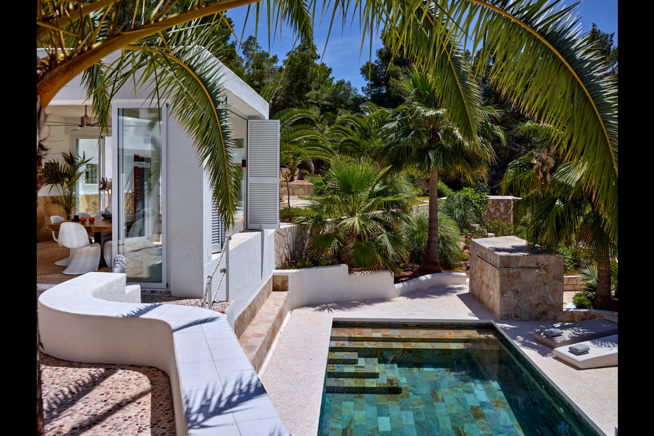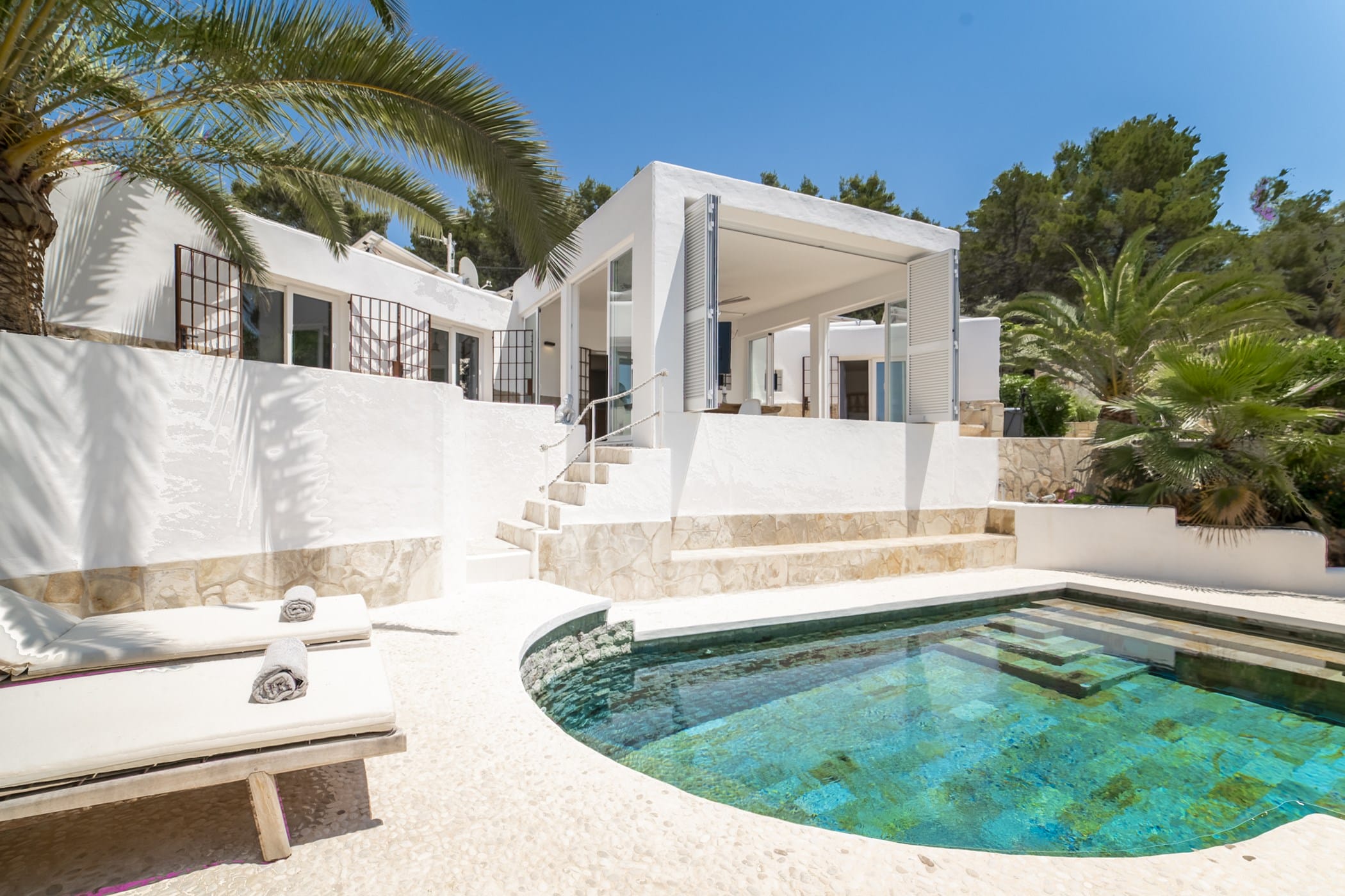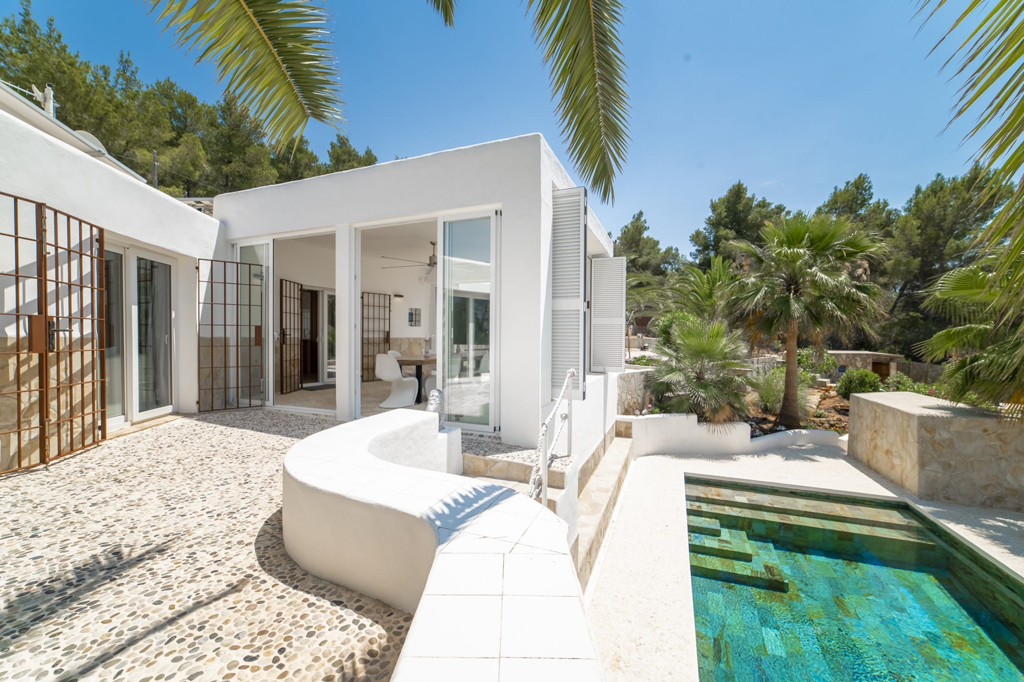 This modern finca sits on a private crescent-shaped plot in southwest Ibiza, just 3 km from Cala Tarida and its beach clubs. Fully renovated in 2021, it offers a fresh contemporary feel across three levels.