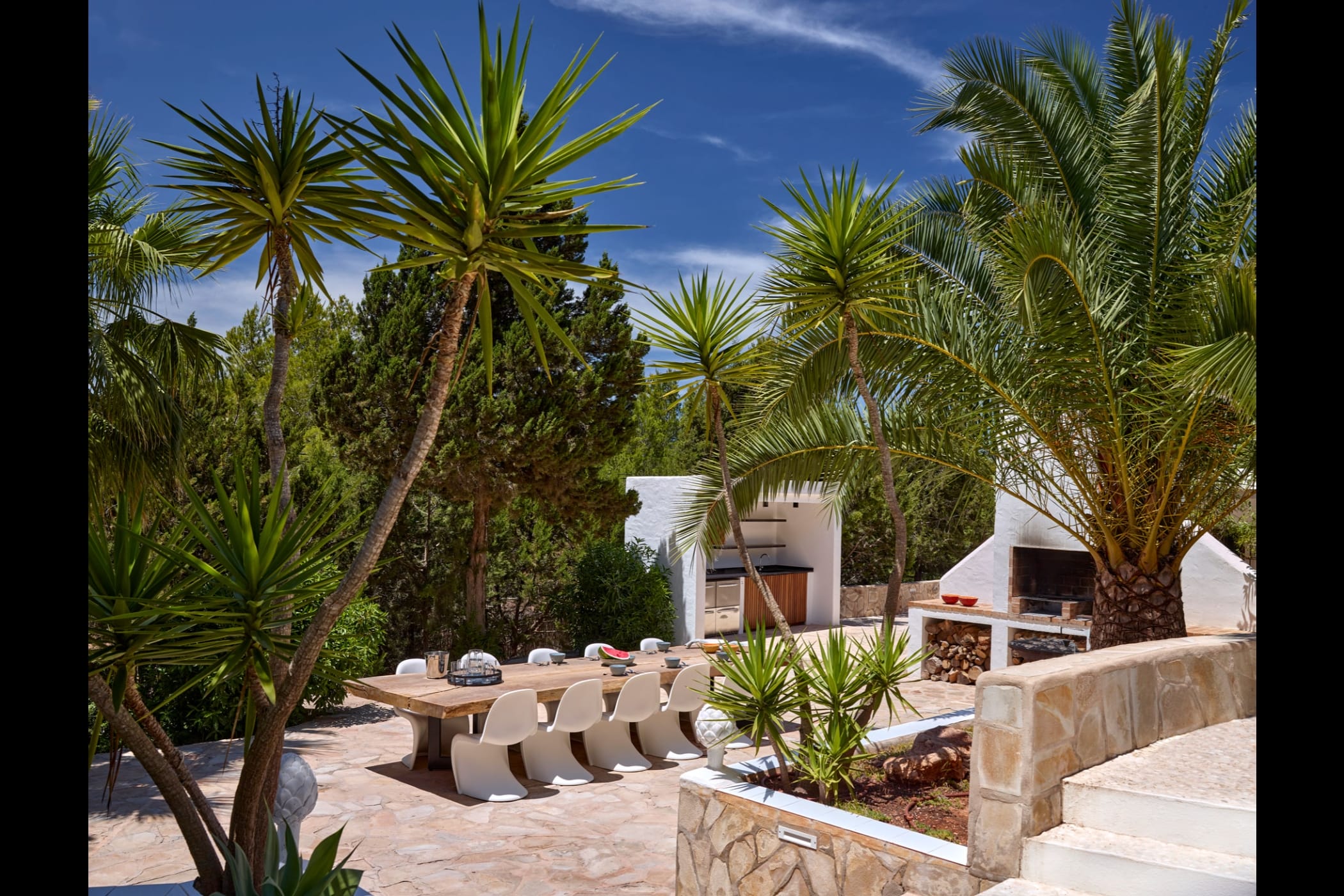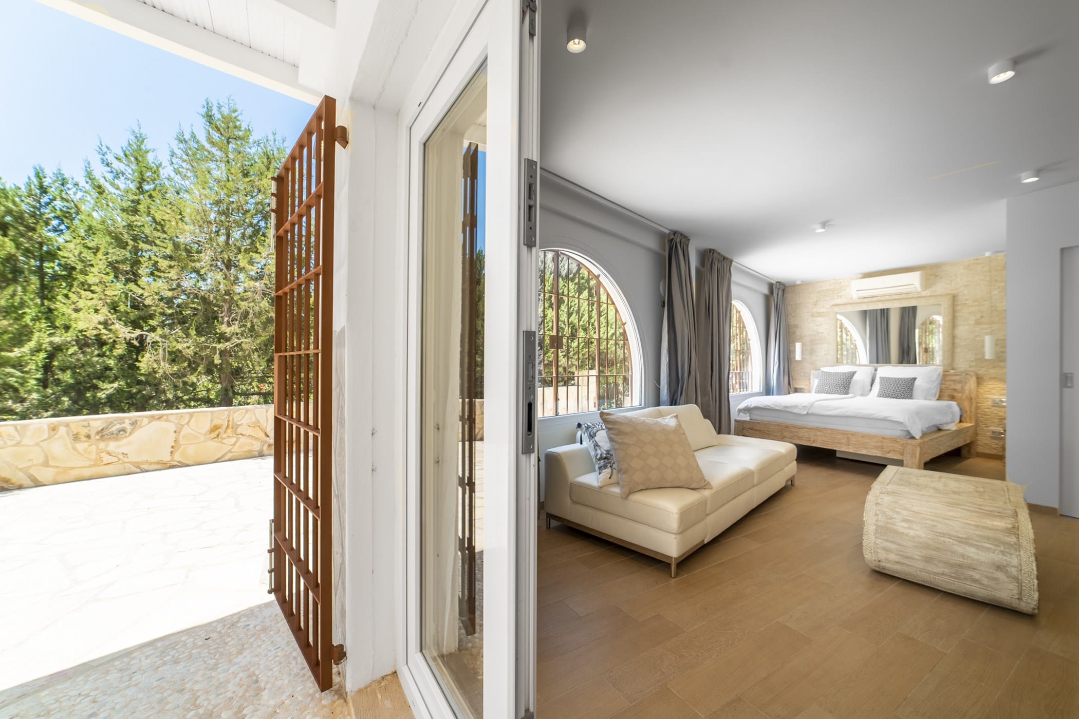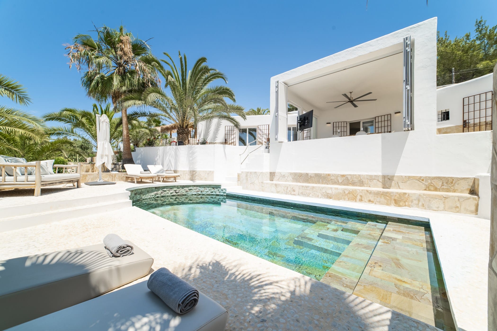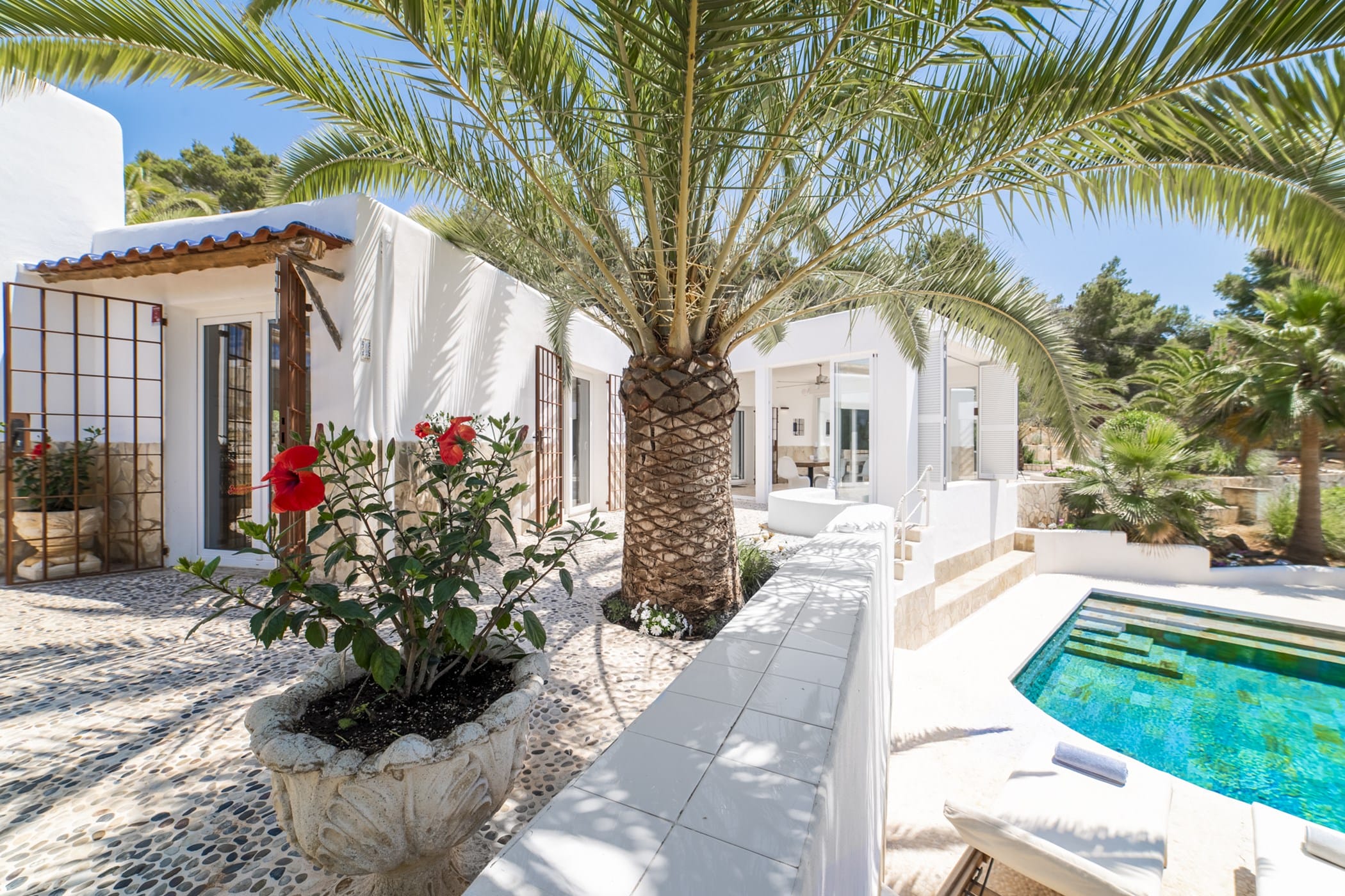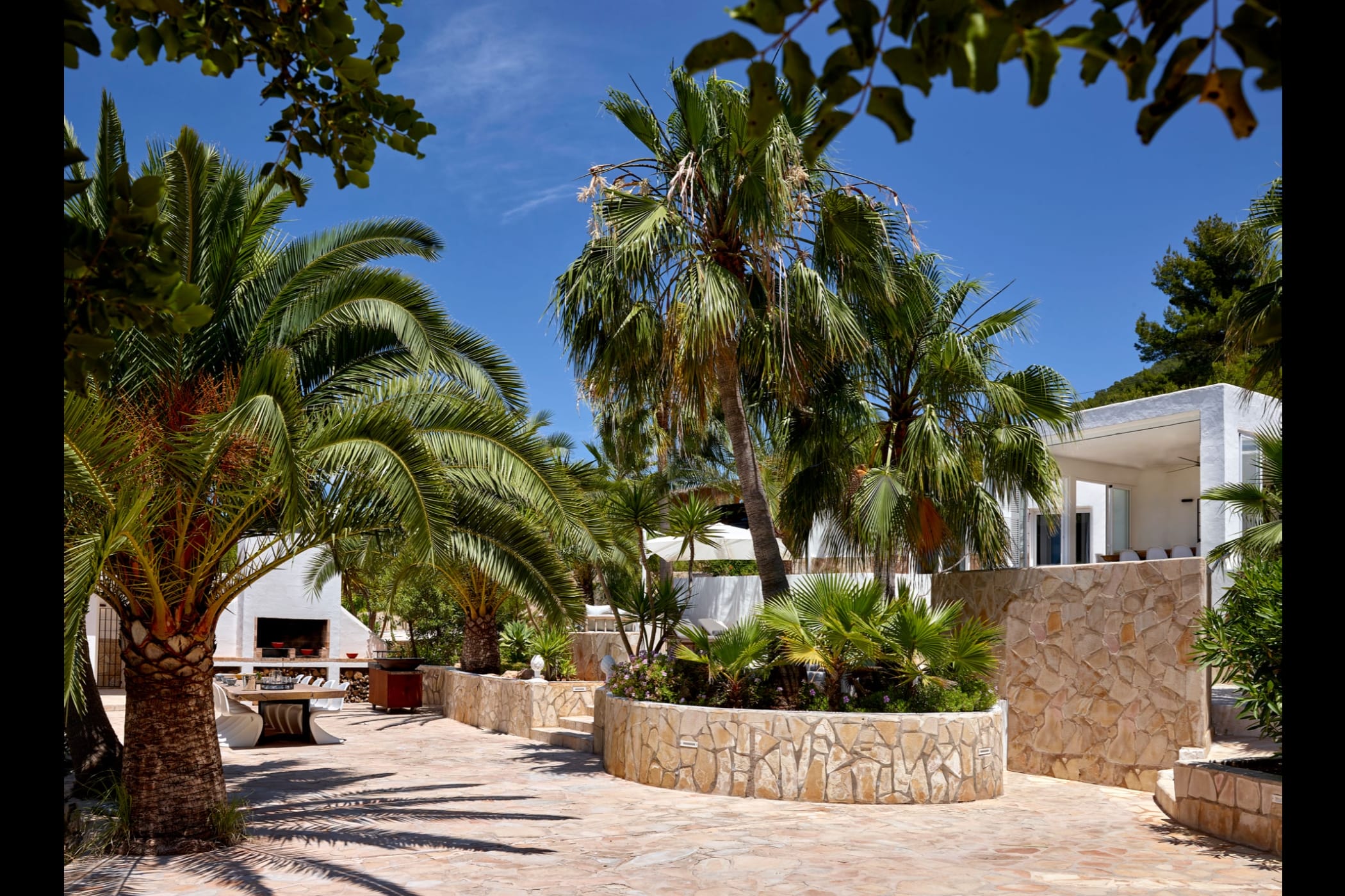 This modern finca sits on a private crescent-shaped plot in southwest Ibiza, just 3 km from Cala Tarida and its beach clubs. Fully renovated in 2021, it offers a fresh contemporary feel across three levels.