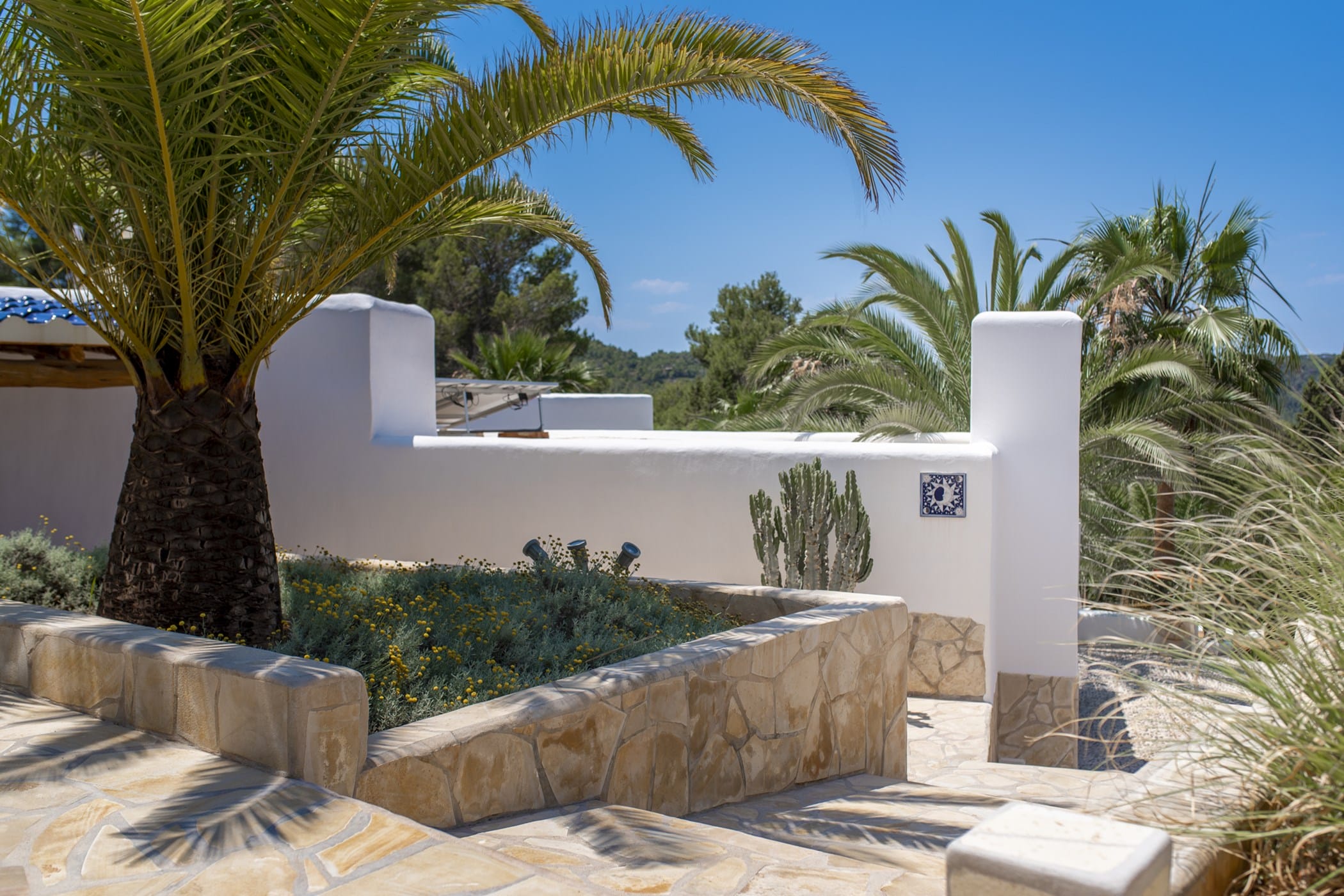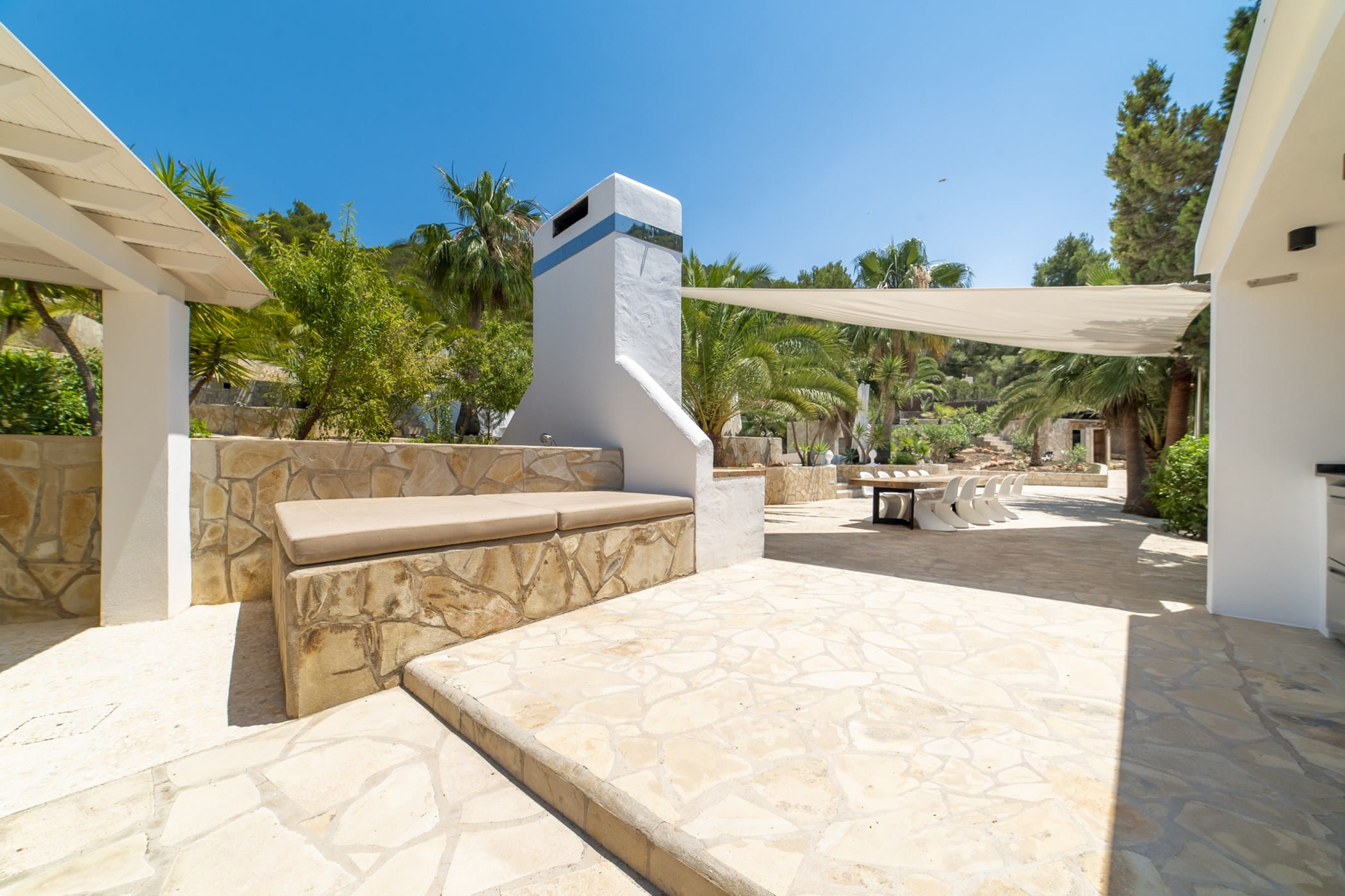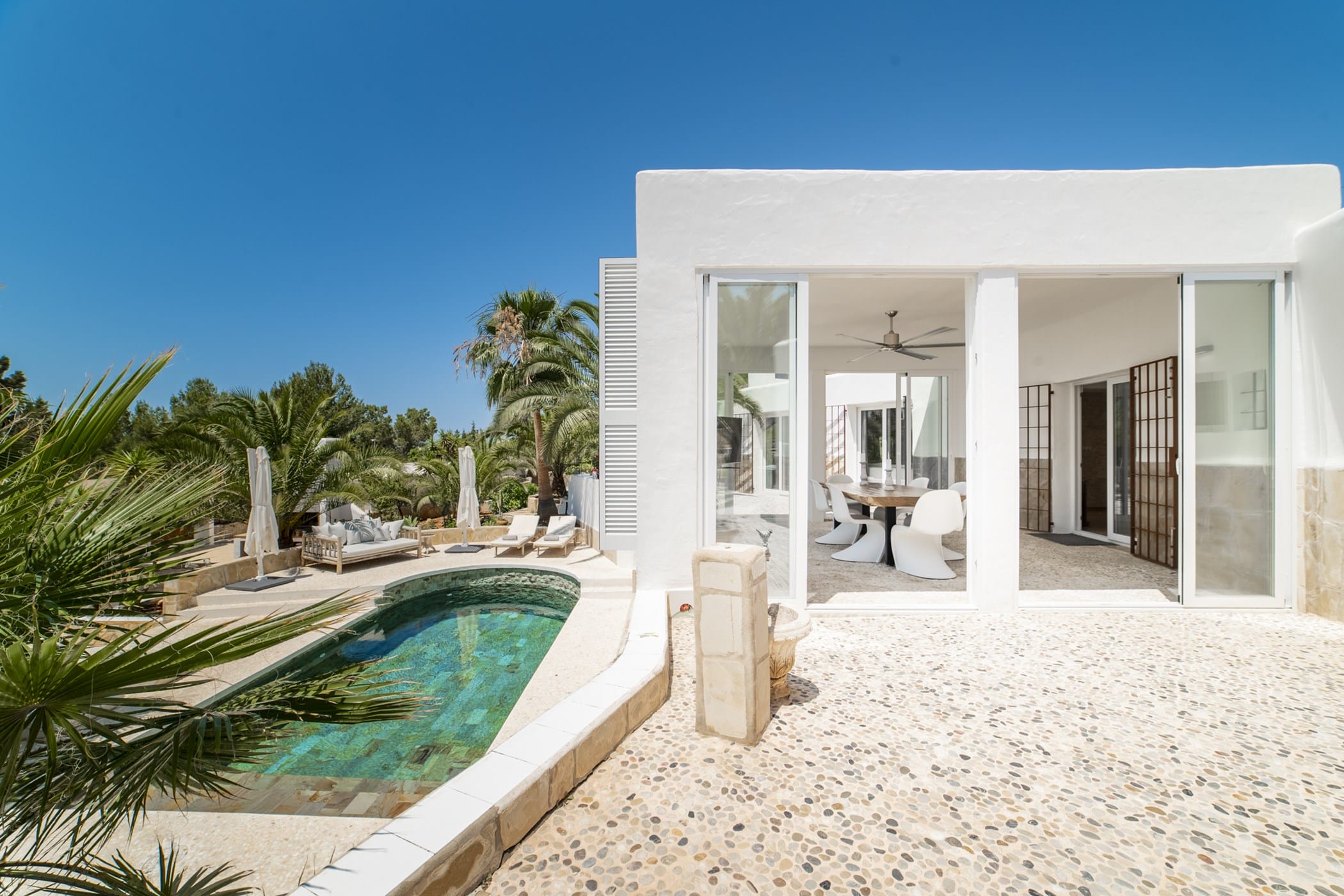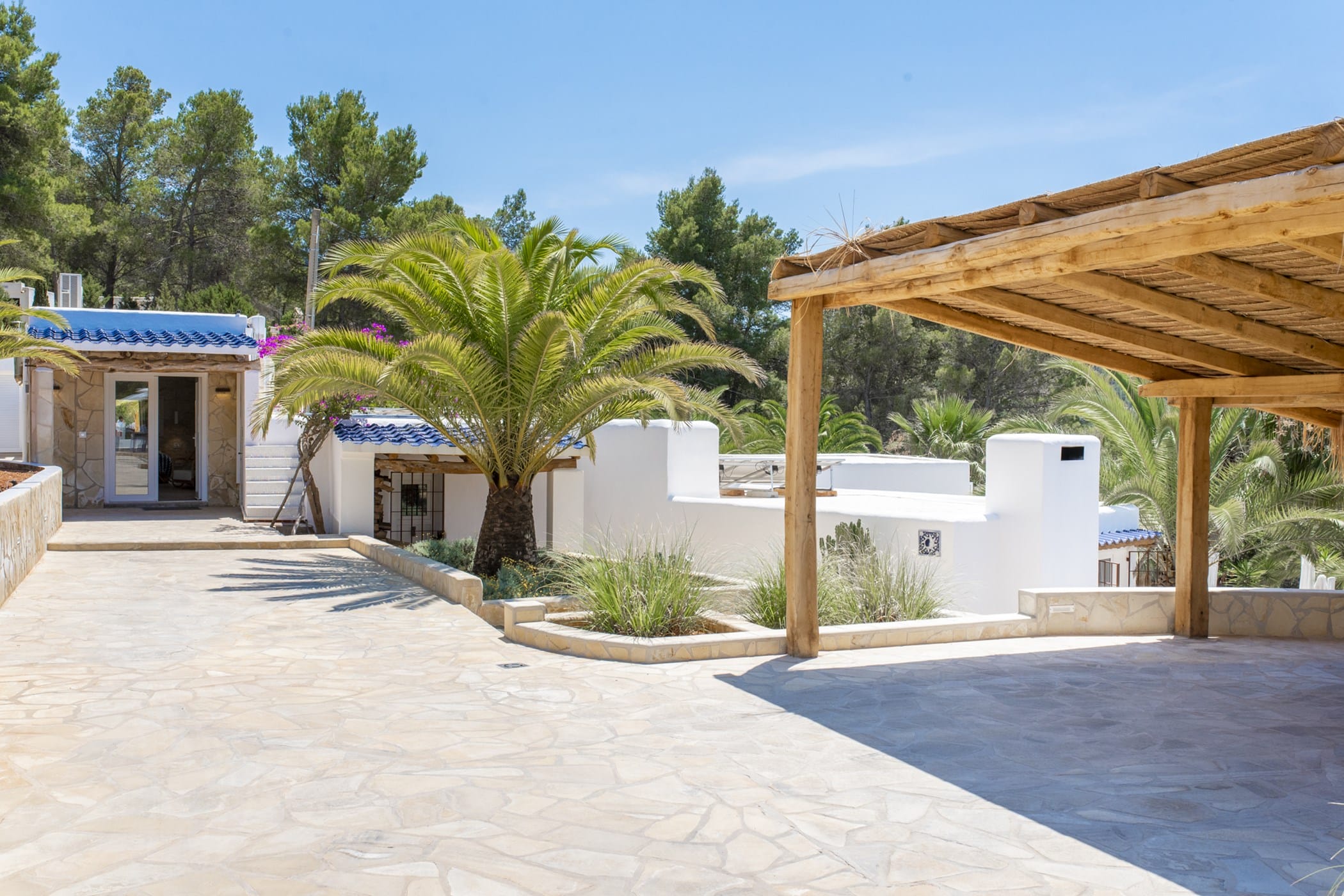 This modern finca sits on a private crescent-shaped plot in southwest Ibiza, just 3 km from Cala Tarida and its beach clubs. Fully renovated in 2021, it offers a fresh contemporary feel across three levels.
