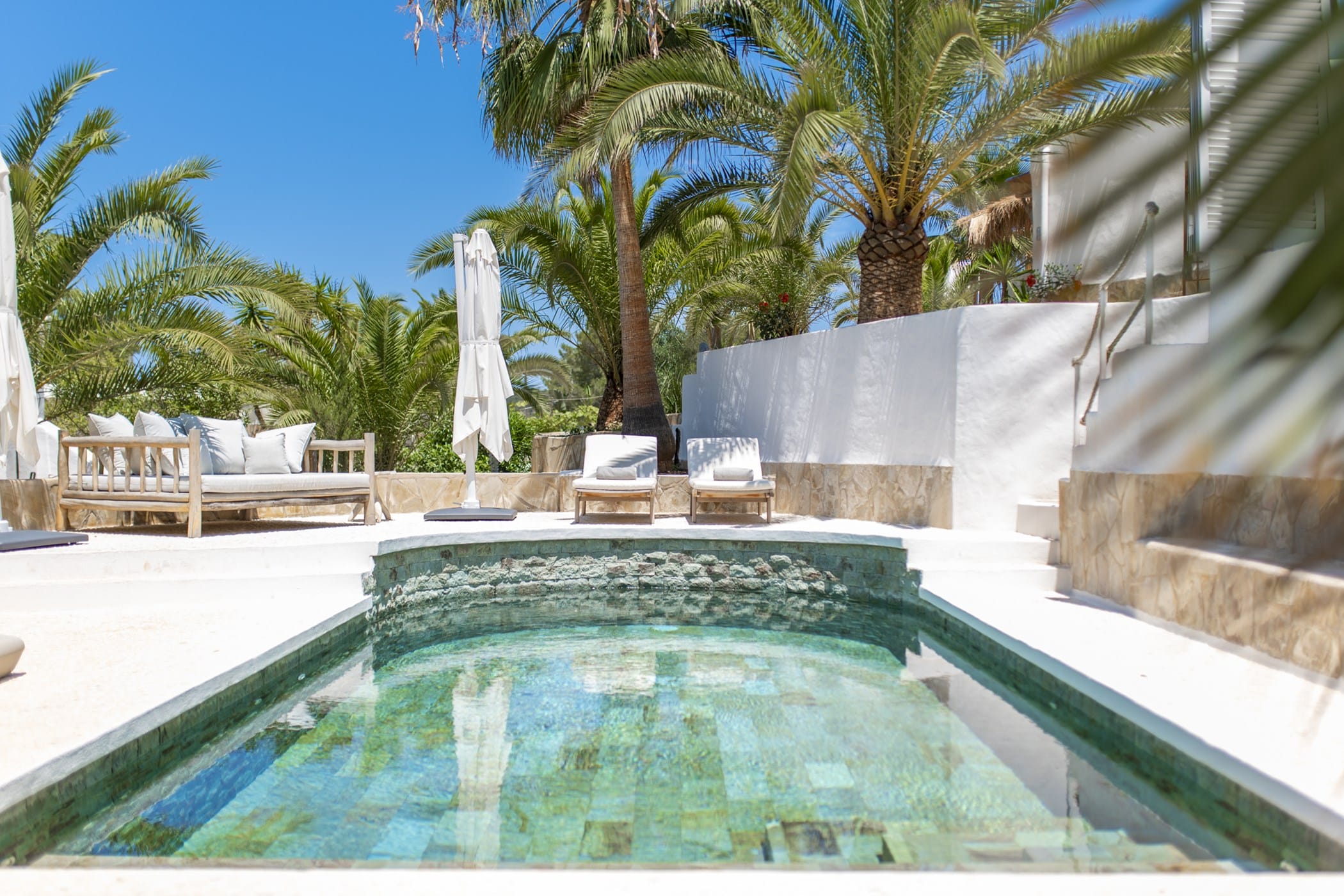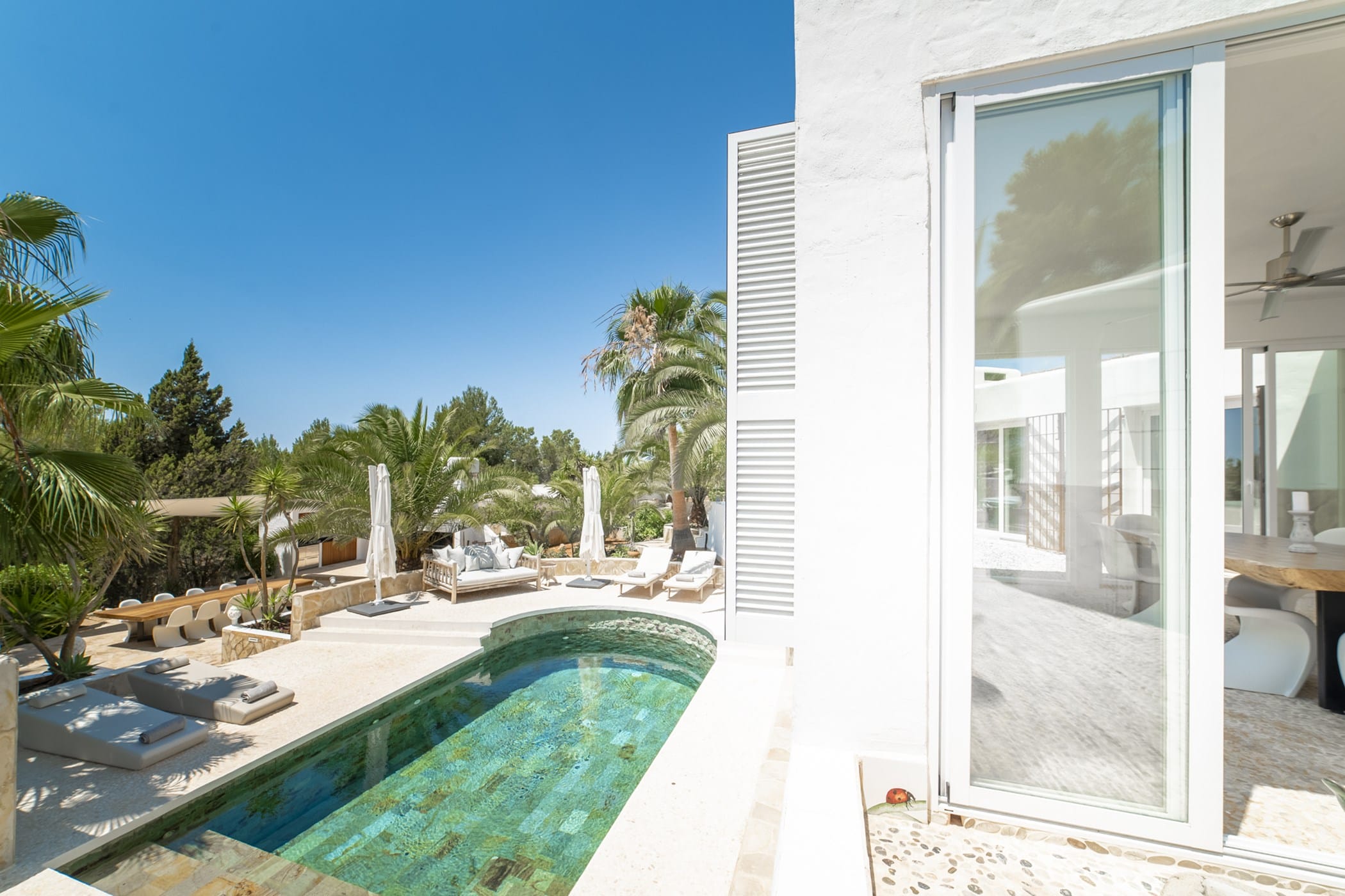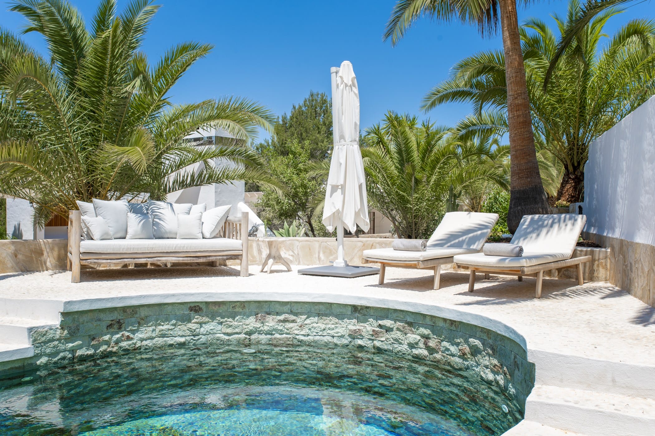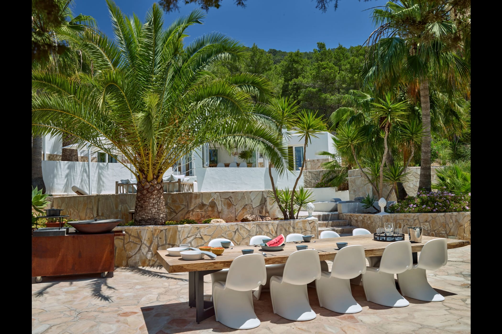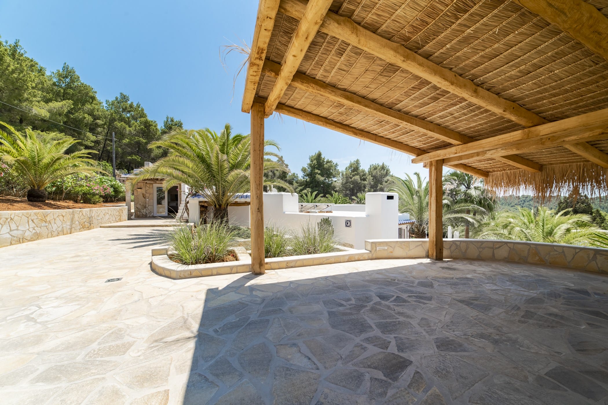 This modern finca sits on a private crescent-shaped plot in southwest Ibiza, just 3 km from Cala Tarida and its beach clubs. Fully renovated in 2021, it offers a fresh contemporary feel across three levels.