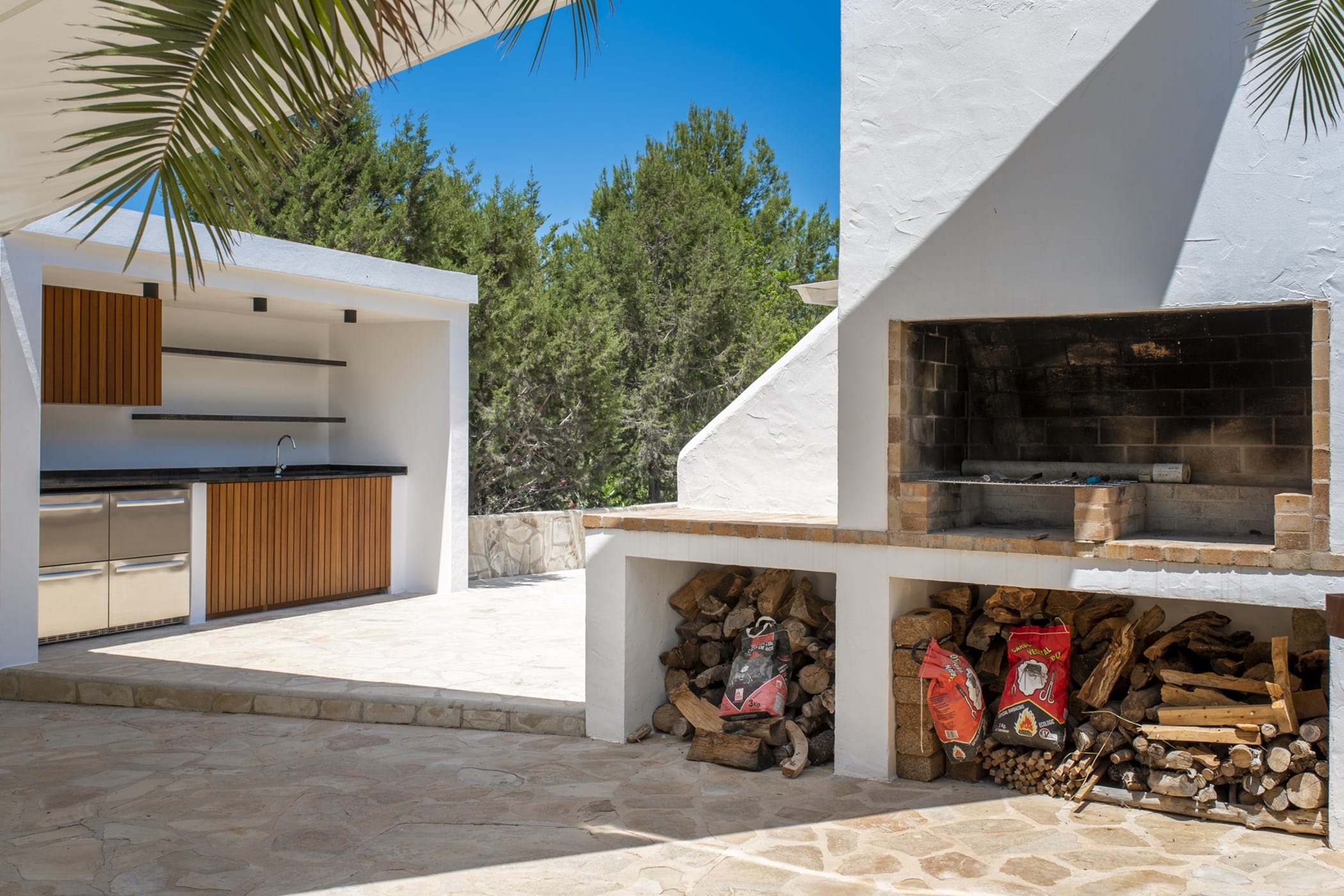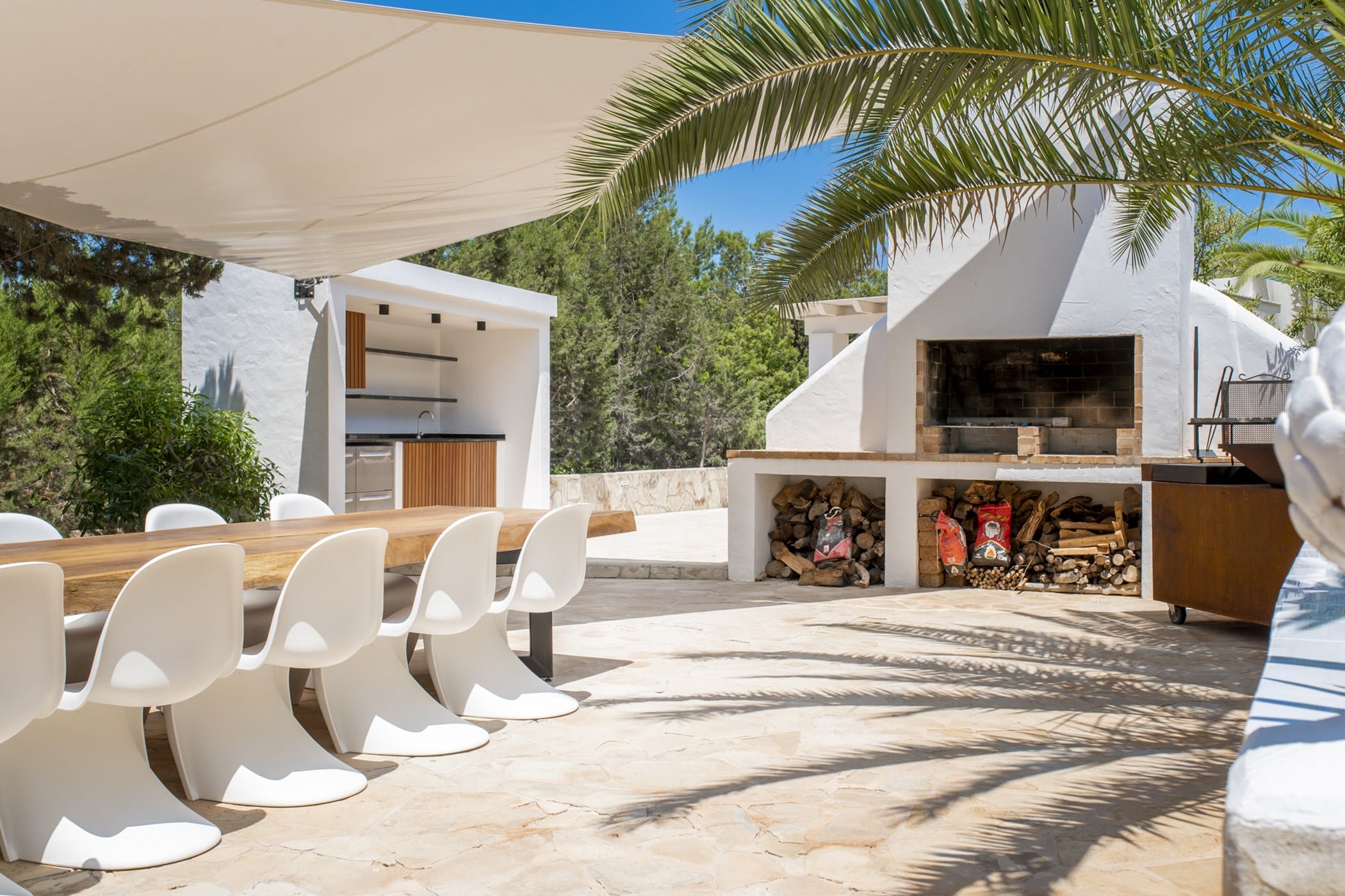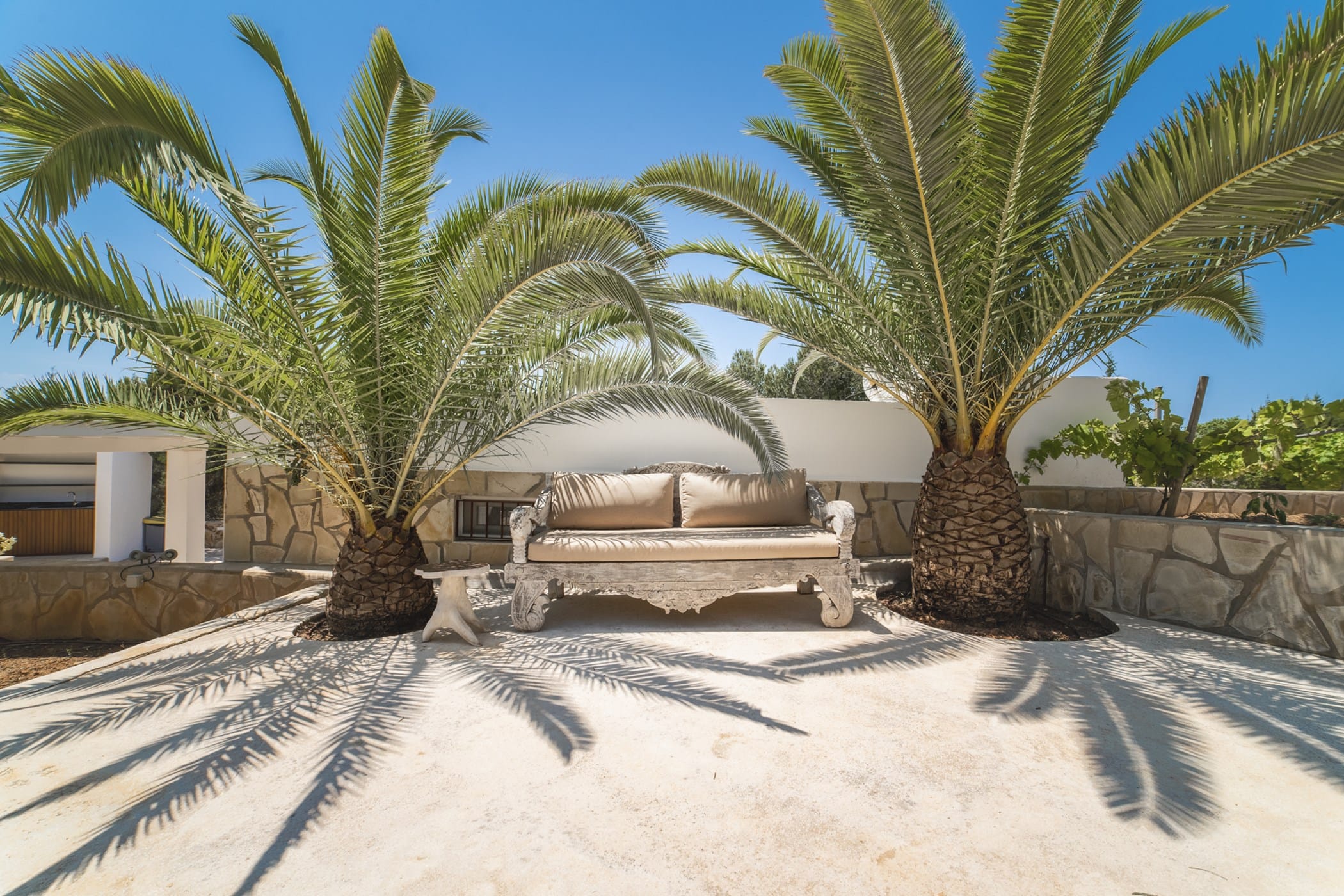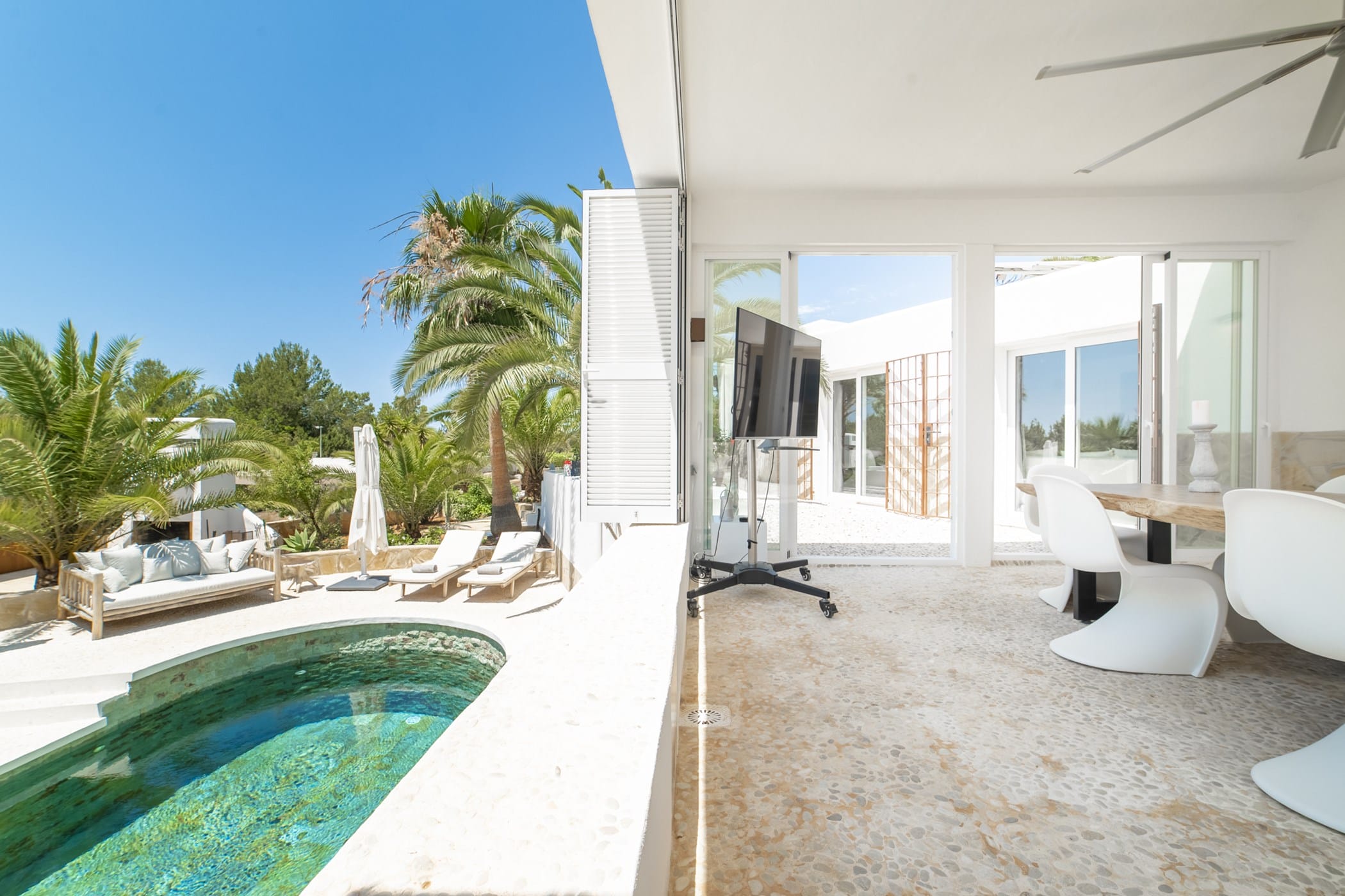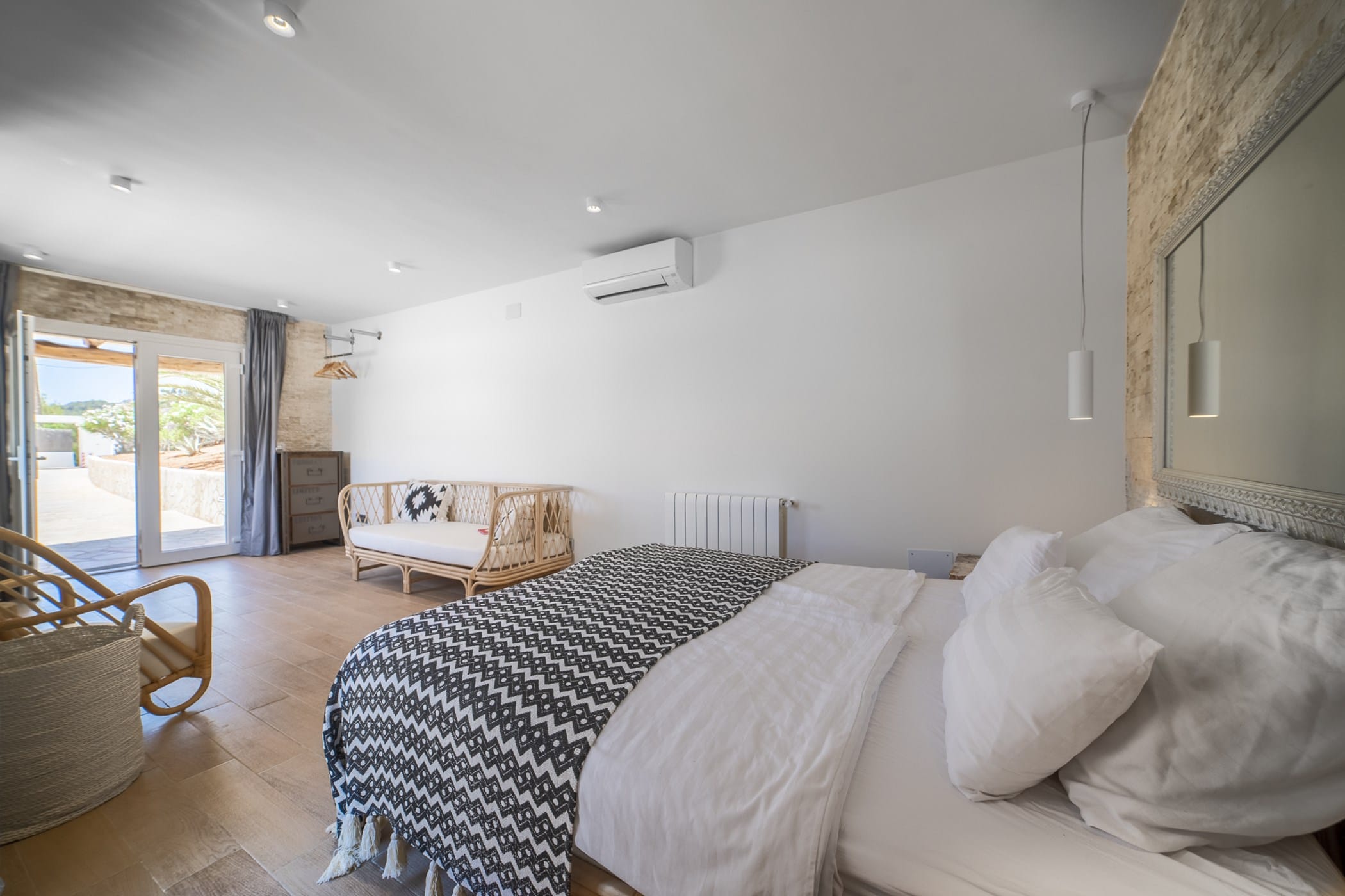 This modern finca sits on a private crescent-shaped plot in southwest Ibiza, just 3 km from Cala Tarida and its beach clubs. Fully renovated in 2021, it offers a fresh contemporary feel across three levels.