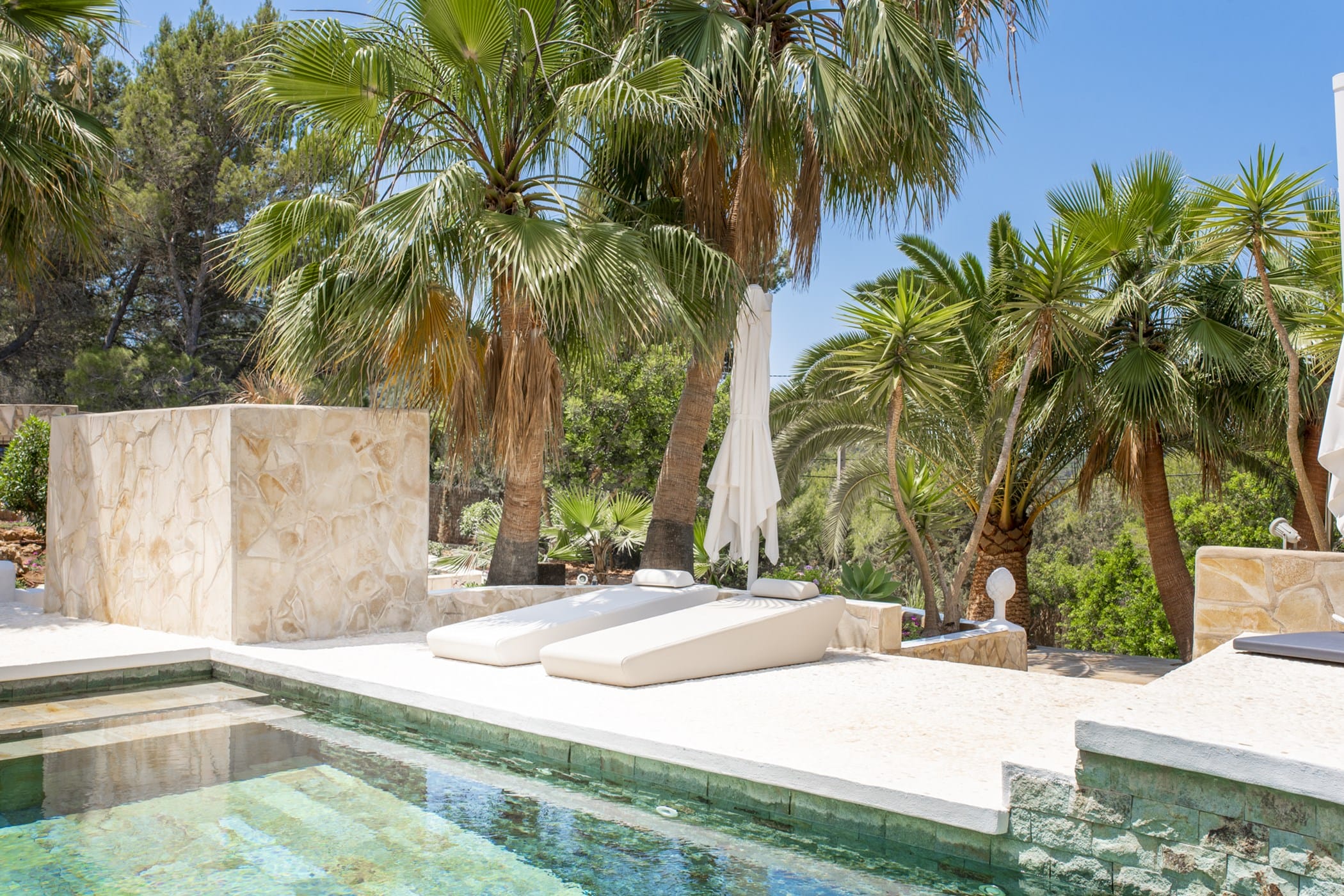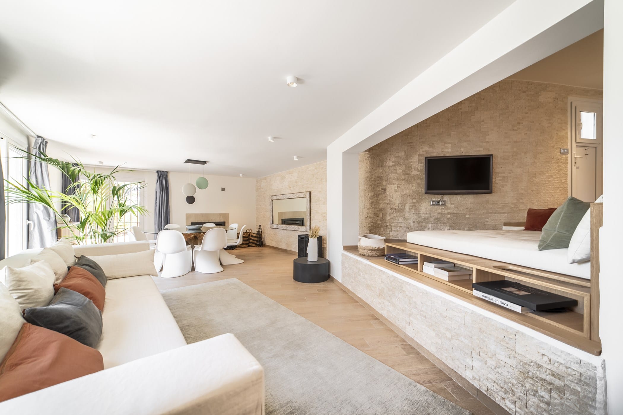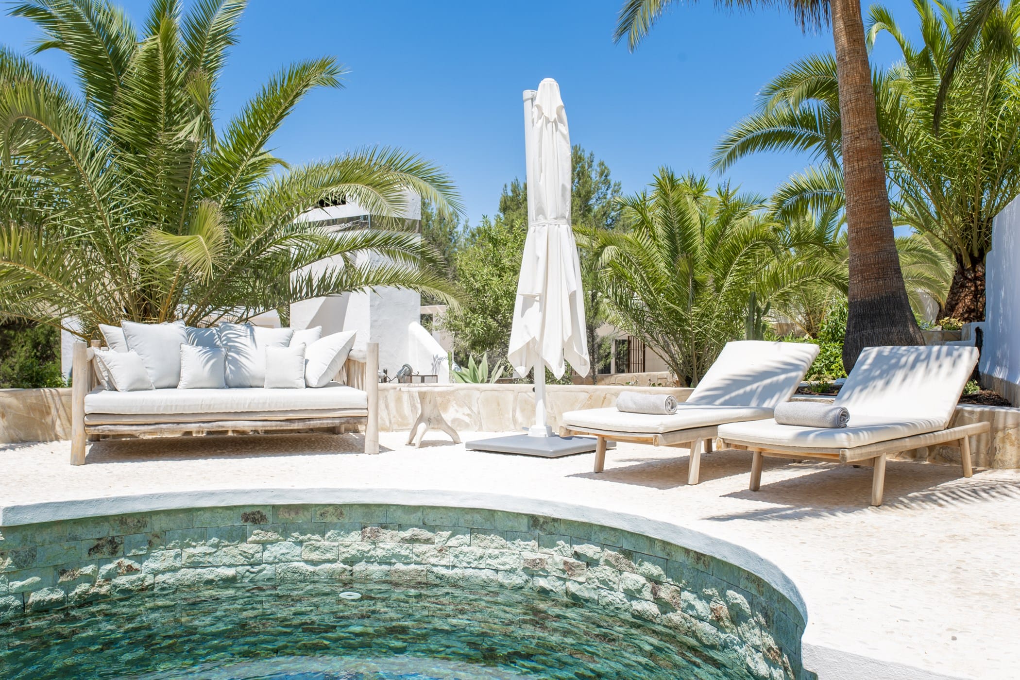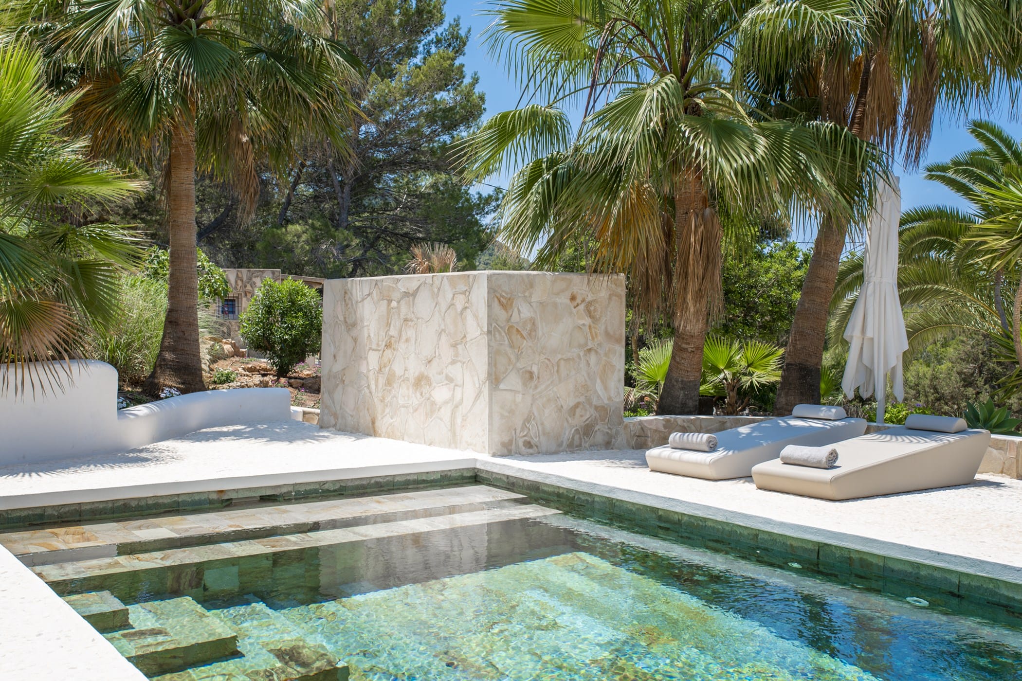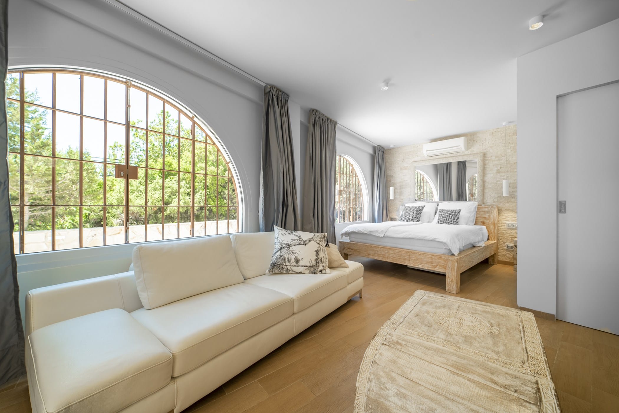 This modern finca sits on a private crescent-shaped plot in southwest Ibiza, just 3 km from Cala Tarida and its beach clubs. Fully renovated in 2021, it offers a fresh contemporary feel across three levels.
