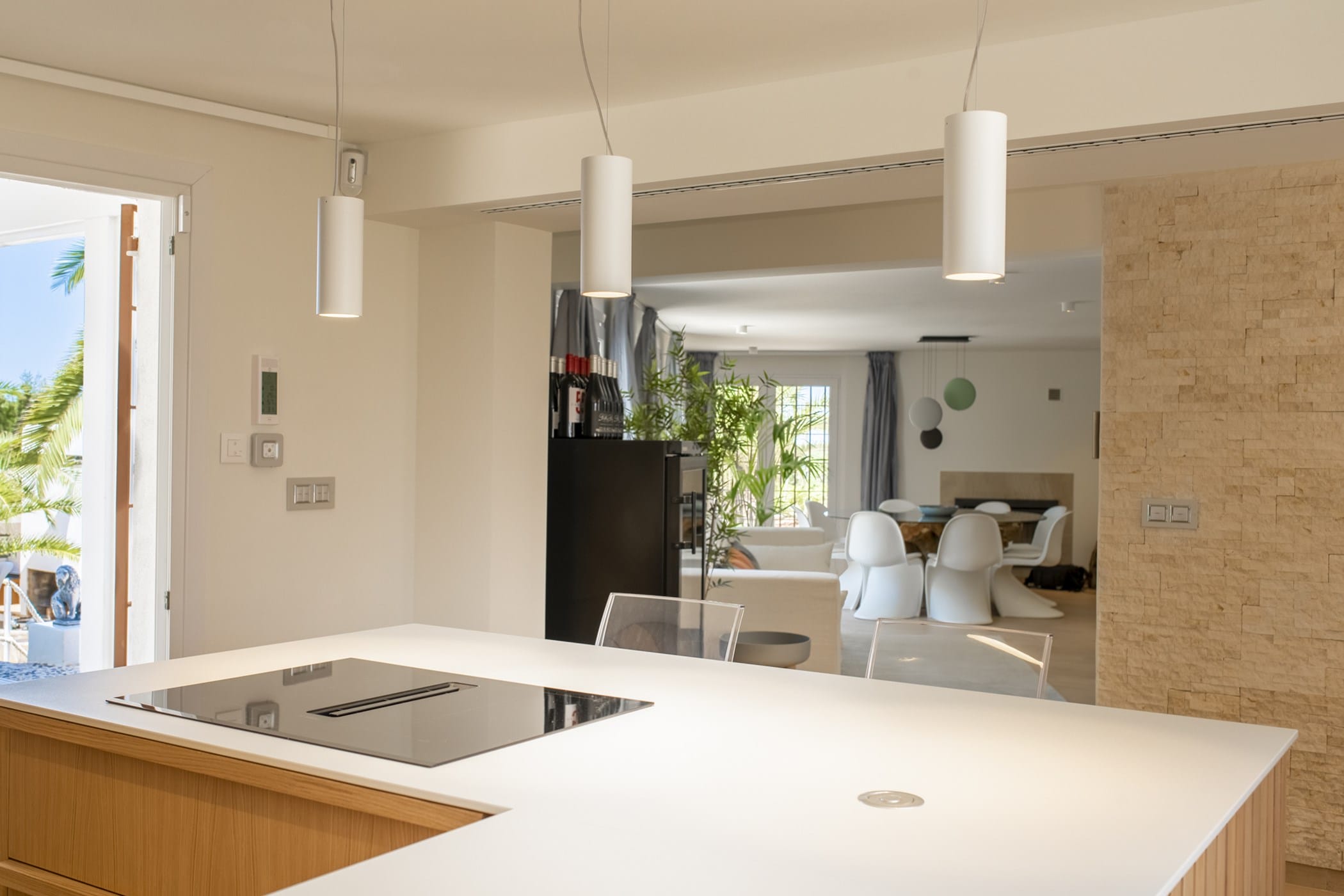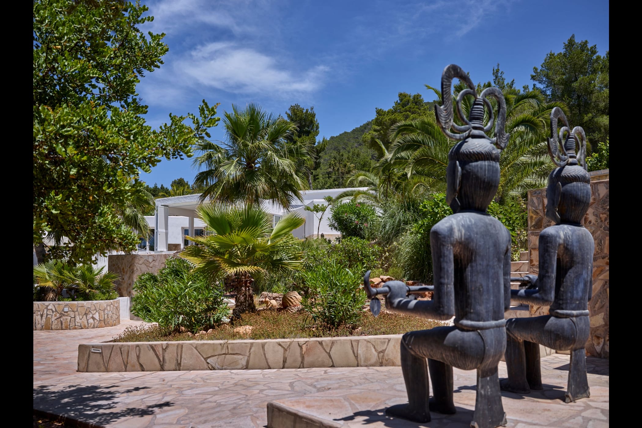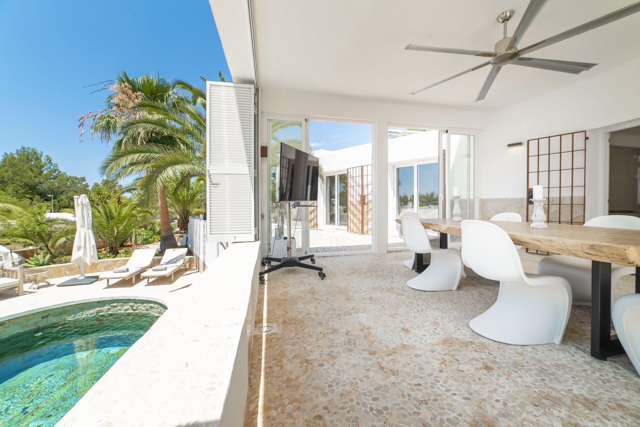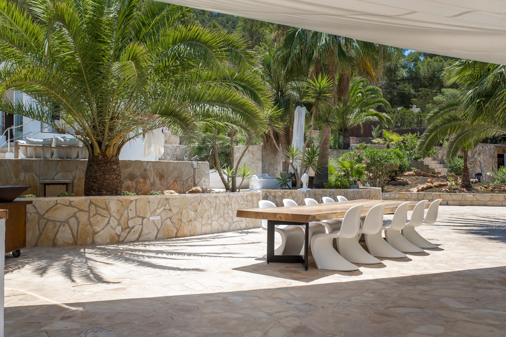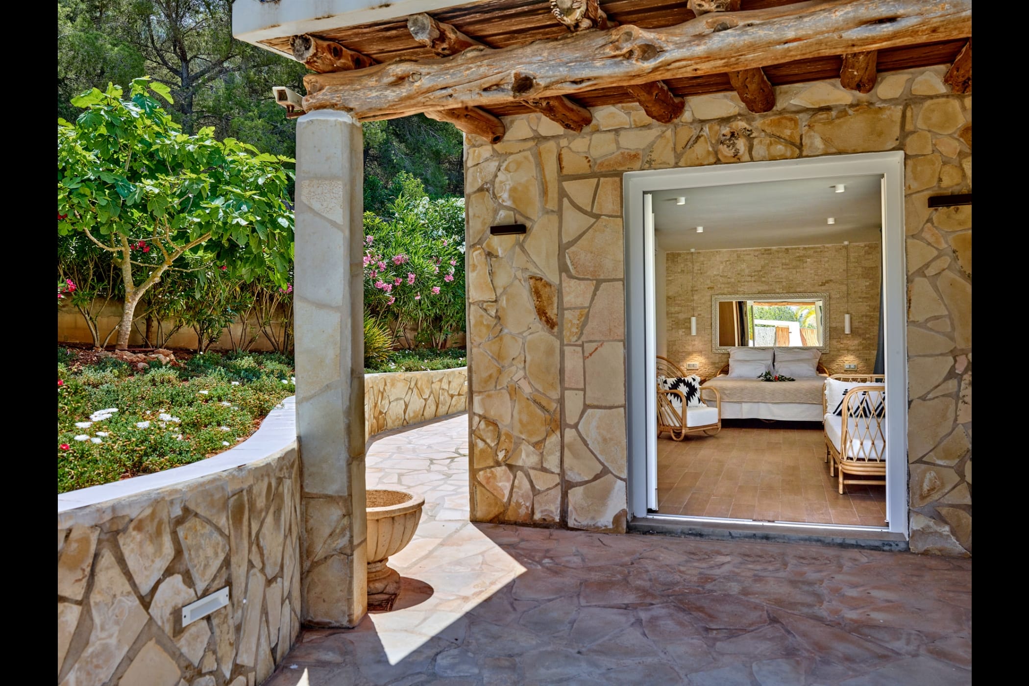 This modern finca sits on a private crescent-shaped plot in southwest Ibiza, just 3 km from Cala Tarida and its beach clubs. Fully renovated in 2021, it offers a fresh contemporary feel across three levels.