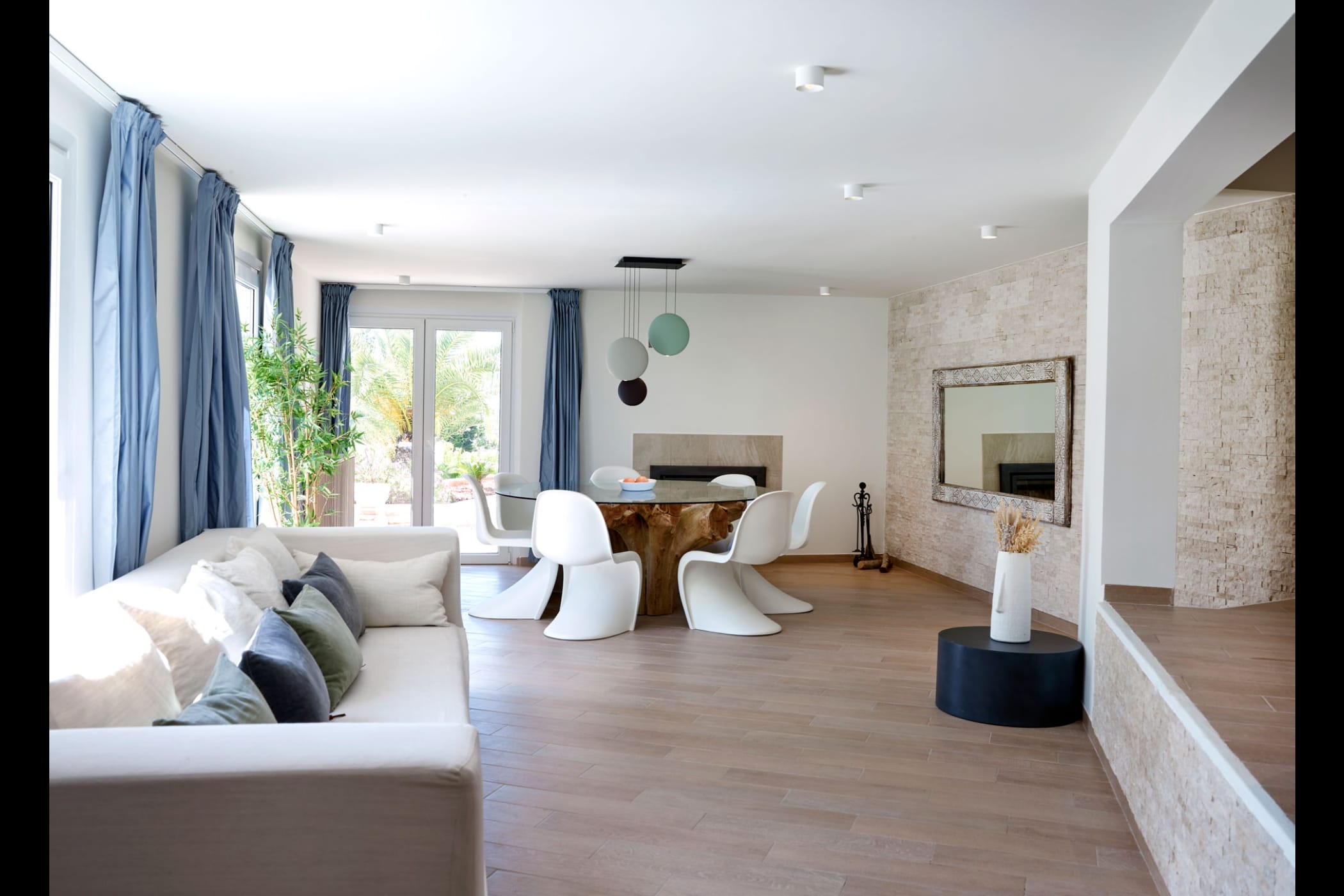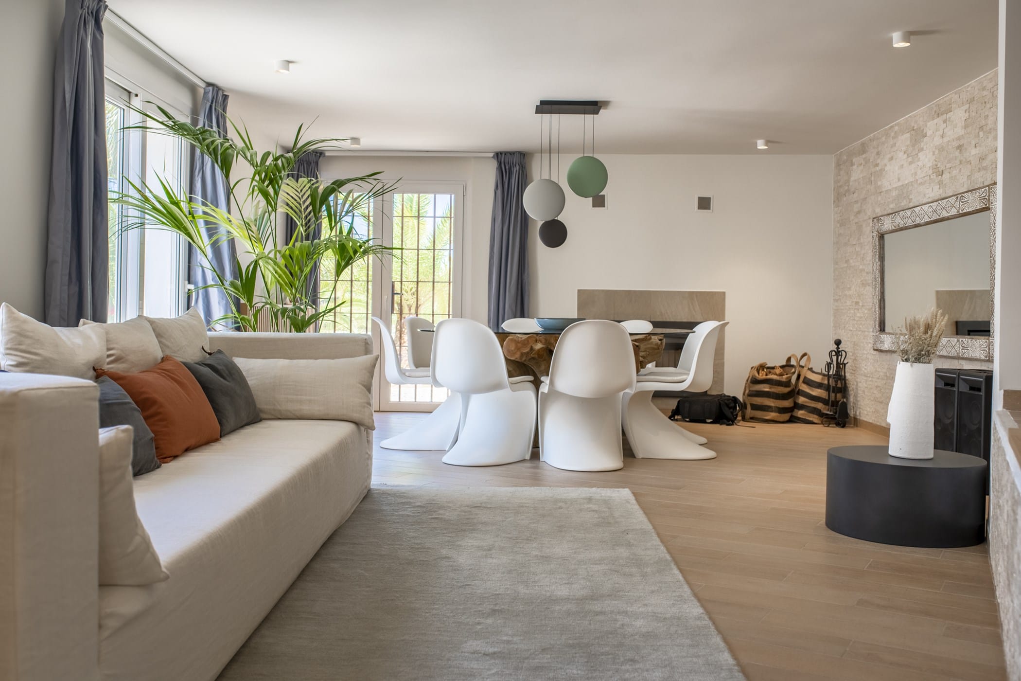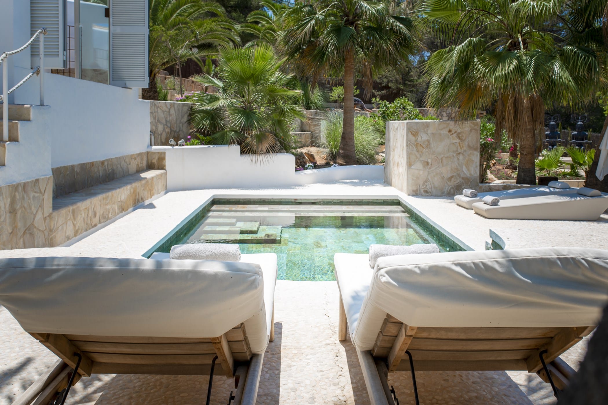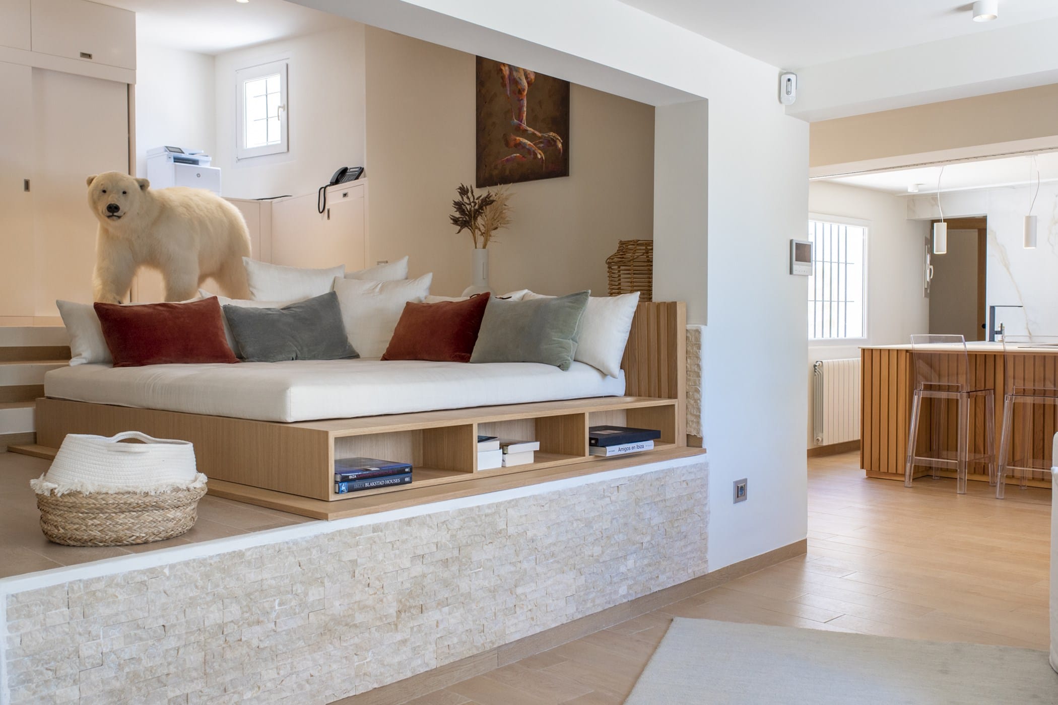 This modern finca sits on a private crescent-shaped plot in southwest Ibiza, just 3 km from Cala Tarida and its beach clubs. Fully renovated in 2021, it offers a fresh contemporary feel across three levels.