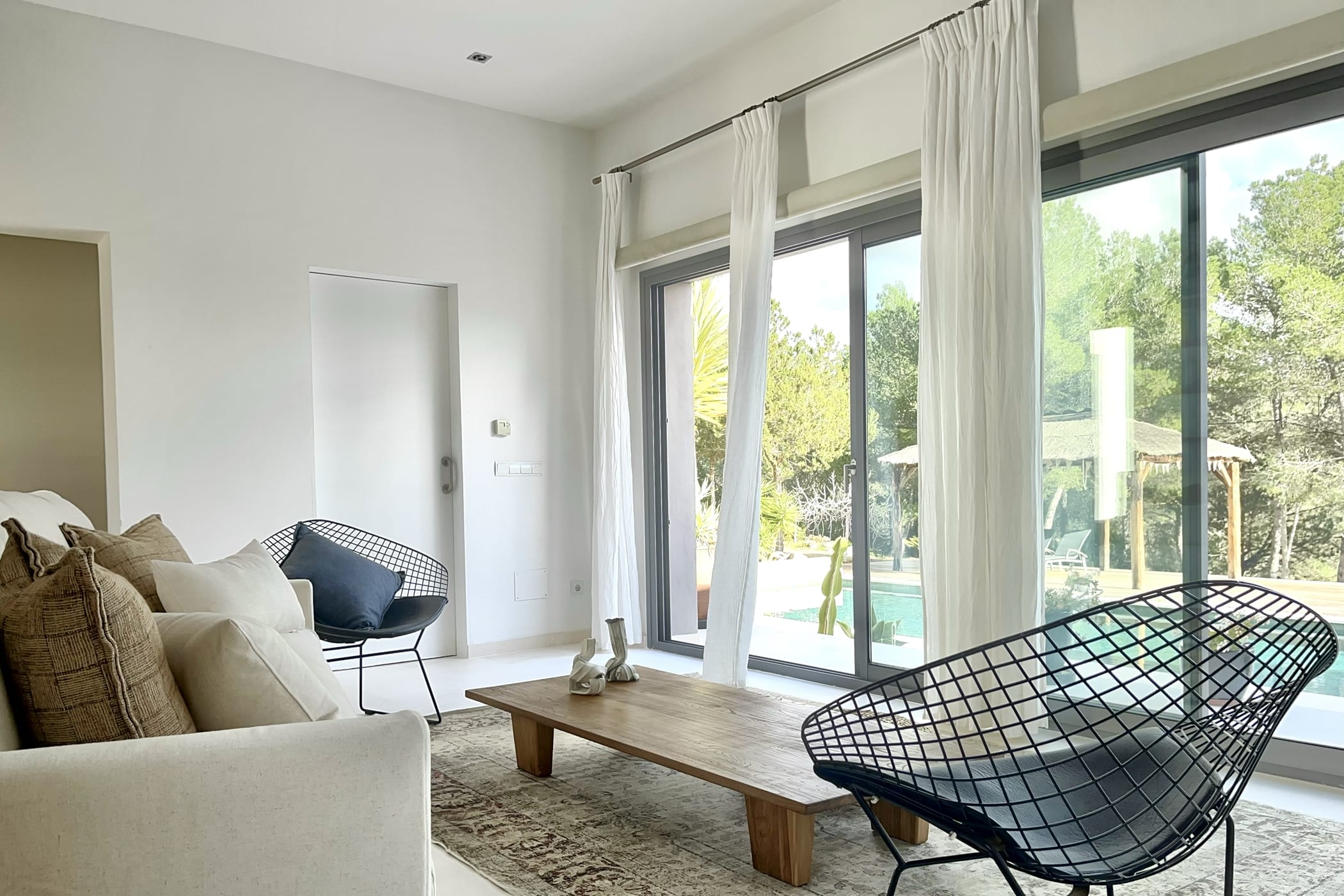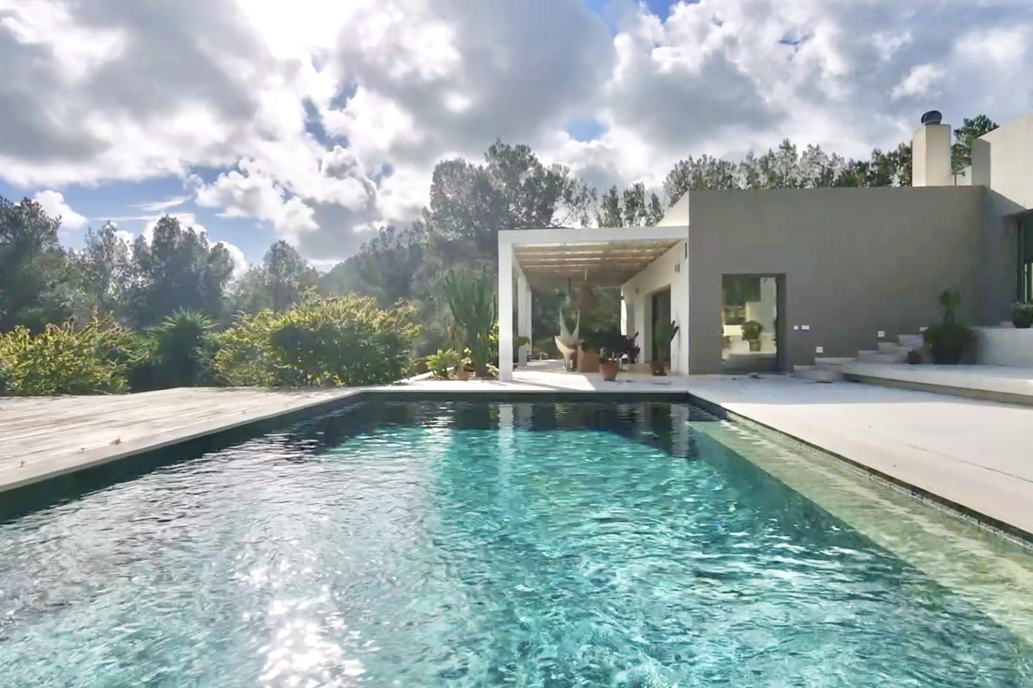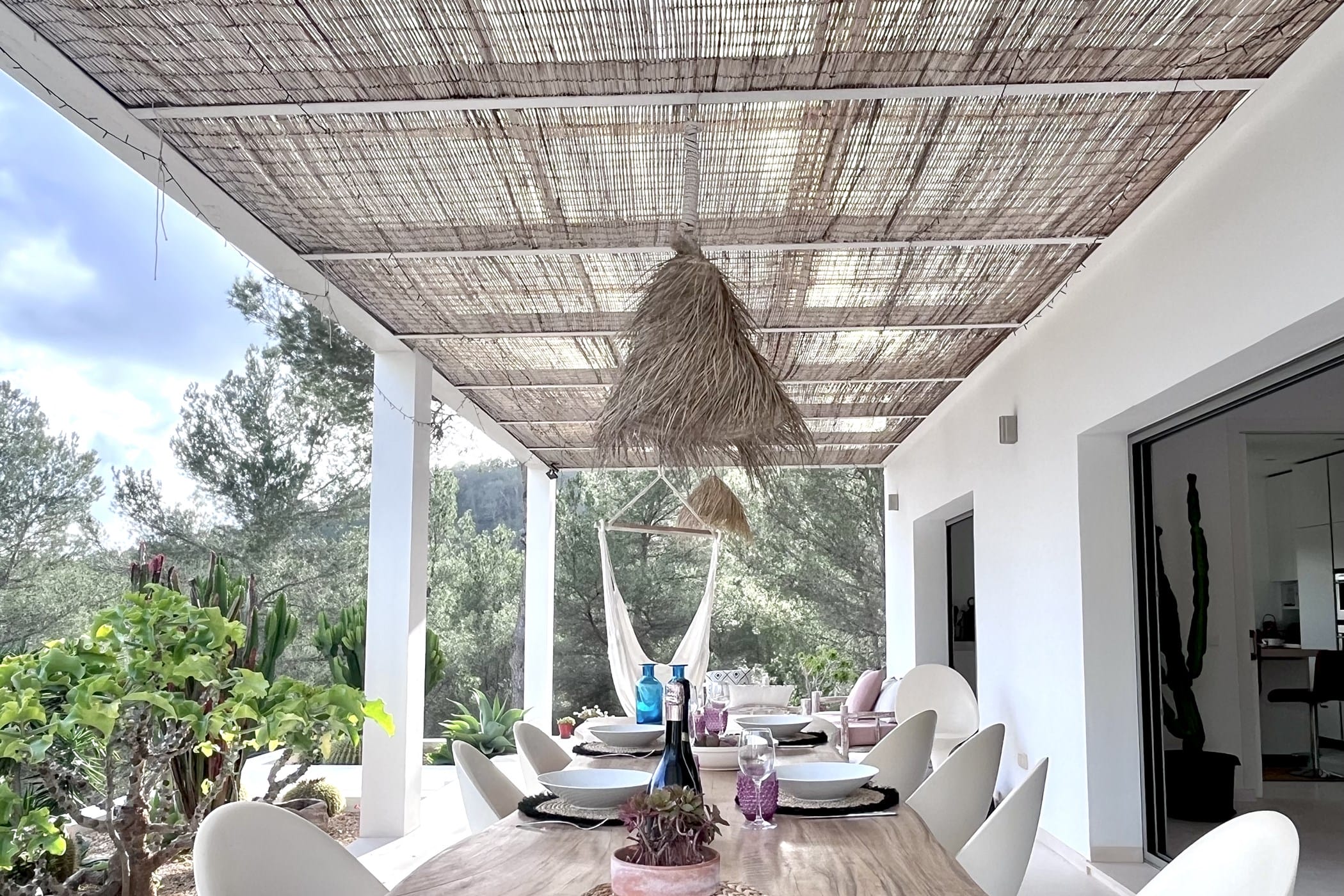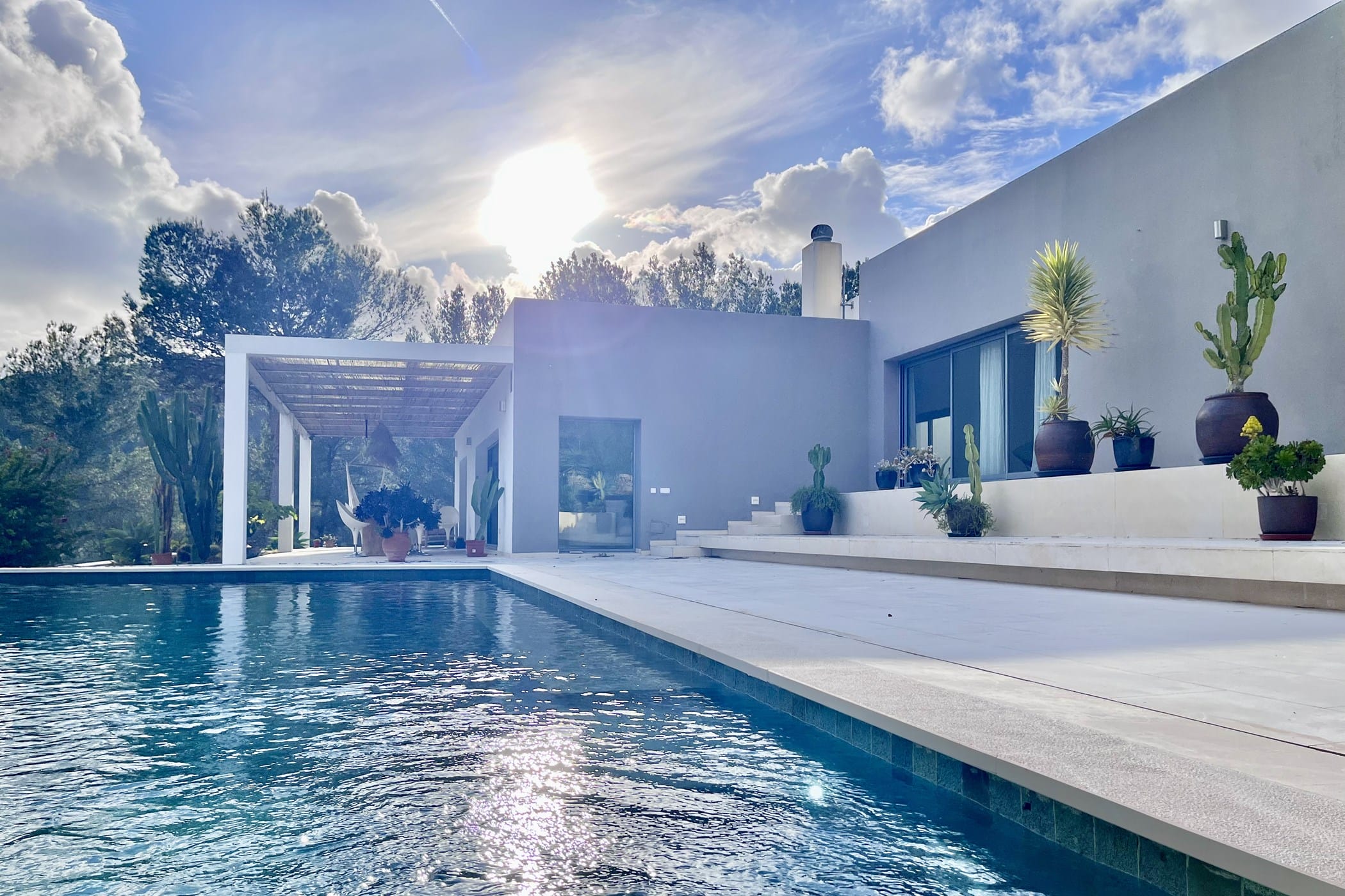 Nestled on a peaceful pine-covered hill in Ibiza’s serene countryside between Santa Gertrudis, San Lorenzo, and Santa Eulalia, this stunning modern Mediterranean villa offers a private swimming pool, sunny terraces, and multiple outdoor dining areas.