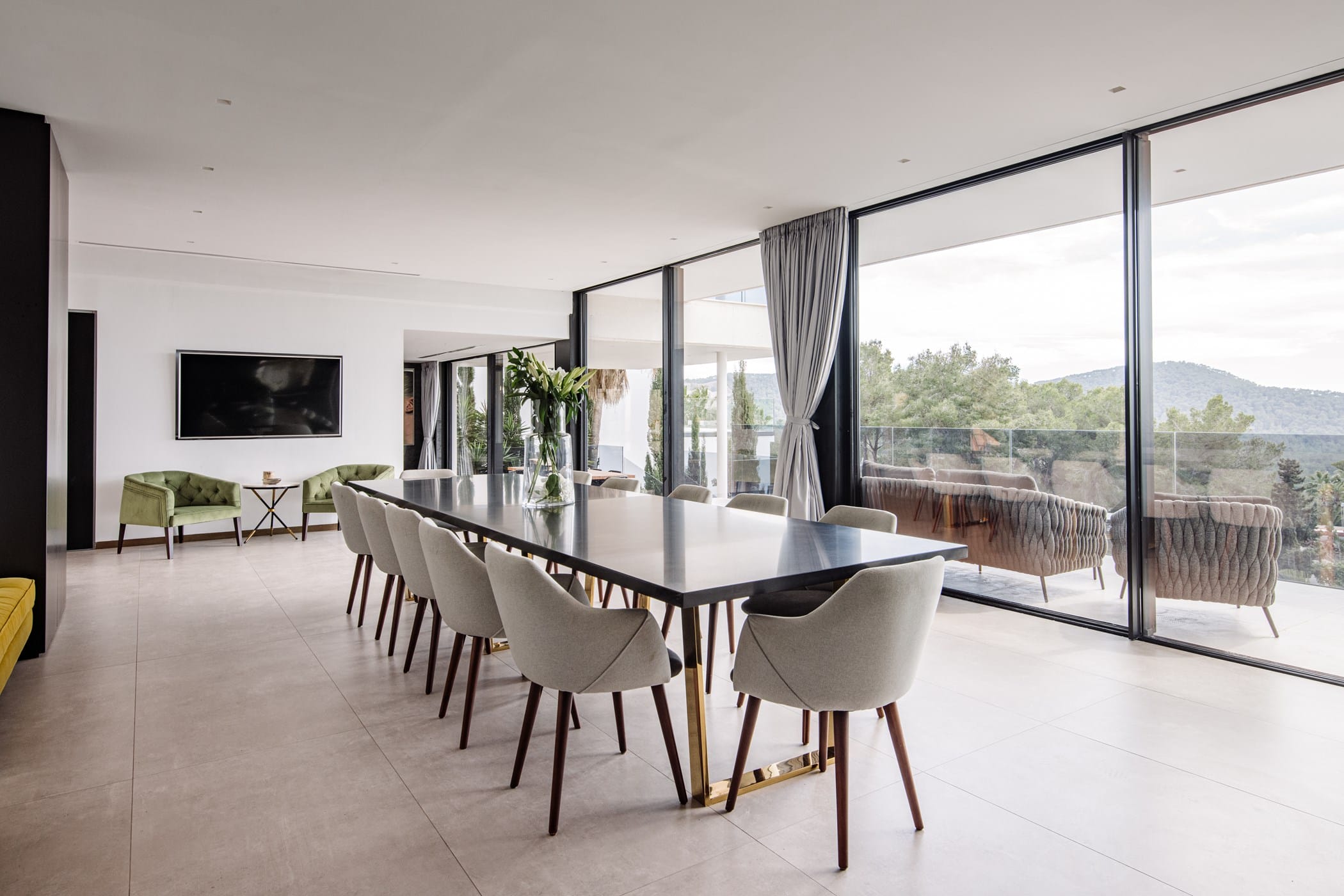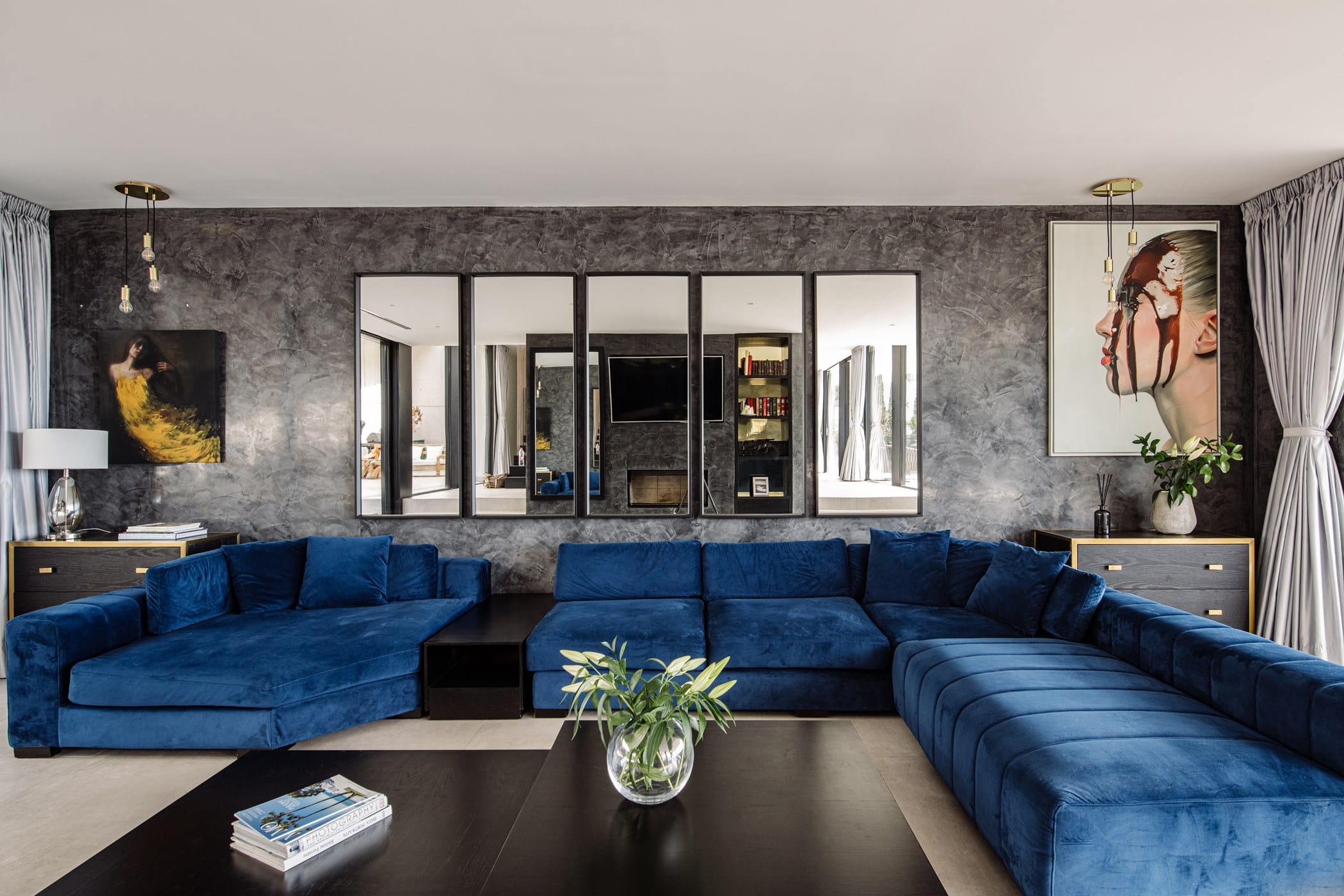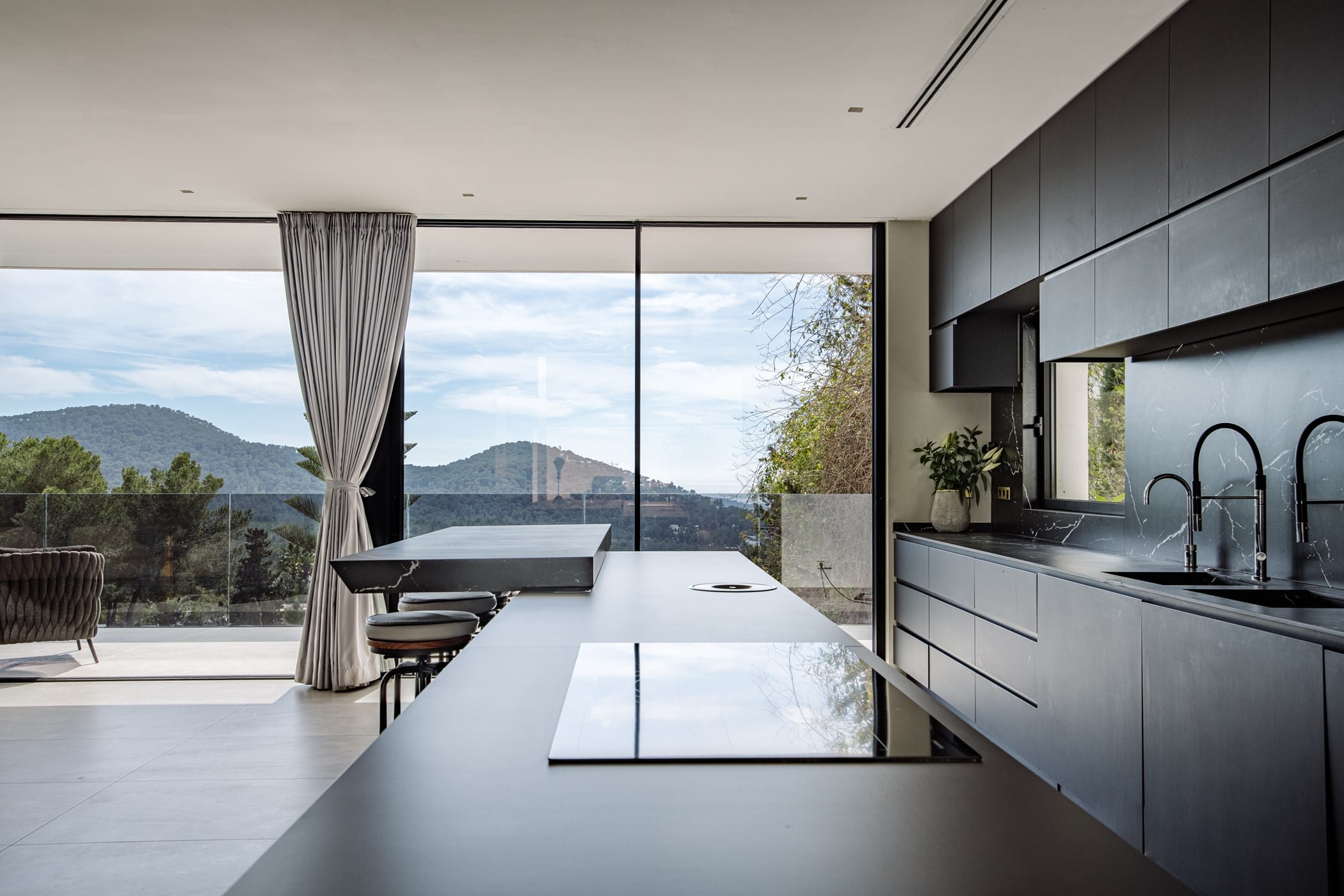 The property features five south-facing en-suite bedrooms, each beautifully furnished with elegant artwork and impressive views. The split-level open-plan living space is bright and spacious, seamlessly blending lounge, dining, and kitchen areas. The sleek black marble kitchen is fully equipped with high-end appliances and a breakfast bar. The lounge offers large comfortable sofas, smart TV, Apple TV, and floor-to-ceiling sliding doors to the terrace.