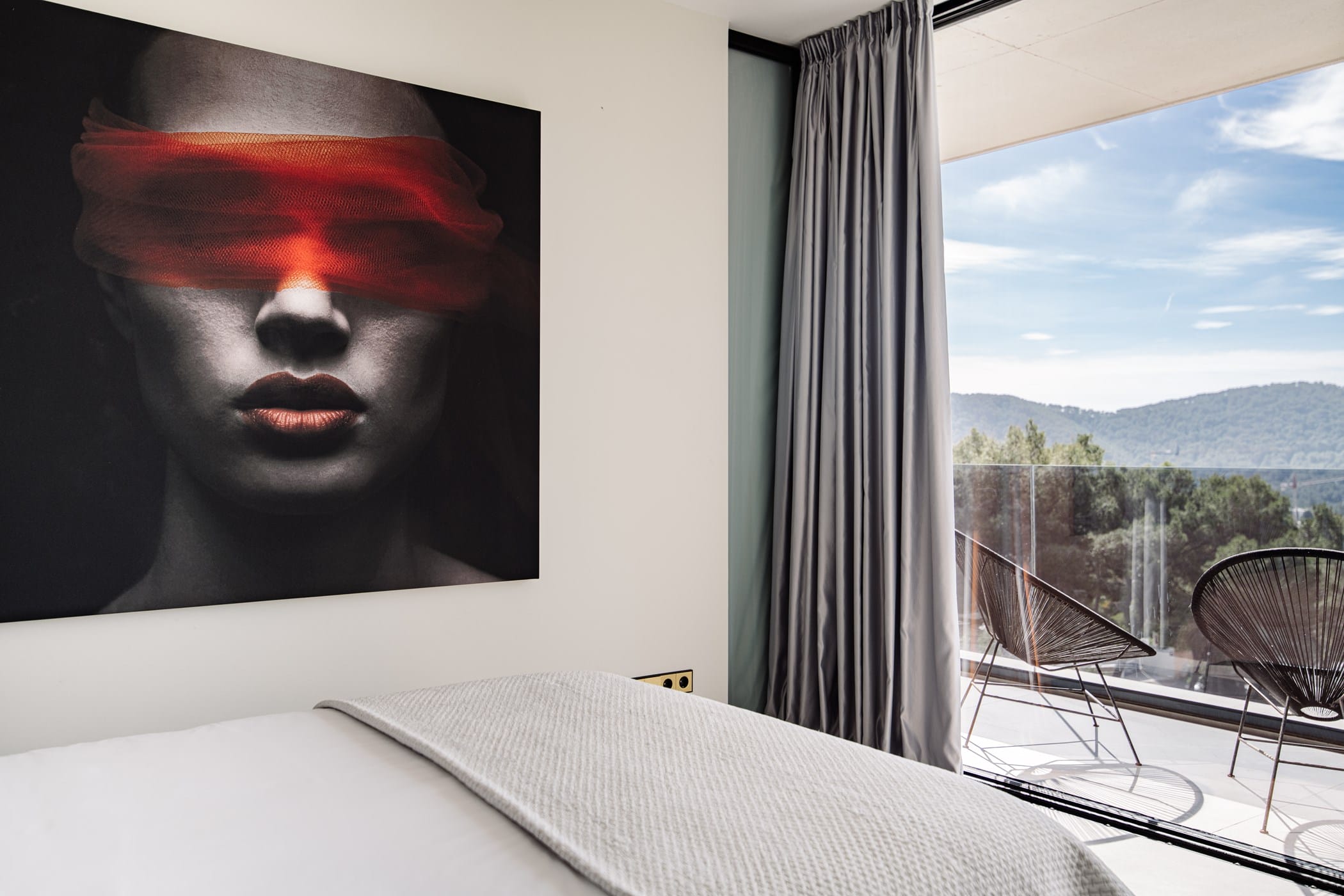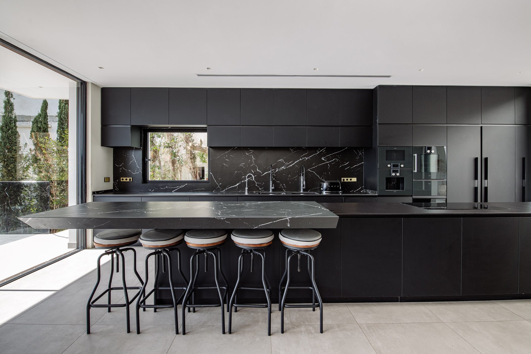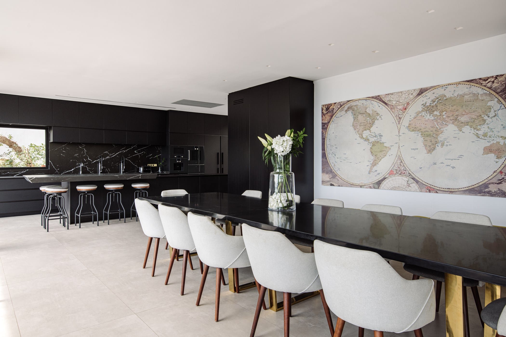 The property features five south-facing en-suite bedrooms, each beautifully furnished with elegant artwork and impressive views. The split-level open-plan living space is bright and spacious, seamlessly blending lounge, dining, and kitchen areas. The sleek black marble kitchen is fully equipped with high-end appliances and a breakfast bar. The lounge offers large comfortable sofas, smart TV, Apple TV, and floor-to-ceiling sliding doors to the terrace.