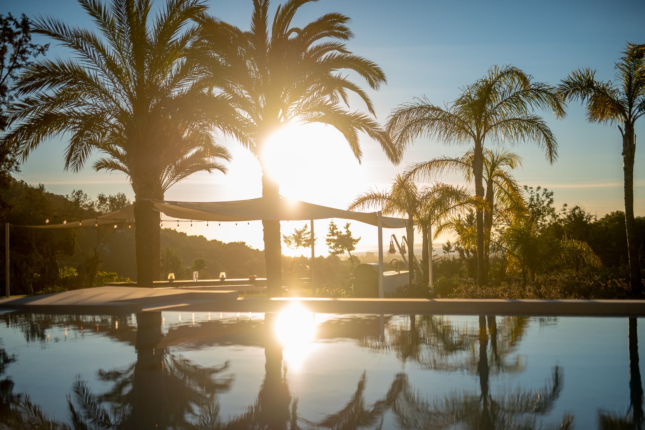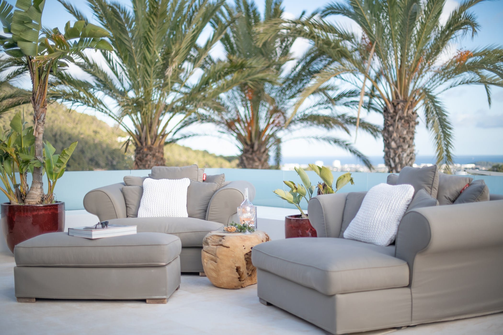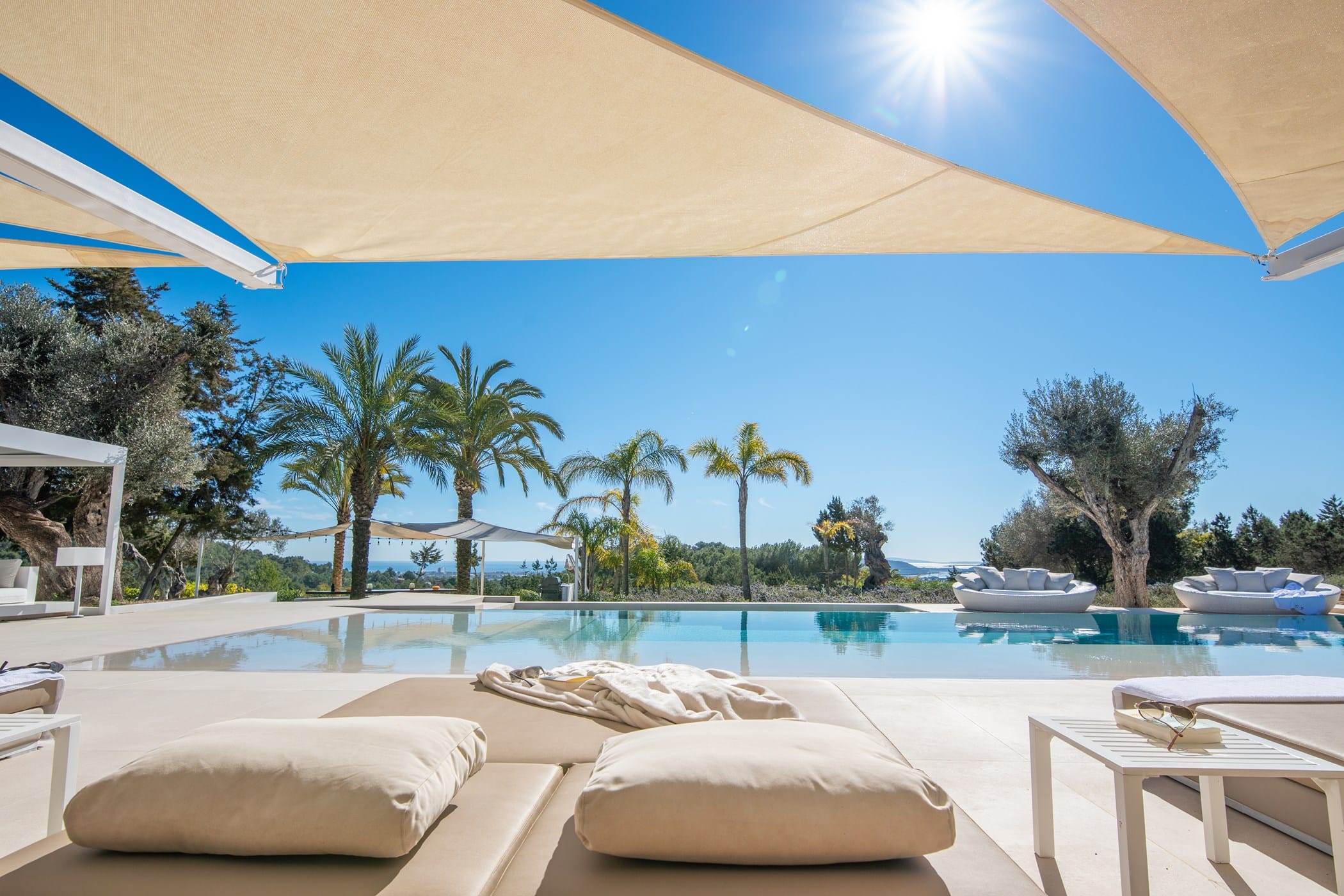 Outside, the fragrant gardens and expansive grounds offer exceptional sea and countryside views. The highlight is the sloping infinity swimming pool, surrounded by a traditional Roman stone terrace and ample sunbeds. Additional features include large shaded chill-out areas with luxury daybeds and a delightful outdoor dining area with bespoke BBQ – the perfect setting to relax and enjoy the Ibizan sun.