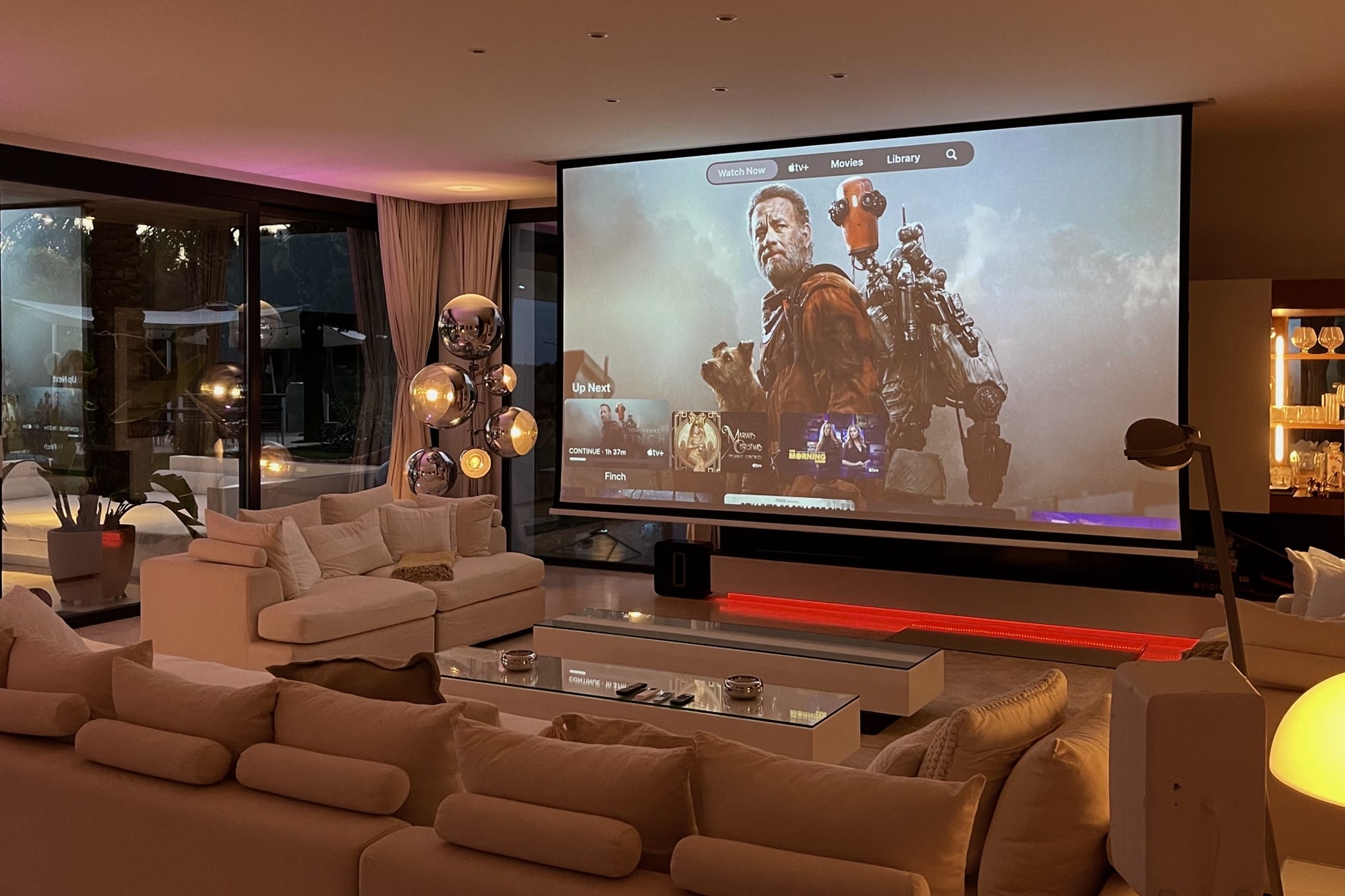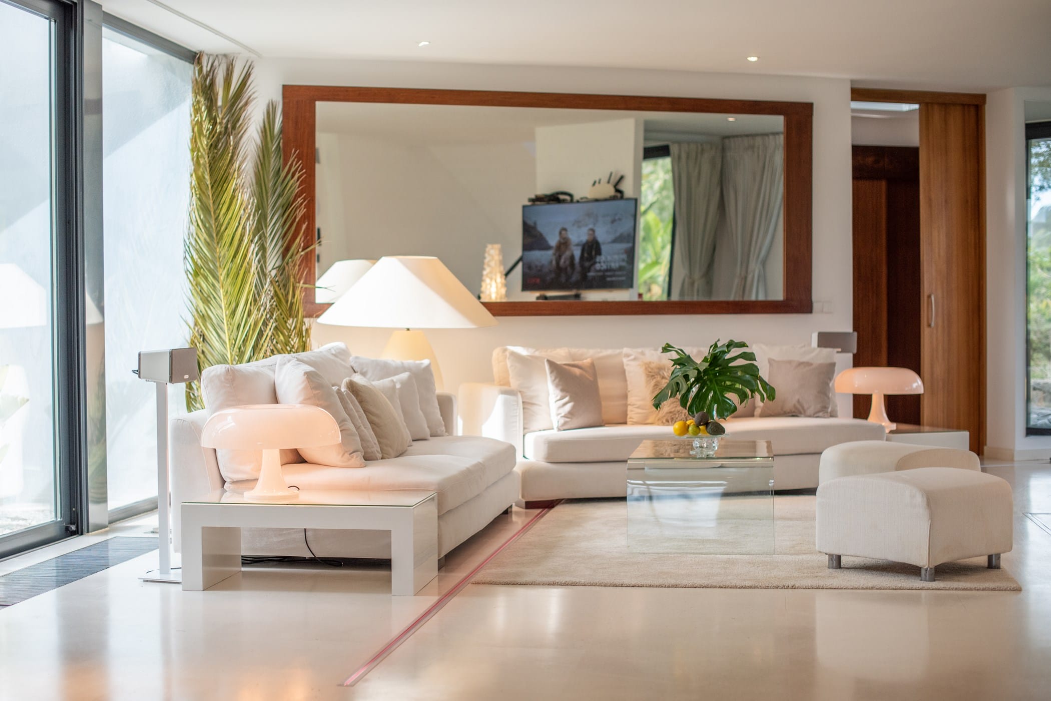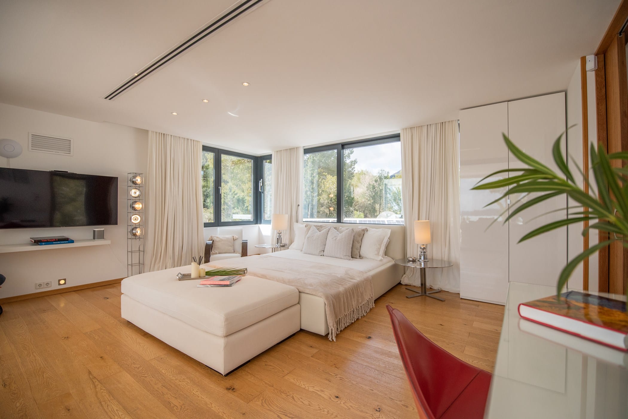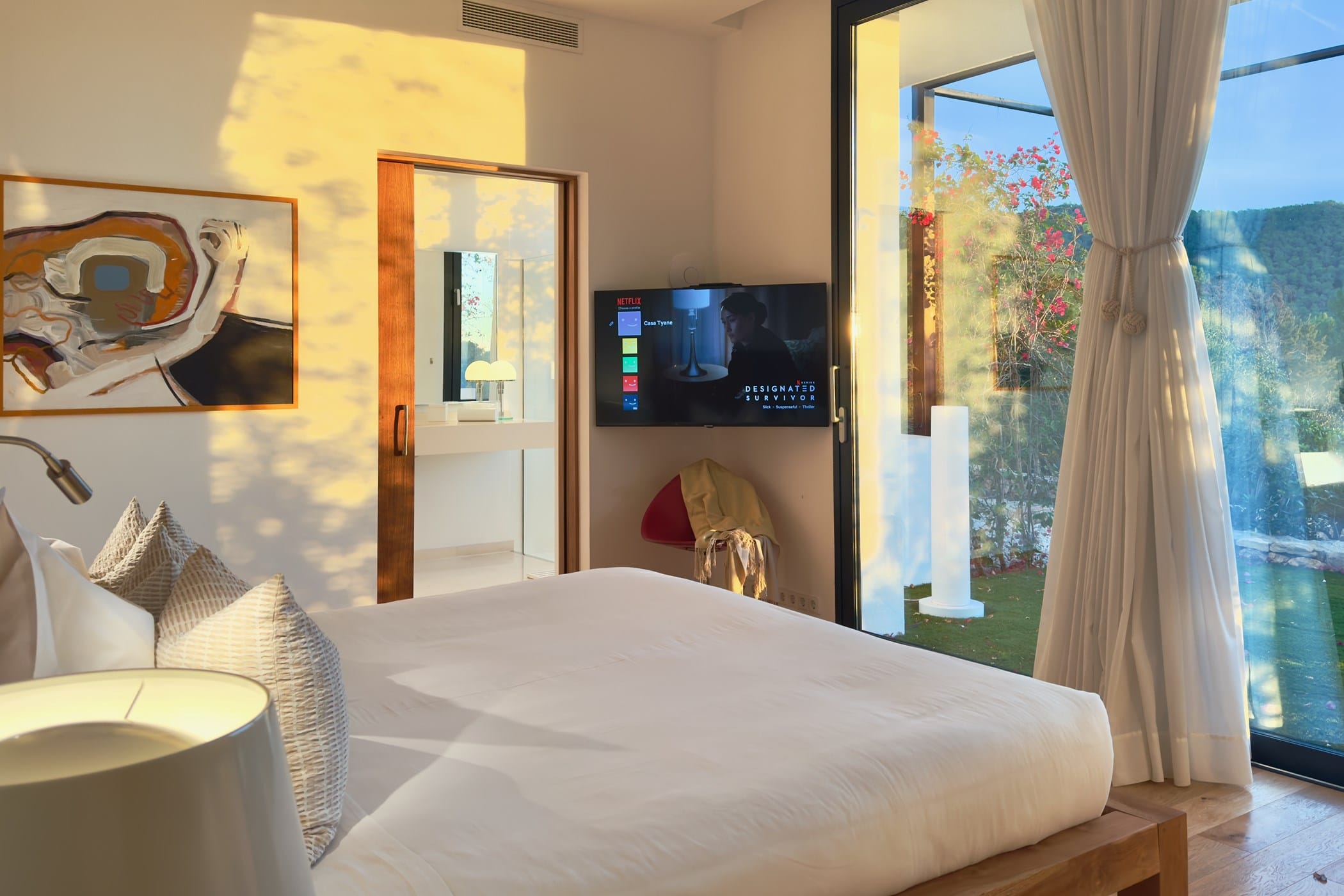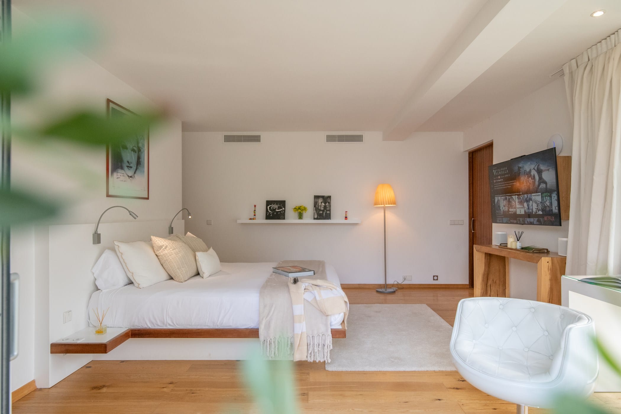 As you enter, you’re welcomed by a bright, spacious open-plan lounge, dining room, and fully equipped modern kitchen with floor-to-ceiling glass doors that flood the interior with natural light. The clean all-white theme creates a stylish, elegant atmosphere, enhanced by soft furnishings and pops of colour from contemporary art.