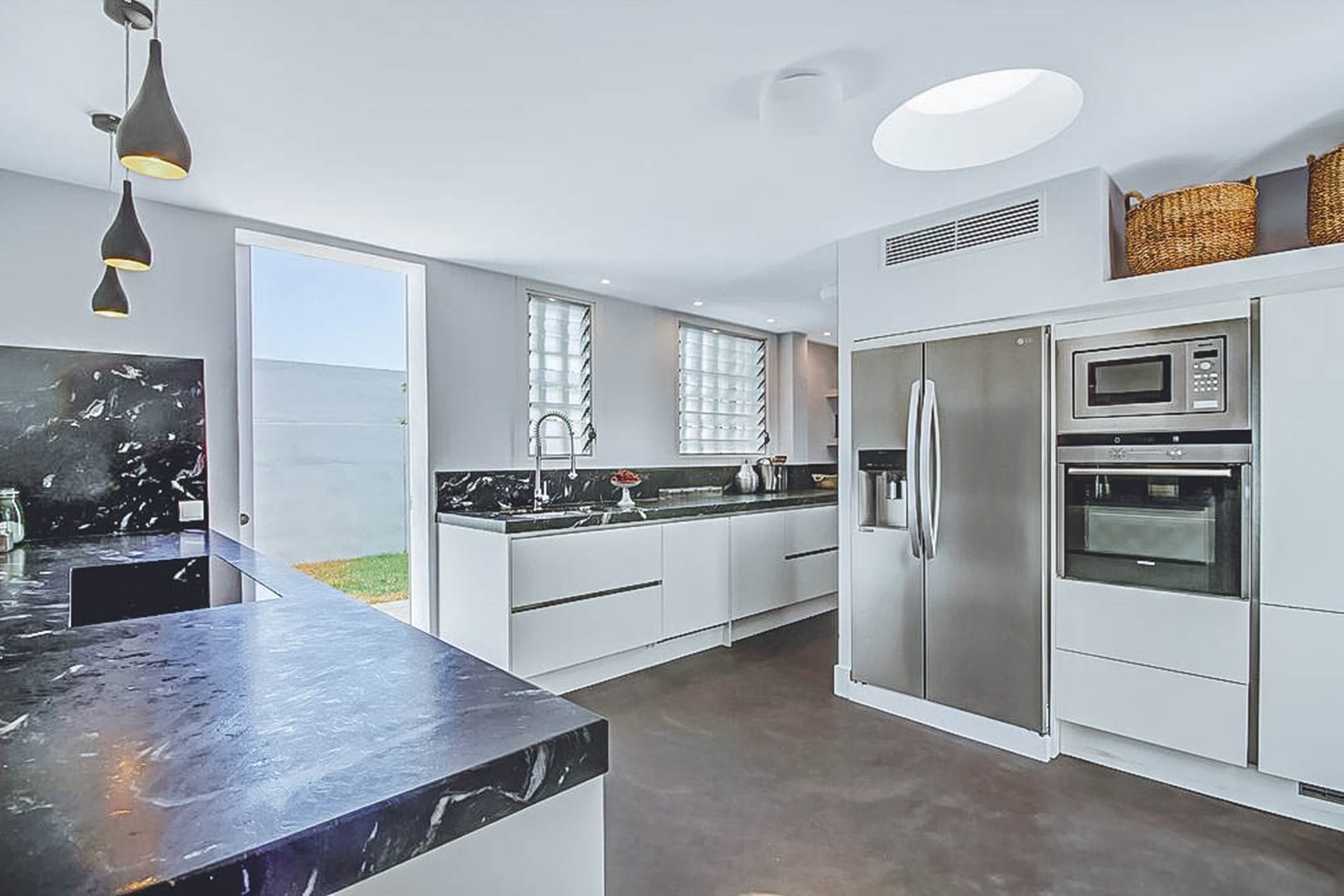 The bright, sophisticated interiors feature five spacious bedrooms with plush bedding, air conditioning, and sleek en-suite bathrooms. The heart of the home is a state-of-the-art kitchen equipped with triple ovens, dual Miele dishwashers, dual fridge-freezers, and a Nespresso machine.