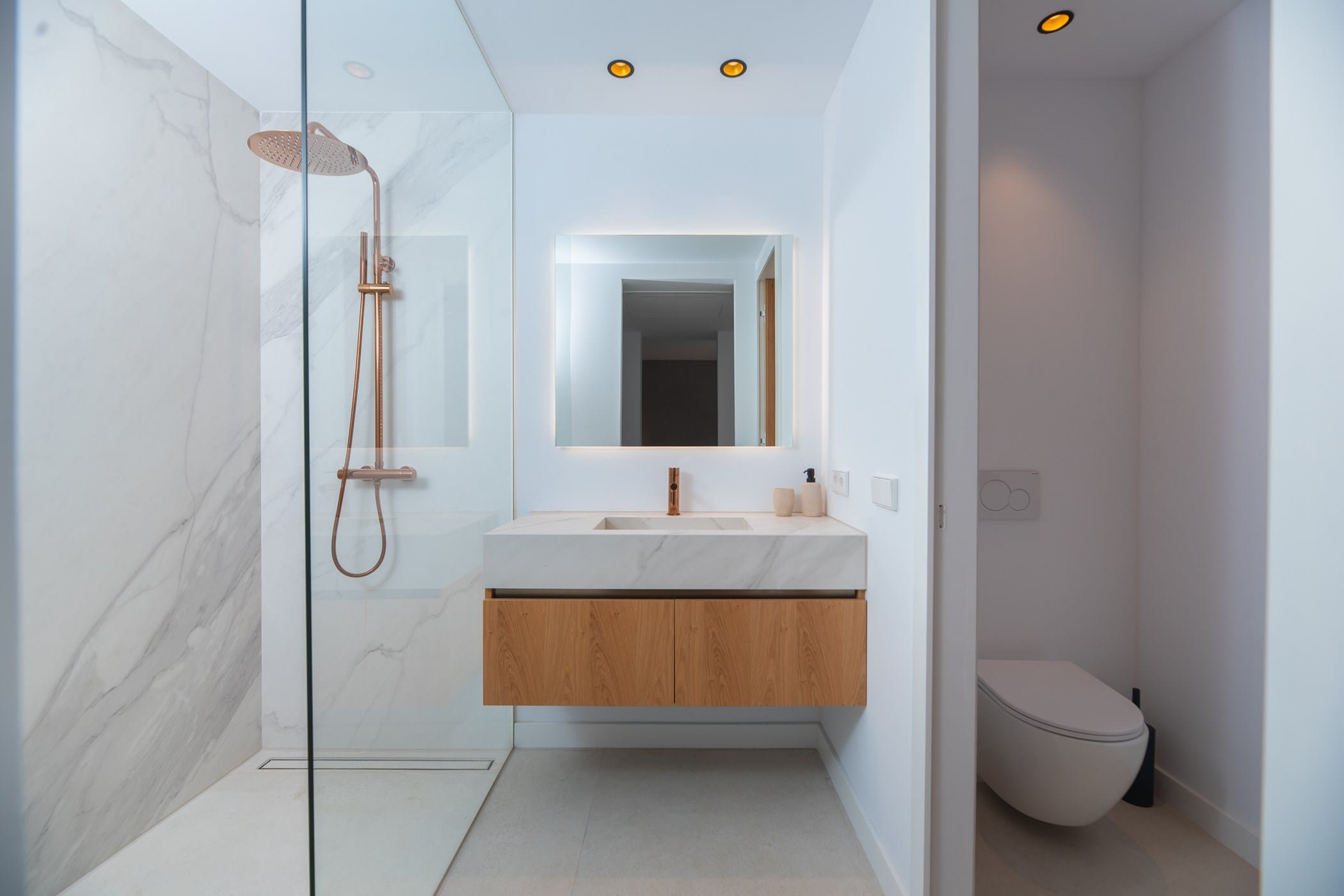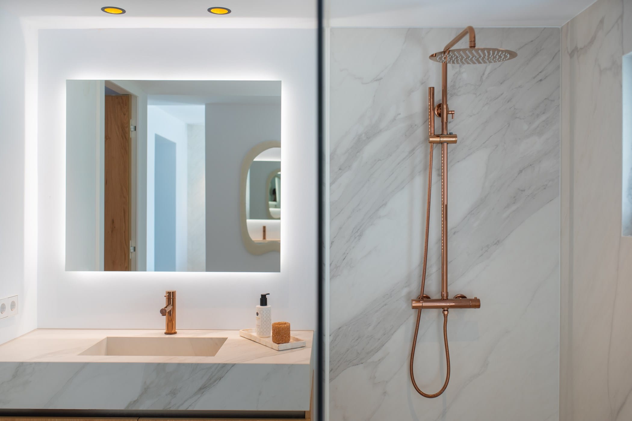 The bright open-plan living and dining areas flow into a sleek, fully equipped kitchen with a marble bar. All bedrooms feature en-suite bathrooms with marble finishes, walk-in showers, and gold accents. The master suite includes a freestanding bathtub and serene countryside views.