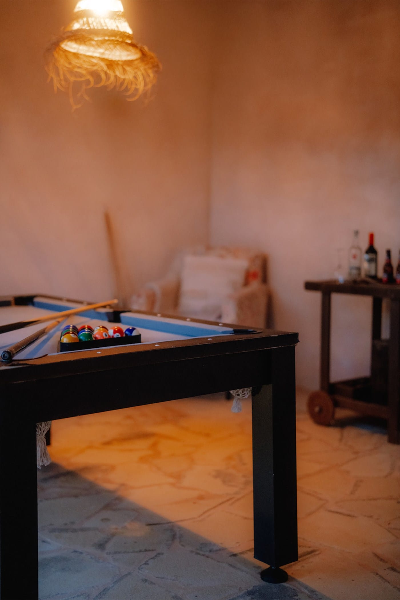 Outside, enjoy a private swimming pool, multiple terraces and balconies, Mediterranean gardens, outdoor kitchen with BBQ, shaded dining areas, hammocks, and lounge spaces. Additional amenities include a private gym, pool table, board games, and snorkelling equipment. The villa is equipped with air conditioning, heating, Wi-Fi, and full laundry facilities.