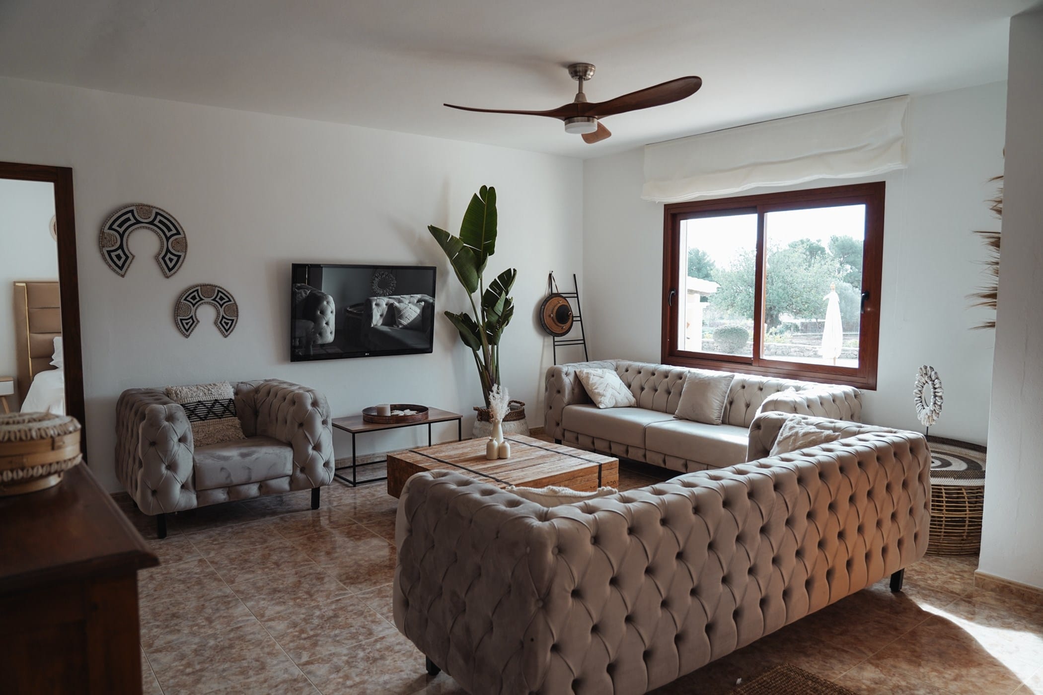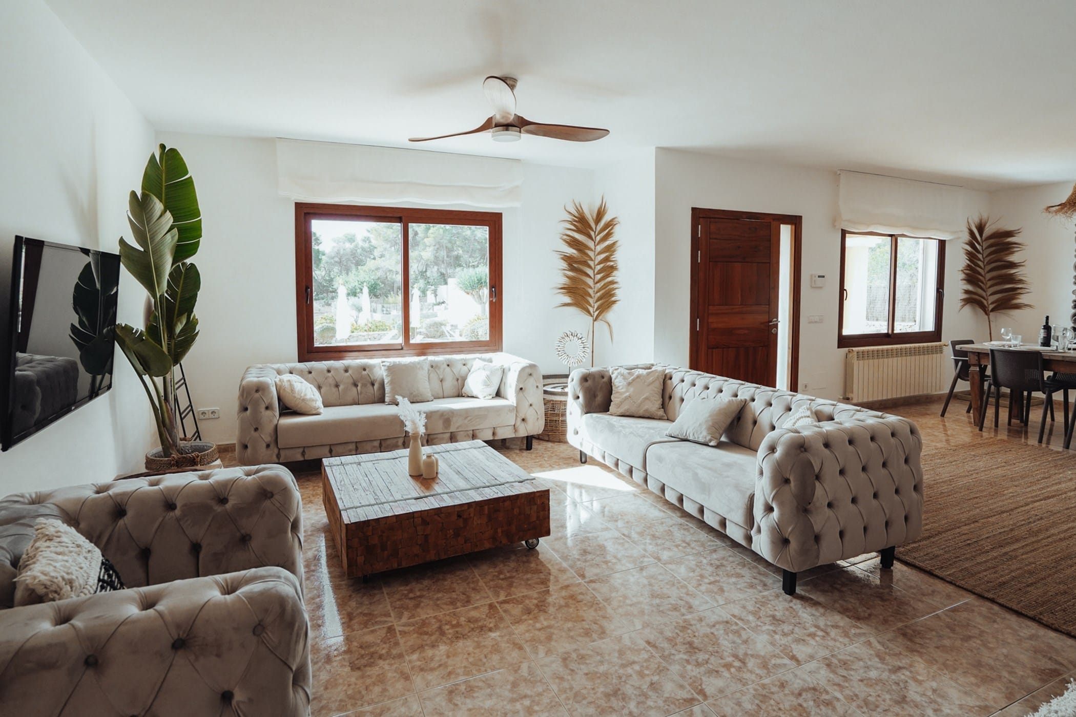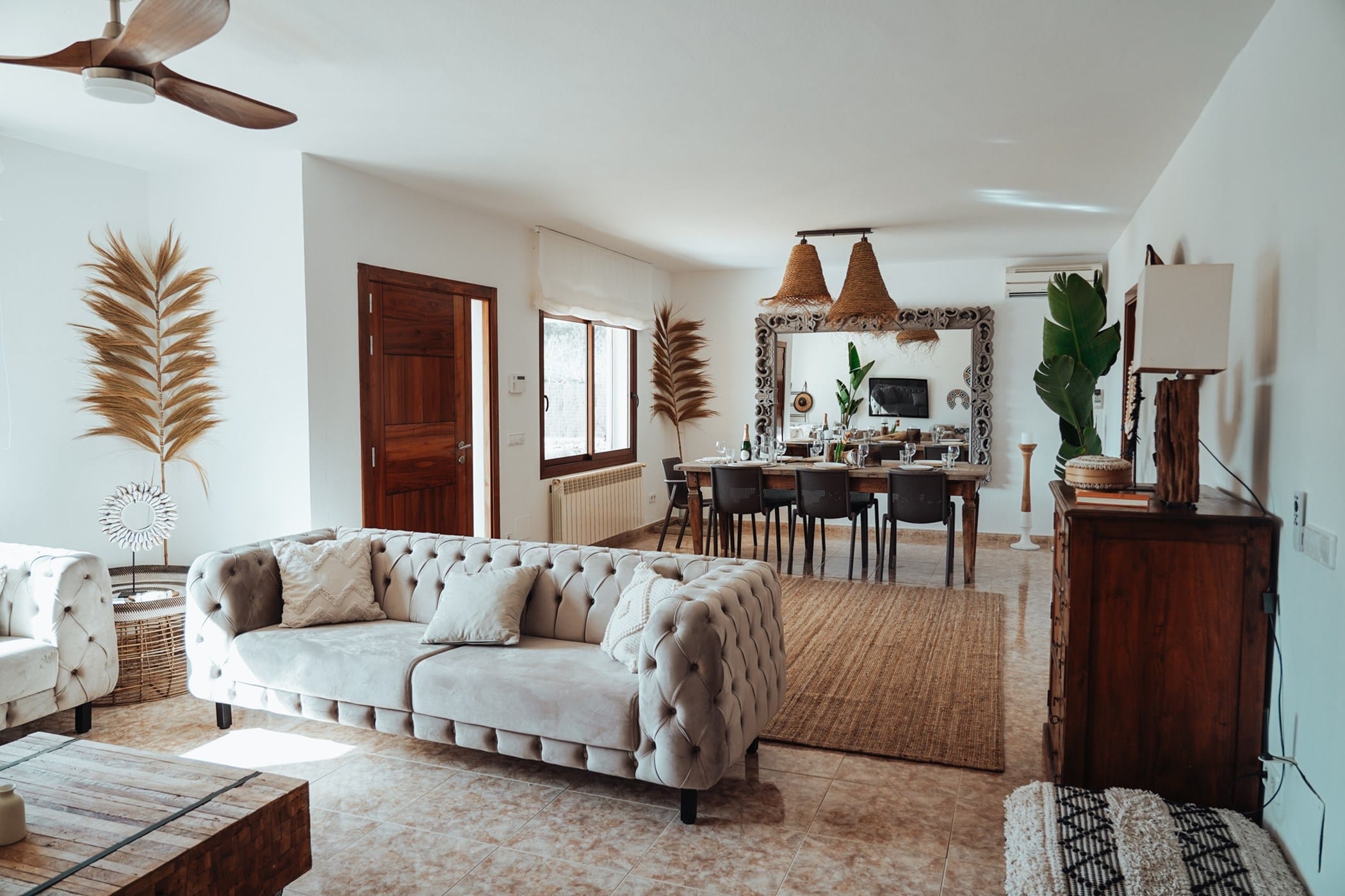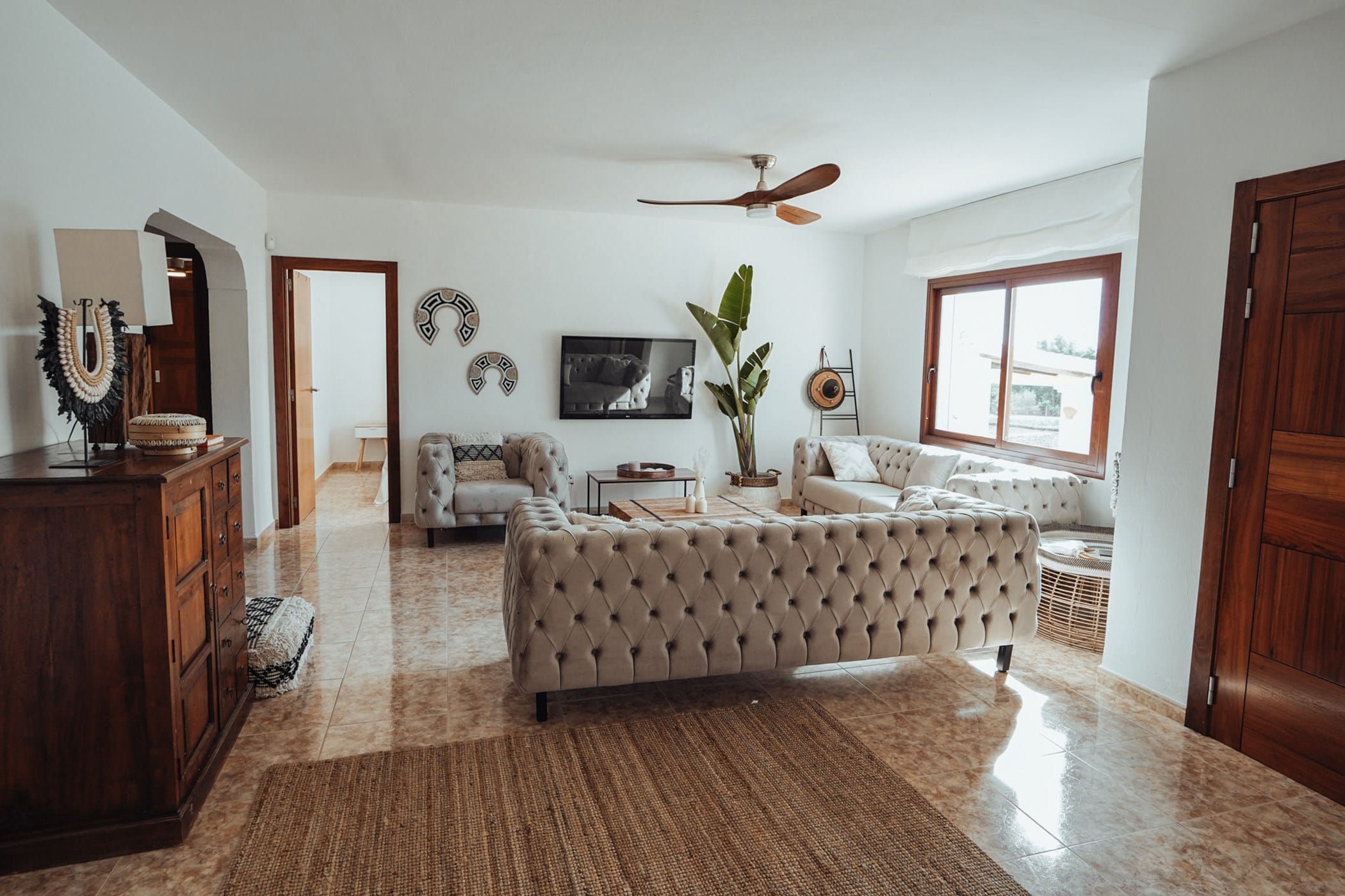 This elegant 5-bedroom villa is nestled in the peaceful countryside of Sant Carlos, offering a perfect blend of Mediterranean charm and modern comfort. Surrounded by orange trees and lush gardens, it provides a tranquil rural setting while remaining within easy reach of northeast coast beaches and the famous Las Dalias Hippy Market.