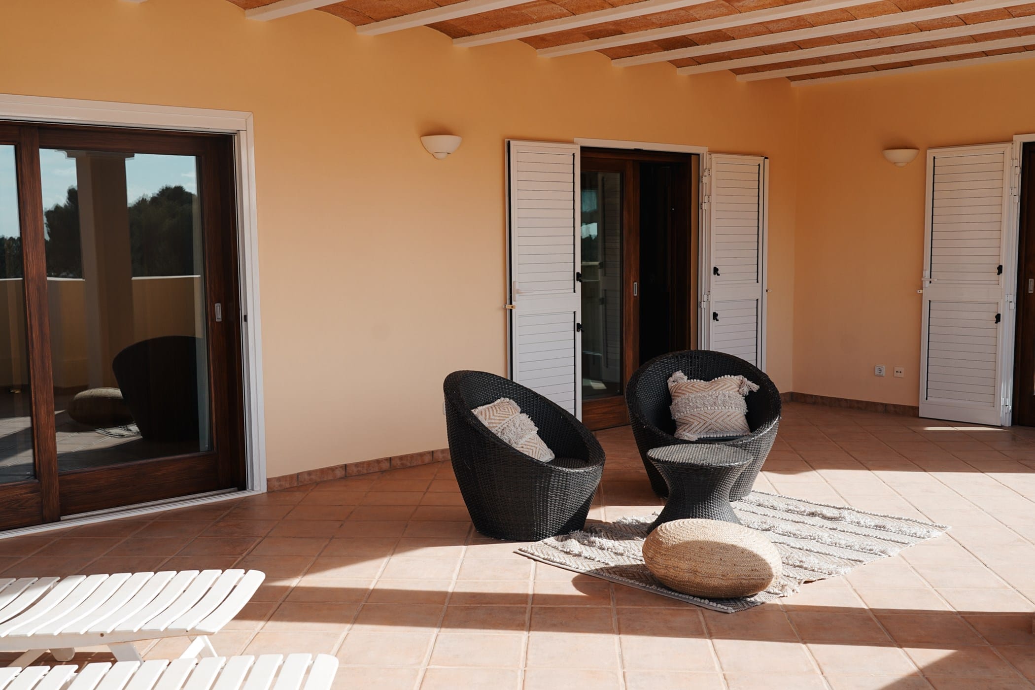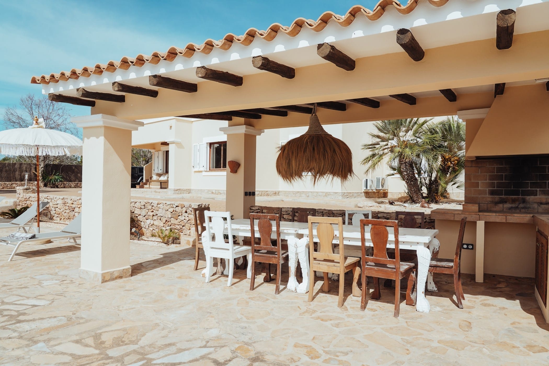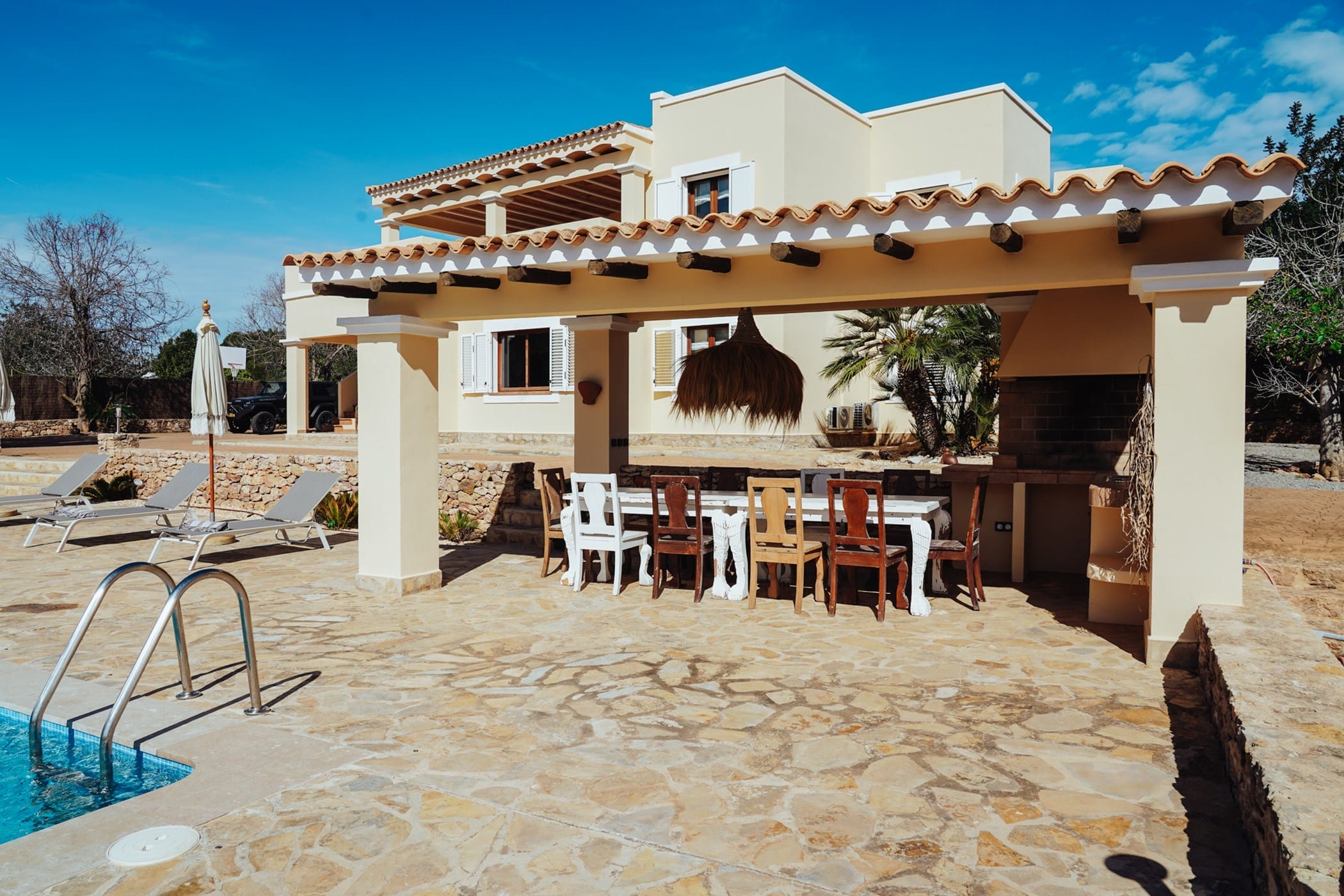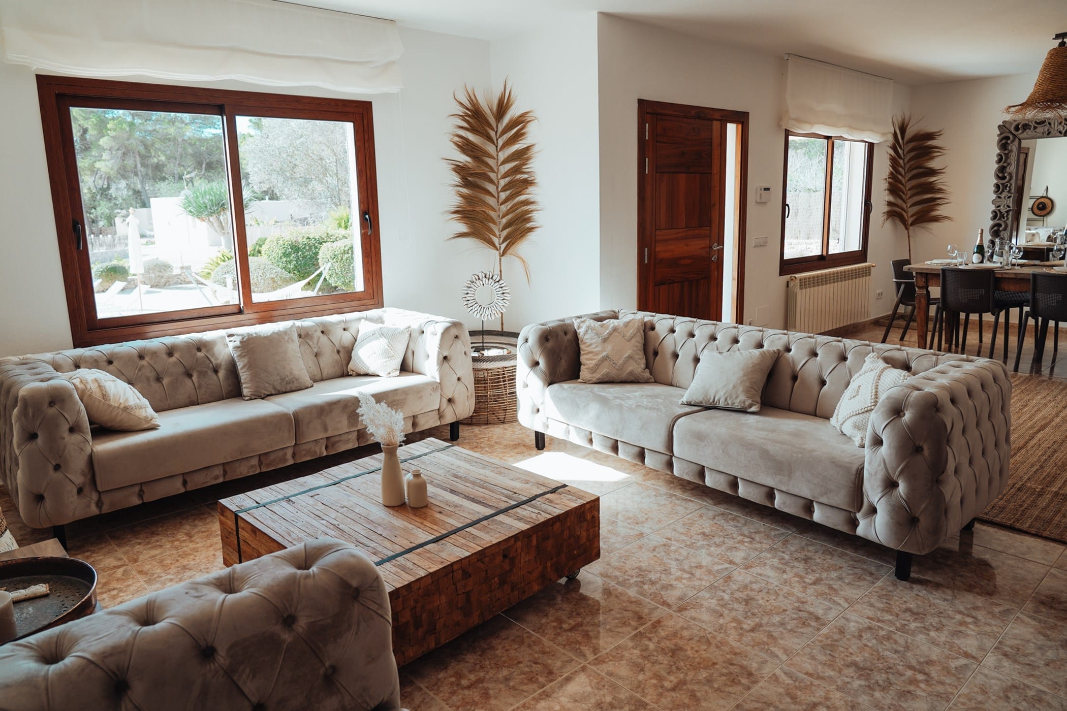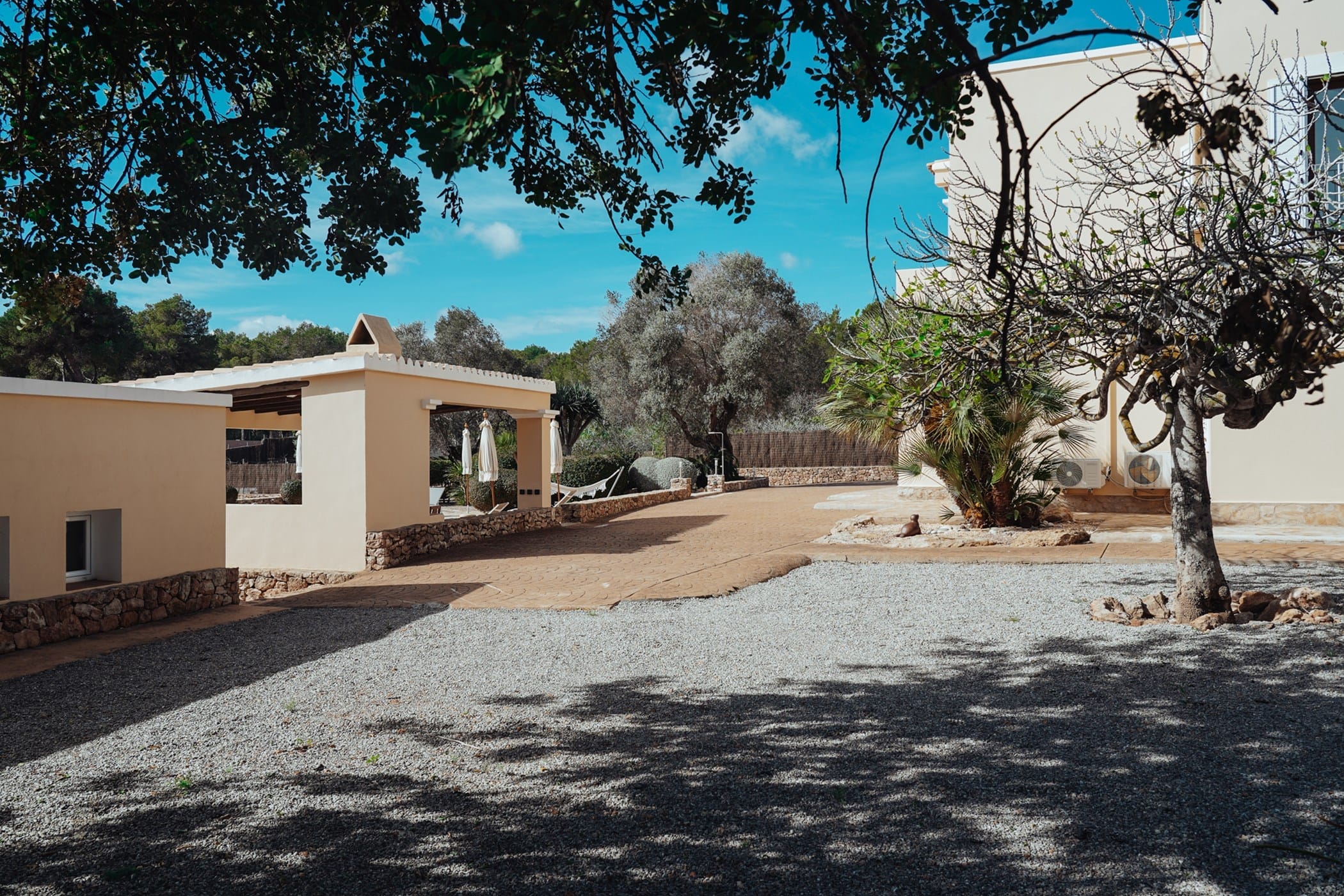 This elegant 5-bedroom villa is nestled in the peaceful countryside of Sant Carlos, offering a perfect blend of Mediterranean charm and modern comfort. Surrounded by orange trees and lush gardens, it provides a tranquil rural setting while remaining within easy reach of northeast coast beaches and the famous Las Dalias Hippy Market.