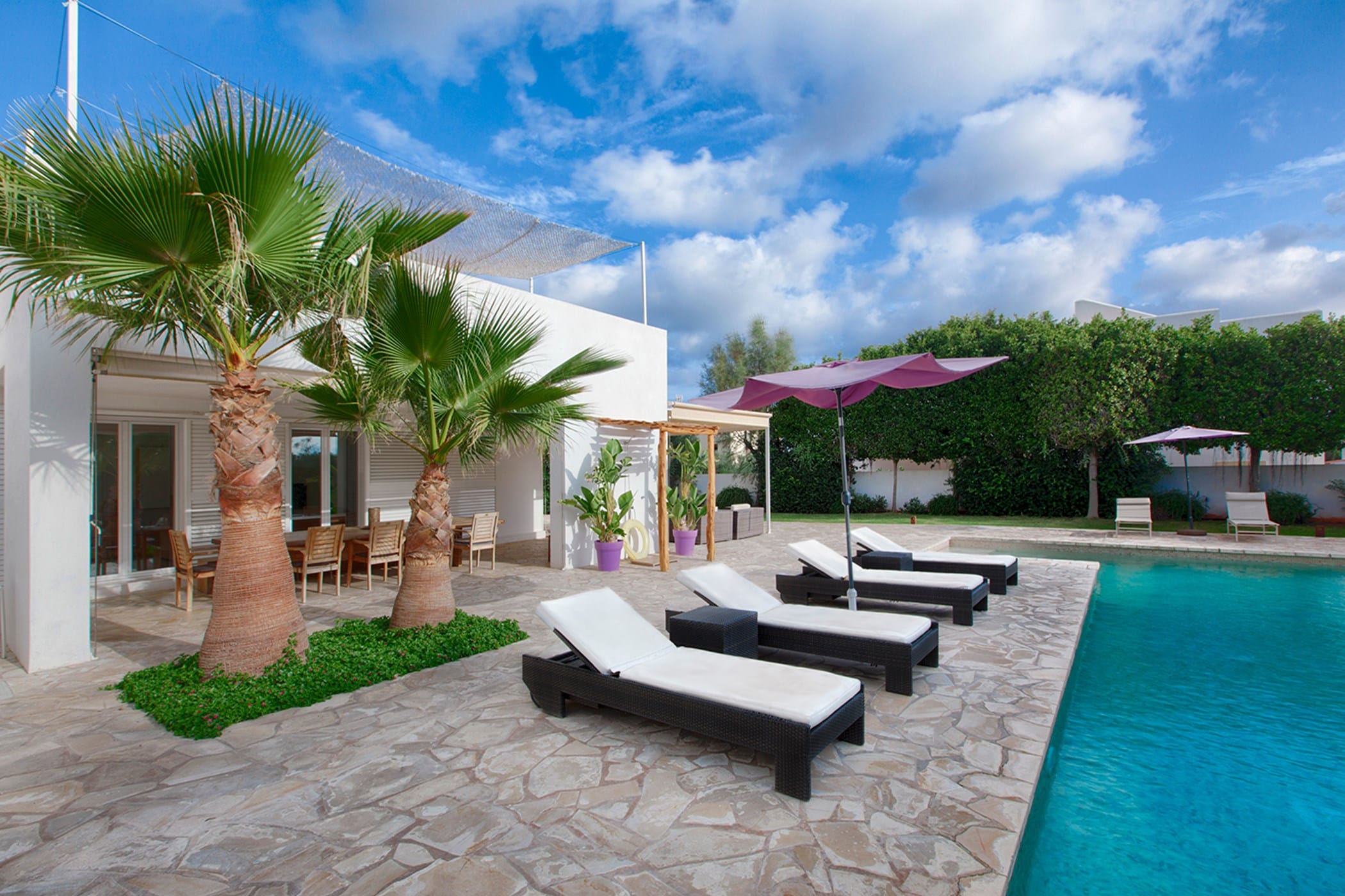 The private garden boasts a 12x6 metre swimming pool, sun loungers, and a portable barbecue, creating an inviting outdoor oasis.