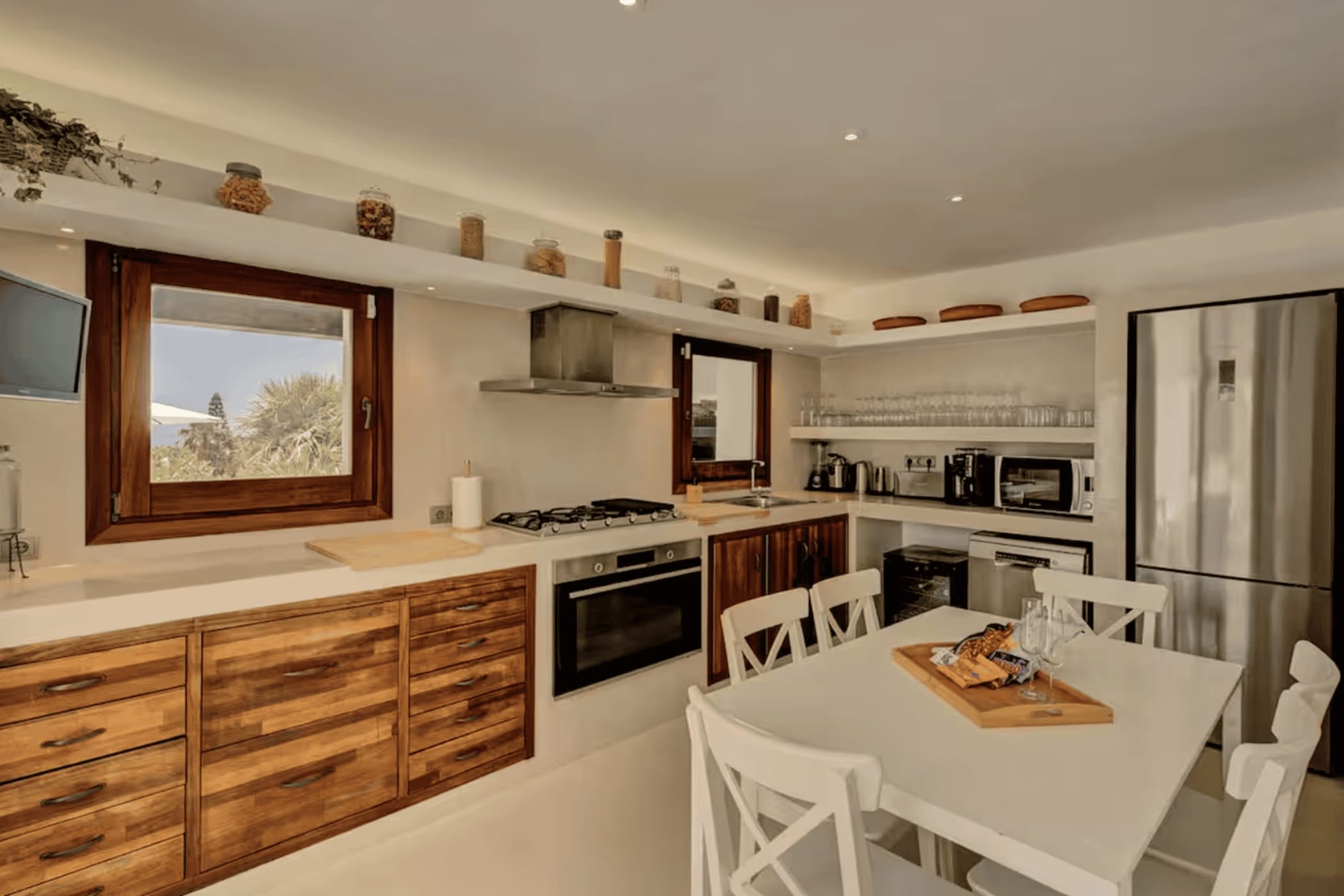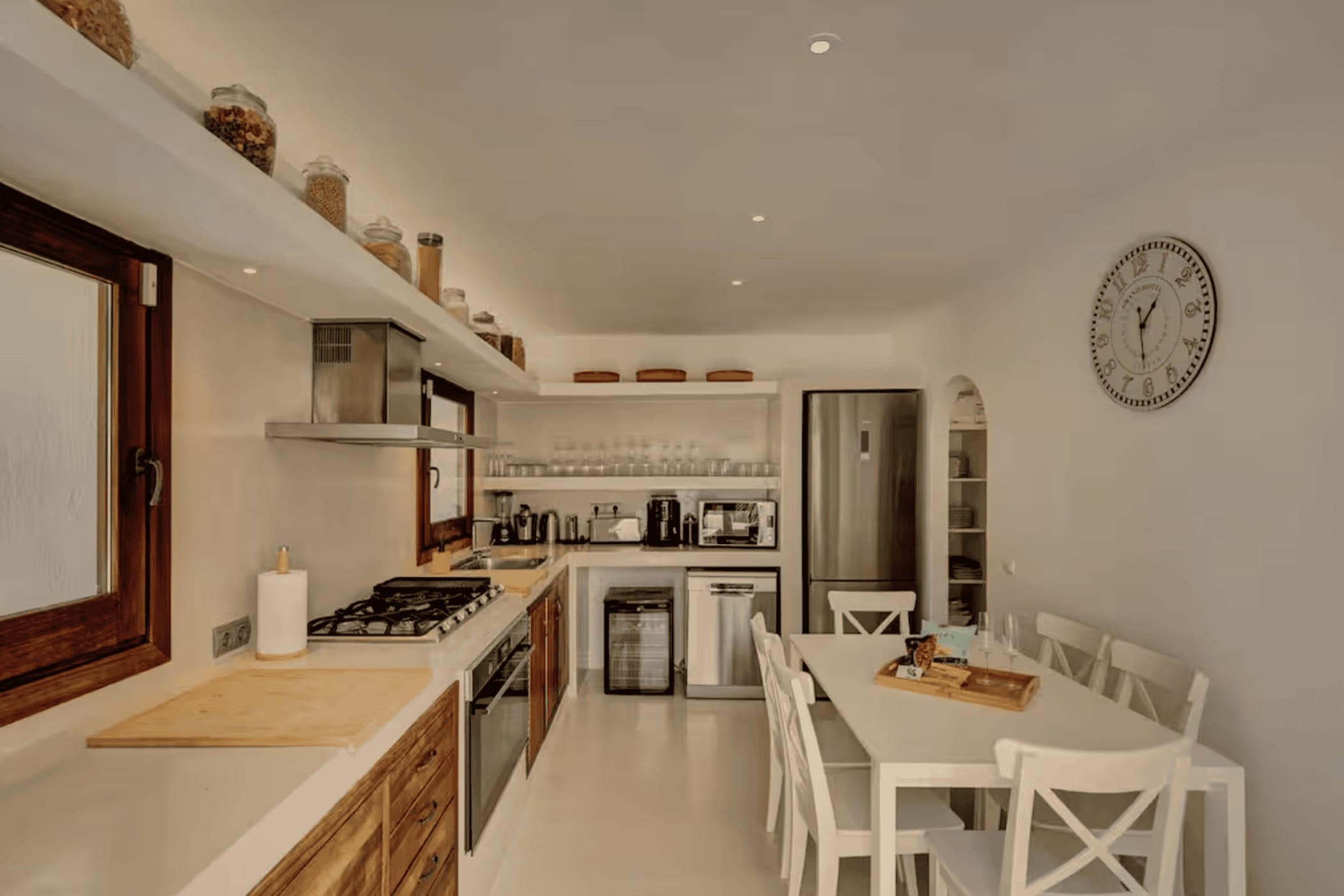 The clean contemporary interiors with subtle traditional touches create a relaxed, bright, and airy atmosphere. The functional layout includes five comfortable bedrooms and open living spaces with generous natural light. A fully equipped kitchen connects seamlessly to the dining and lounge areas, making it ideal for extended family or group stays.