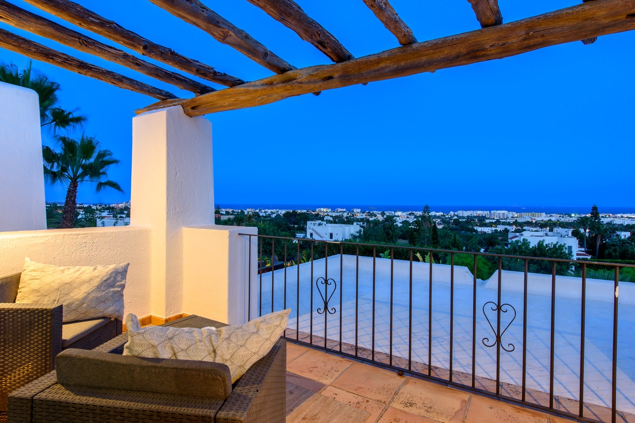 Outdoor areas are designed for easy enjoyment of the Mediterranean climate, with large covered porches for shaded dining and relaxation, a central swimming pool, and various terraces offering pleasant open views over the landscape and toward the distant sea.