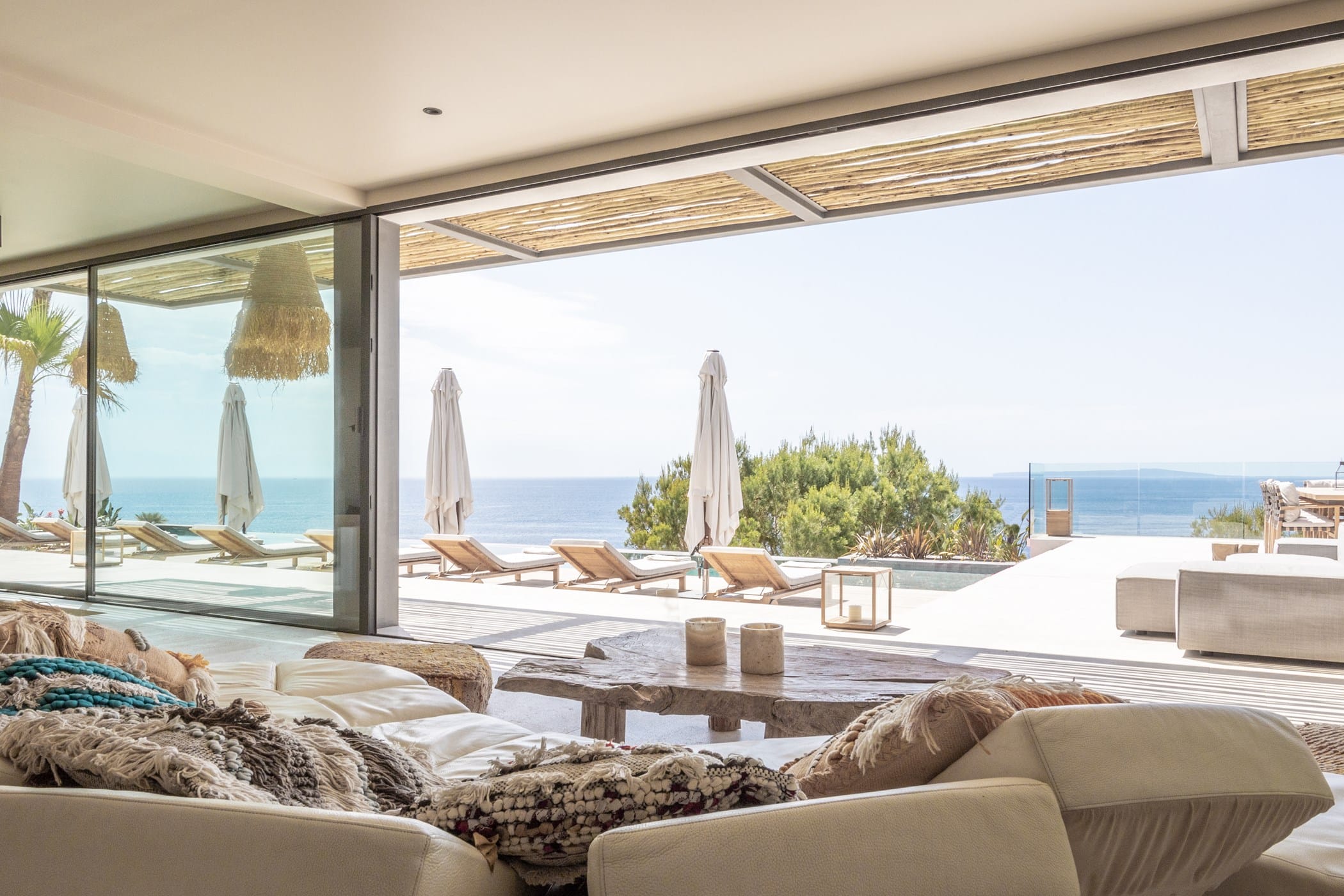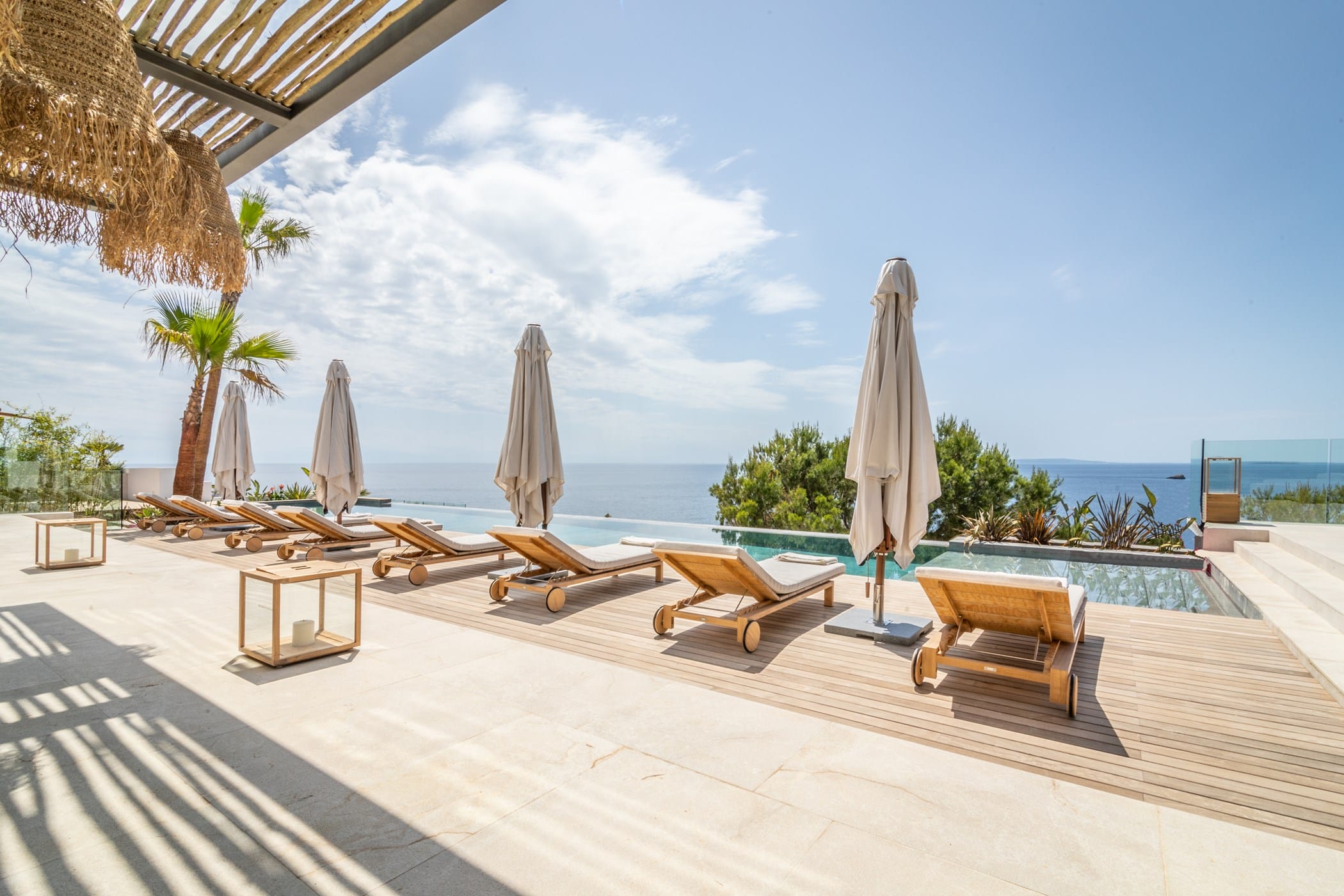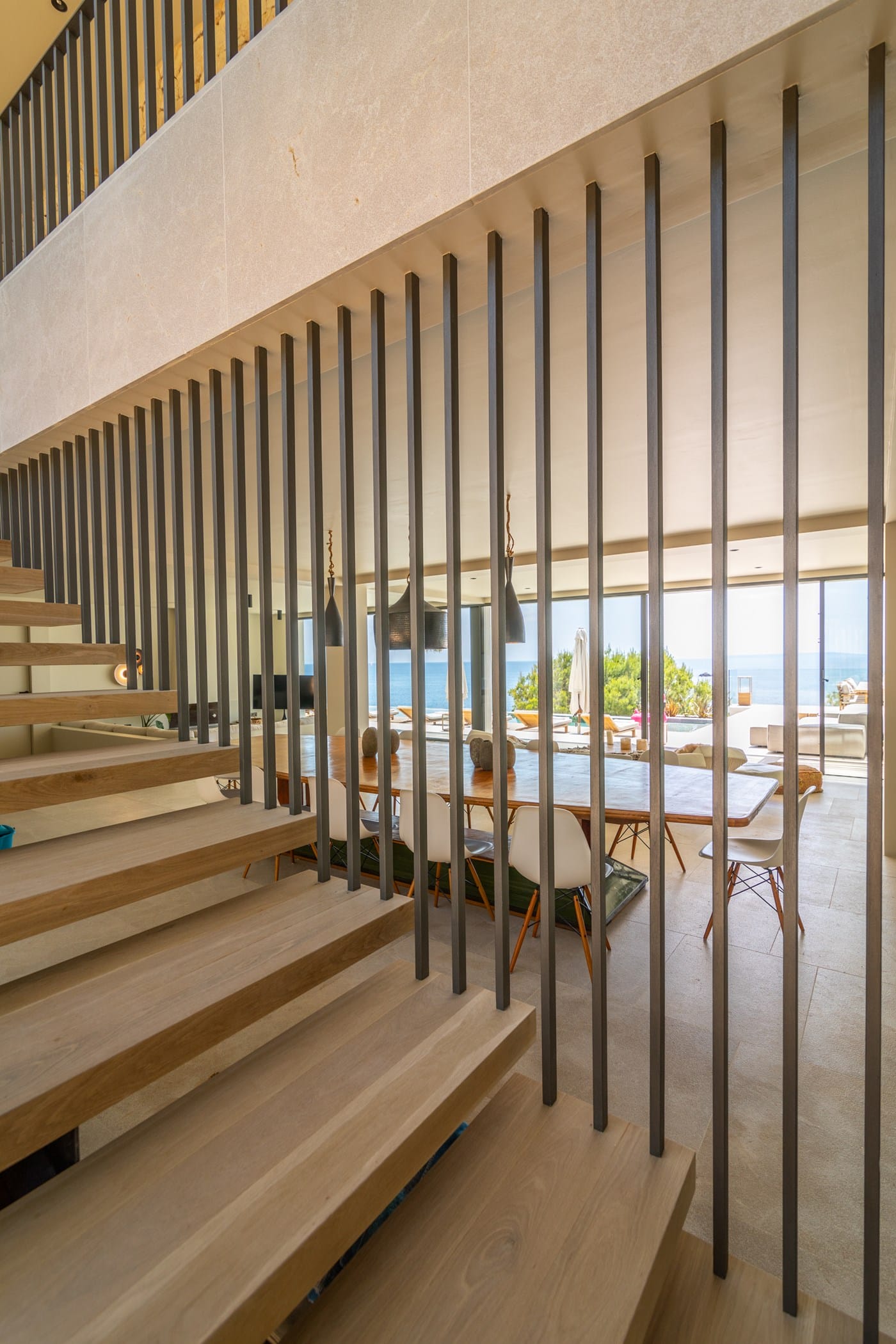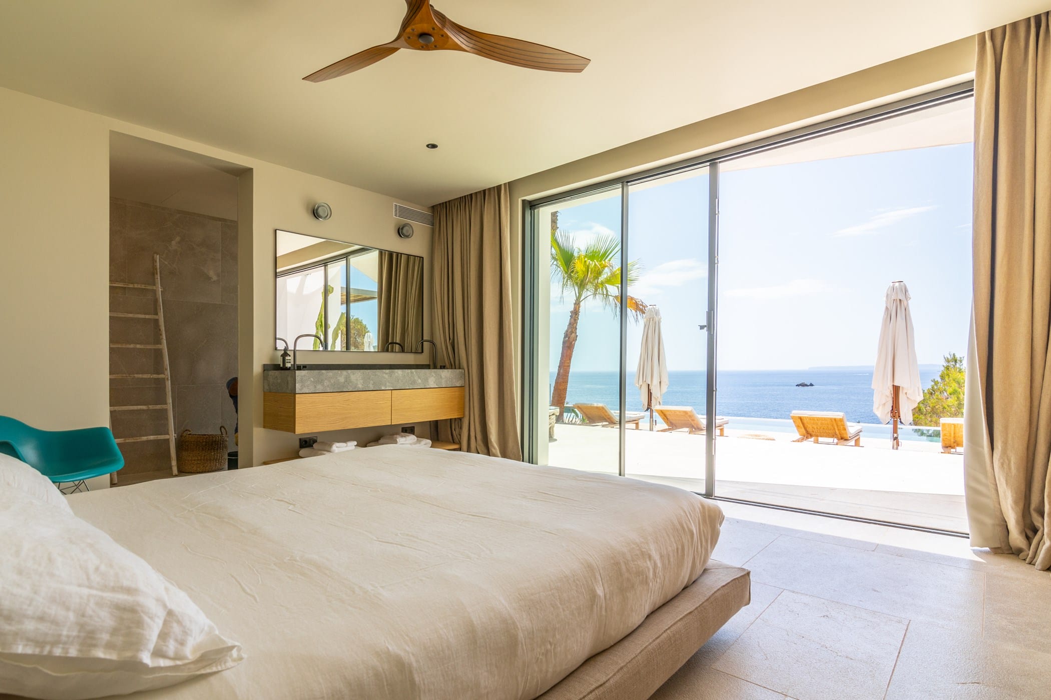 All six double bedrooms feature en-suite bathrooms and stunning sea views. The villa blends contemporary beach-house style with natural materials and high-end finishes.