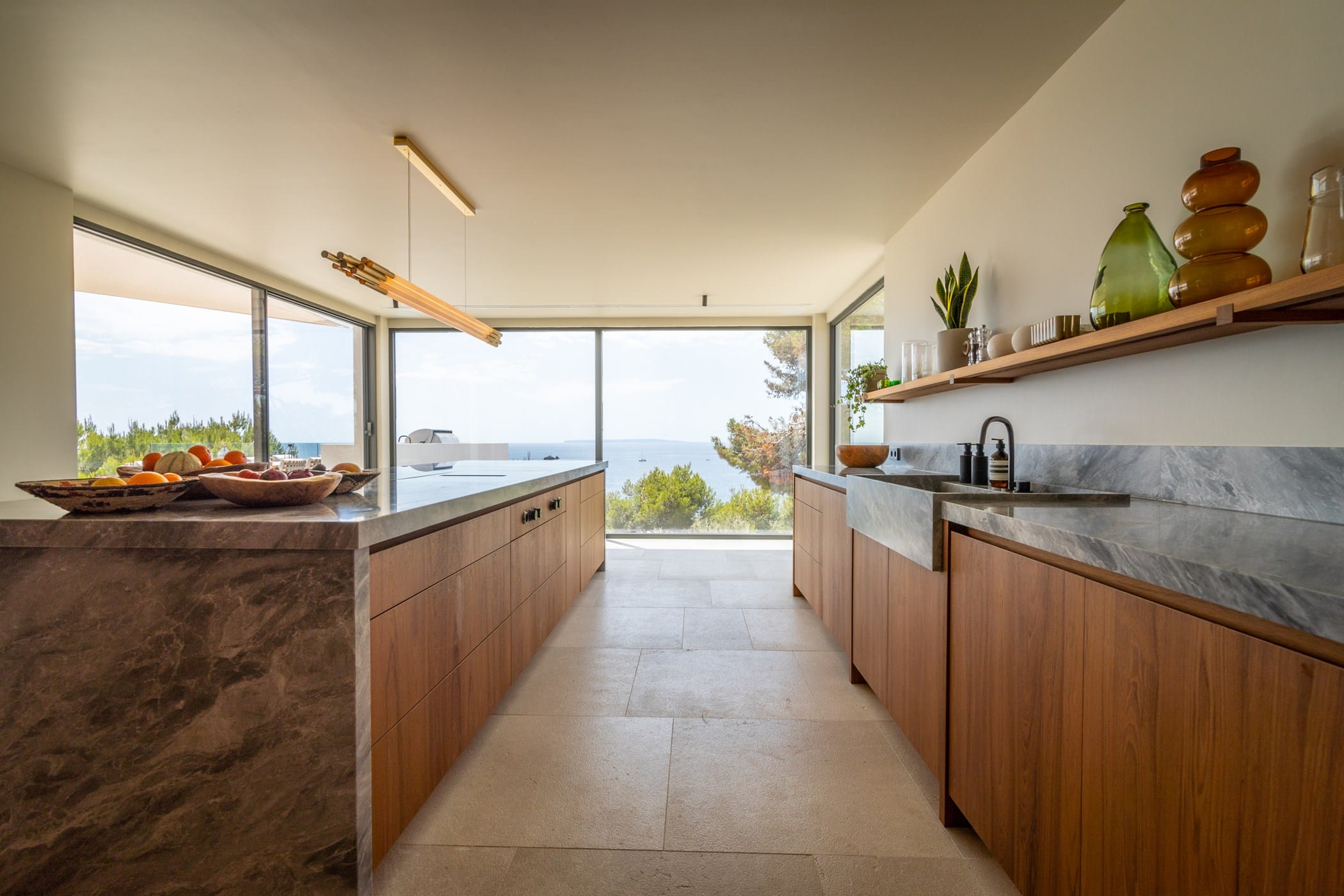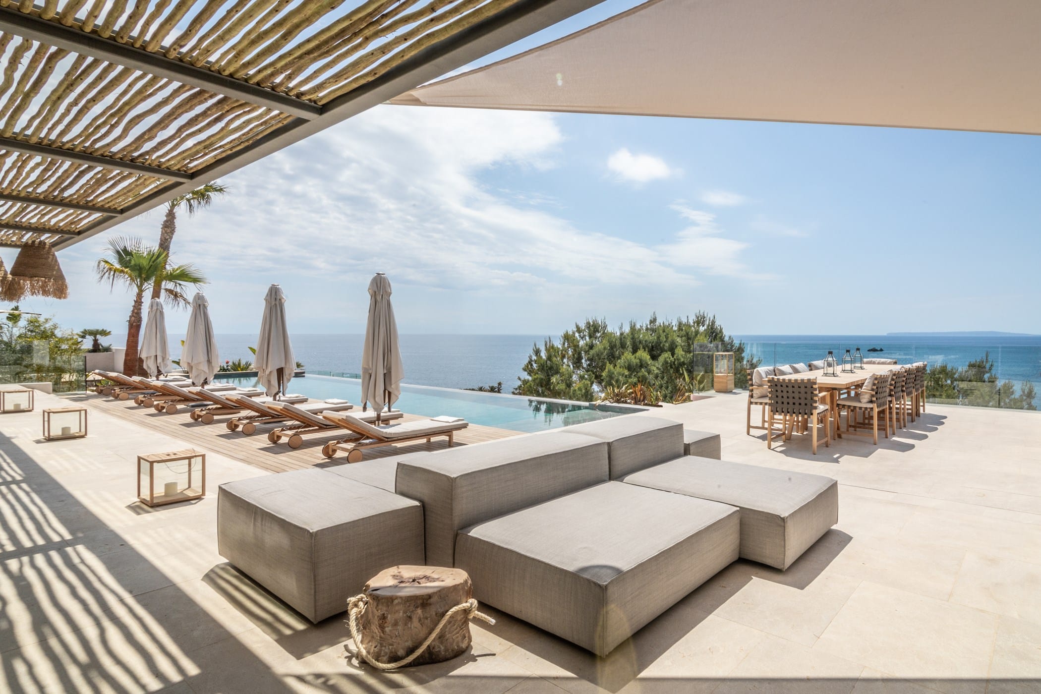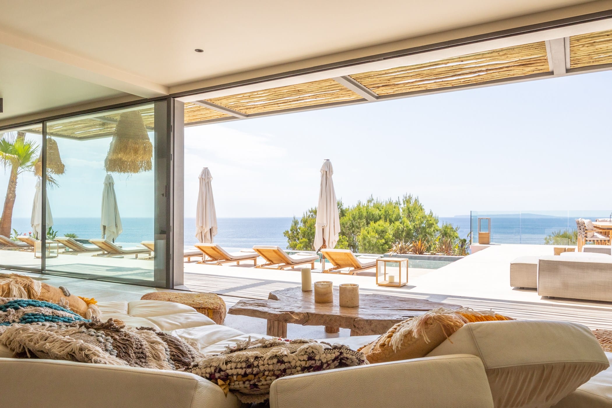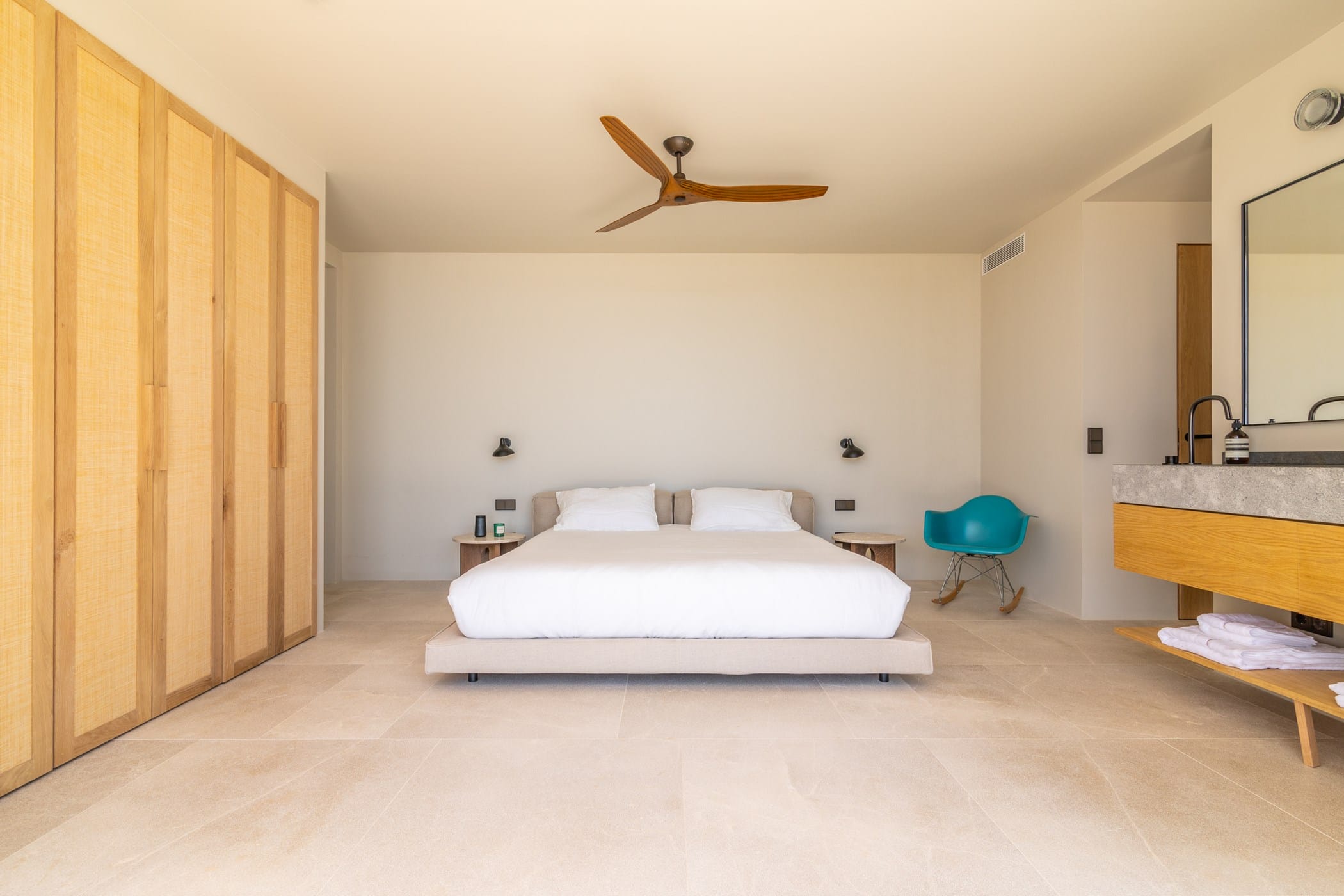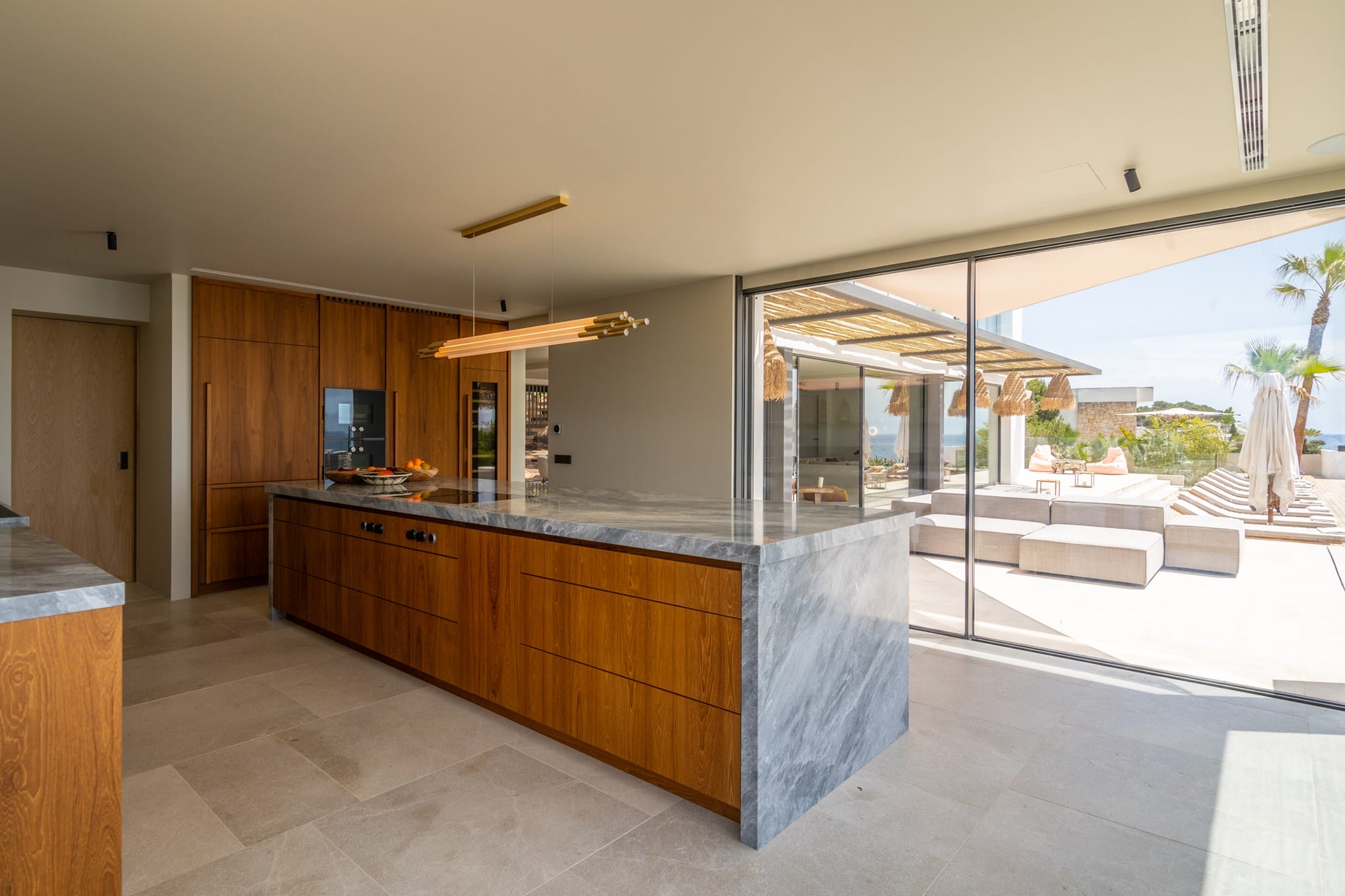 All six double bedrooms feature en-suite bathrooms and stunning sea views. The villa blends contemporary beach-house style with natural materials and high-end finishes.
