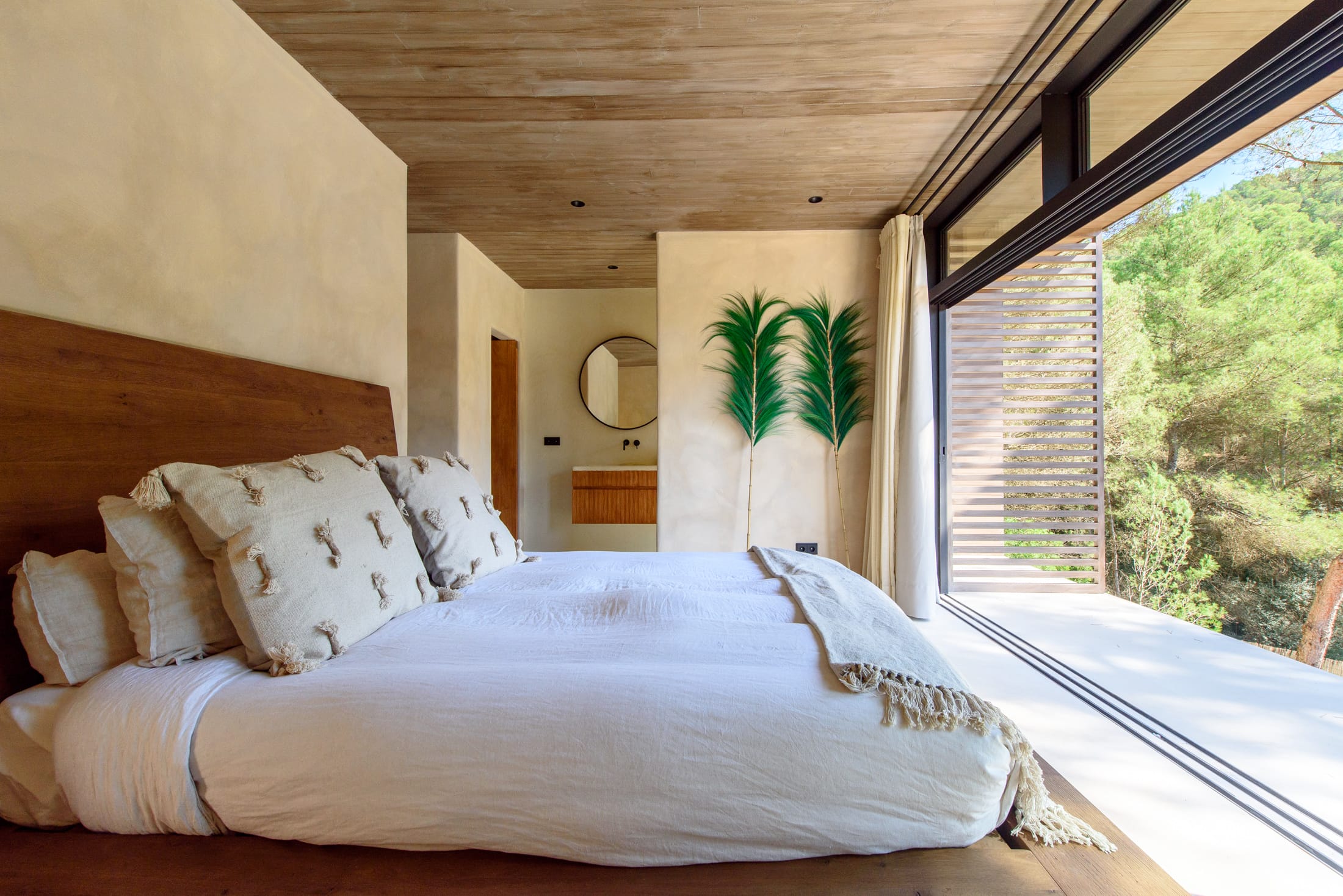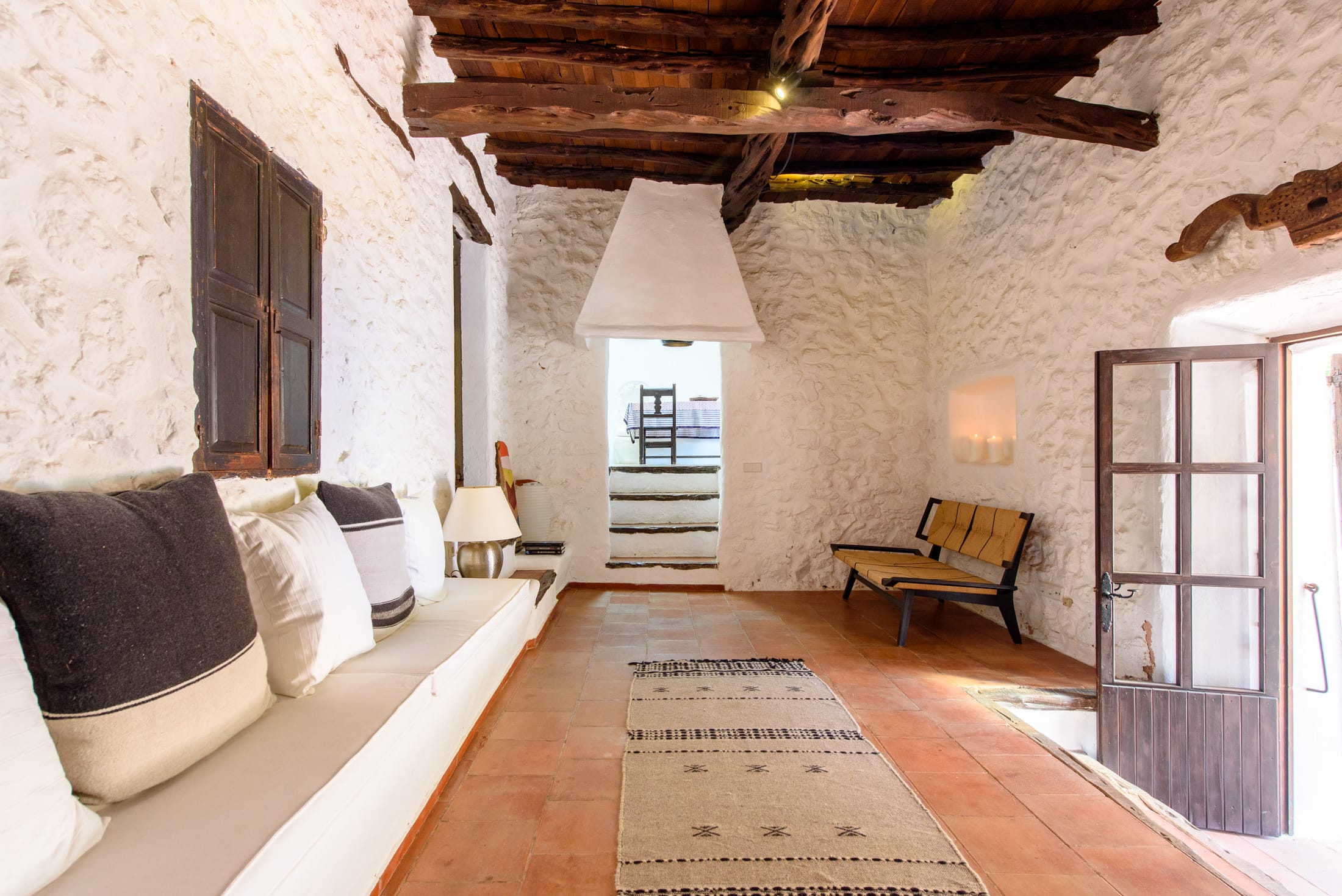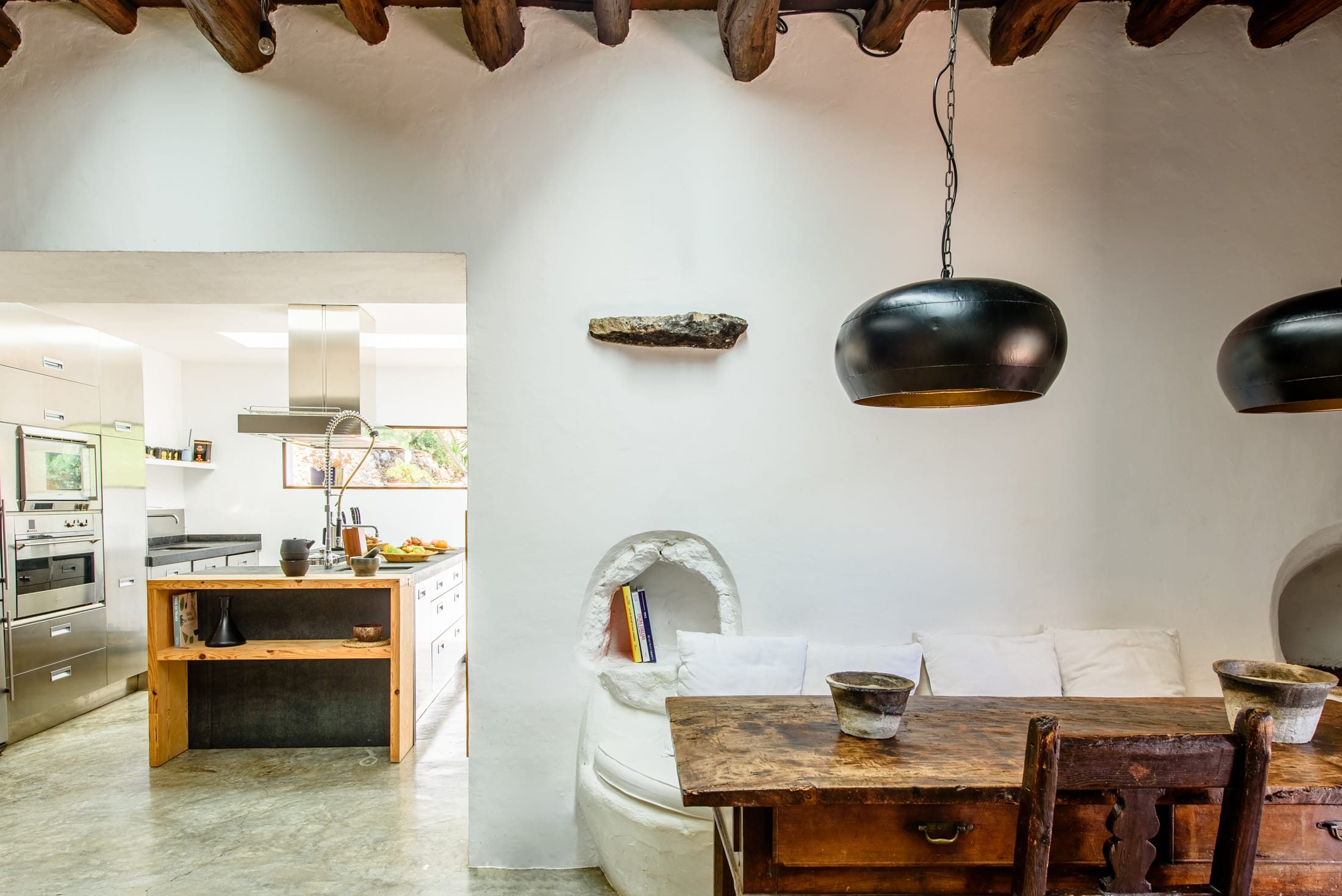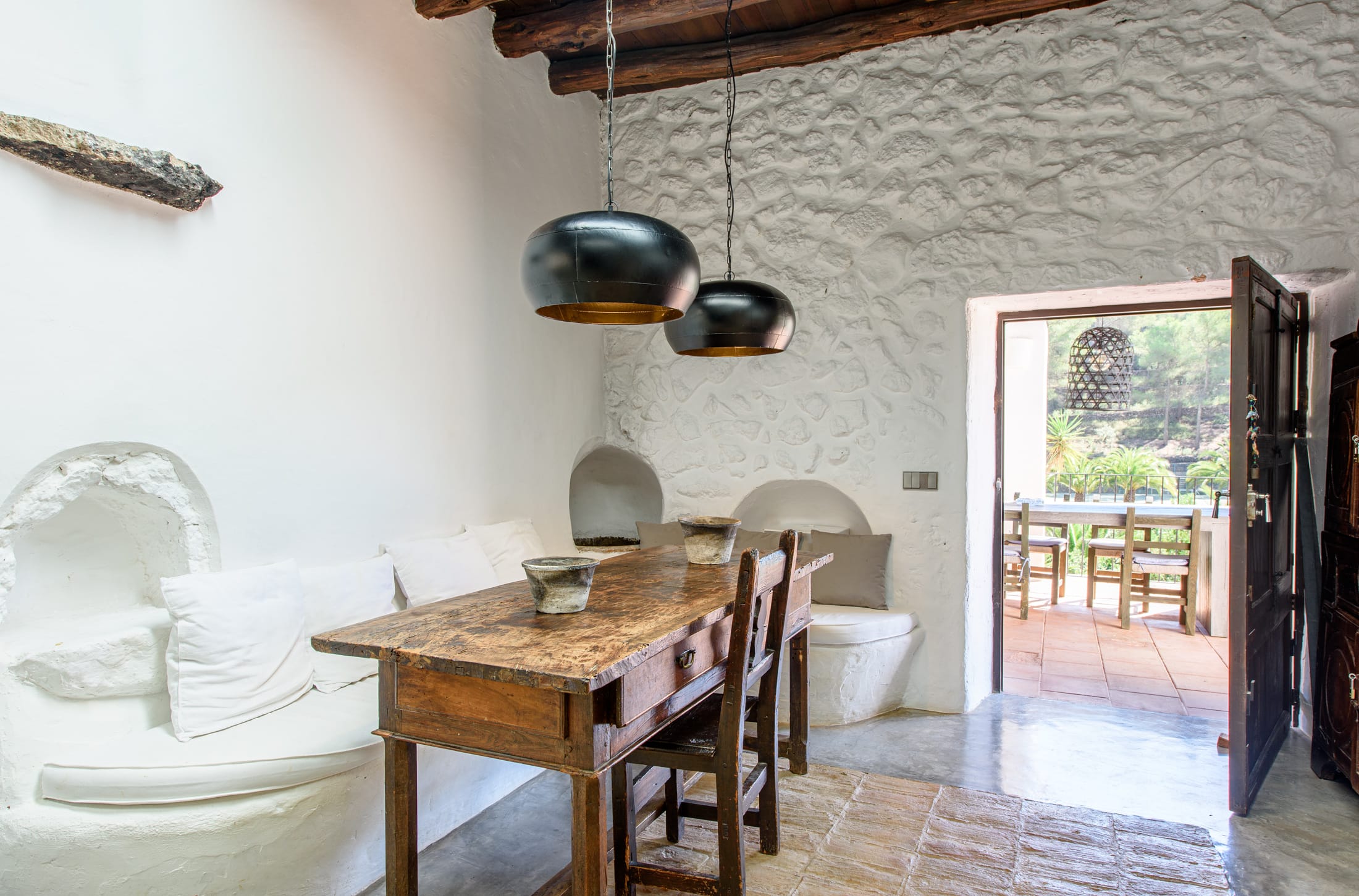 It beautifully combines traditional stone masonry, wooden beams, and whitewashed walls with minimalist interiors, neutral tones, and authentic Ibizan touches. The bright open-plan living area includes a comfortable lounge, a stunning fully equipped modern kitchen, and an impressive dining space with sweeping countryside and garden views.