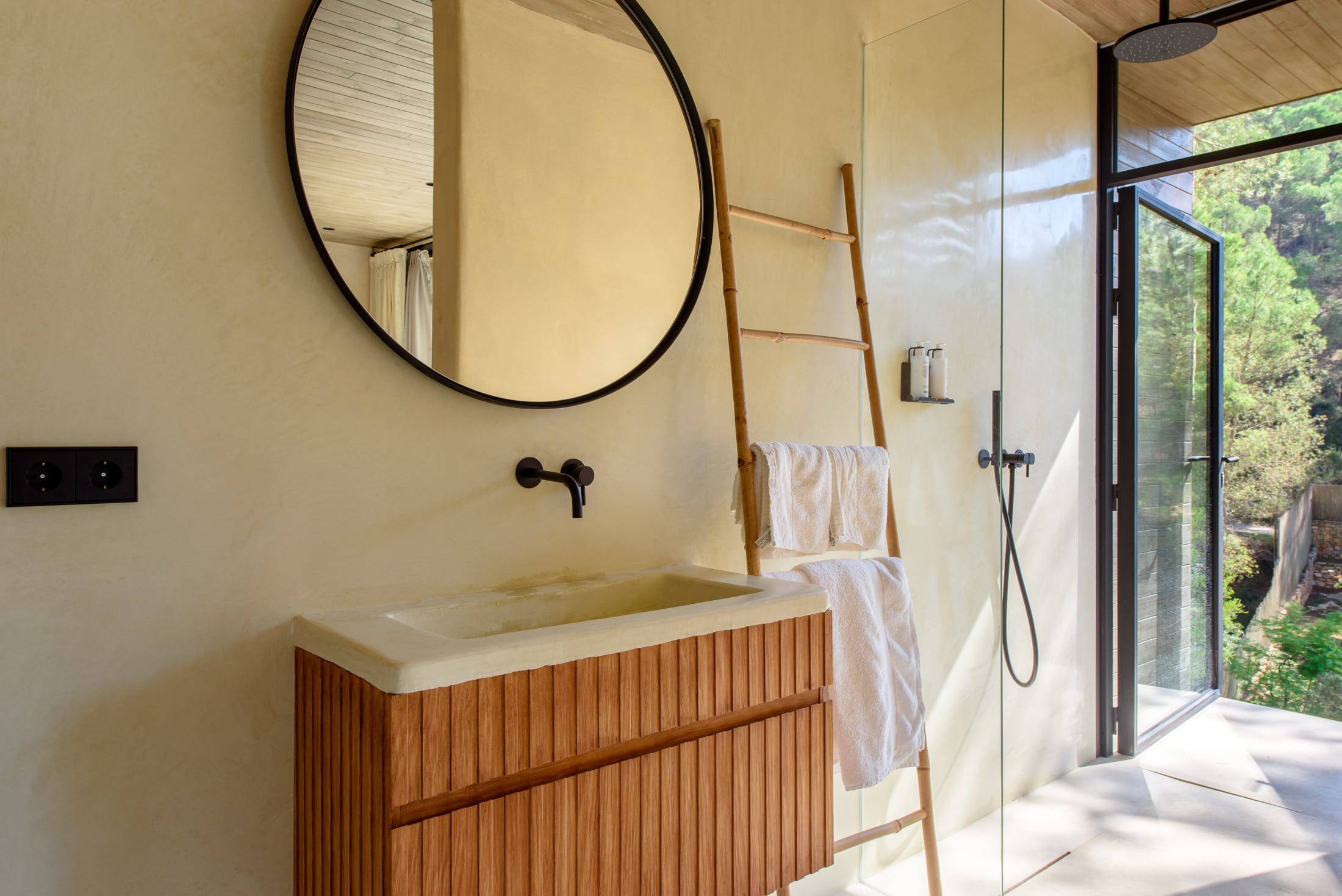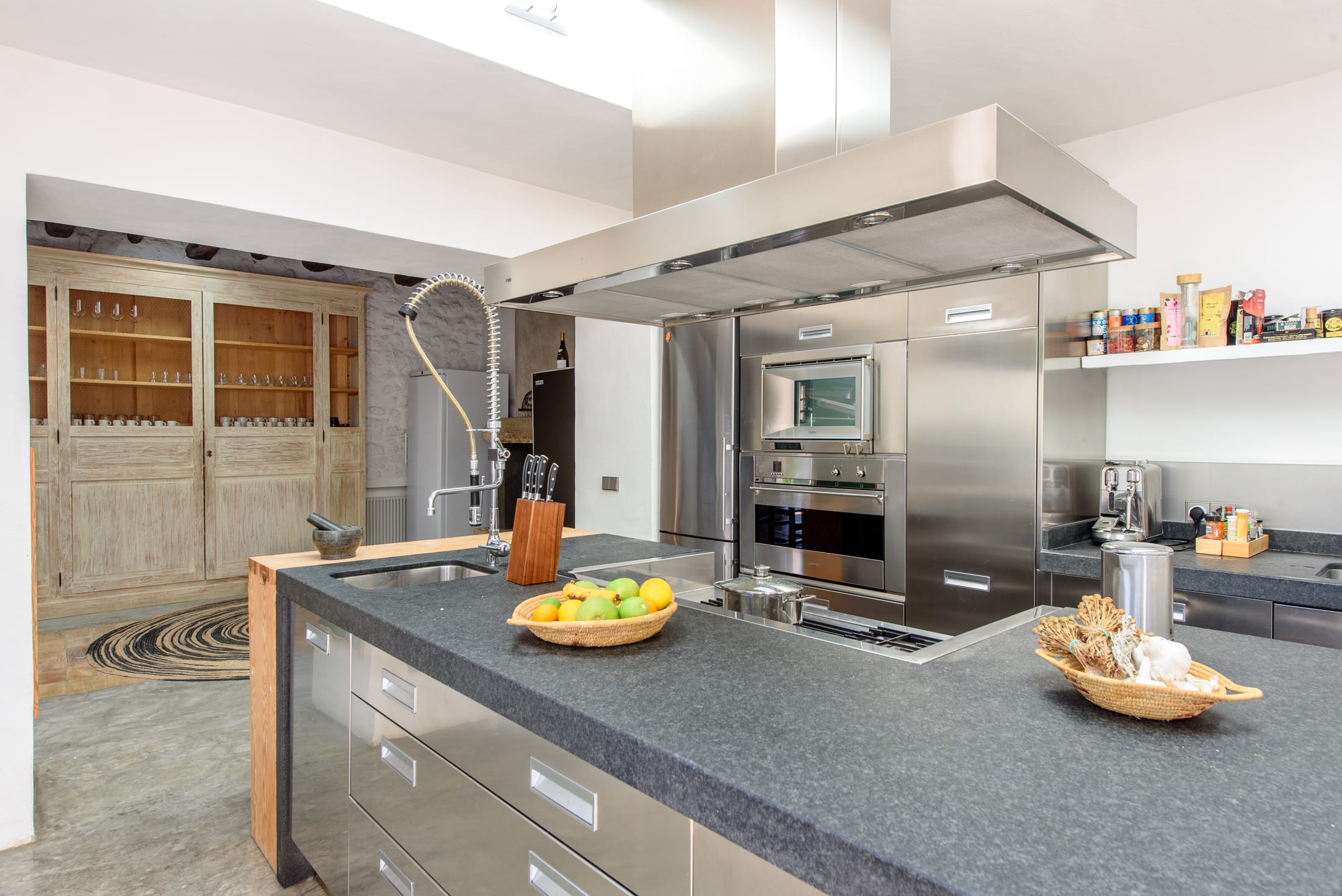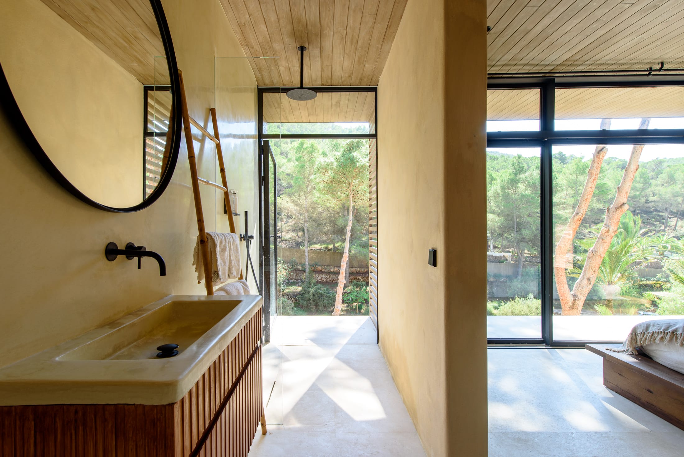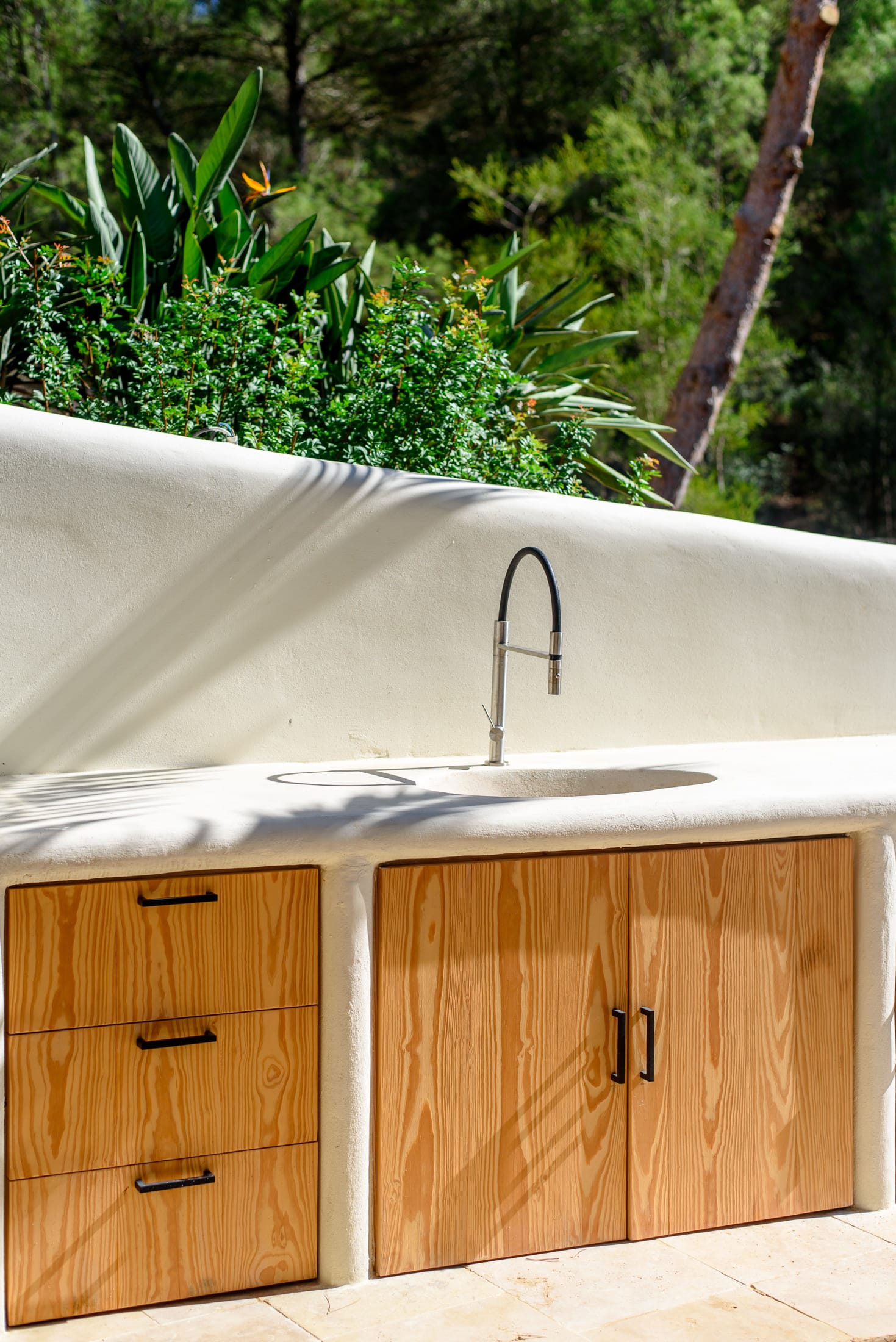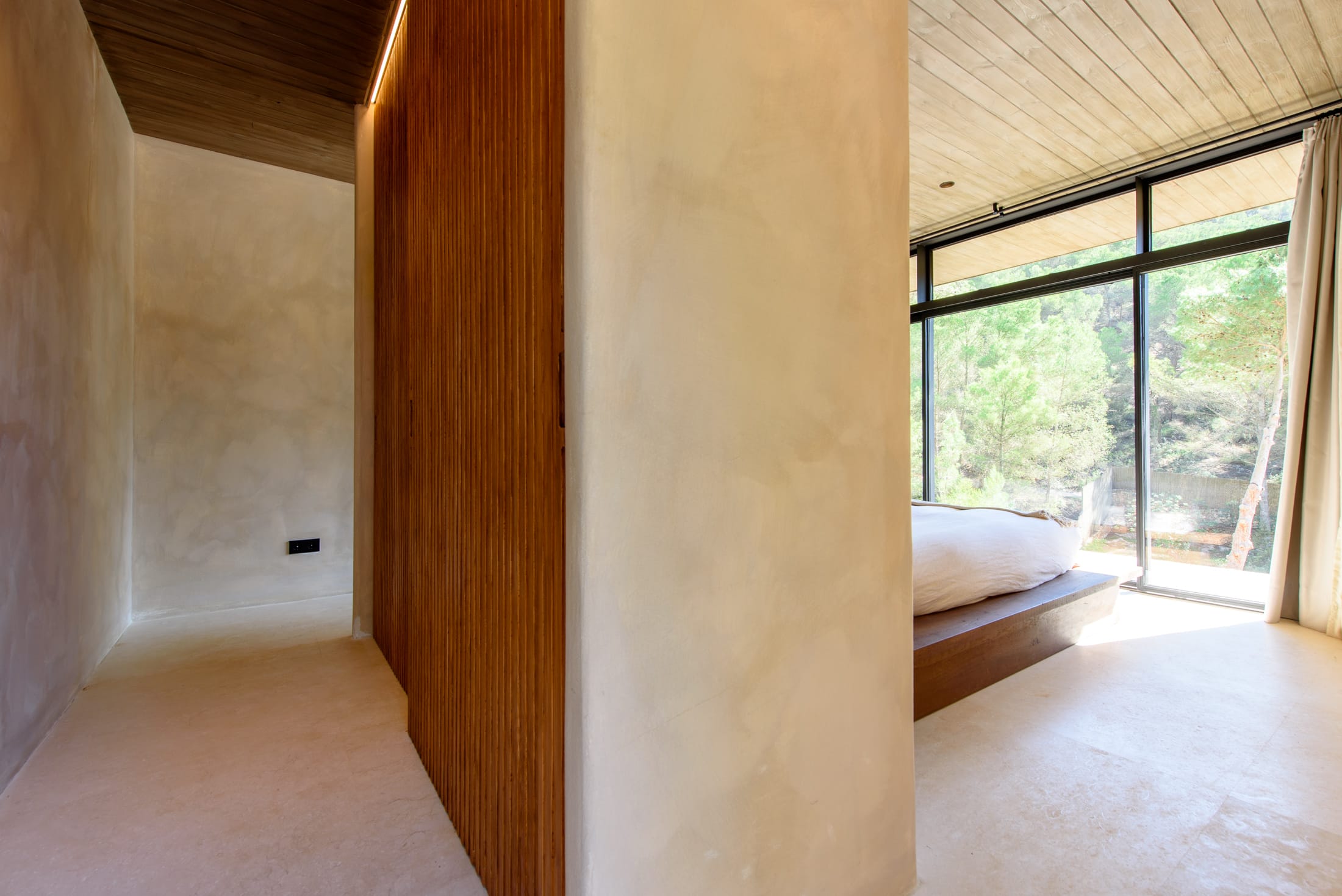 It beautifully combines traditional stone masonry, wooden beams, and whitewashed walls with minimalist interiors, neutral tones, and authentic Ibizan touches. The bright open-plan living area includes a comfortable lounge, a stunning fully equipped modern kitchen, and an impressive dining space with sweeping countryside and garden views.