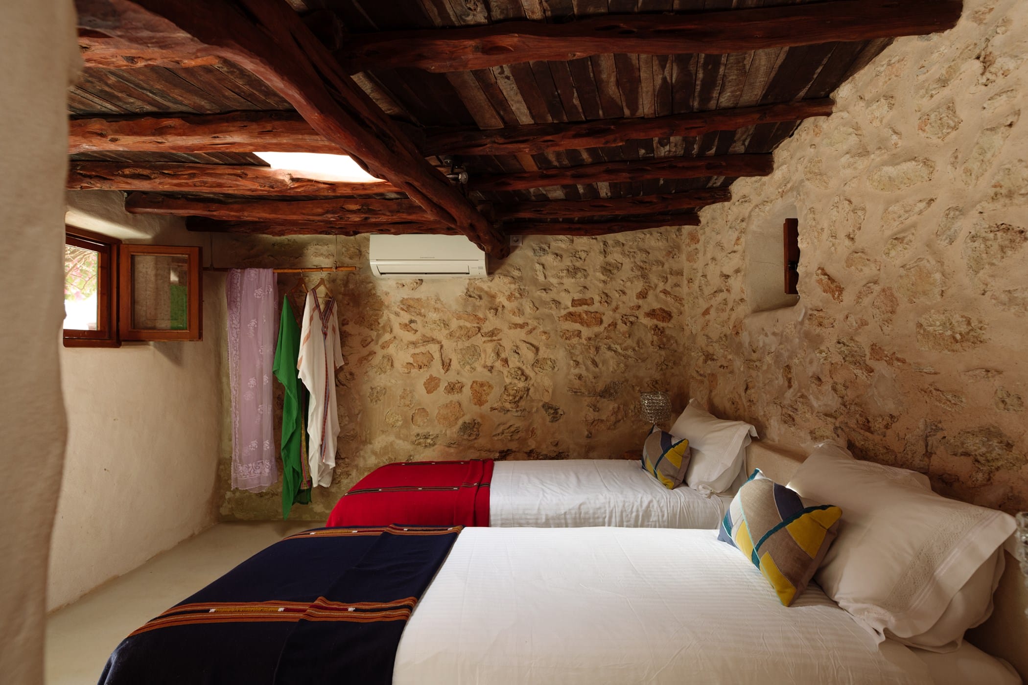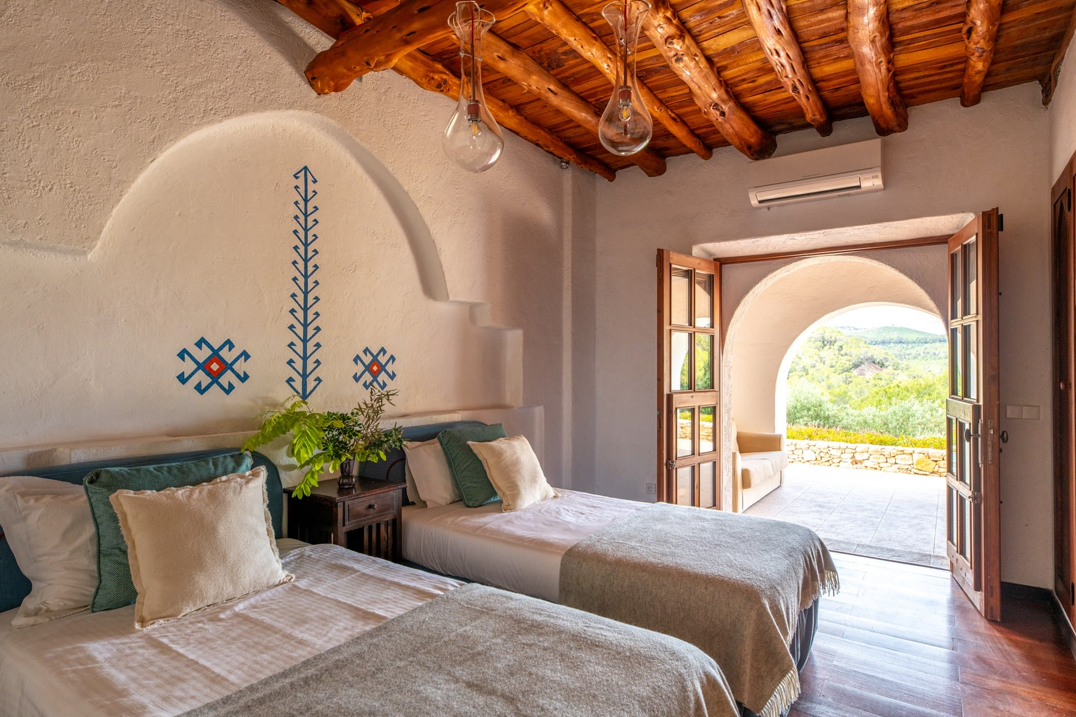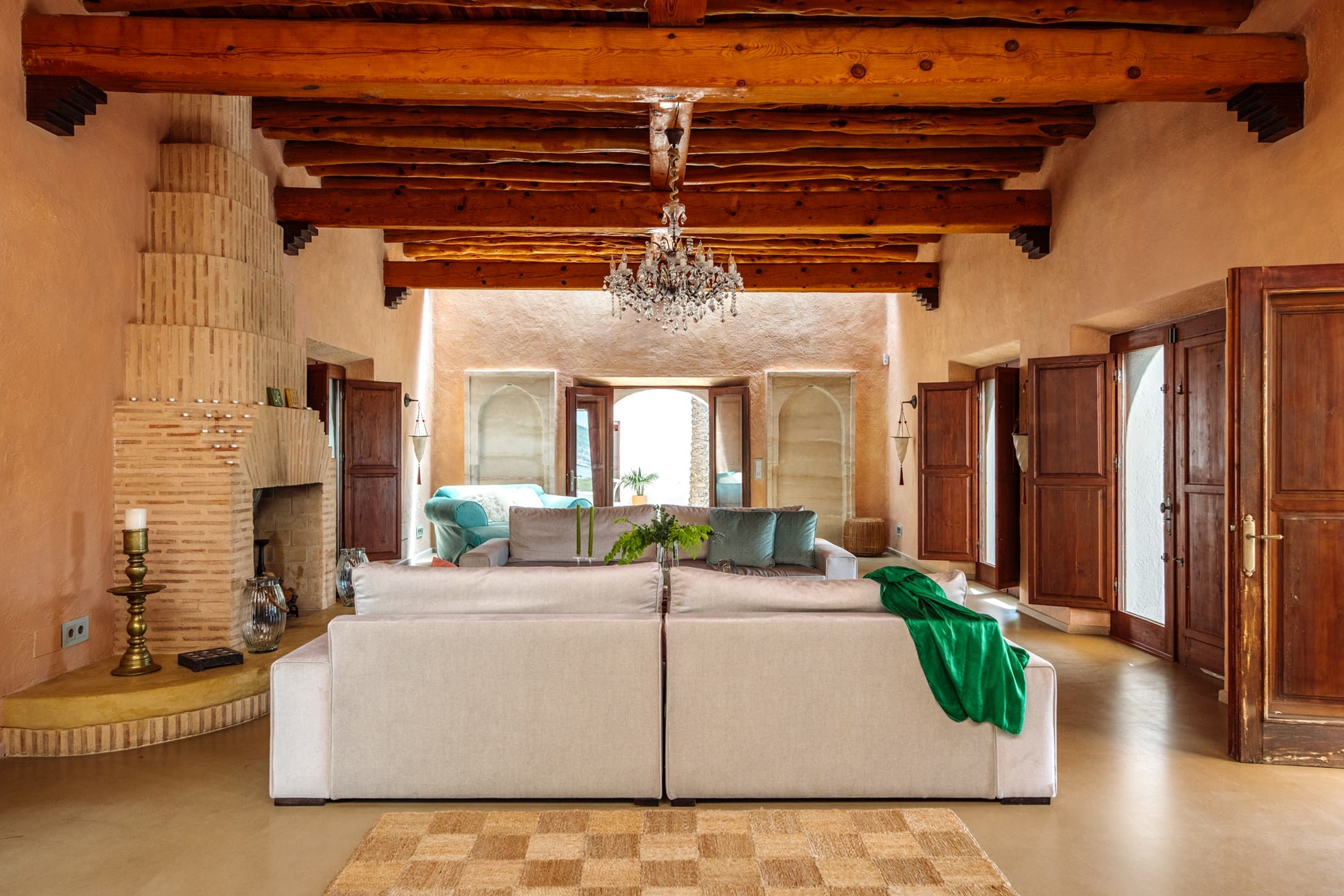 The second traditional finca house boasts original Sabina wood ceilings and contains three more bedrooms (two doubles and one twin), a second kitchen, and a cosy sitting area with fireplace.